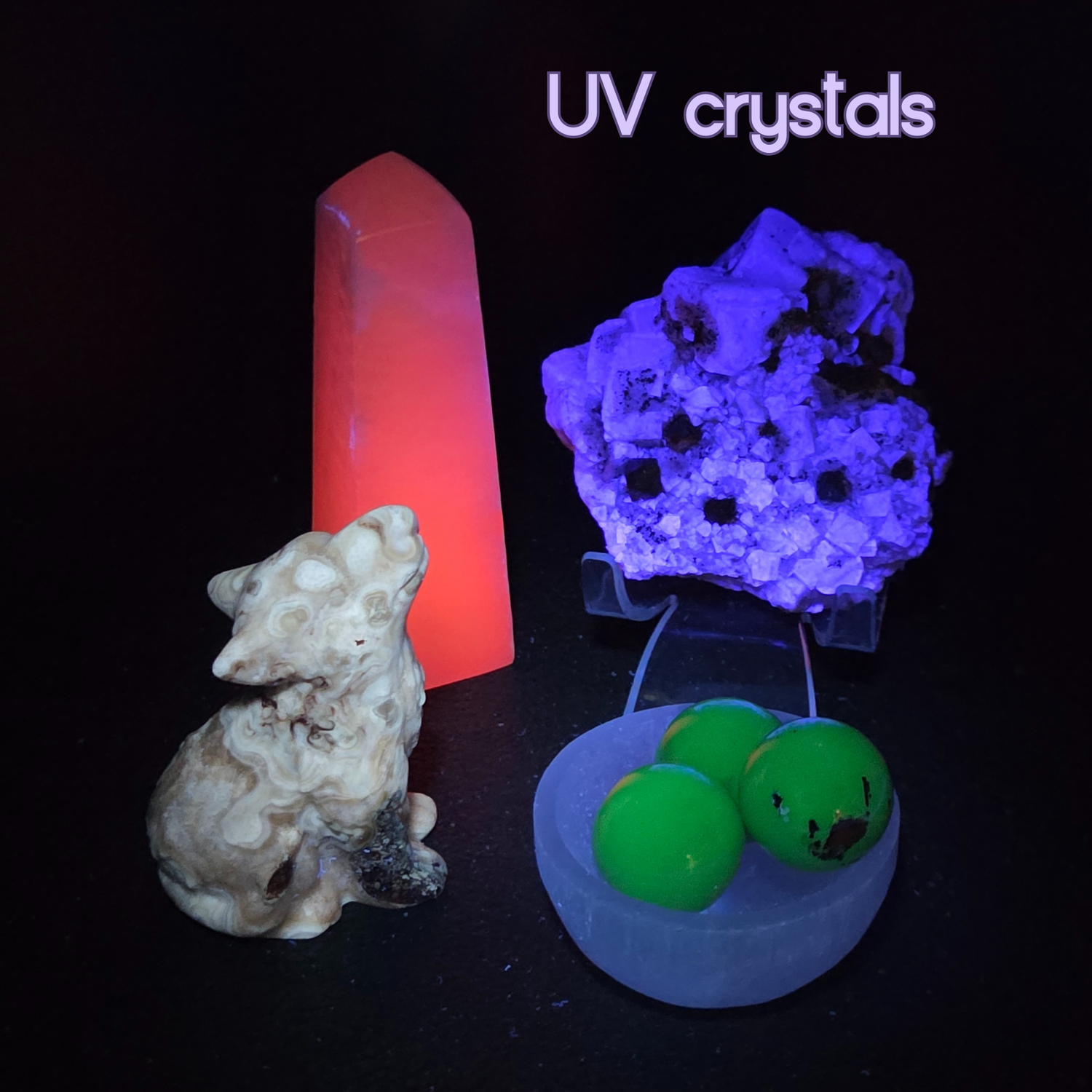 Polished crystals and crystal specimen that are UV reactive or Phosphorescent.