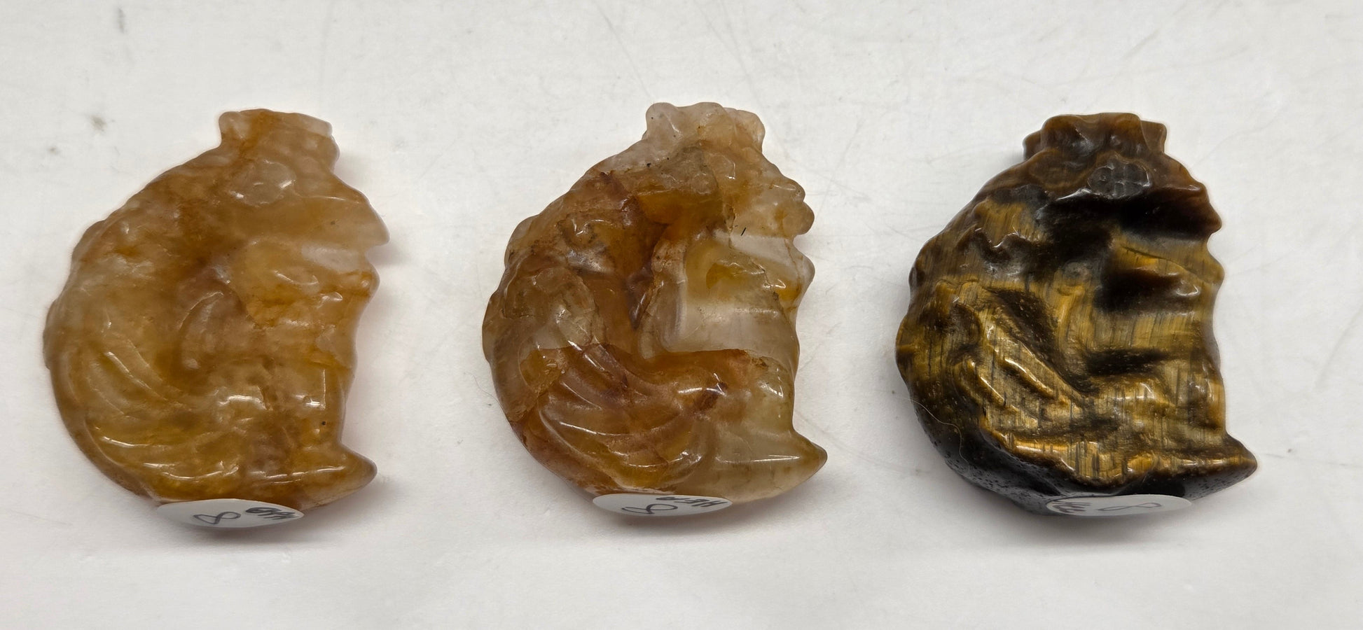 Nine (9) tail fox carvings sitting on a moon, in a variety of materials. Each carving is approx. 1.45"
