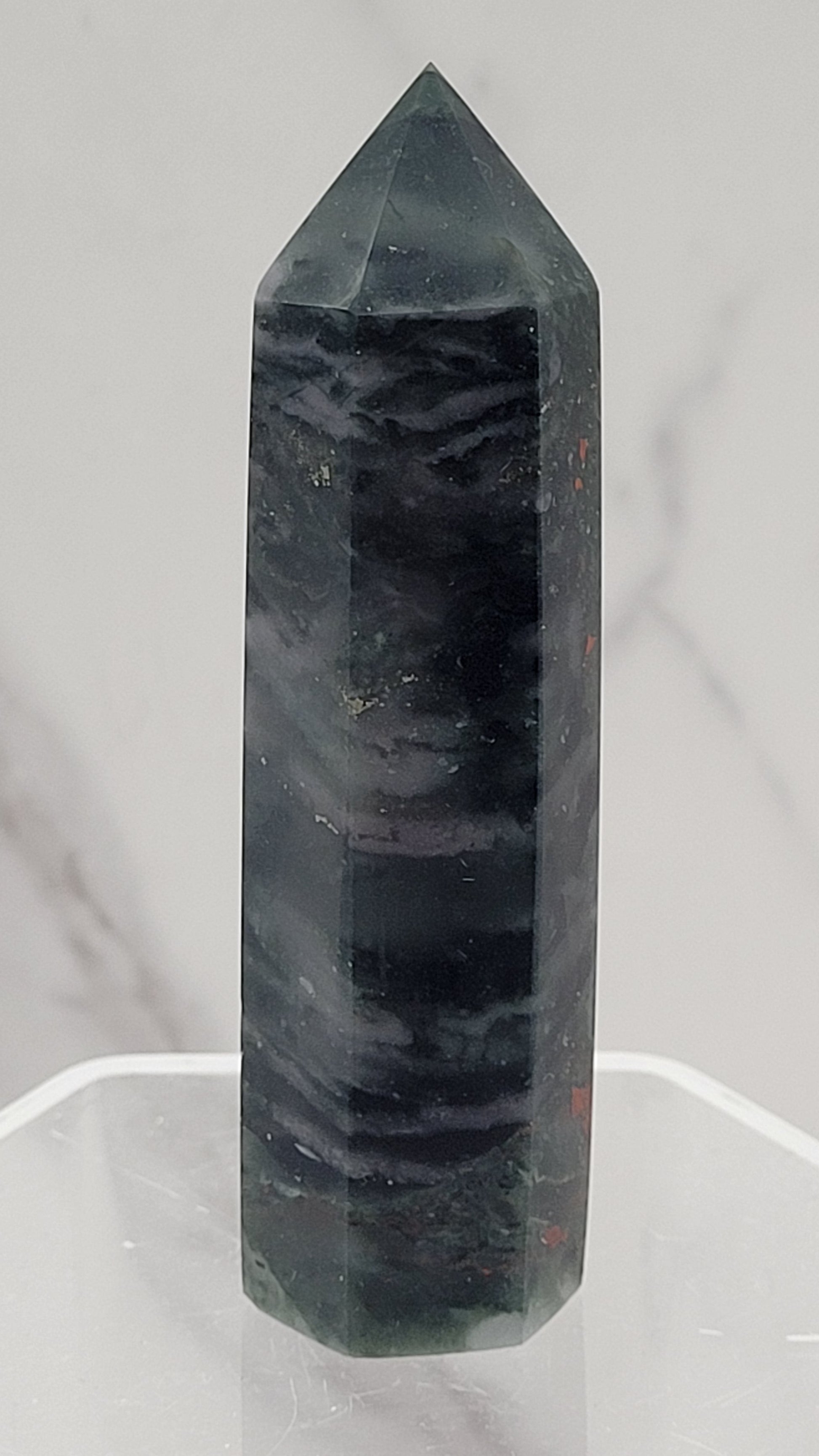 African Bloodstone, also known as setonite, is a type of jasper that gets its distinctive coloring from the presence of iron oxide. It is a variety of deep-green chalcedony, a crypto-crystalline quartz and red jasper flecks