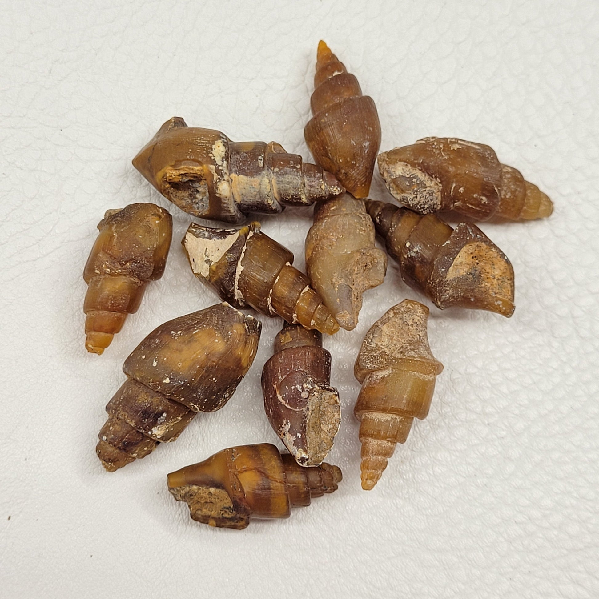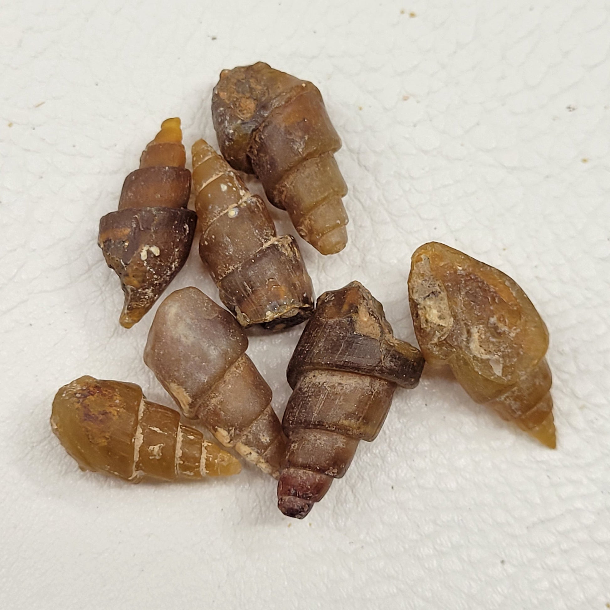 These are beautiful agate-replaced gastropod fossils. They come from near Assa, Morocco and are Eocene in age. They are largely complete, though many have chips, missing tips or other minor defects.