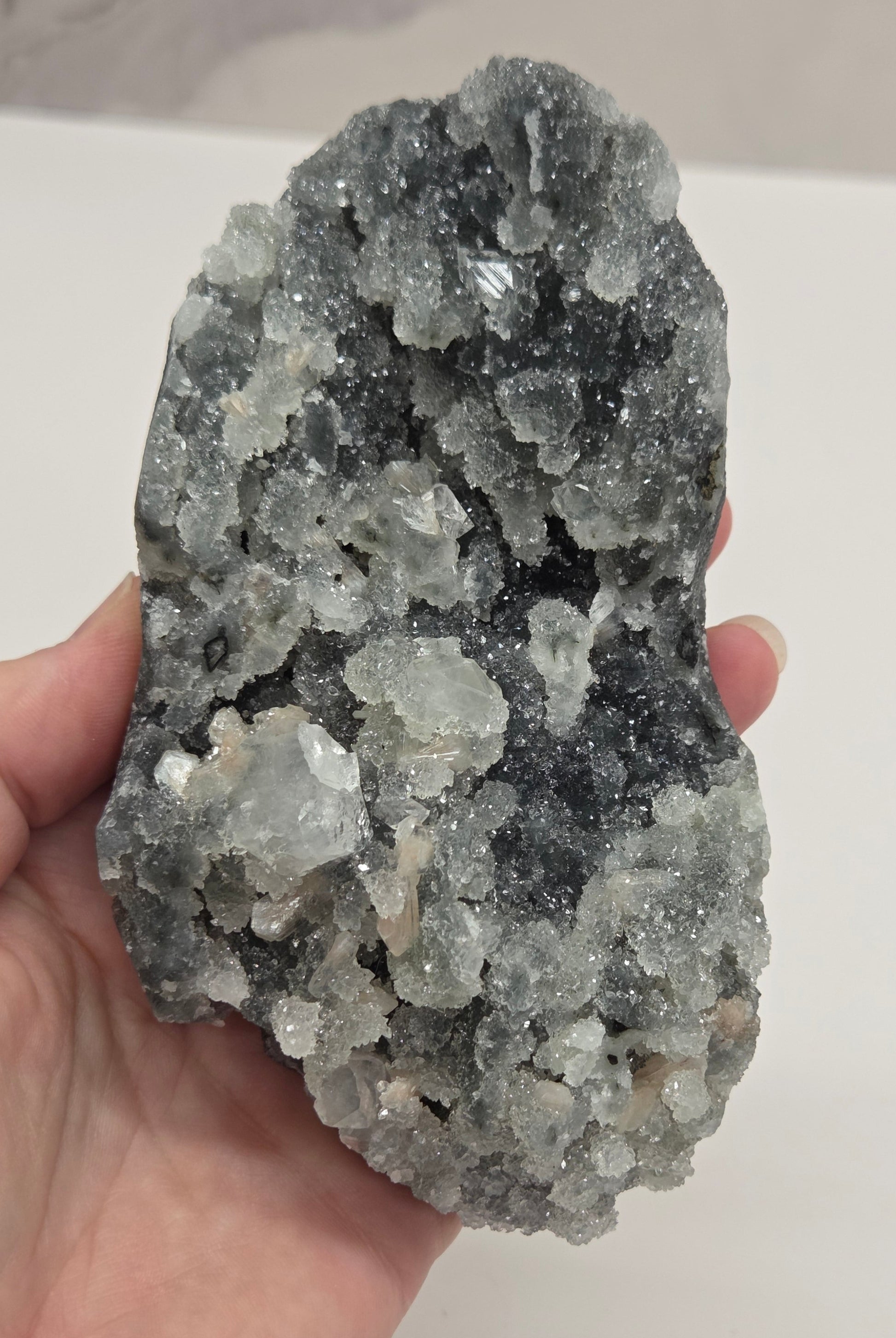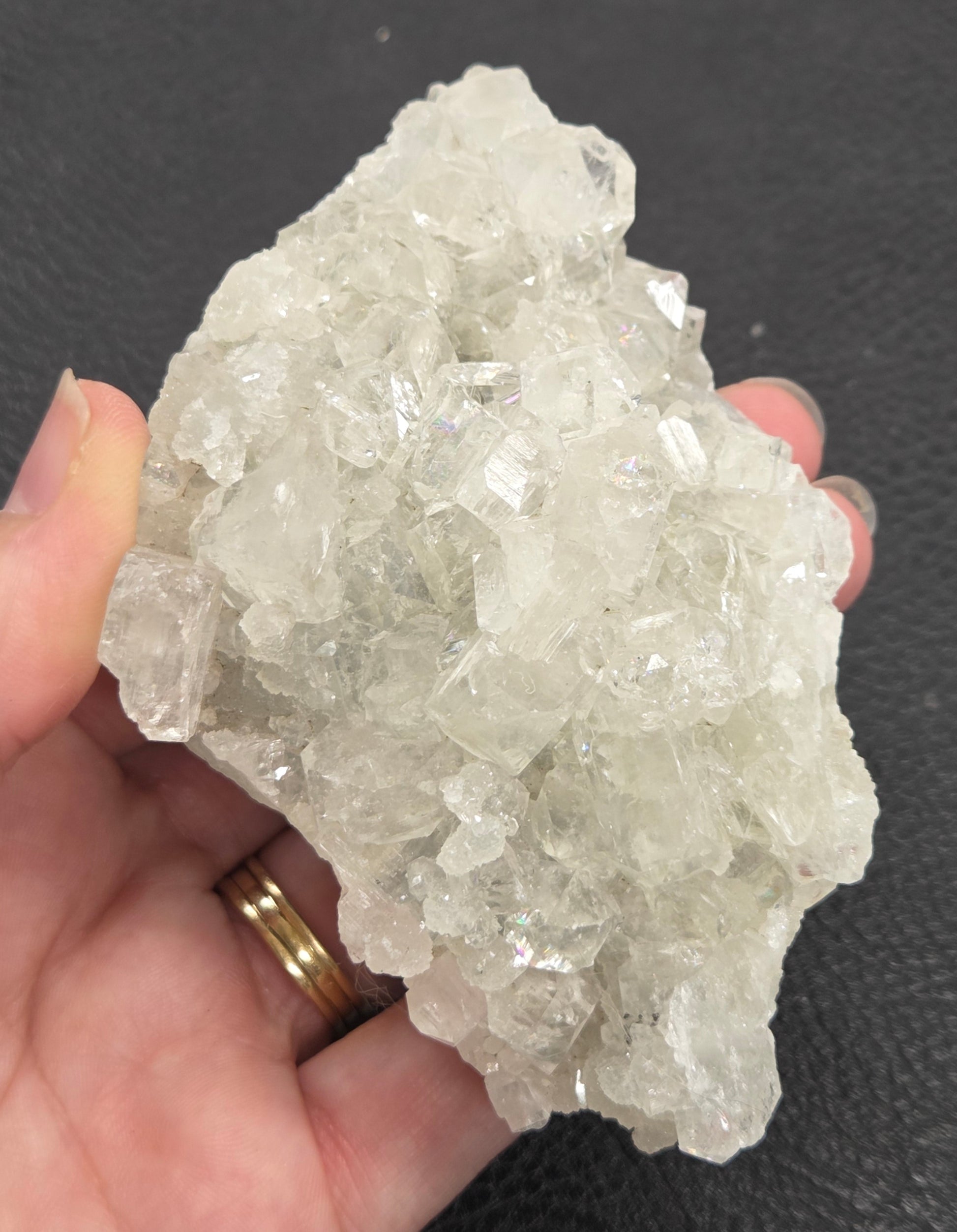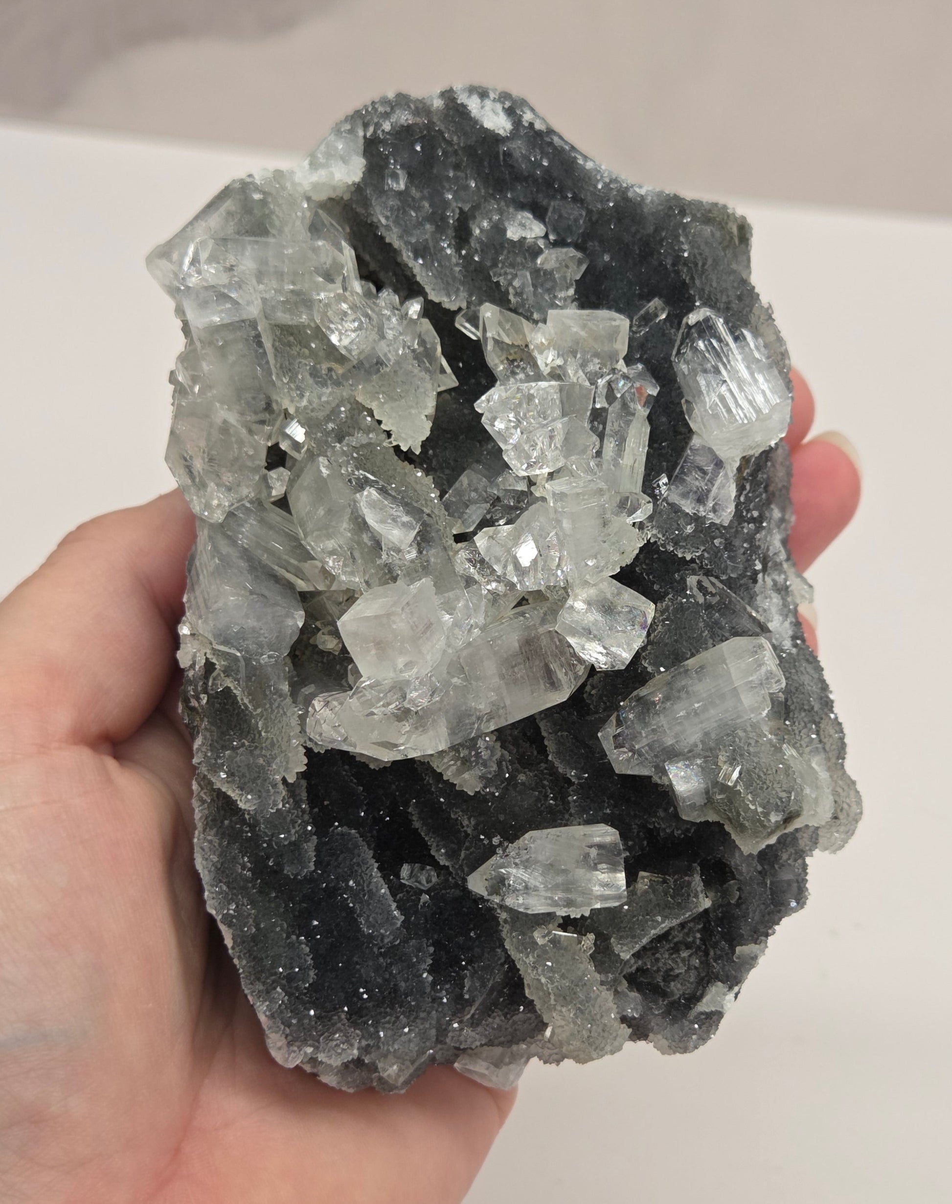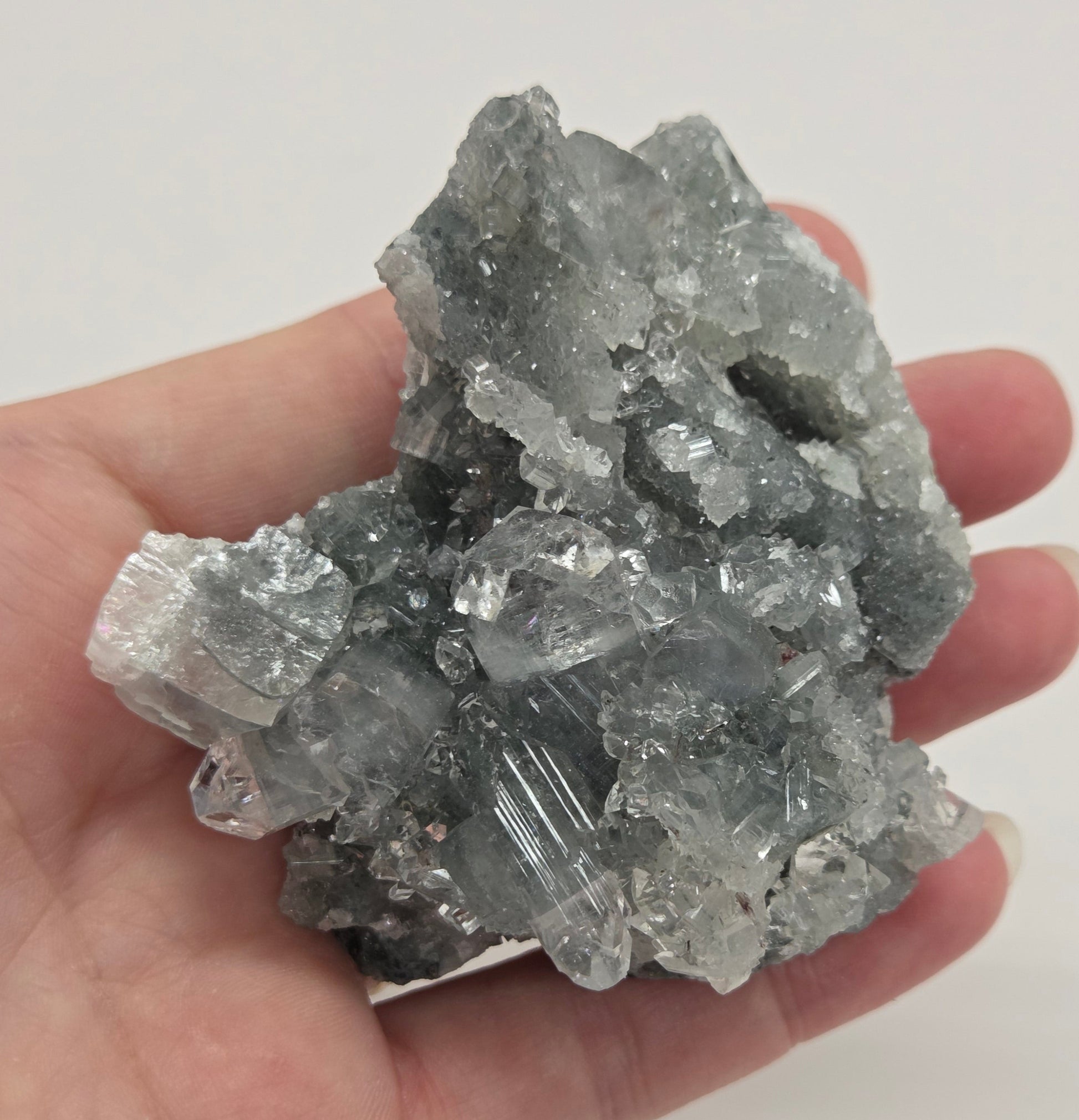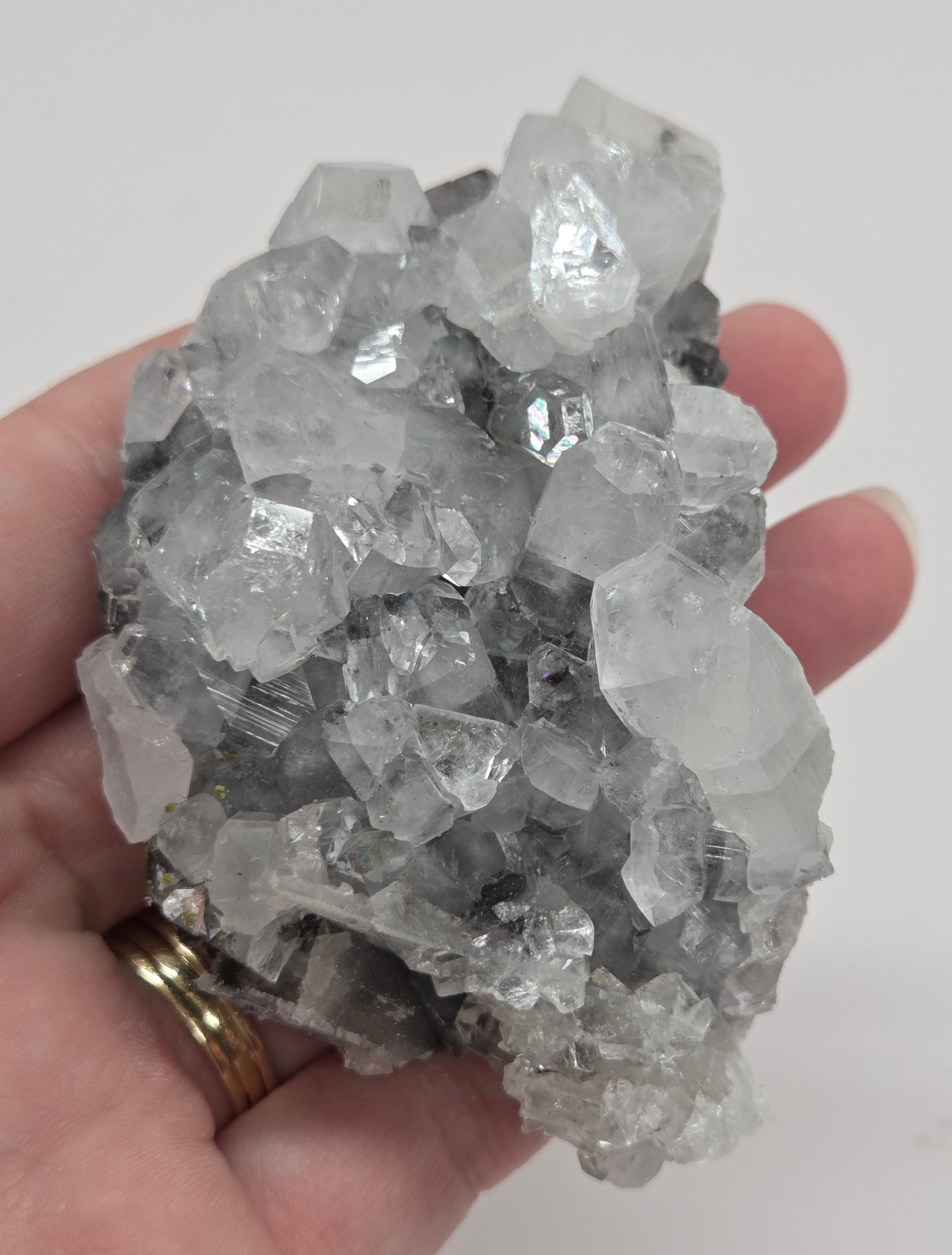 Sparkly diamond Apophyllite is characterized by its clear, white, green, or peach colors and its tendency to form in pyramidal or cubic structures. Some of these beautiful specimens are found on black quartz and/or chalcedony.