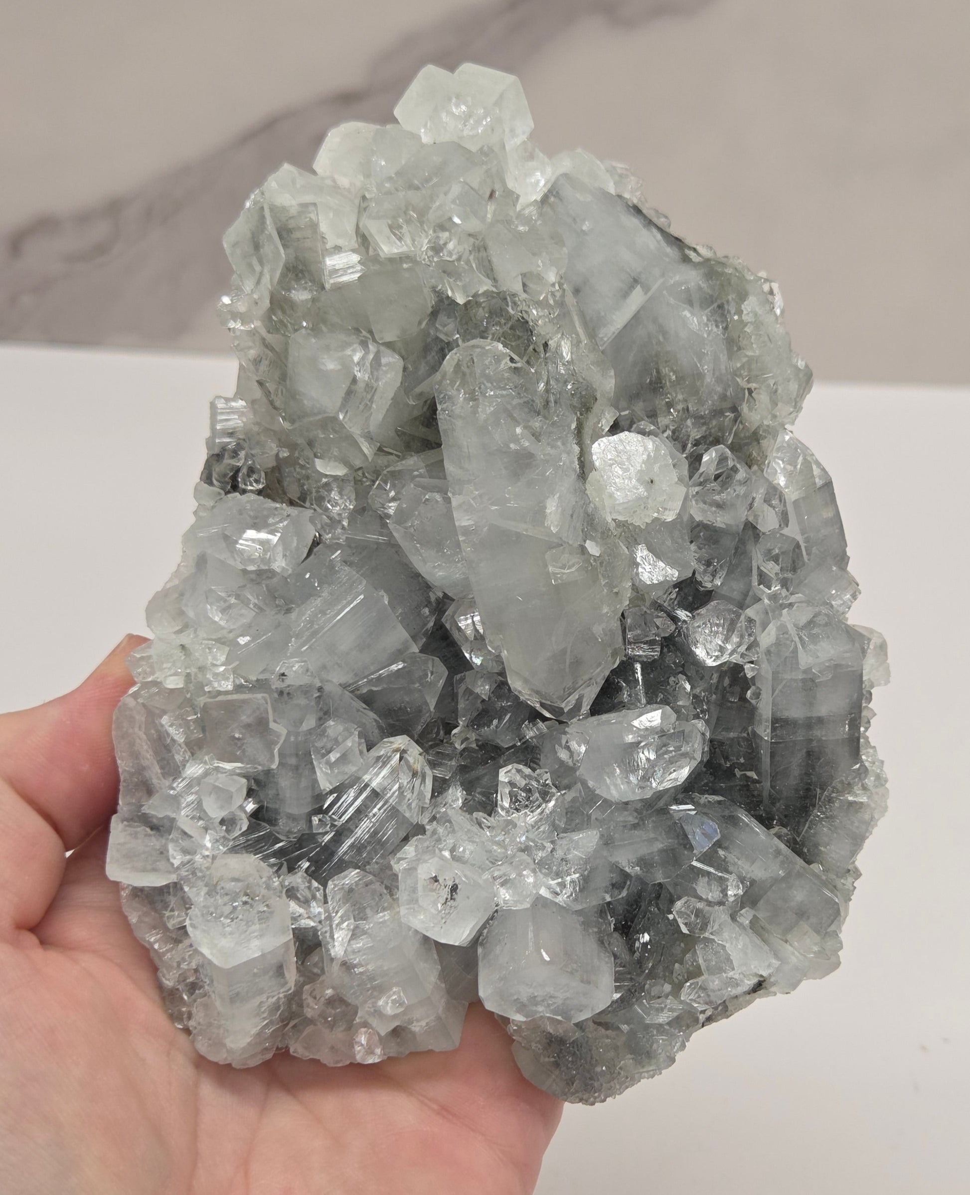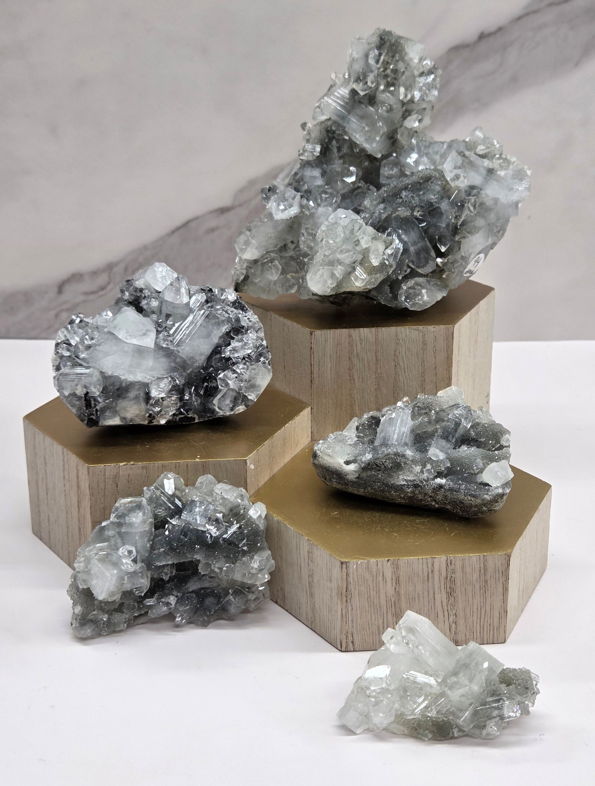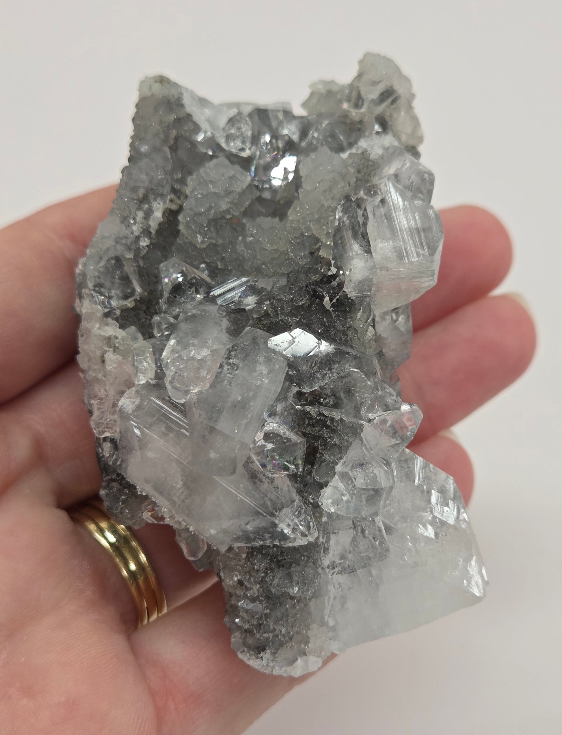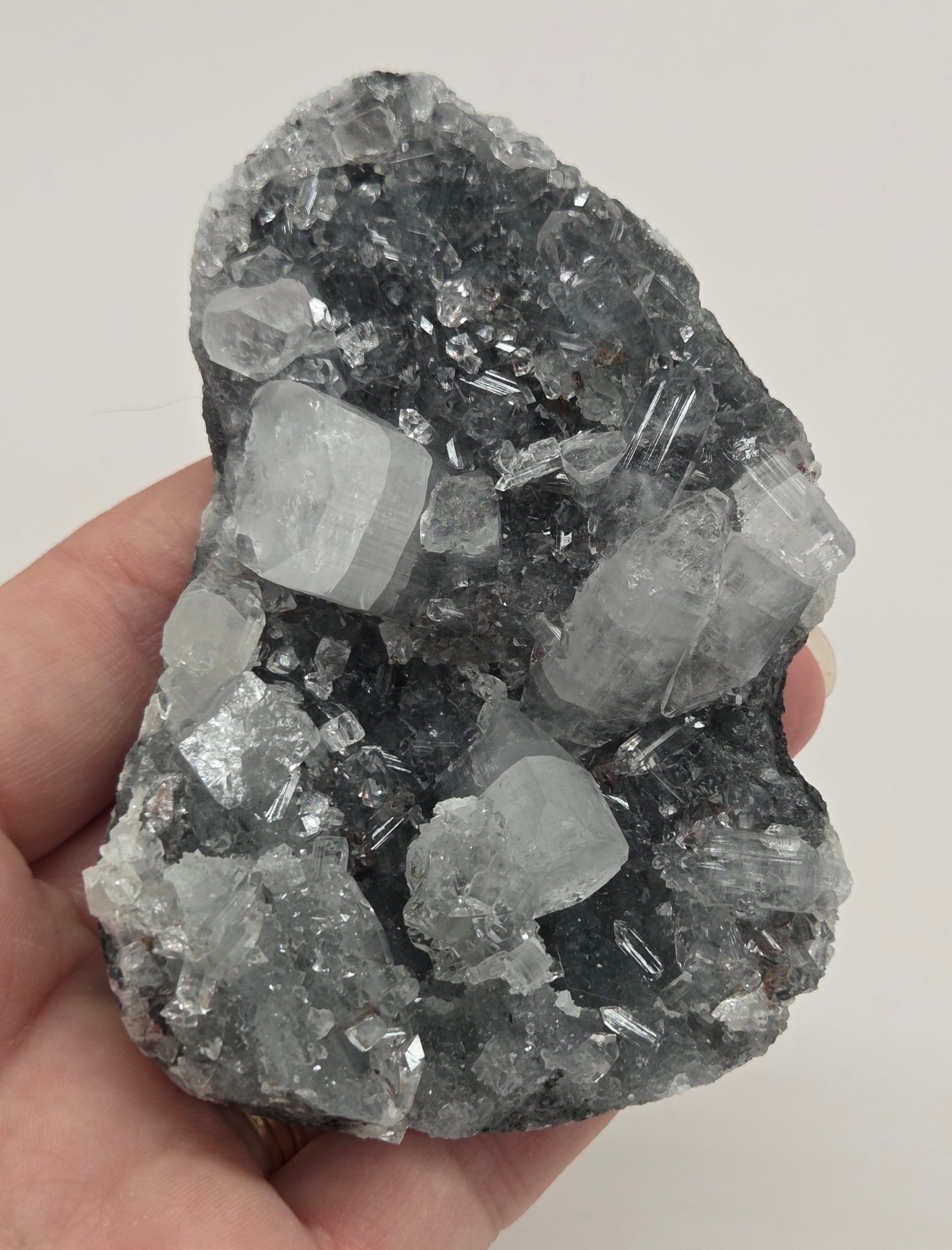 Sparkly diamond Apophyllite is characterized by its clear, white, green, or peach colors and its tendency to form in pyramidal or cubic structures. Some of these beautiful specimens are found on black quartz and/or chalcedony.
