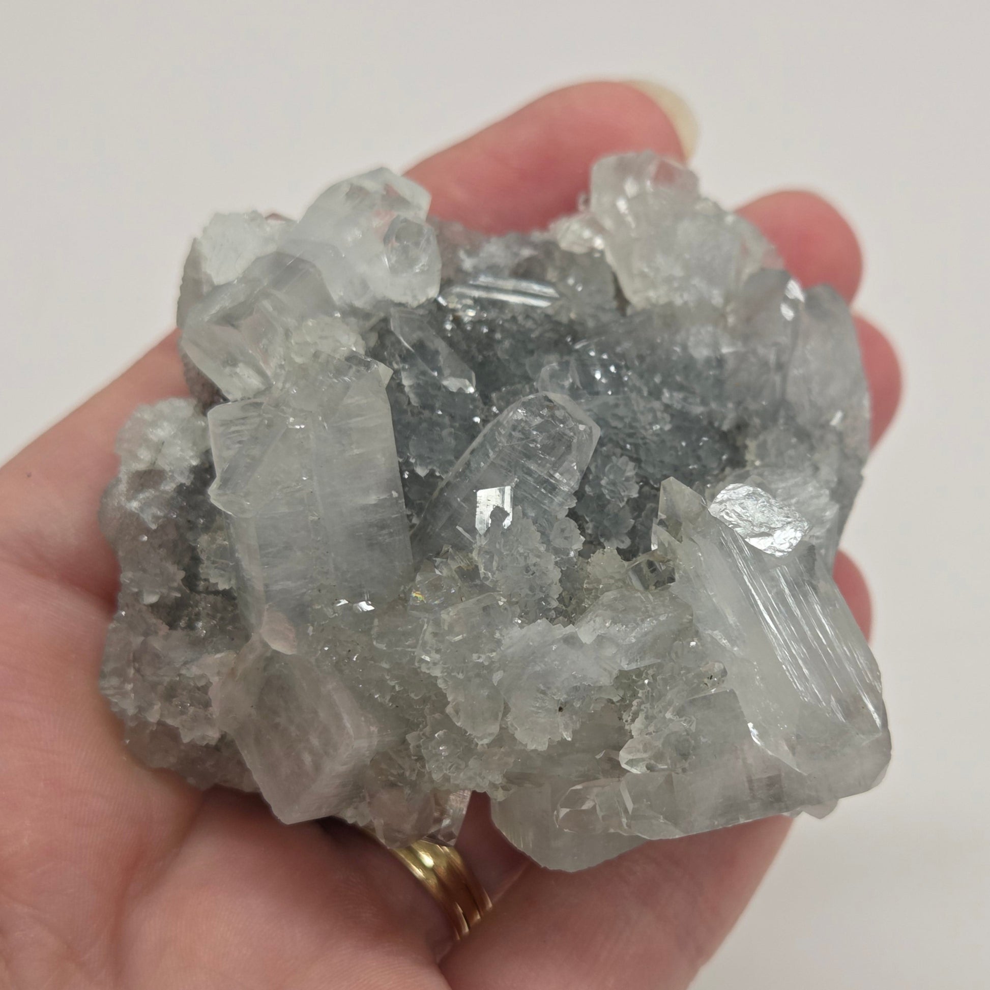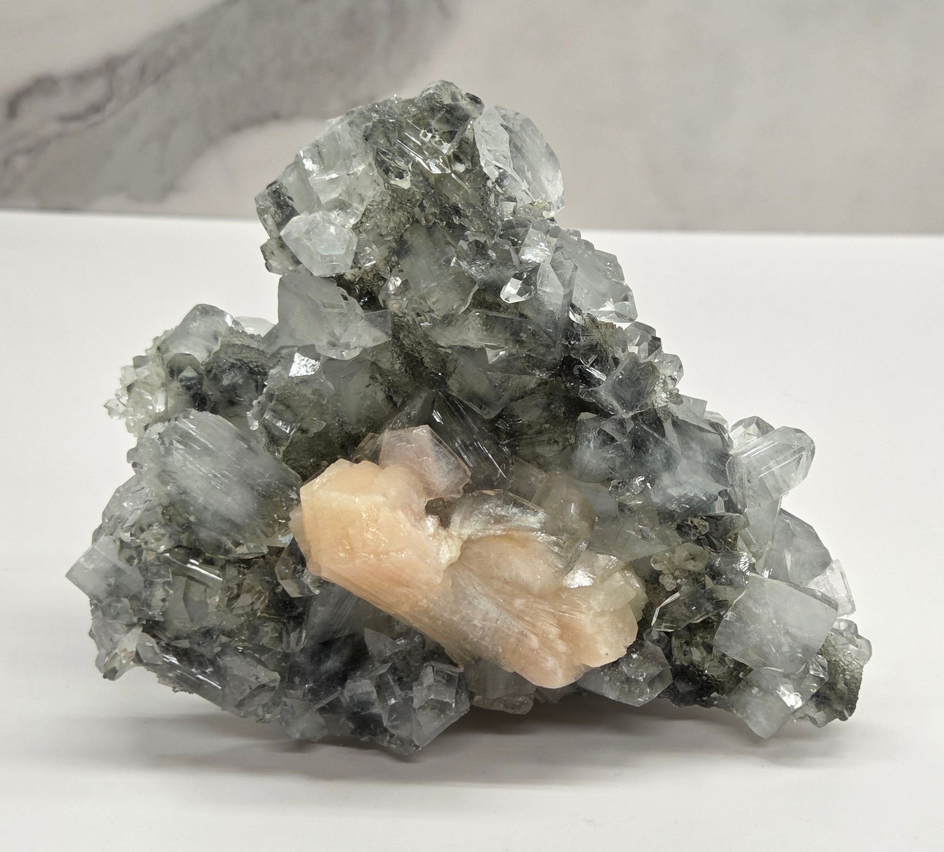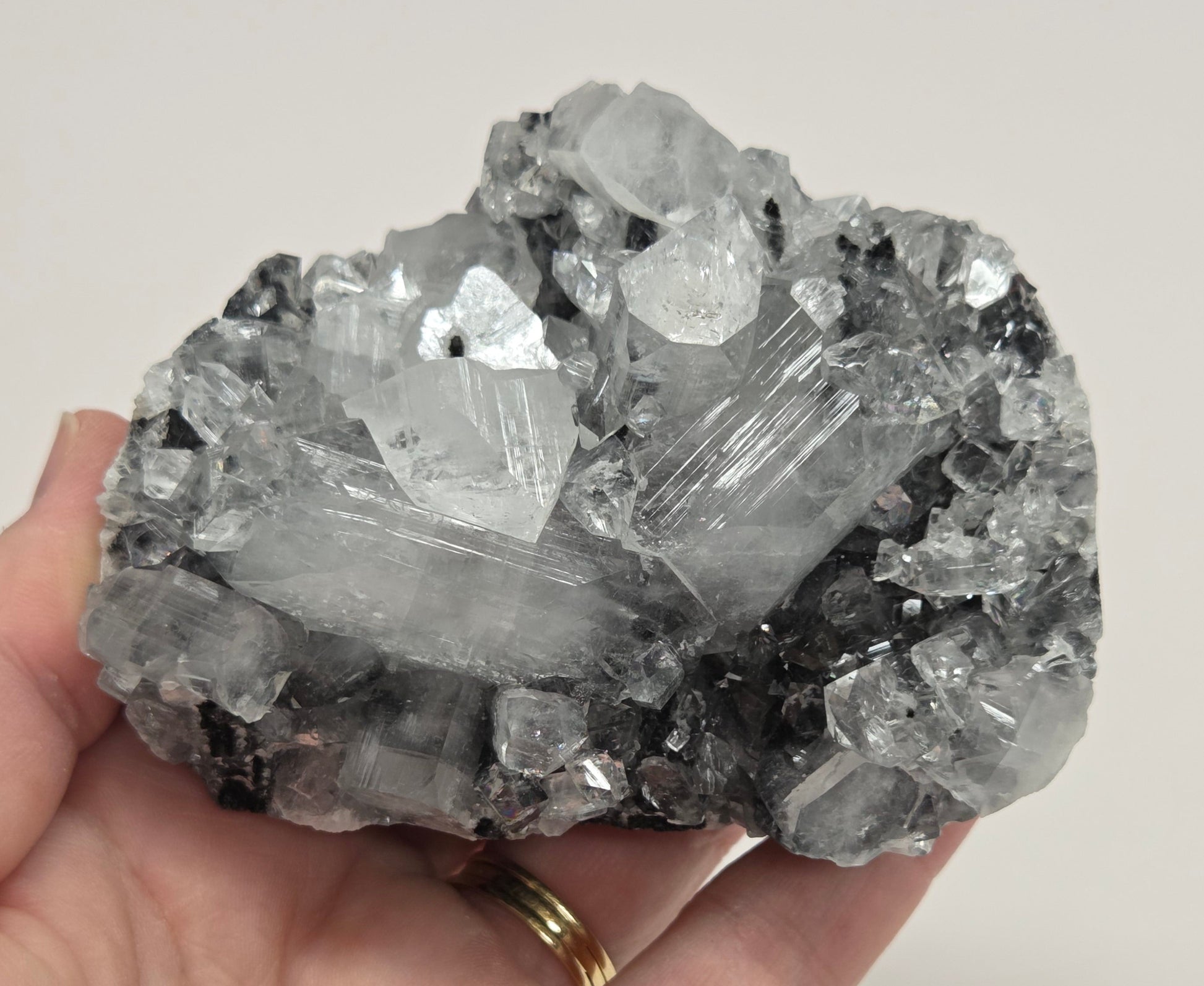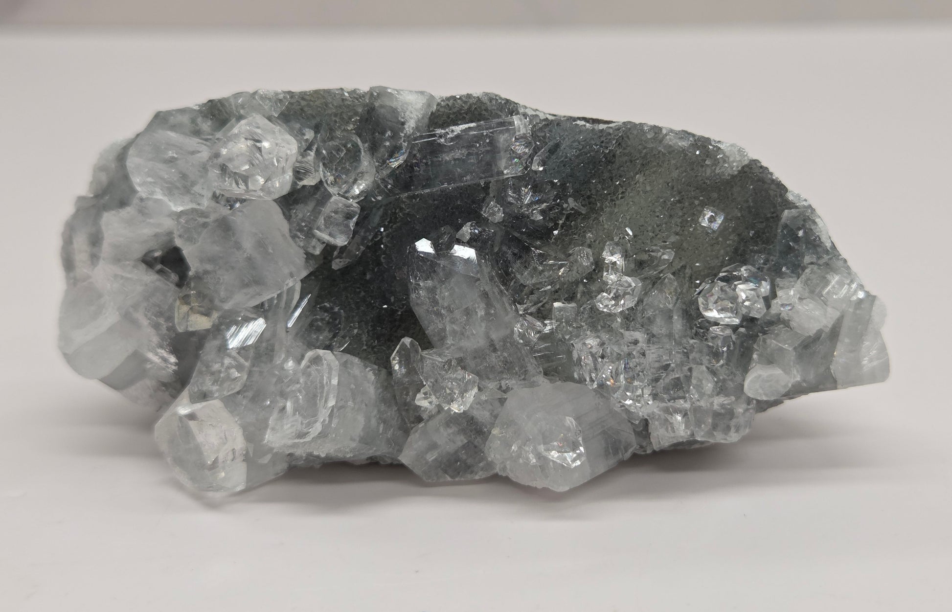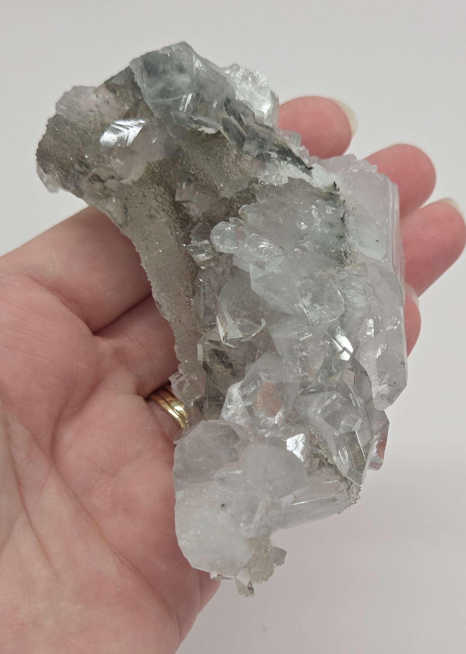 Sparkly diamond Apophyllite is characterized by its clear, white, green, or peach colors and its tendency to form in pyramidal or cubic structures. Some of these beautiful specimens are found on black quartz and/or chalcedony.