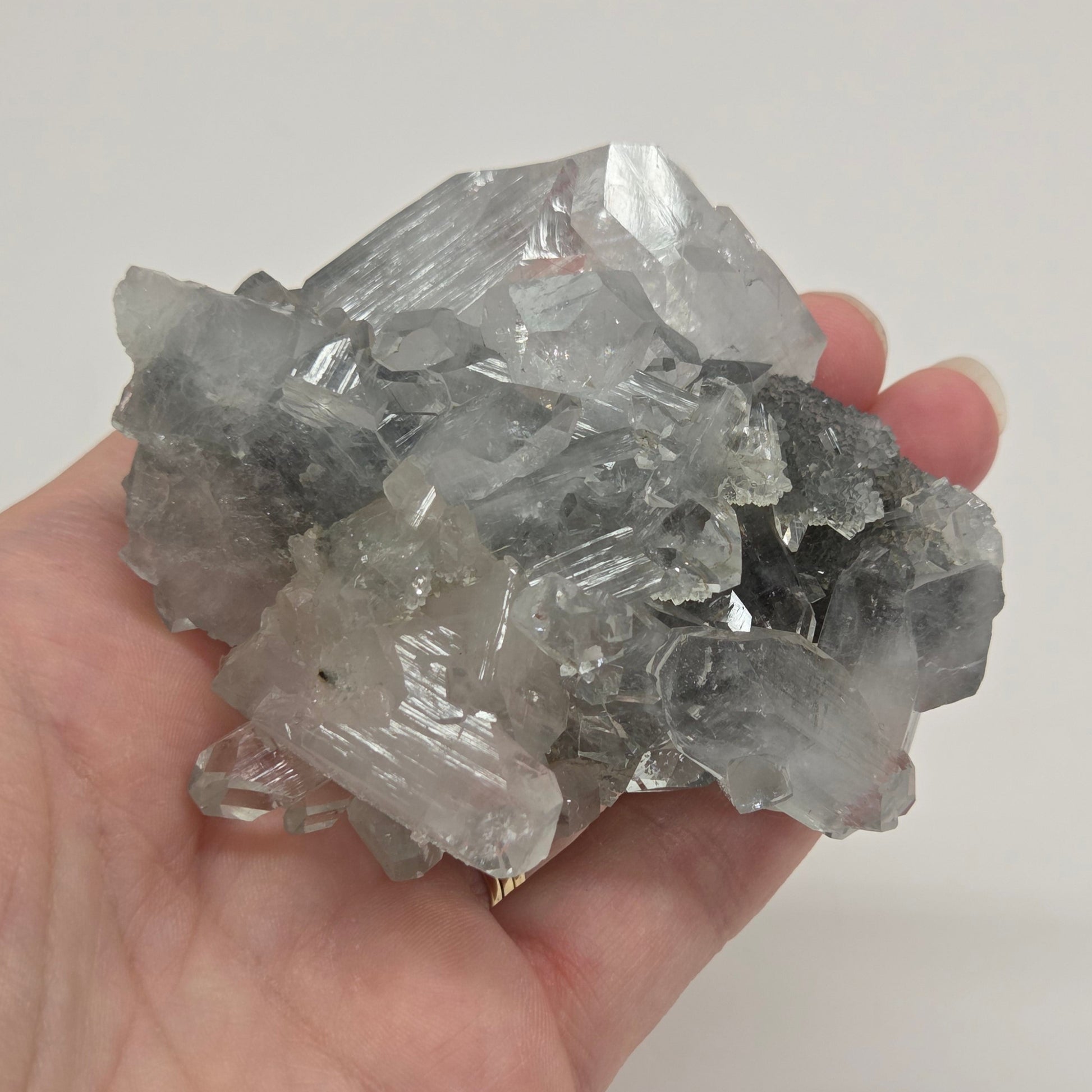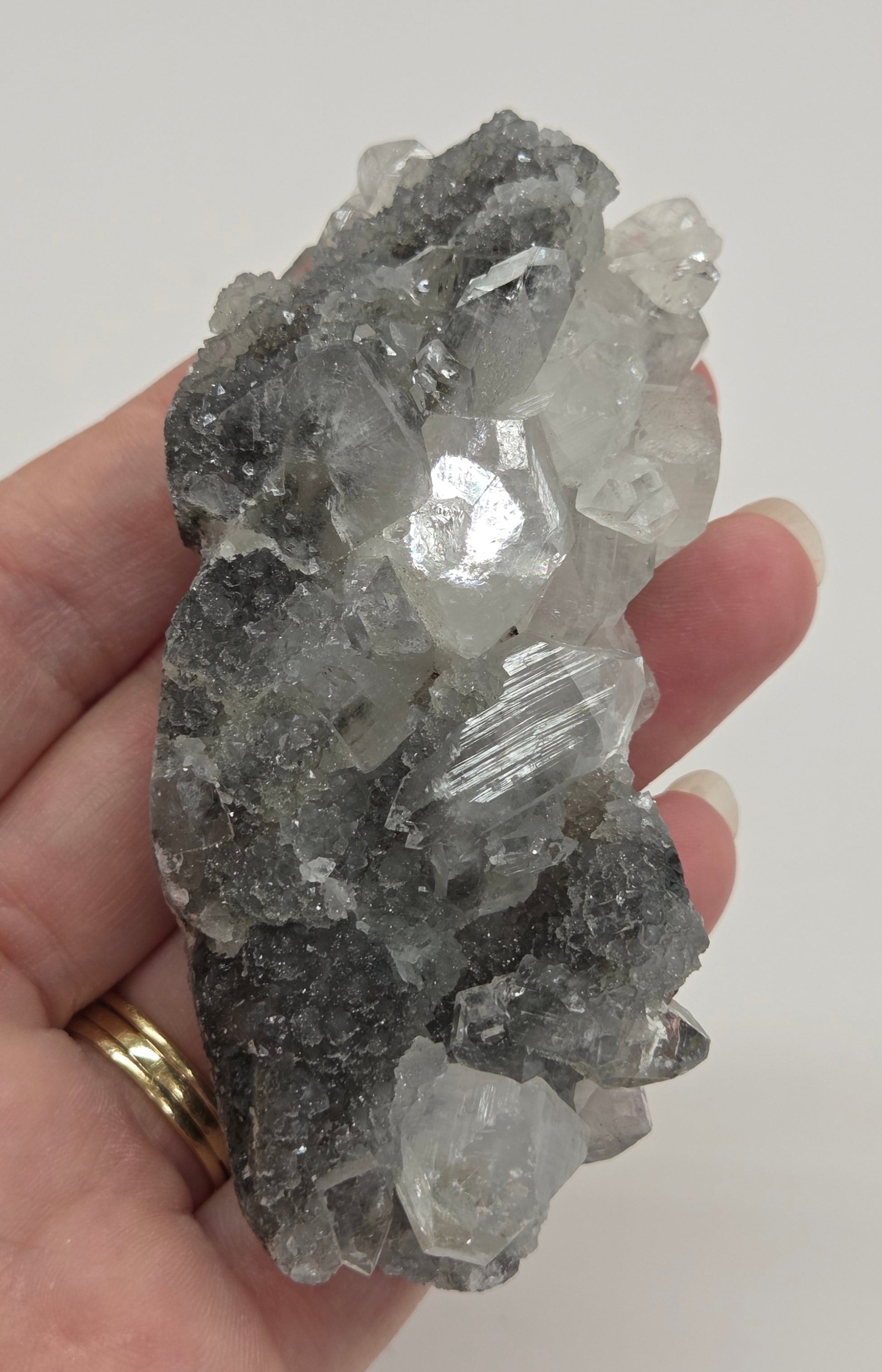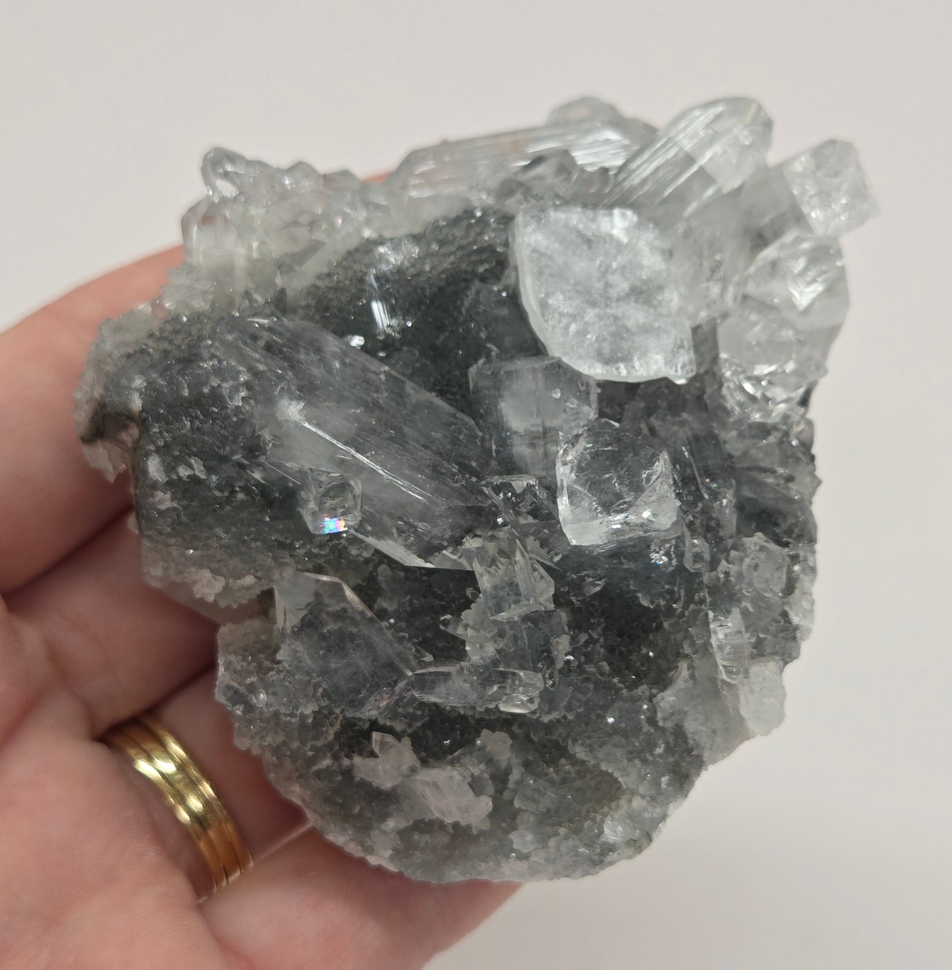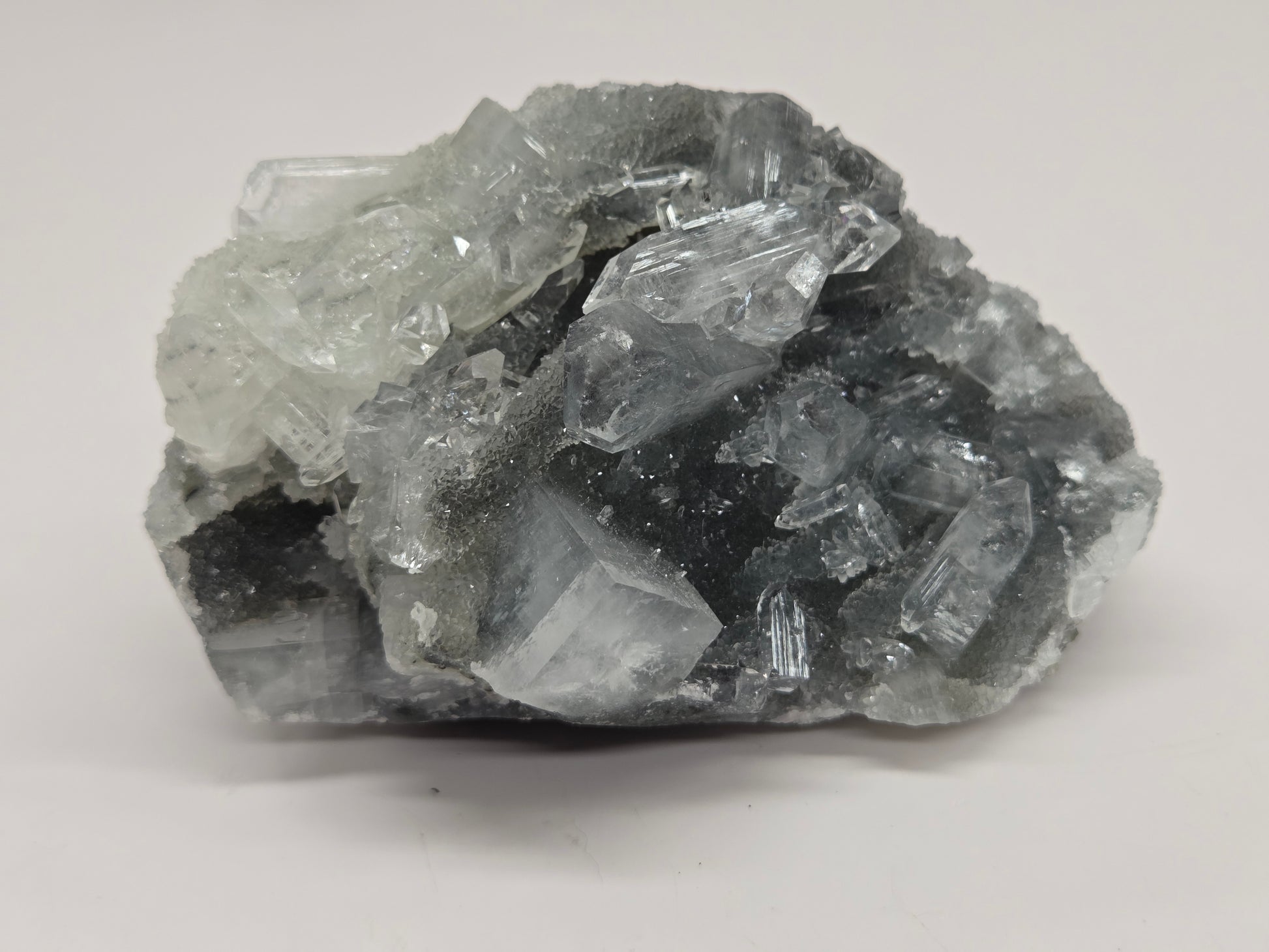 Sparkly diamond Apophyllite is characterized by its clear, white, green, or peach colors and its tendency to form in pyramidal or cubic structures. Some of these beautiful specimens are found on black quartz and/or chalcedony.