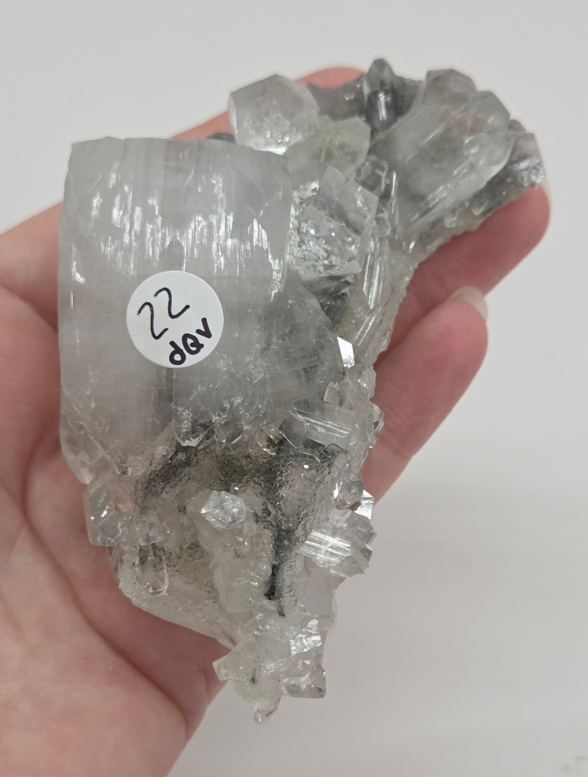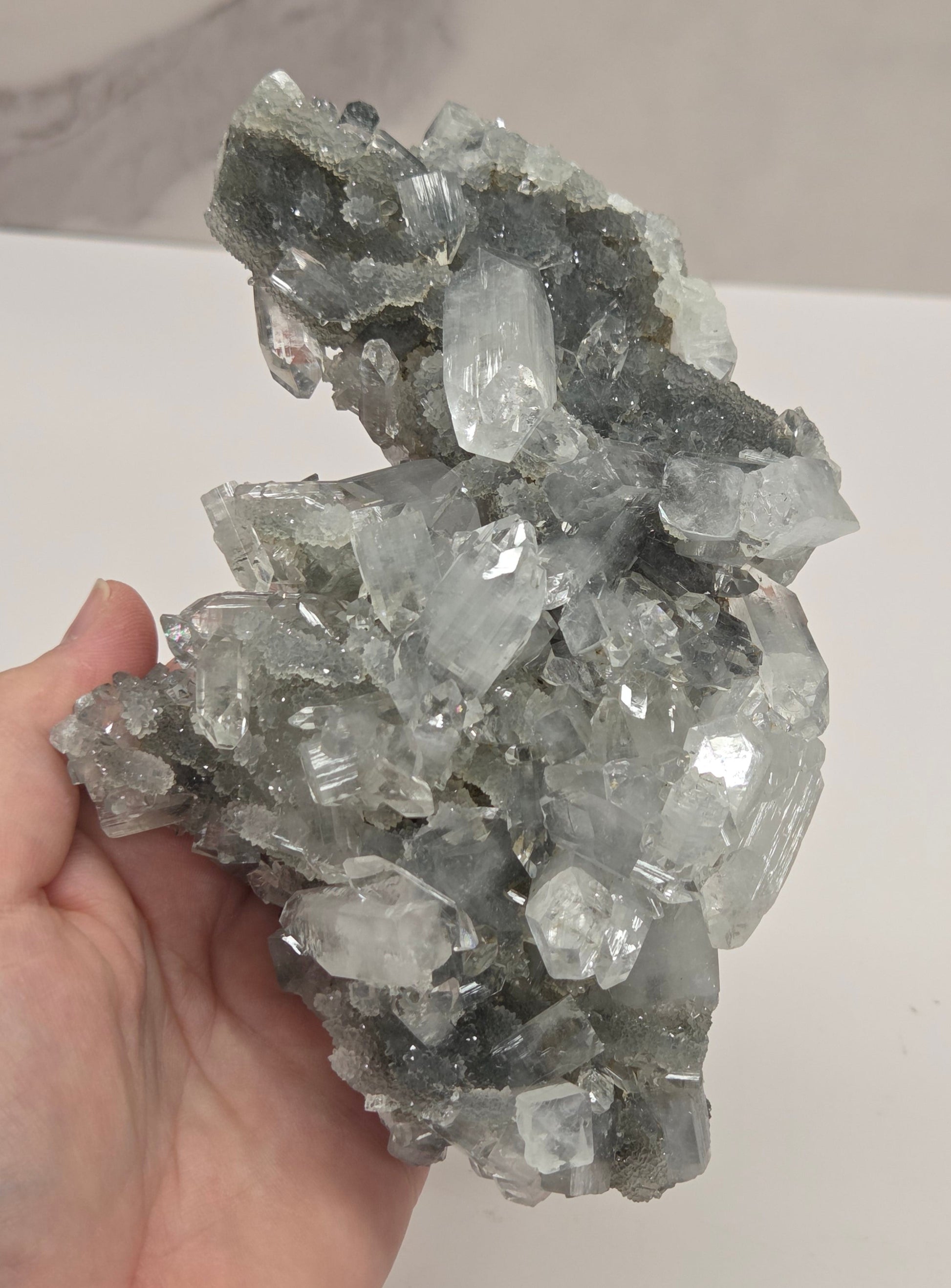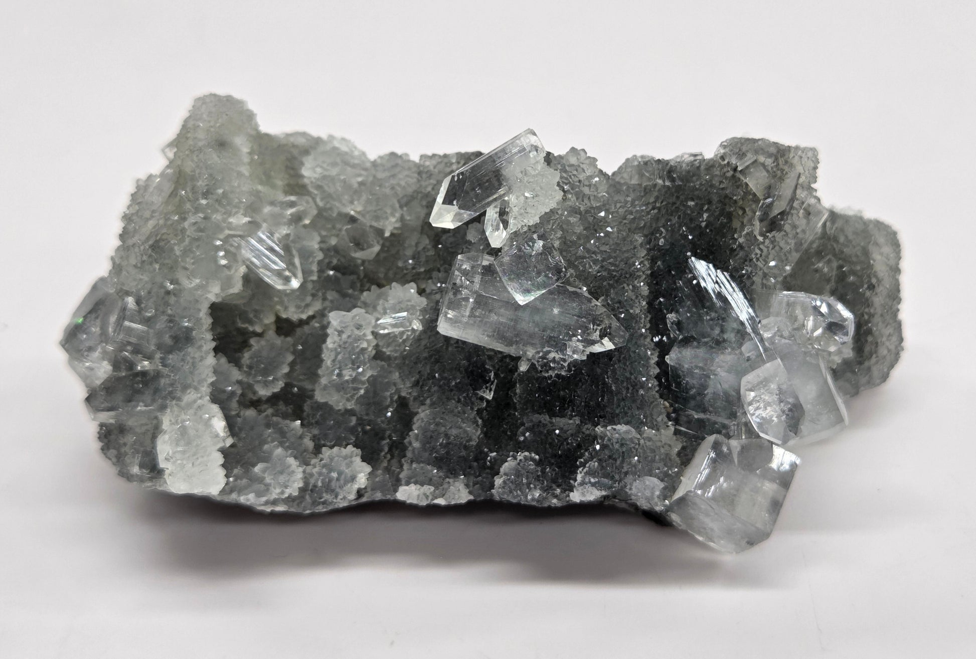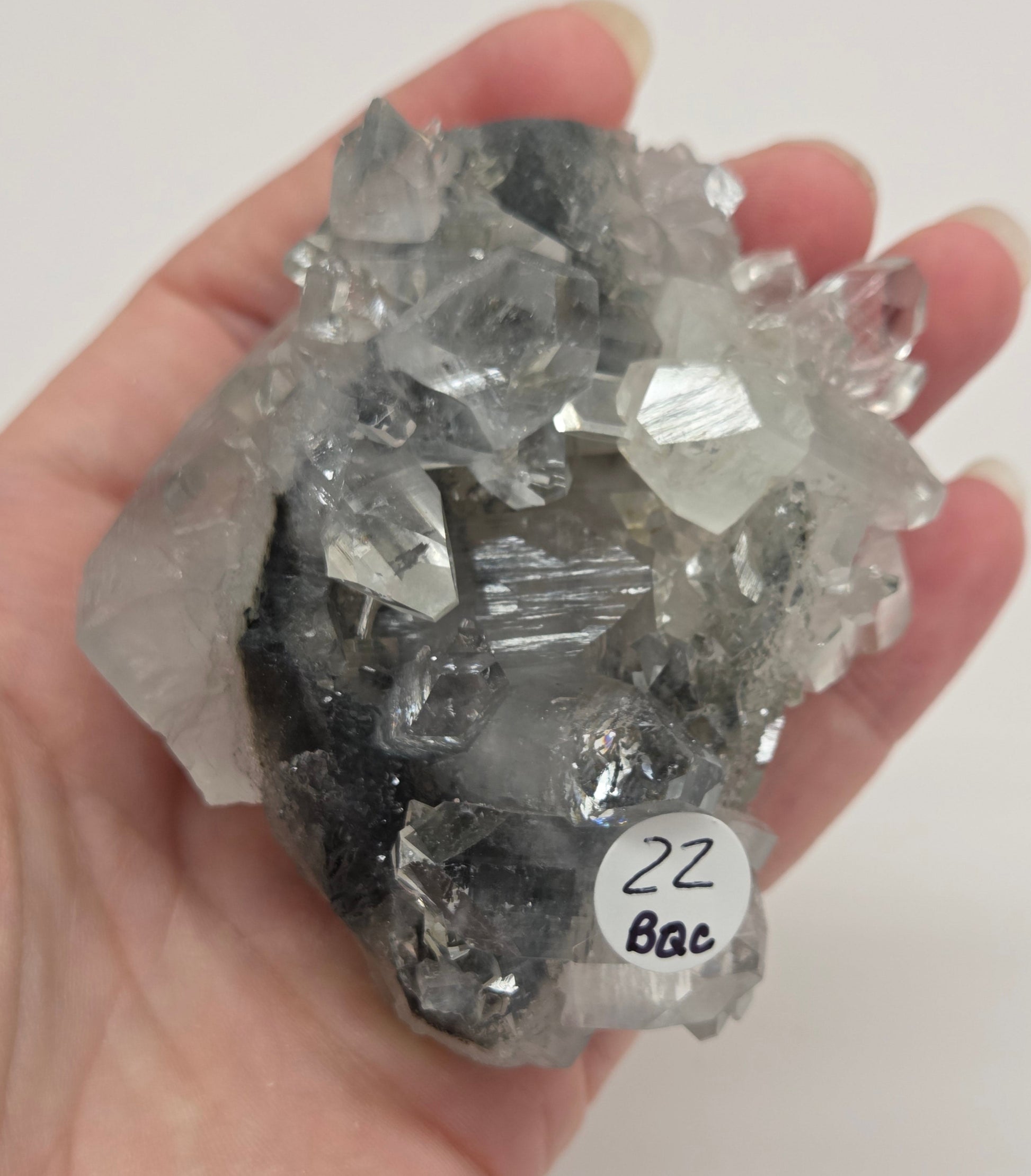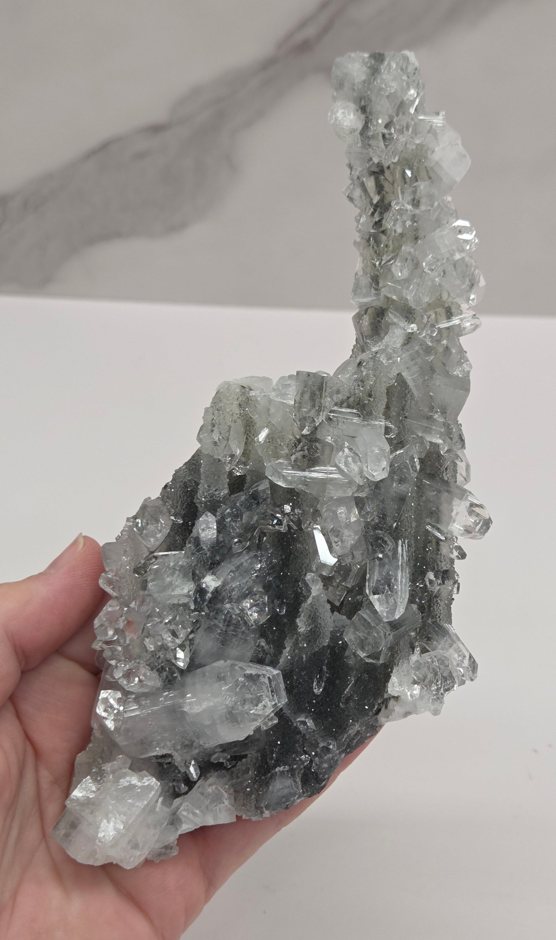 Sparkly diamond Apophyllite is characterized by its clear, white, green, or peach colors and its tendency to form in pyramidal or cubic structures. Some of these beautiful specimens are found on black quartz and/or chalcedony.
