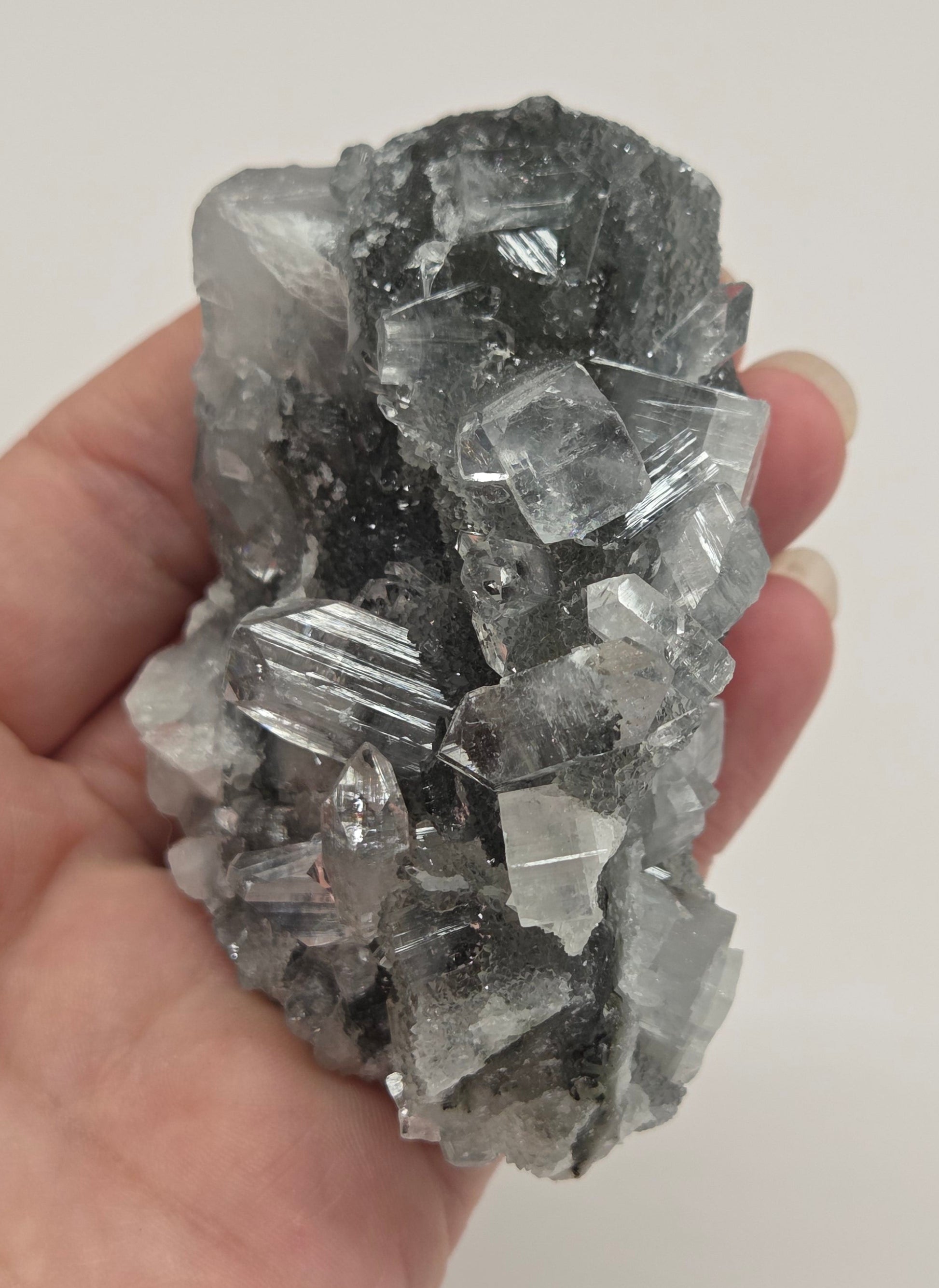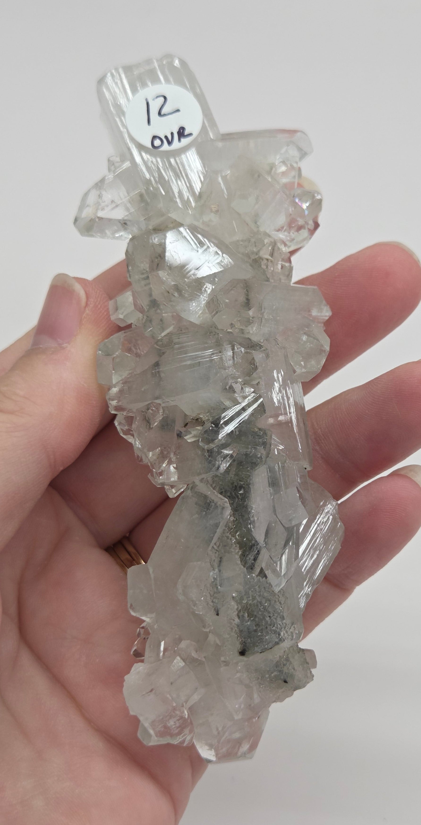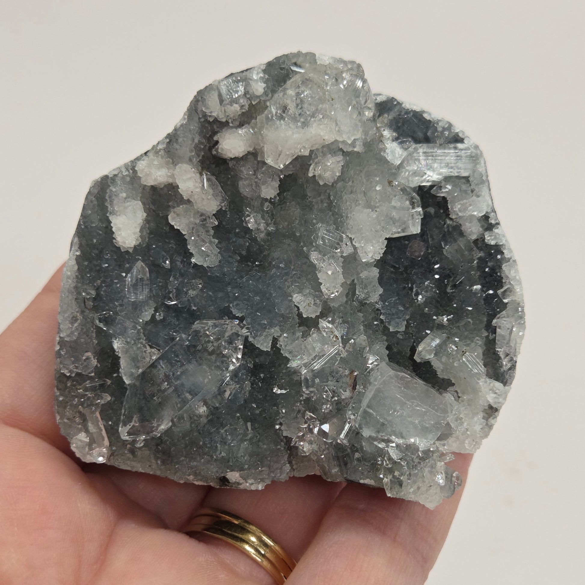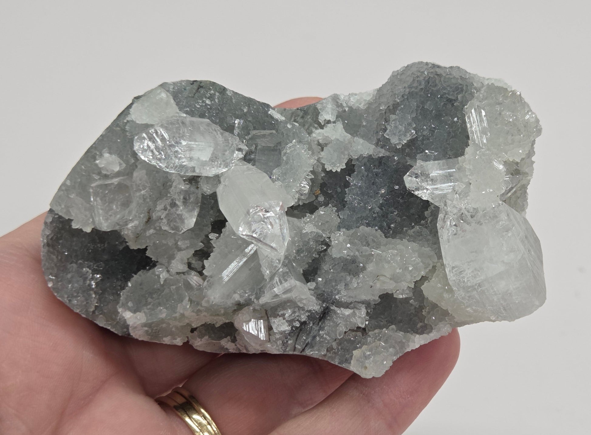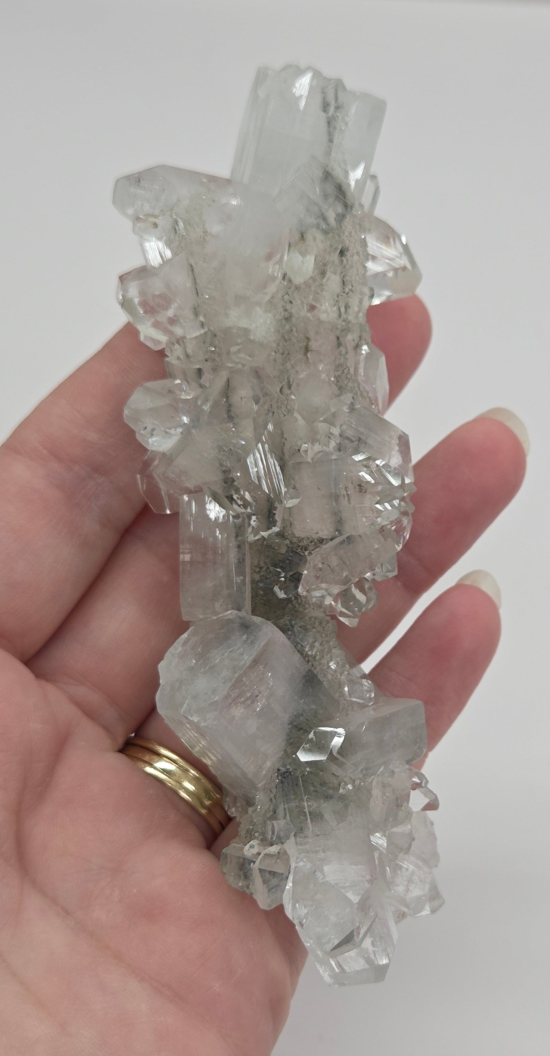 Sparkly diamond Apophyllite is characterized by its clear, white, green, or peach colors and its tendency to form in pyramidal or cubic structures. Some of these beautiful specimens are found on black quartz and/or chalcedony.