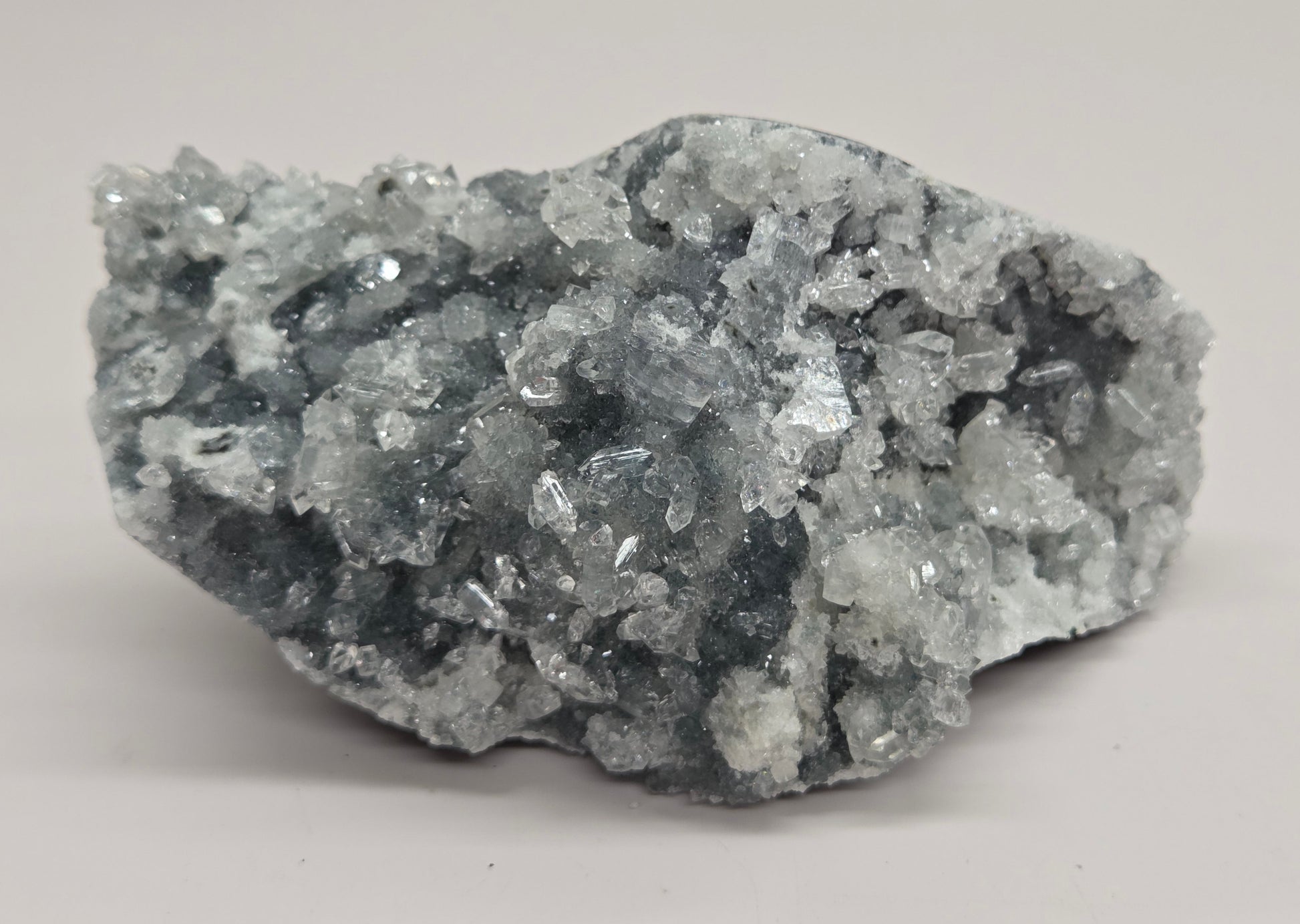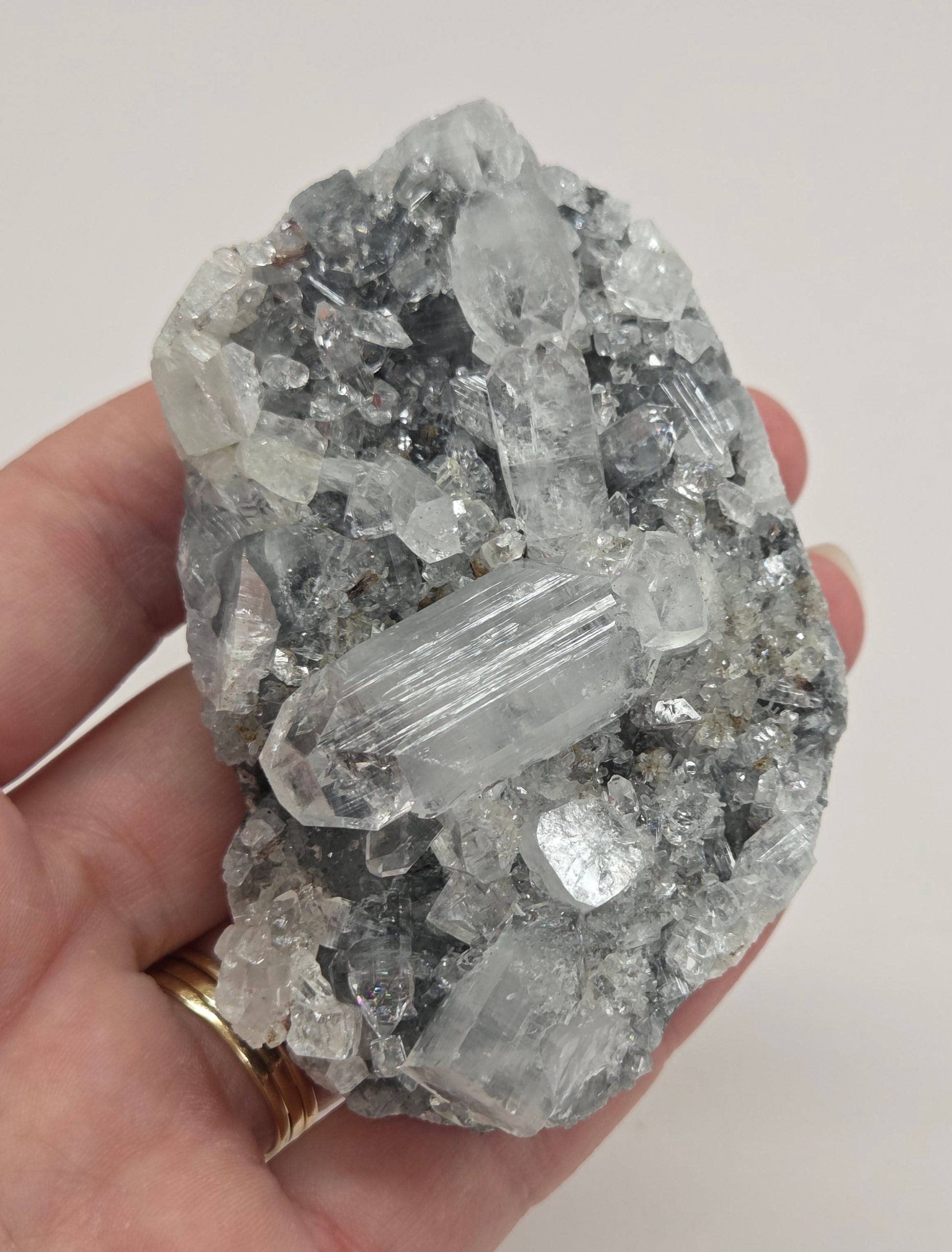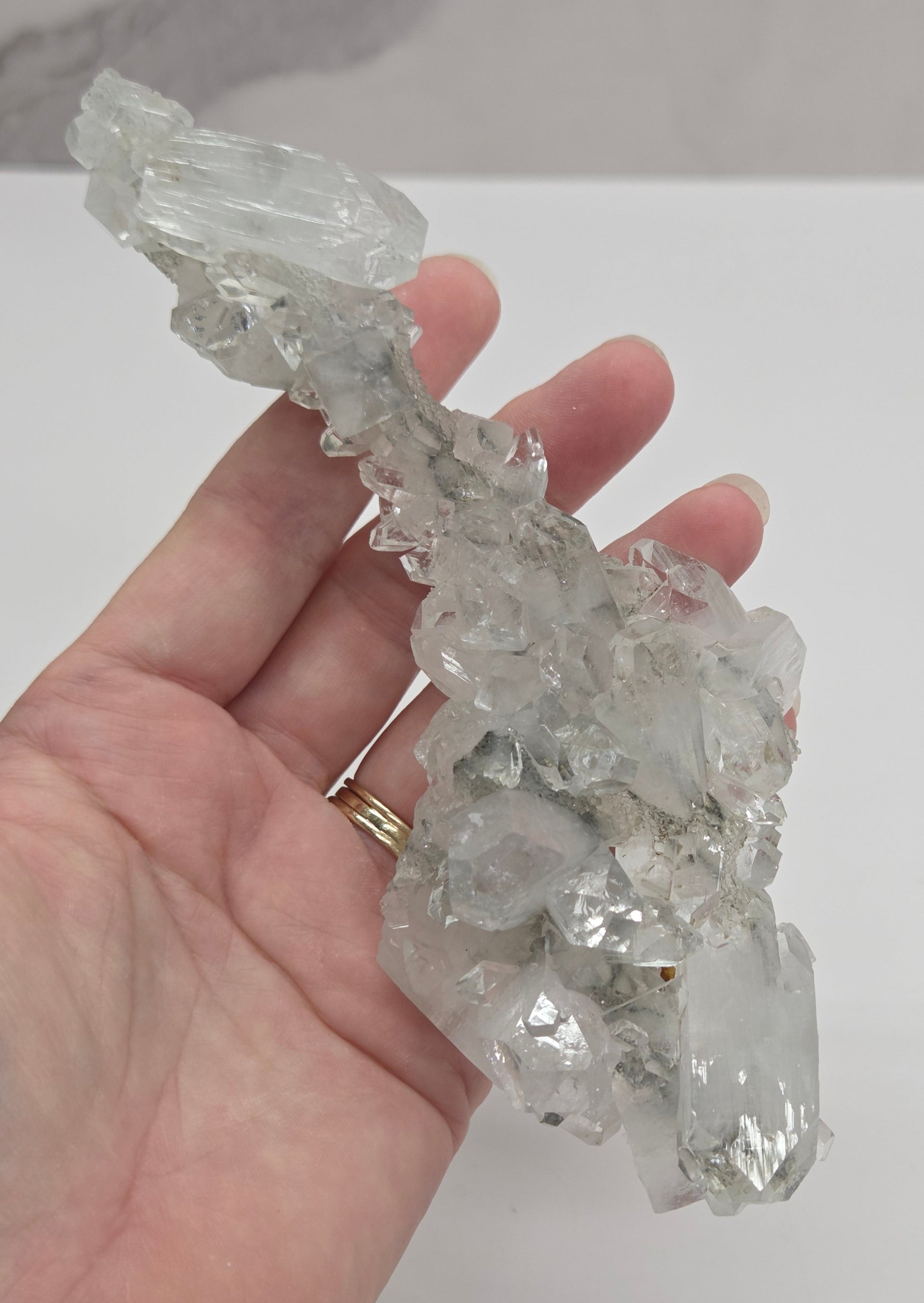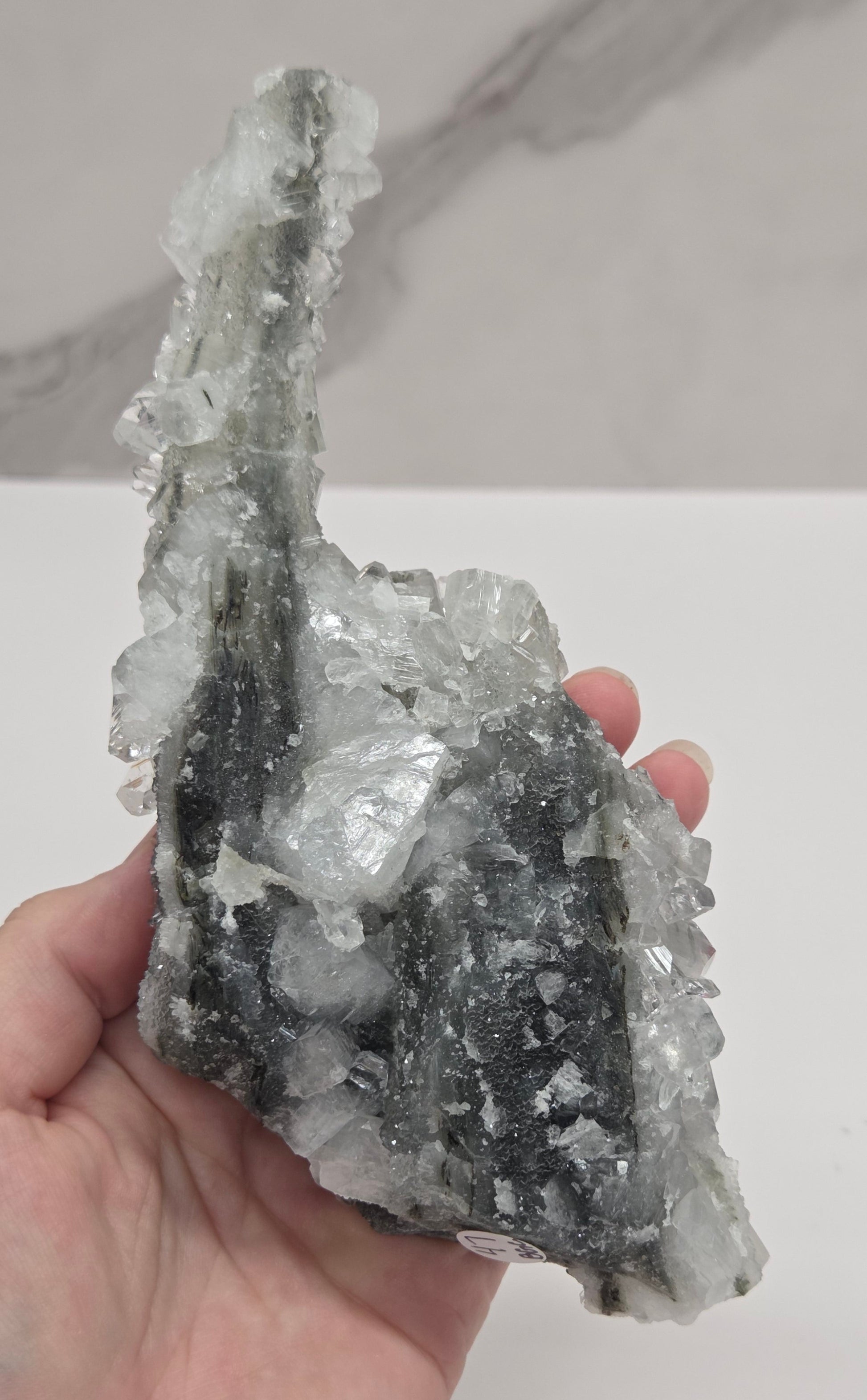 Sparkly diamond Apophyllite is characterized by its clear, white, green, or peach colors and its tendency to form in pyramidal or cubic structures. Some of these beautiful specimens are found on black quartz and/or chalcedony.