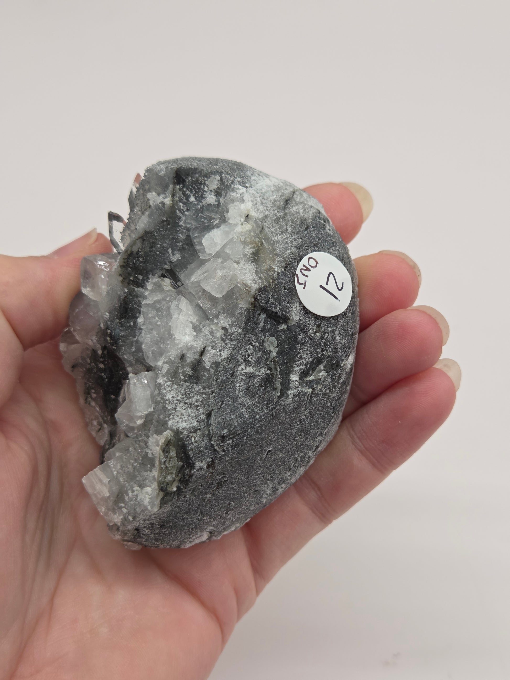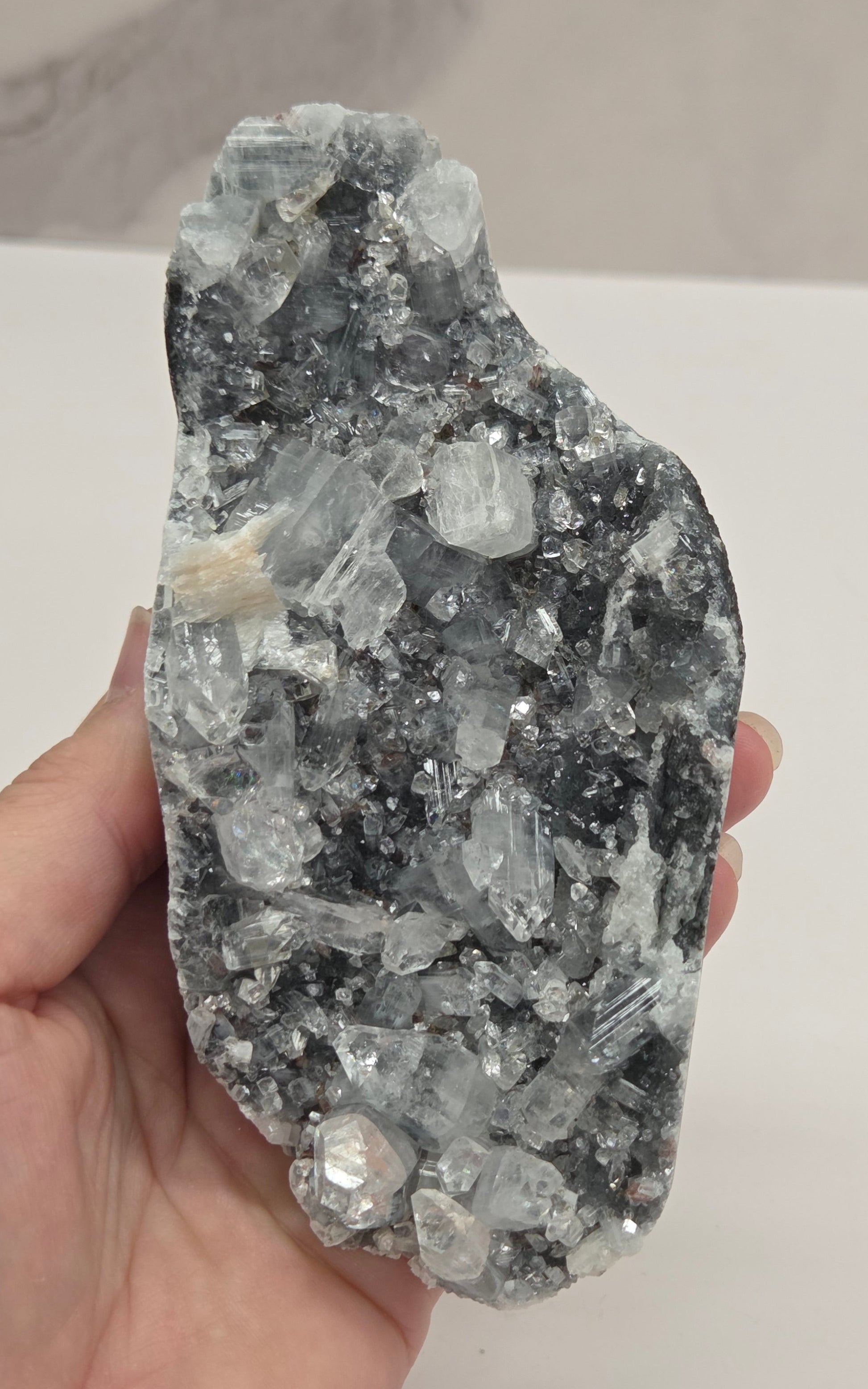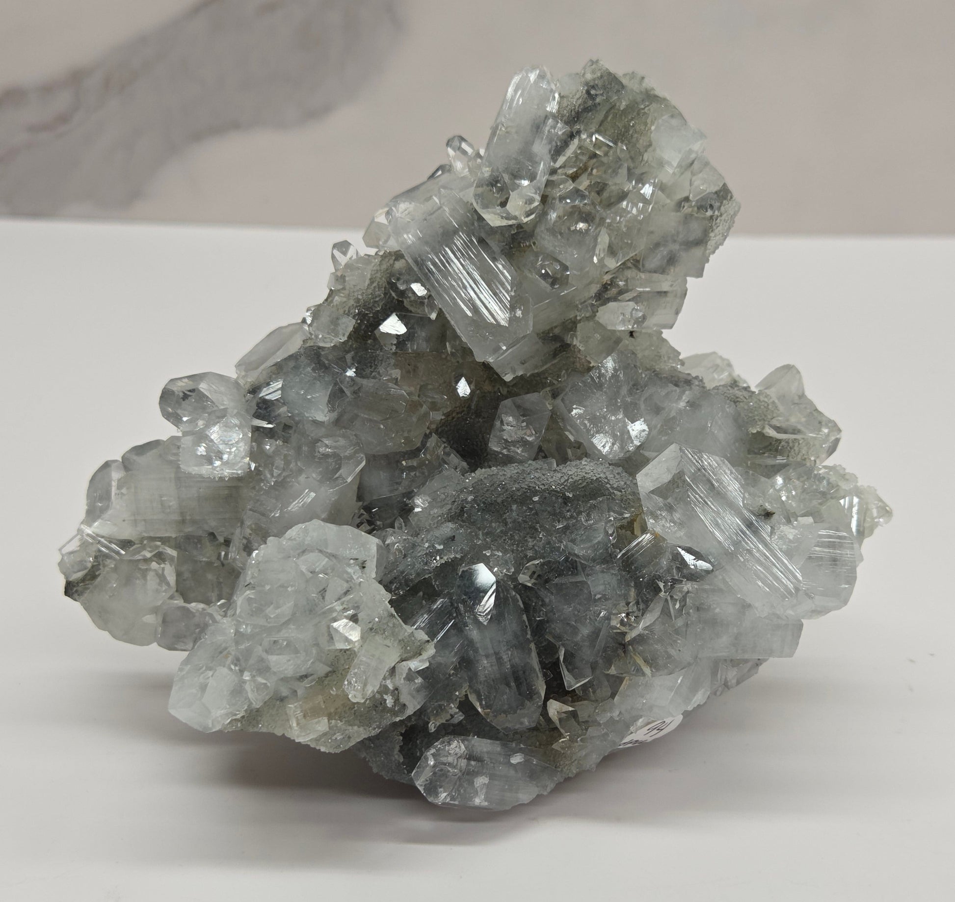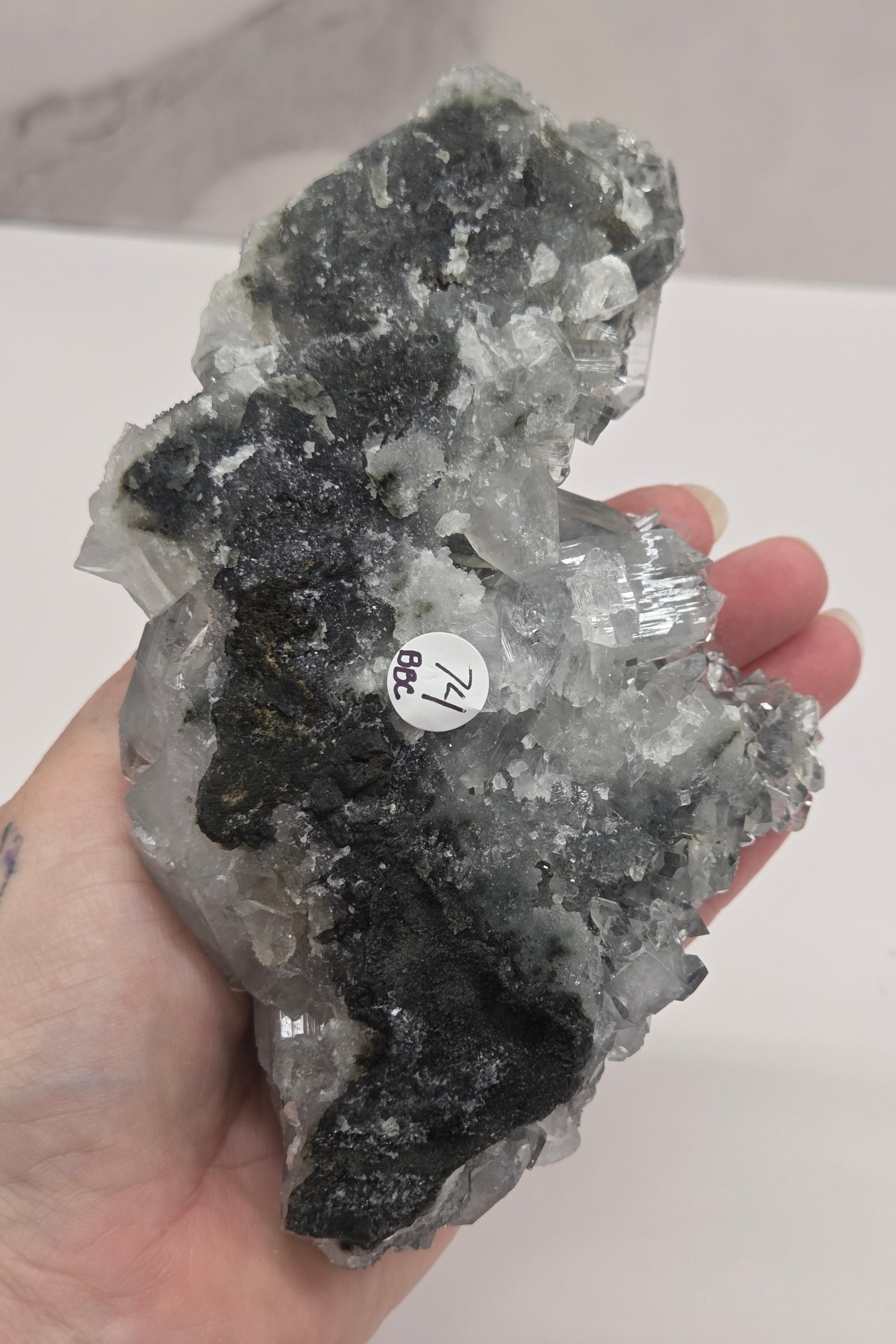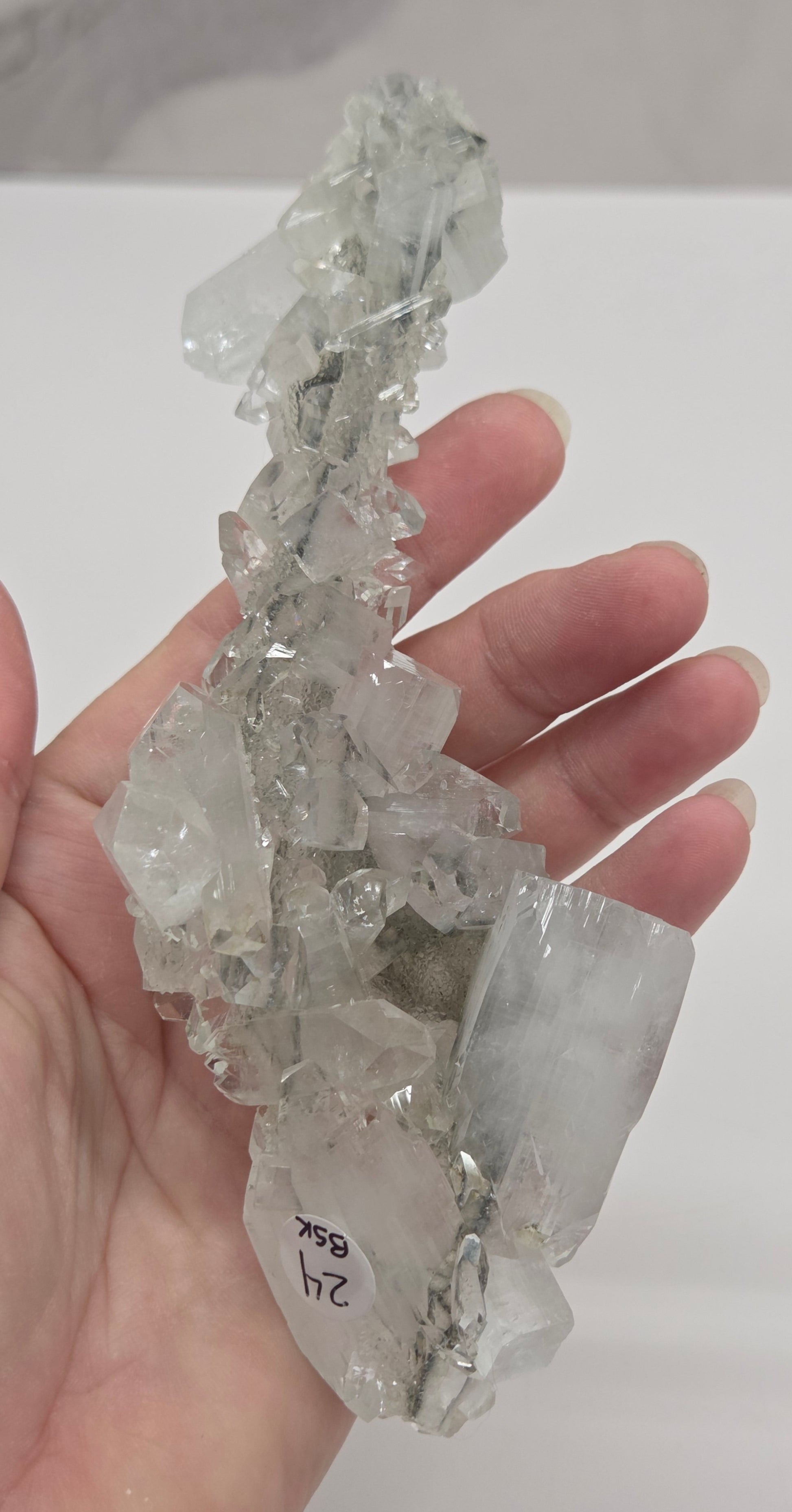 Sparkly diamond Apophyllite is characterized by its clear, white, green, or peach colors and its tendency to form in pyramidal or cubic structures. Some of these beautiful specimens are found on black quartz and/or chalcedony.