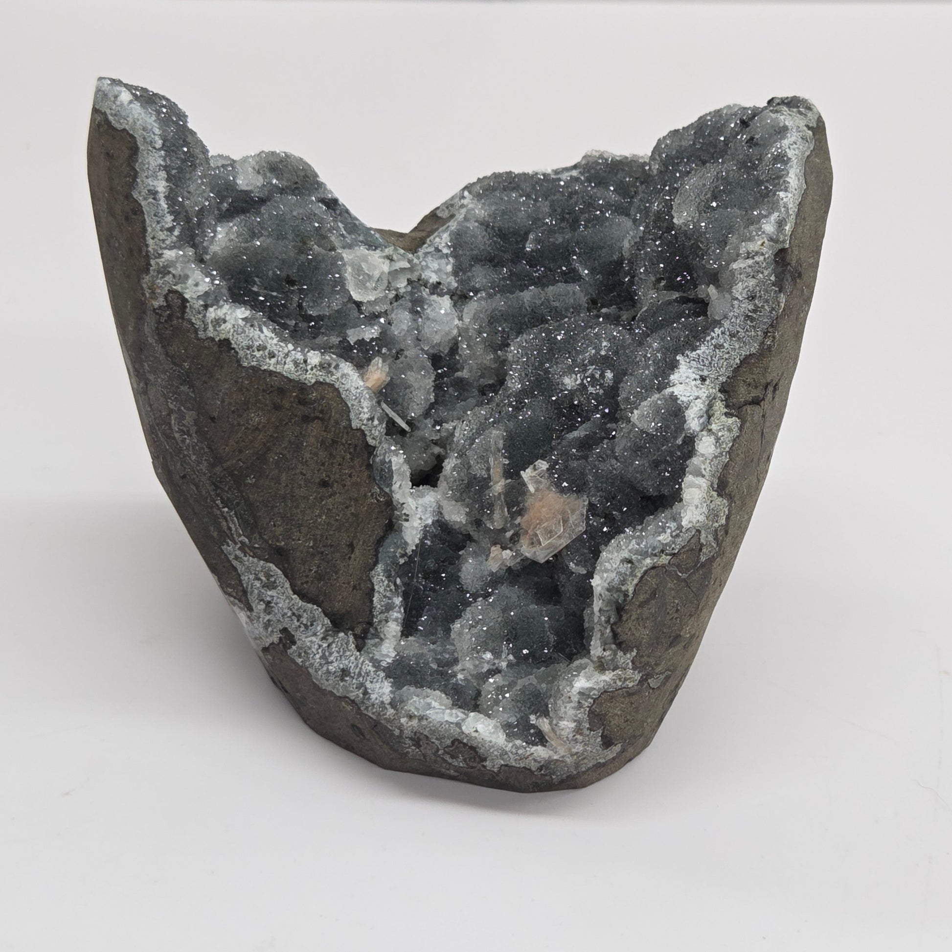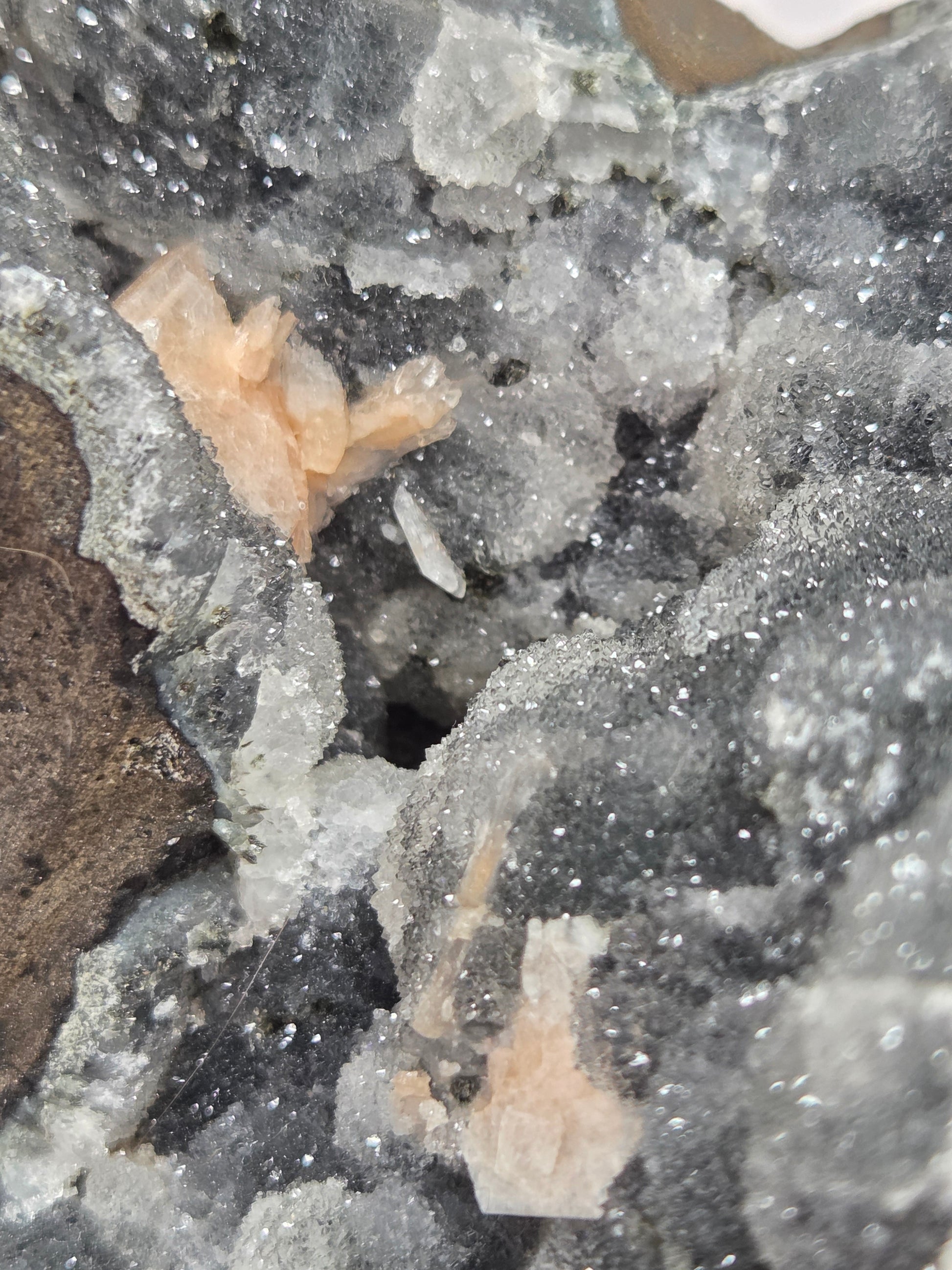 Beautiful Apophyllite on black Chalcedony & peach Stillbite cut base.