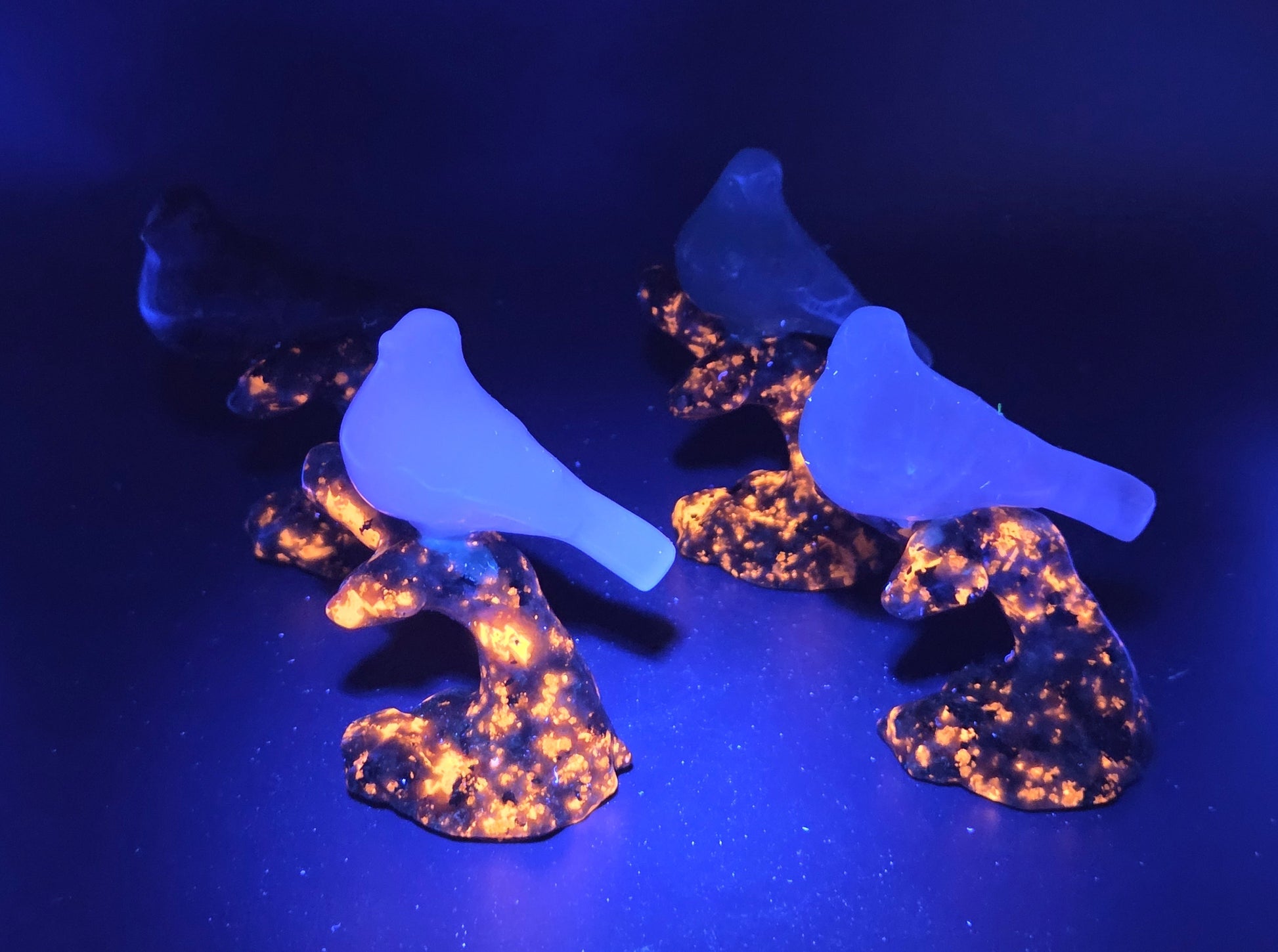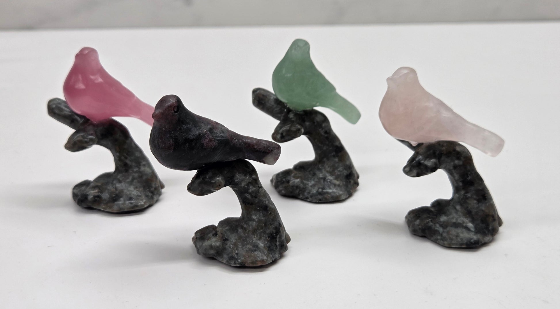 Birds in a variety of materials sitting on a Yooperlite limb. Each measures approx. 2.25"