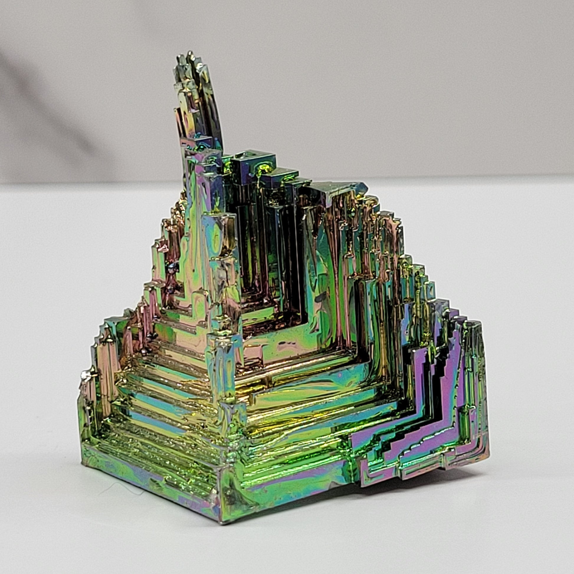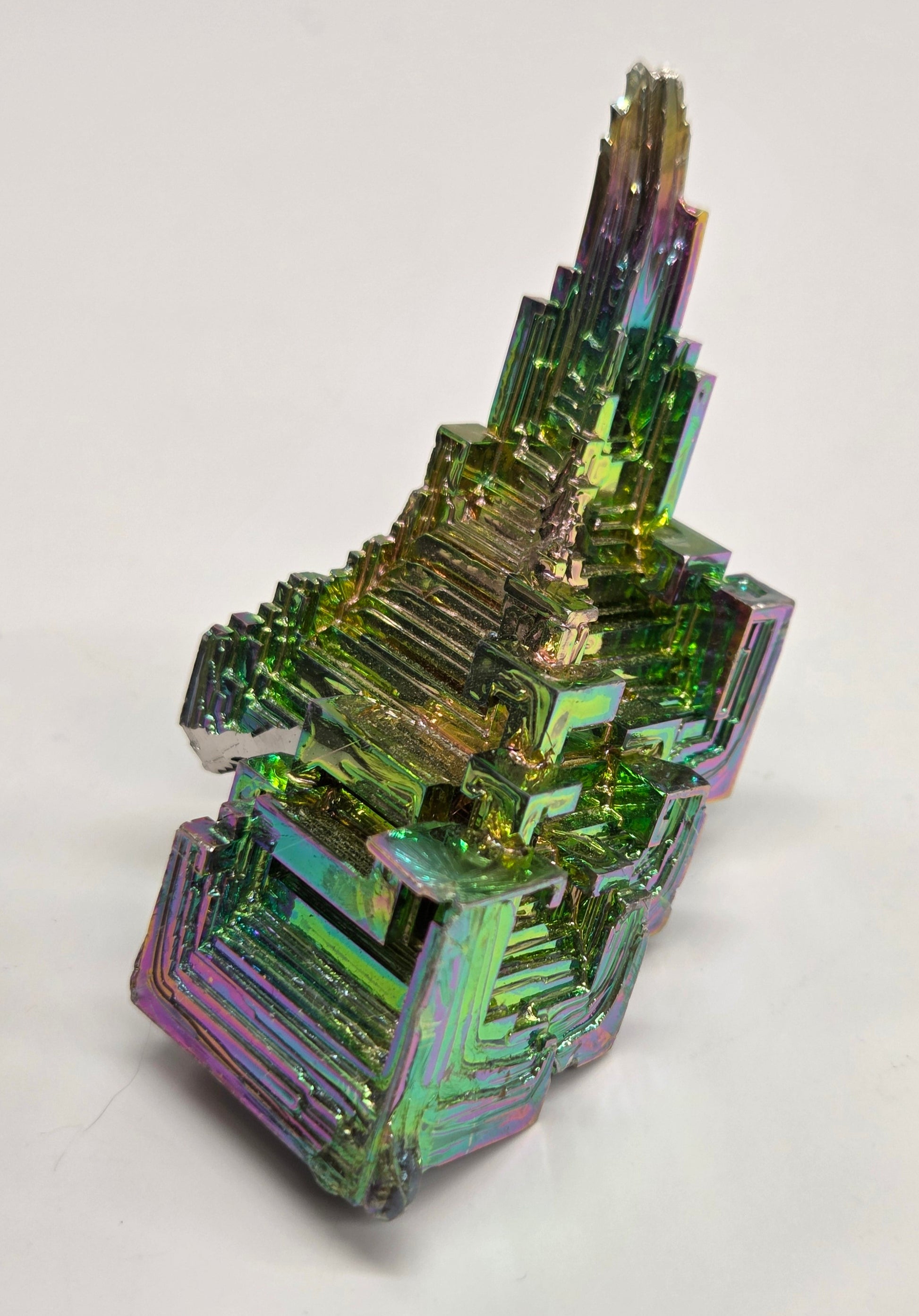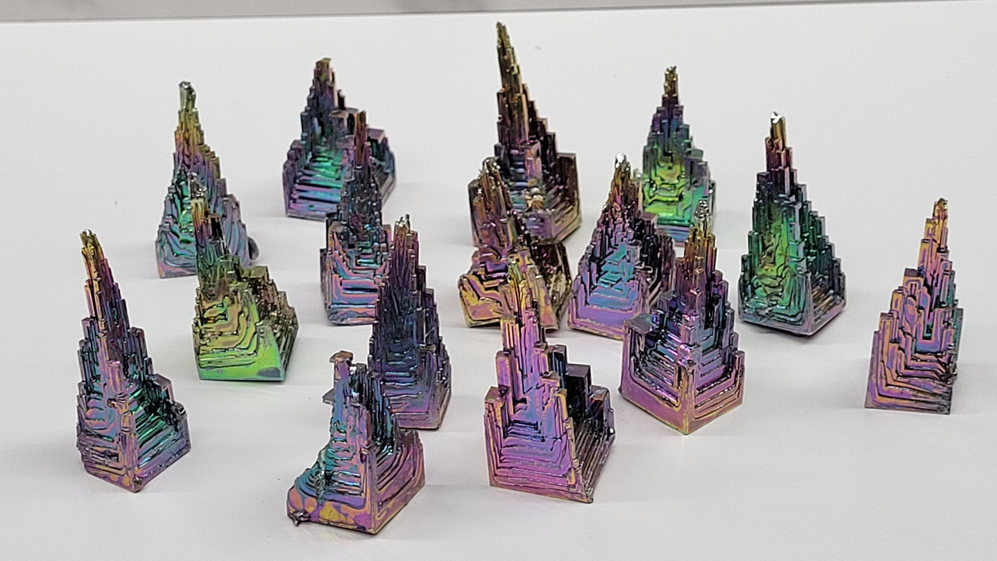 While naturally silver, bismuth turns vivid rainbow colors when oxidized with heat and allowed to cool. Under the right conditions, this metal forms fascinating geometric patterns, or “crystals,” that typically resemble a series of stacking staircases.