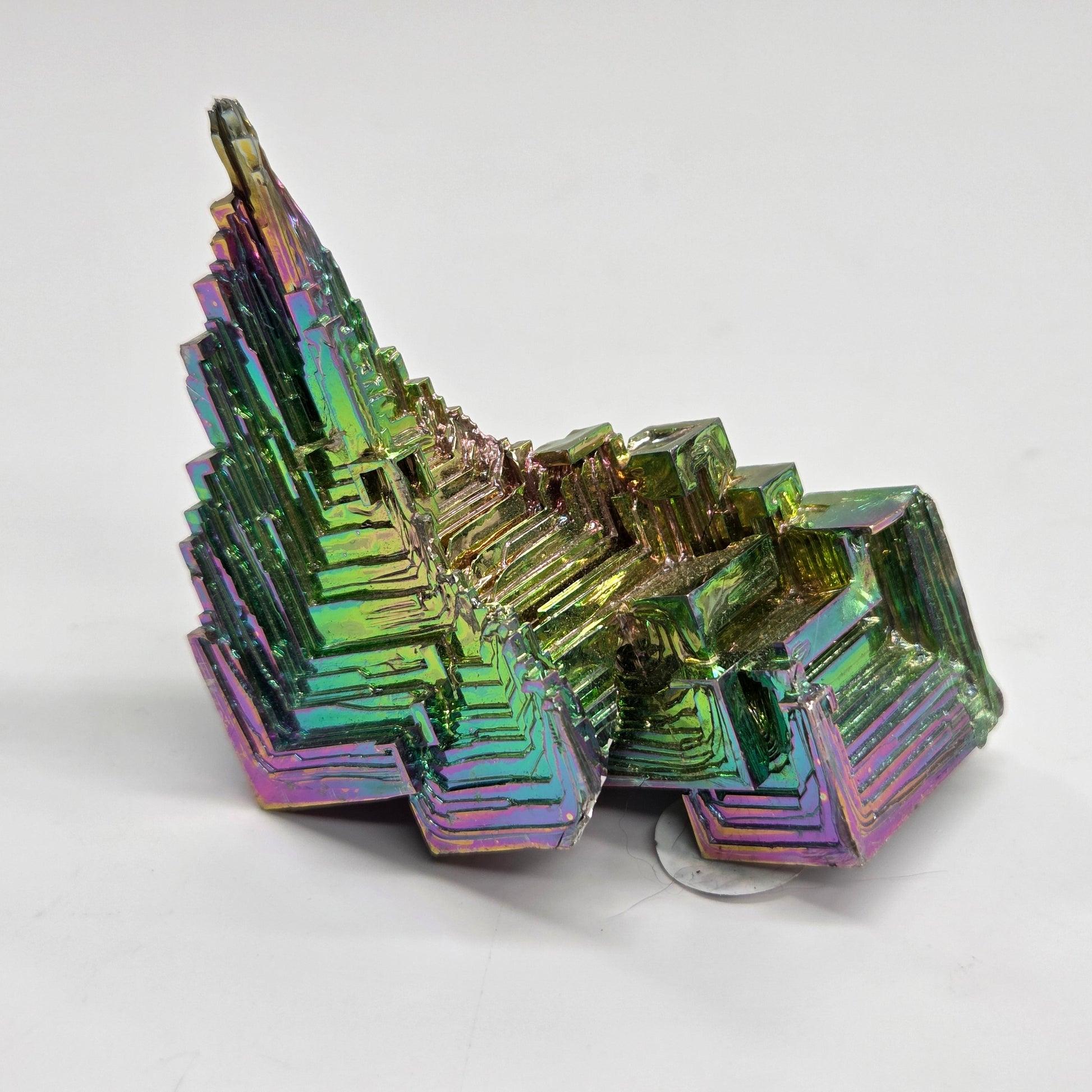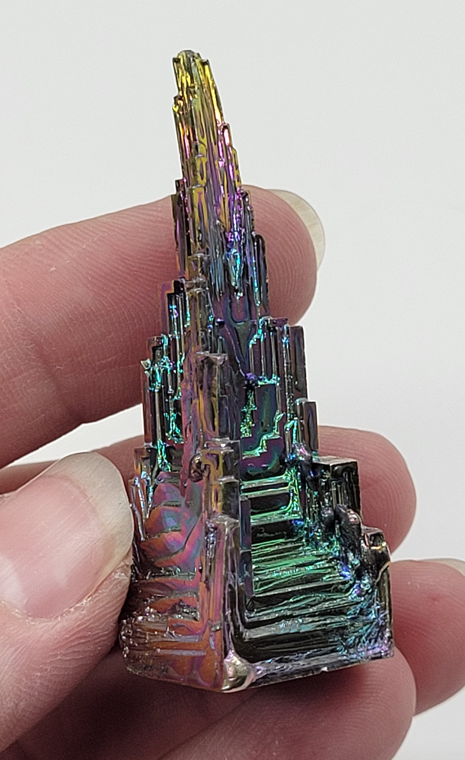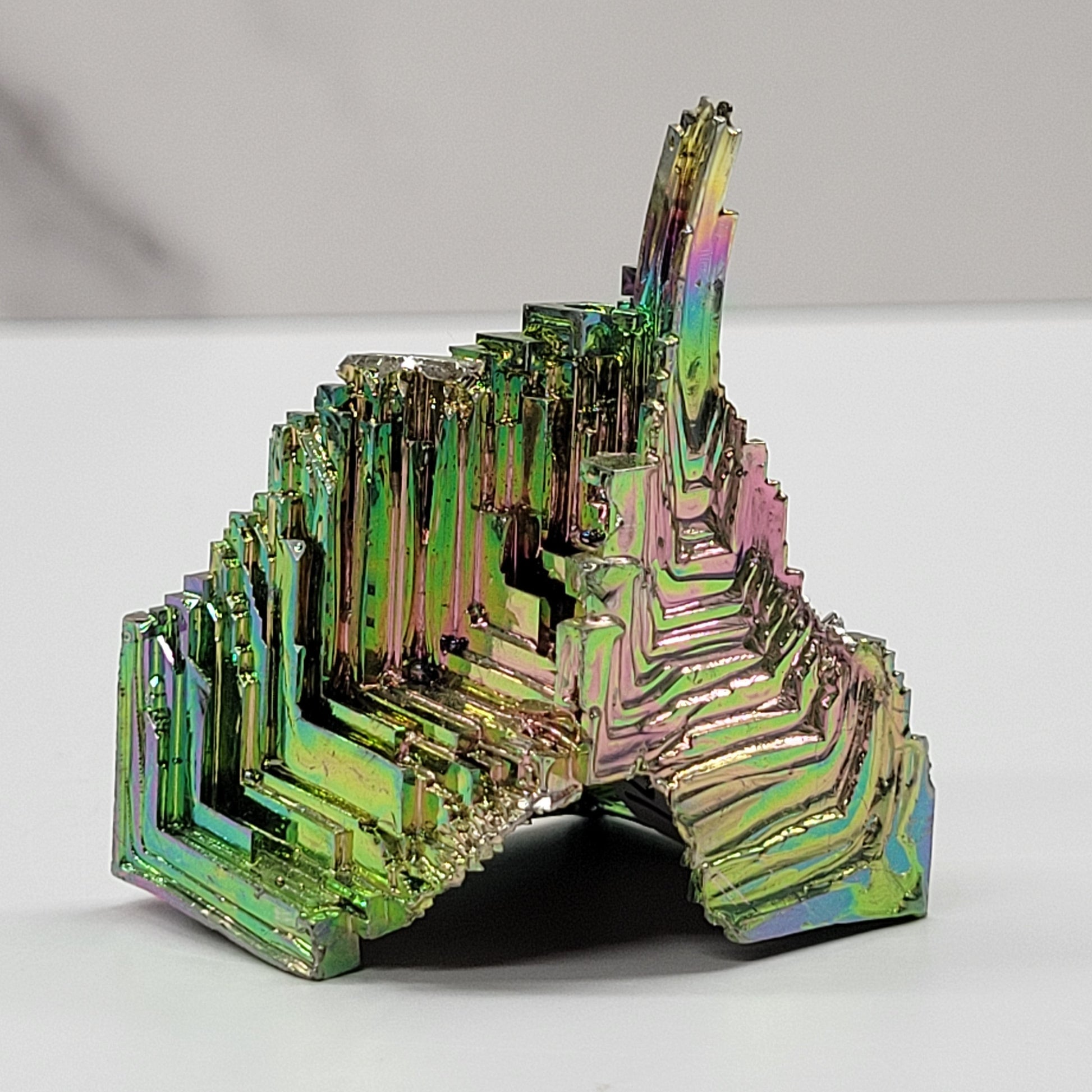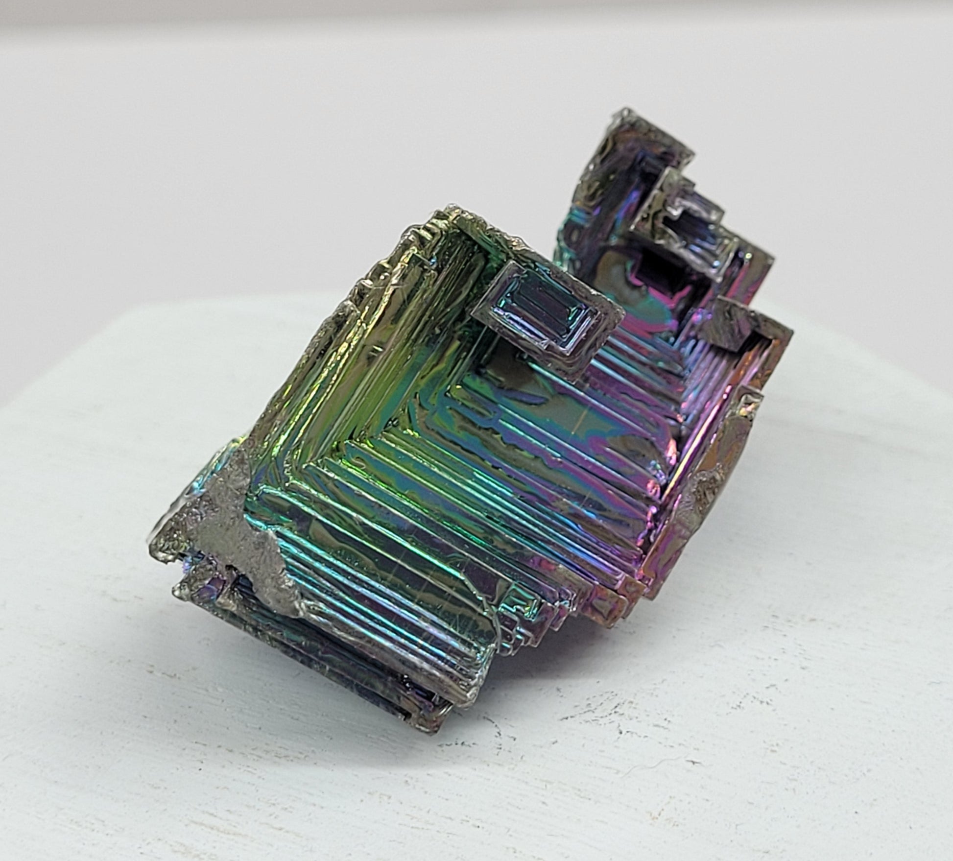 While naturally silver, bismuth turns vivid rainbow colors when oxidized with heat and allowed to cool. Under the right conditions, this metal forms fascinating geometric patterns, or “crystals,” that typically resemble a series of stacking staircases.