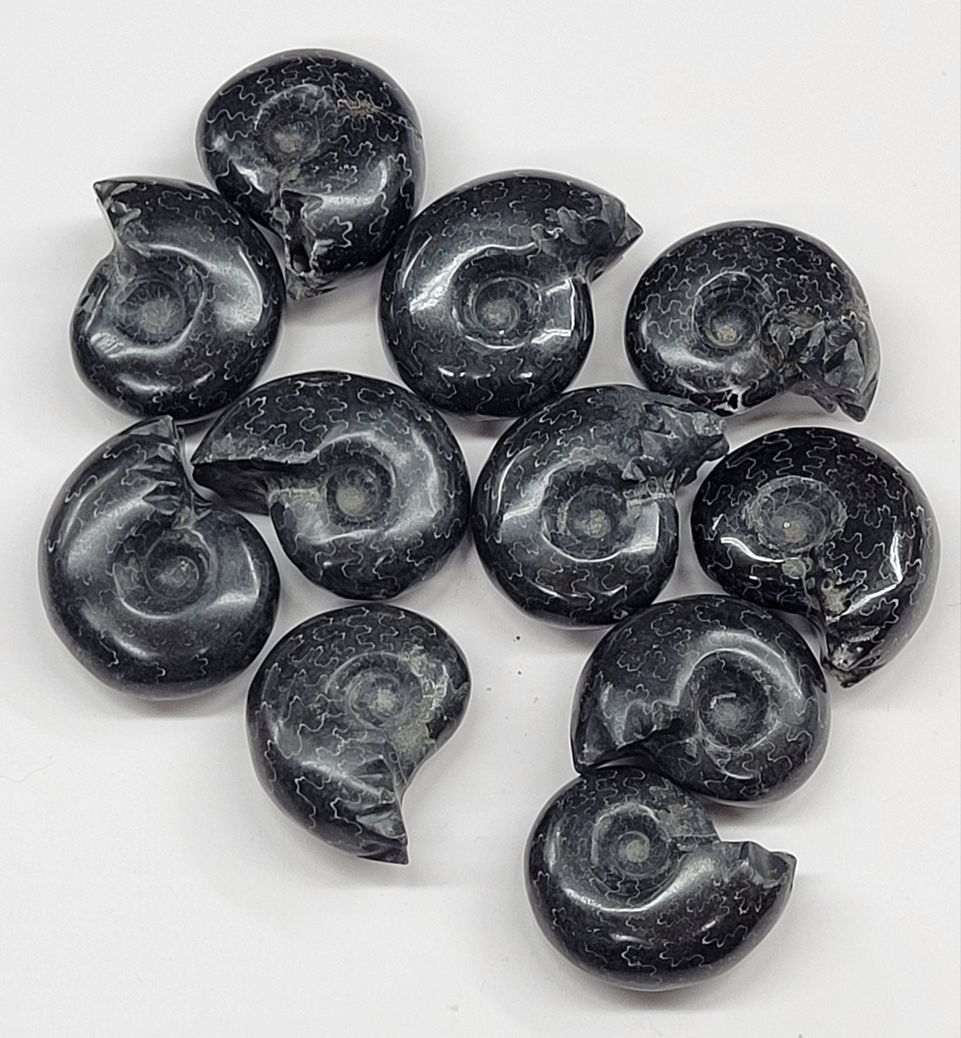 Ammonite fossils come from marine animals belonging to a phylum of Mollusks and the Class Cephalopods. They had a coiled shell. The Ammonites were like the modern-day octopus but today the octopus have lost their shell. Ammonites evolved some 416 million years ago and were once one of the most abundant animals of the Paleozoic seas. The creature lived within the shell which formed into a spiral. The spiral was made up of ever-increasing chambers. Within the chambers was a structure called a siphuncle which allowed the ammonite to pump air into the chambers allowing it to remain buoyant as it swam.