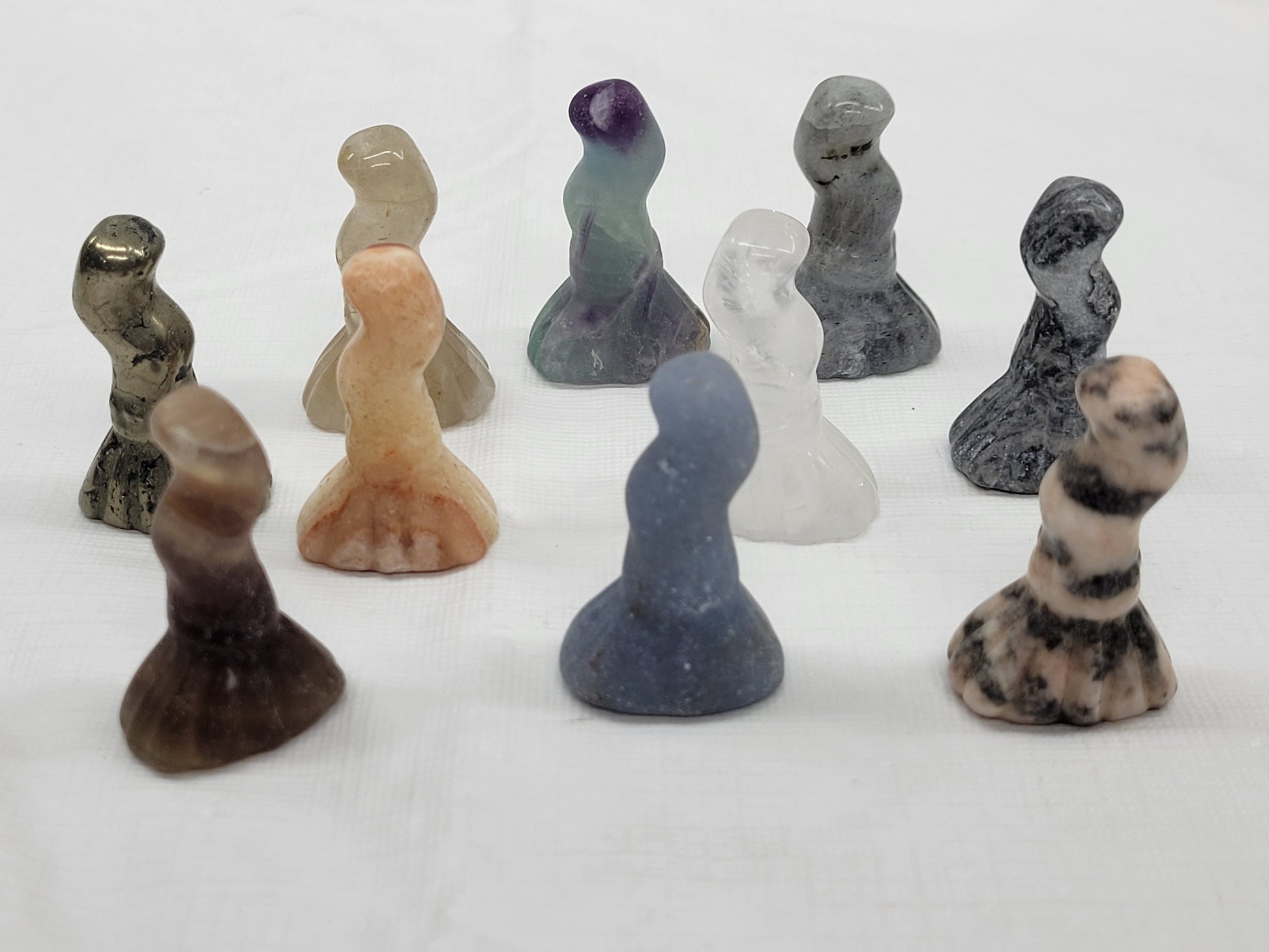Broom carvings in a variety of materials. Each broom measures 1.75" tall