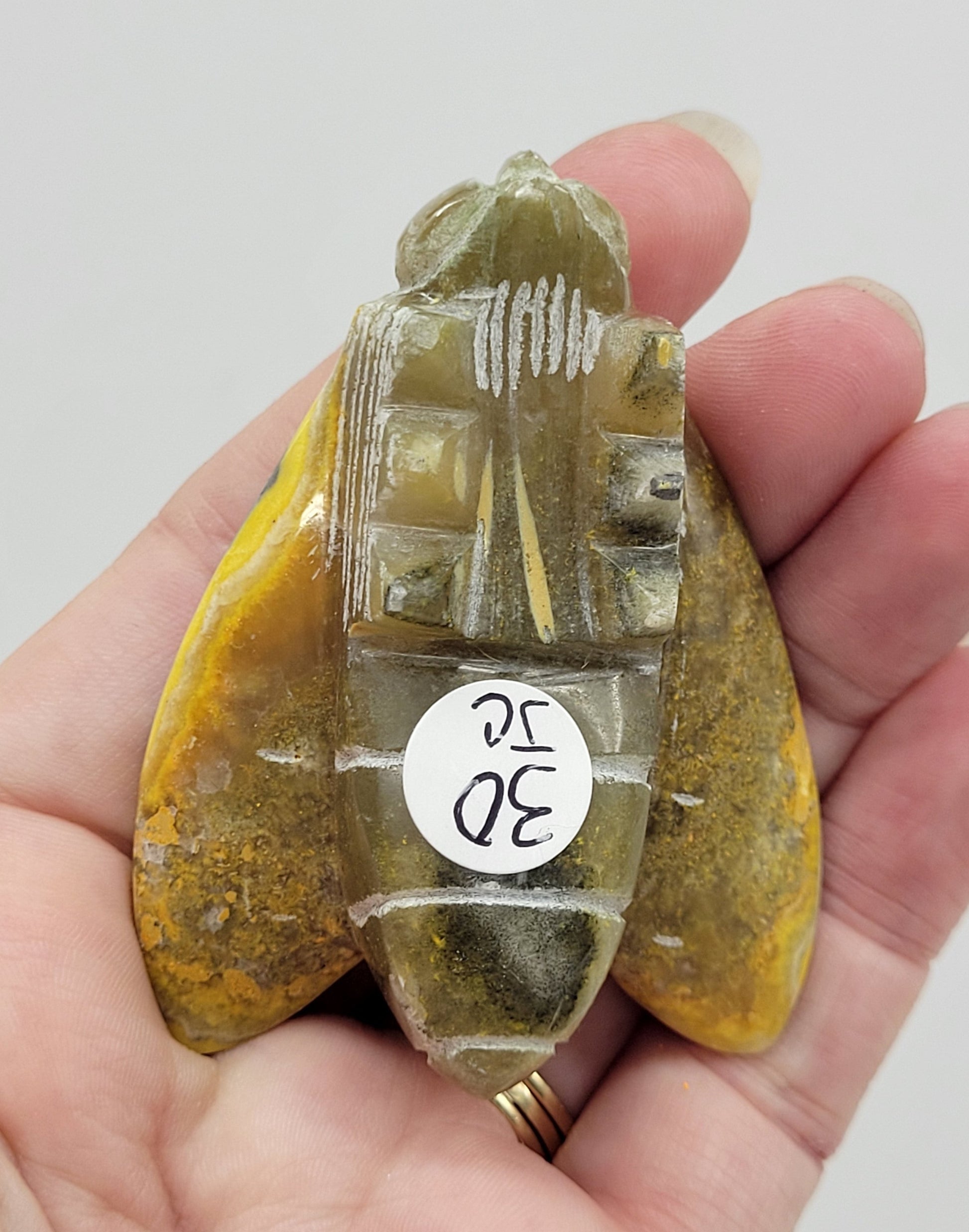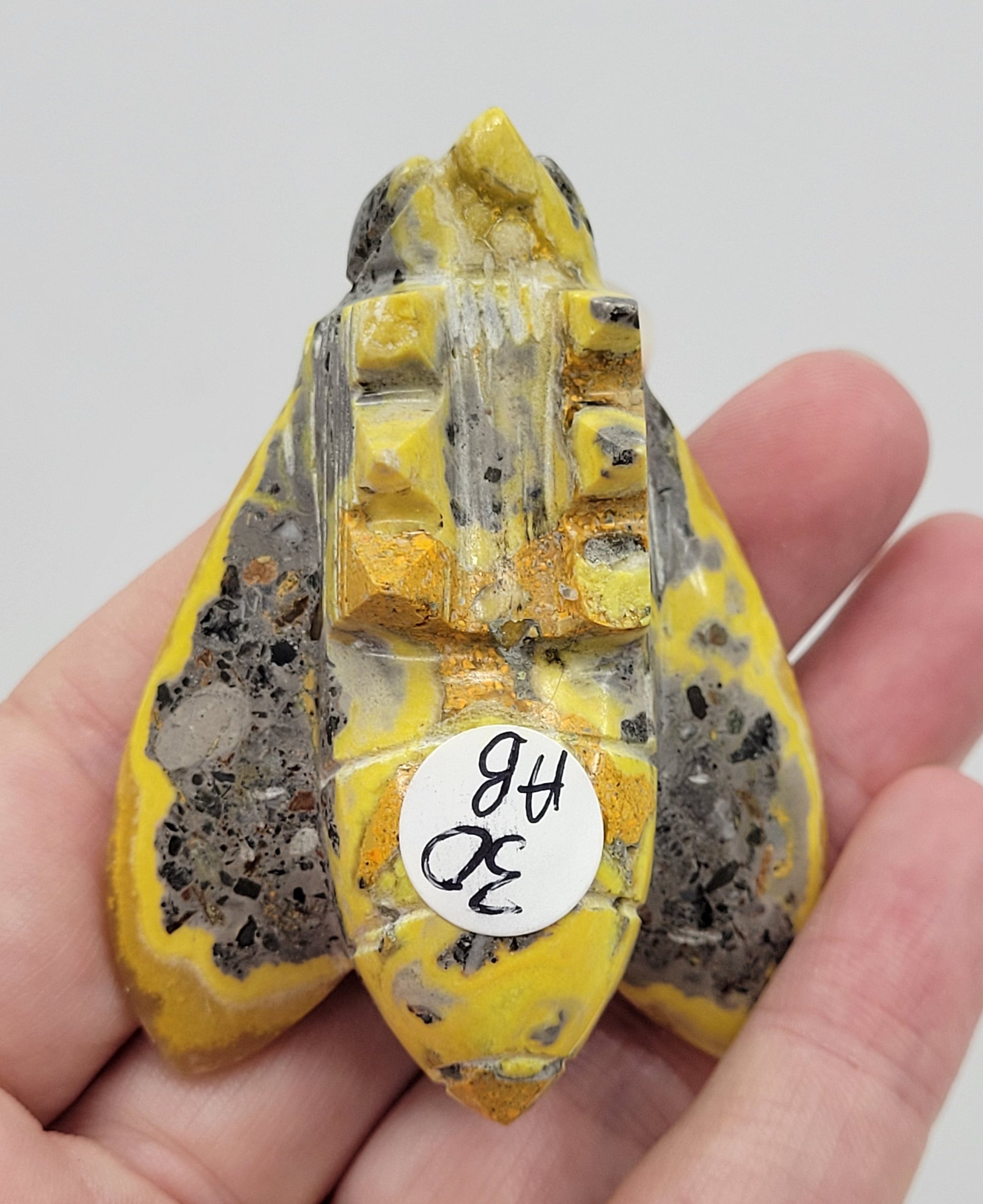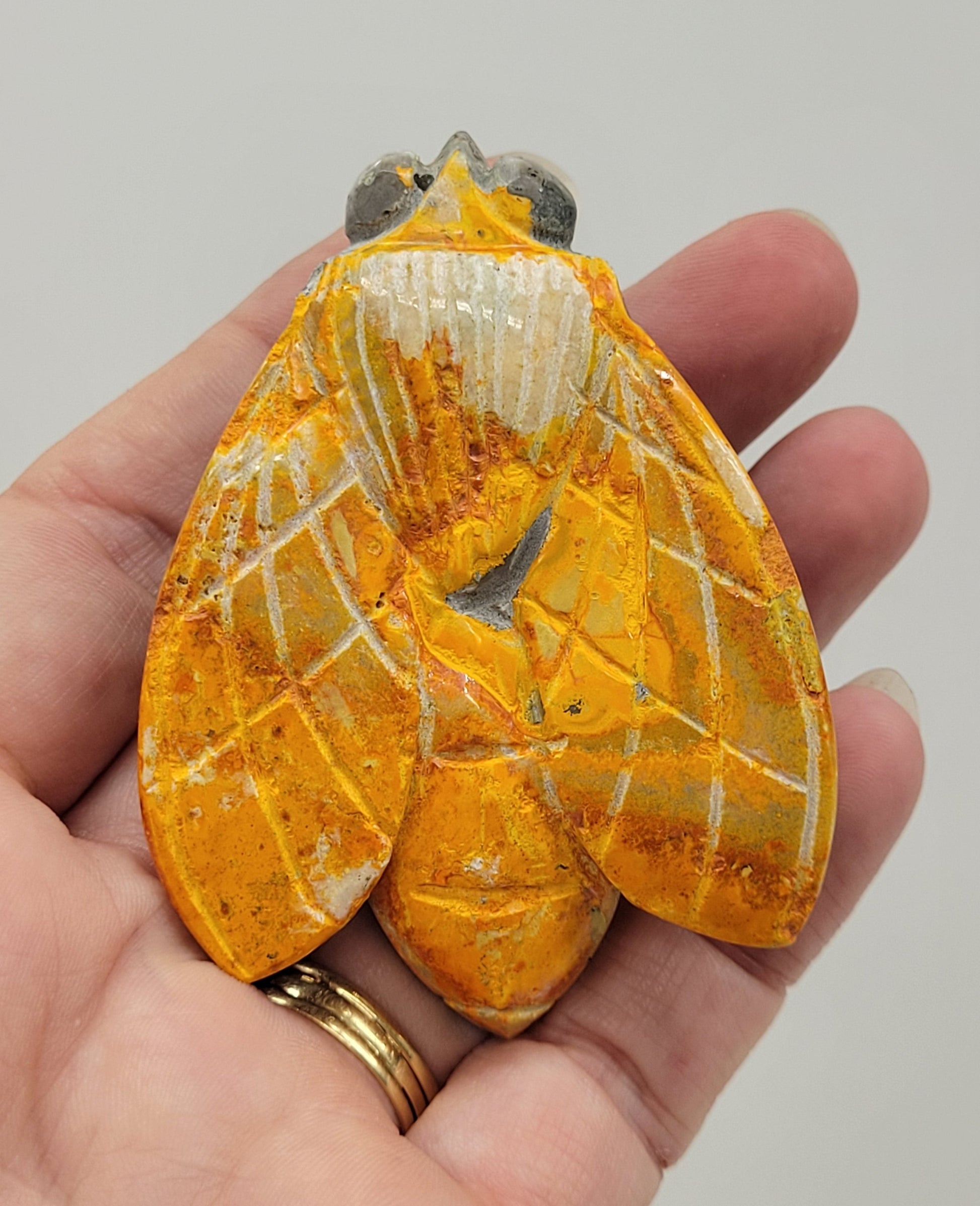 Bumblebee Jasper is mined in Indonesia from the side of a volcano by a company called Indoagate.com. Bumblebee jasper is a mixture of volcanic matter, including anhydrite, sulfur, arsenic, and hematite. The stone's vivid colors come from sulfur and arsenic compounds. Bumblebee Jasper is not a true jasper, but a stone called Travertine and has a calcite base making it soft but brilliant colored.