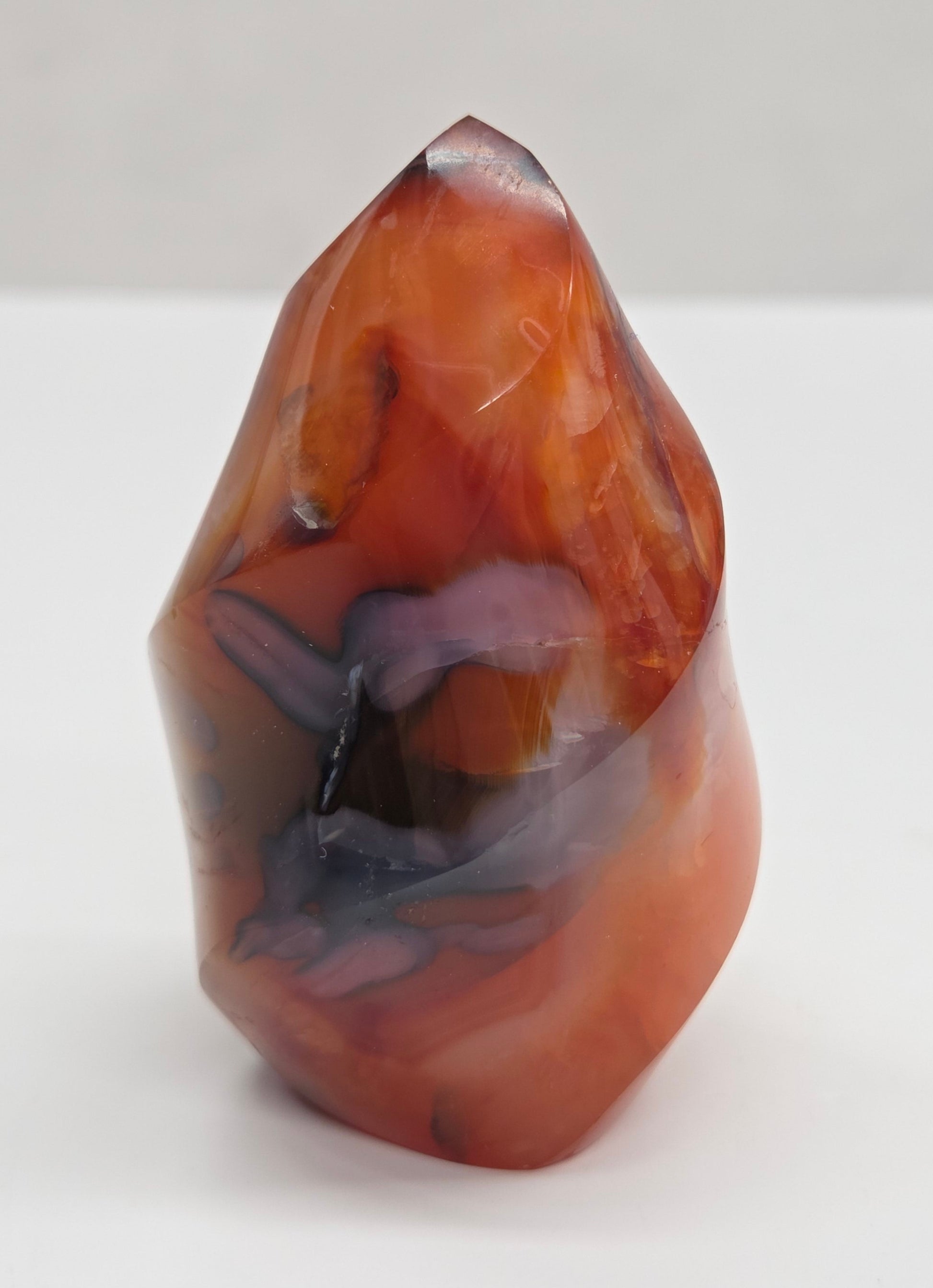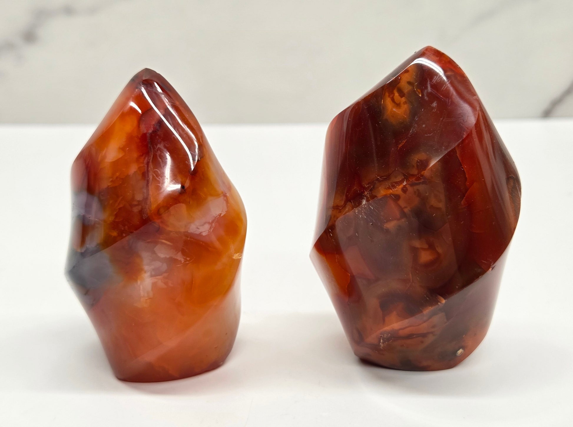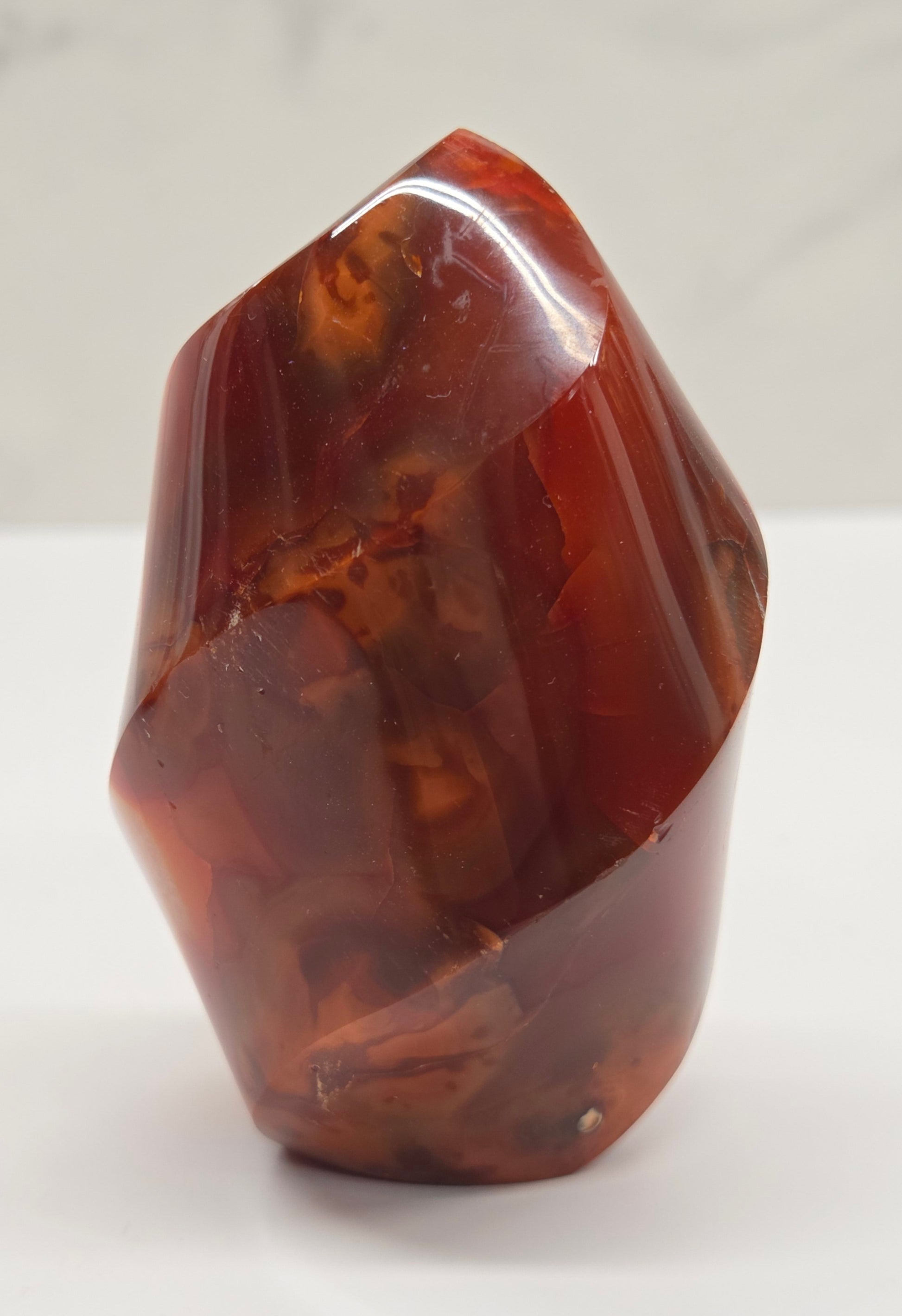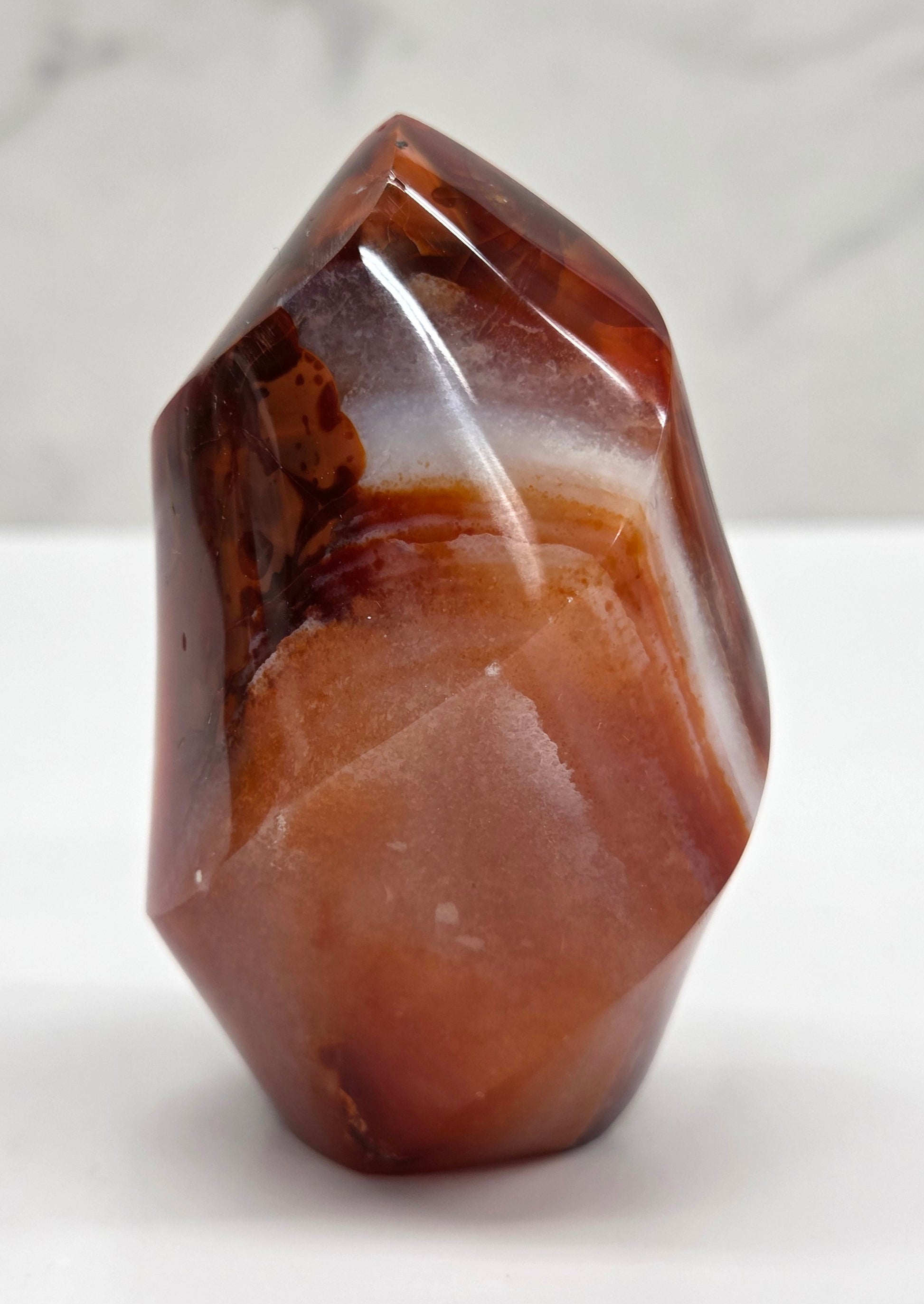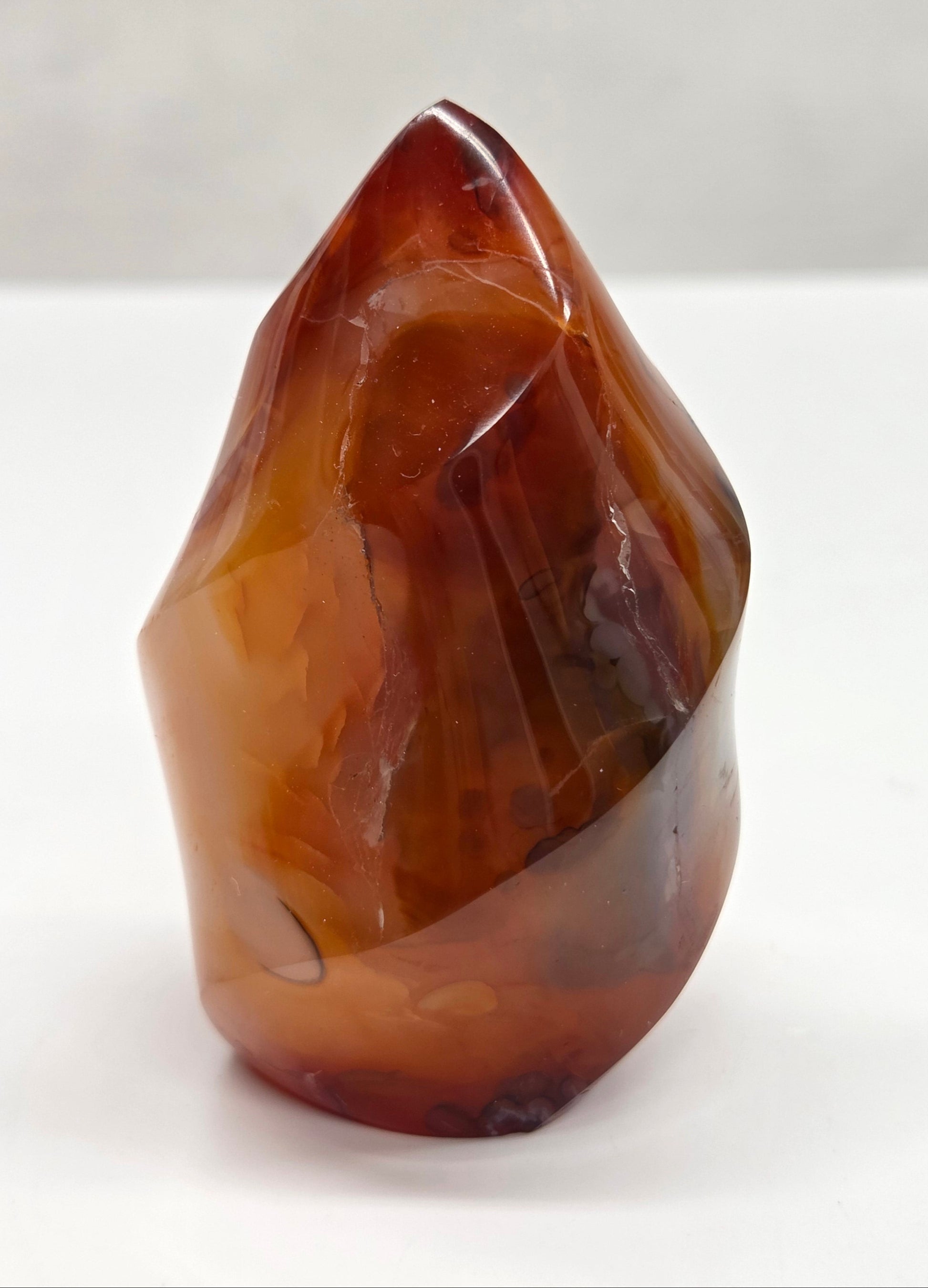 A glassy, translucent stone, Carnelian is an orange-colored variety of Chalcedony, a mineral of the Quartz family. Its color varies from pale pinkish-orange to a deep rusty brown, though it is most known for its brilliant orange and red-orange crystals.