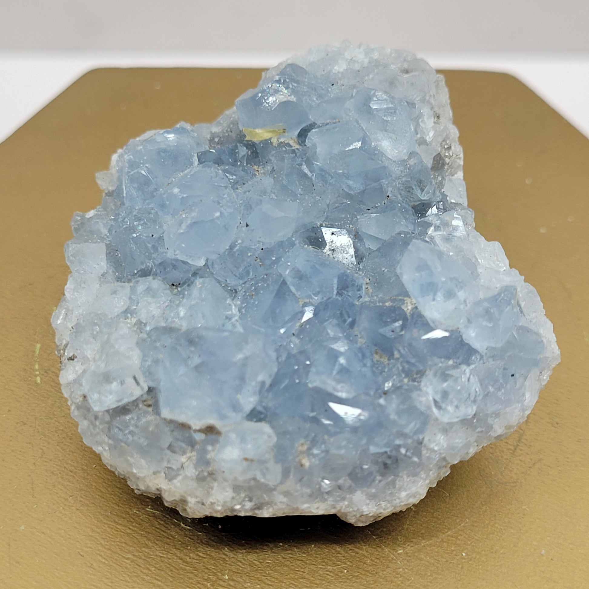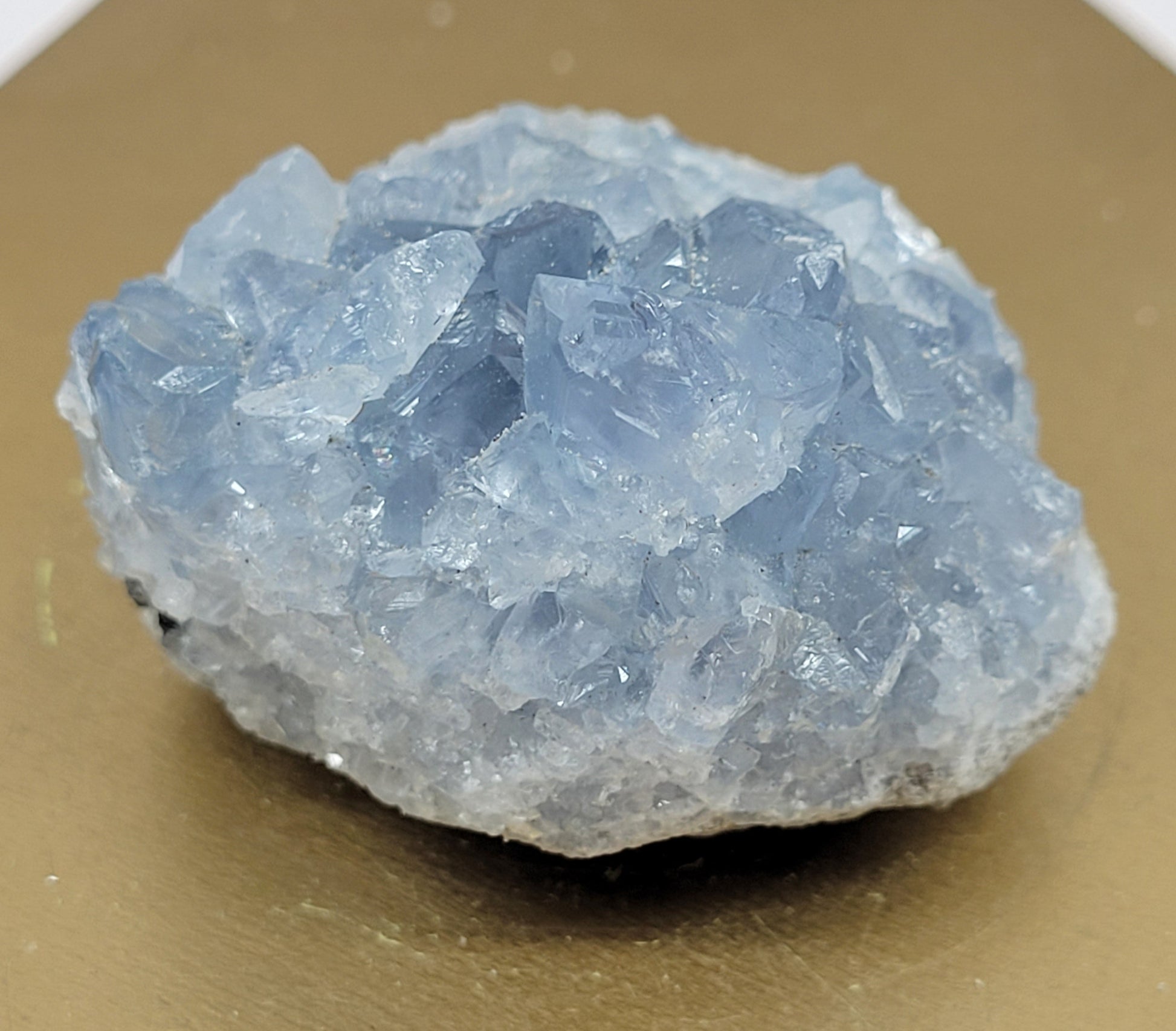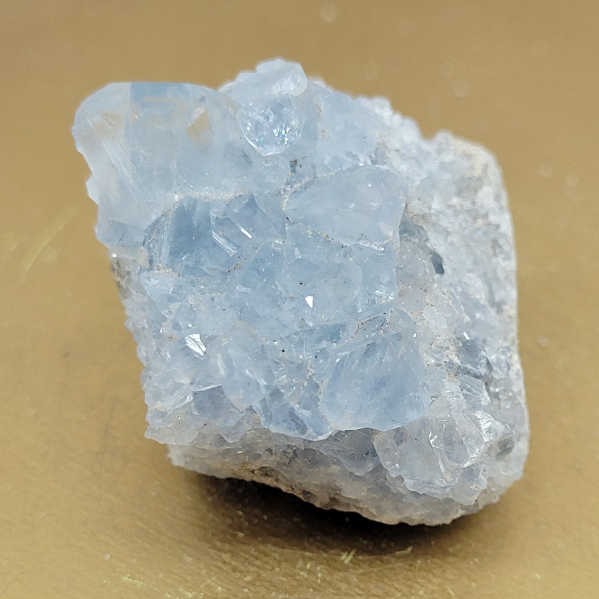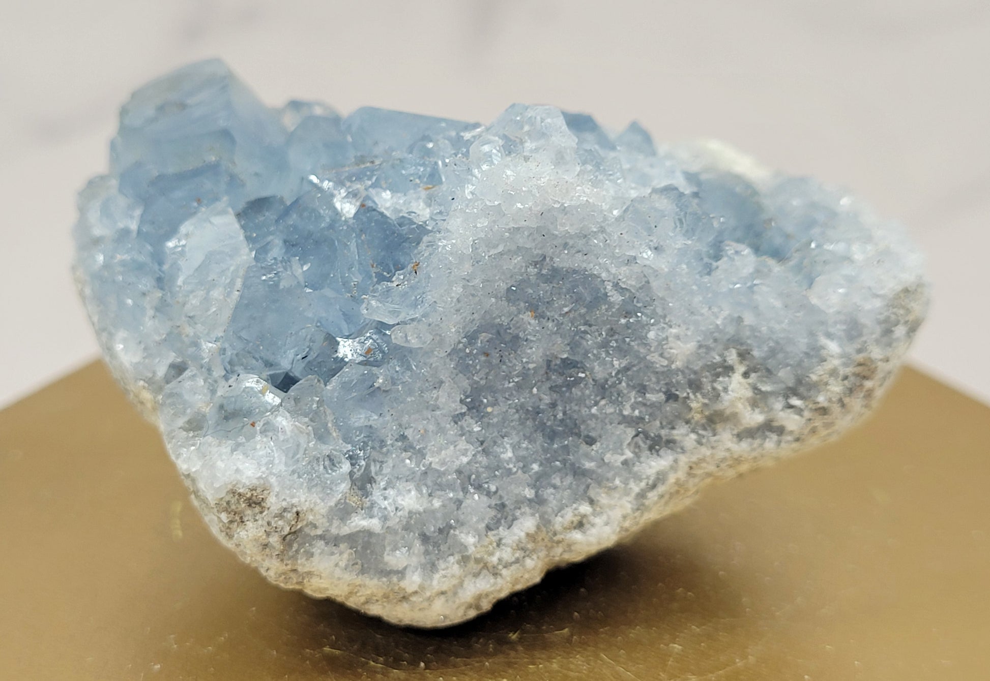 Celestite, also known as Celestine, is a common strontium sulfate mineral that forms within certain geodes. Celestite crystallizes as small prismatic shards that are usually transparent. These shards are very fragile and often break off with very little force from the fingers. The colors of Celestite range from white, grey, green, orange, yellow, brown, and blue.