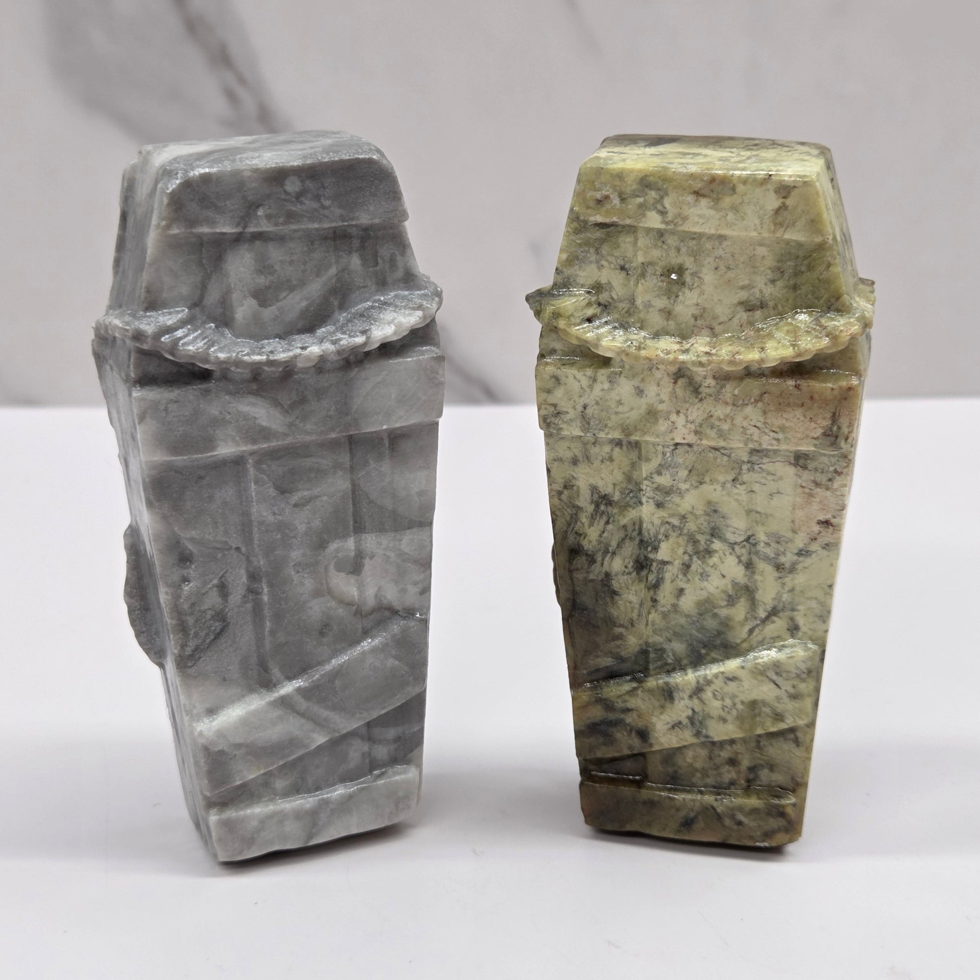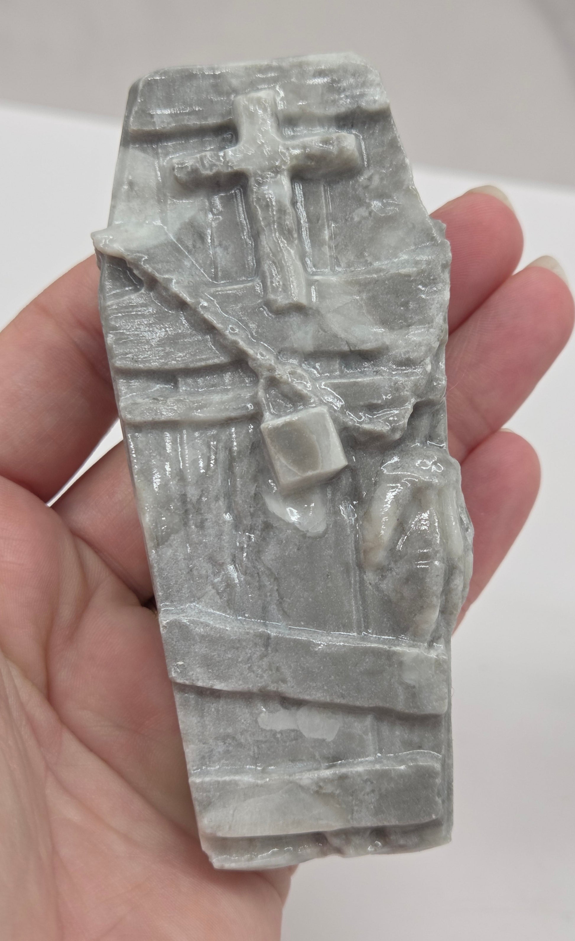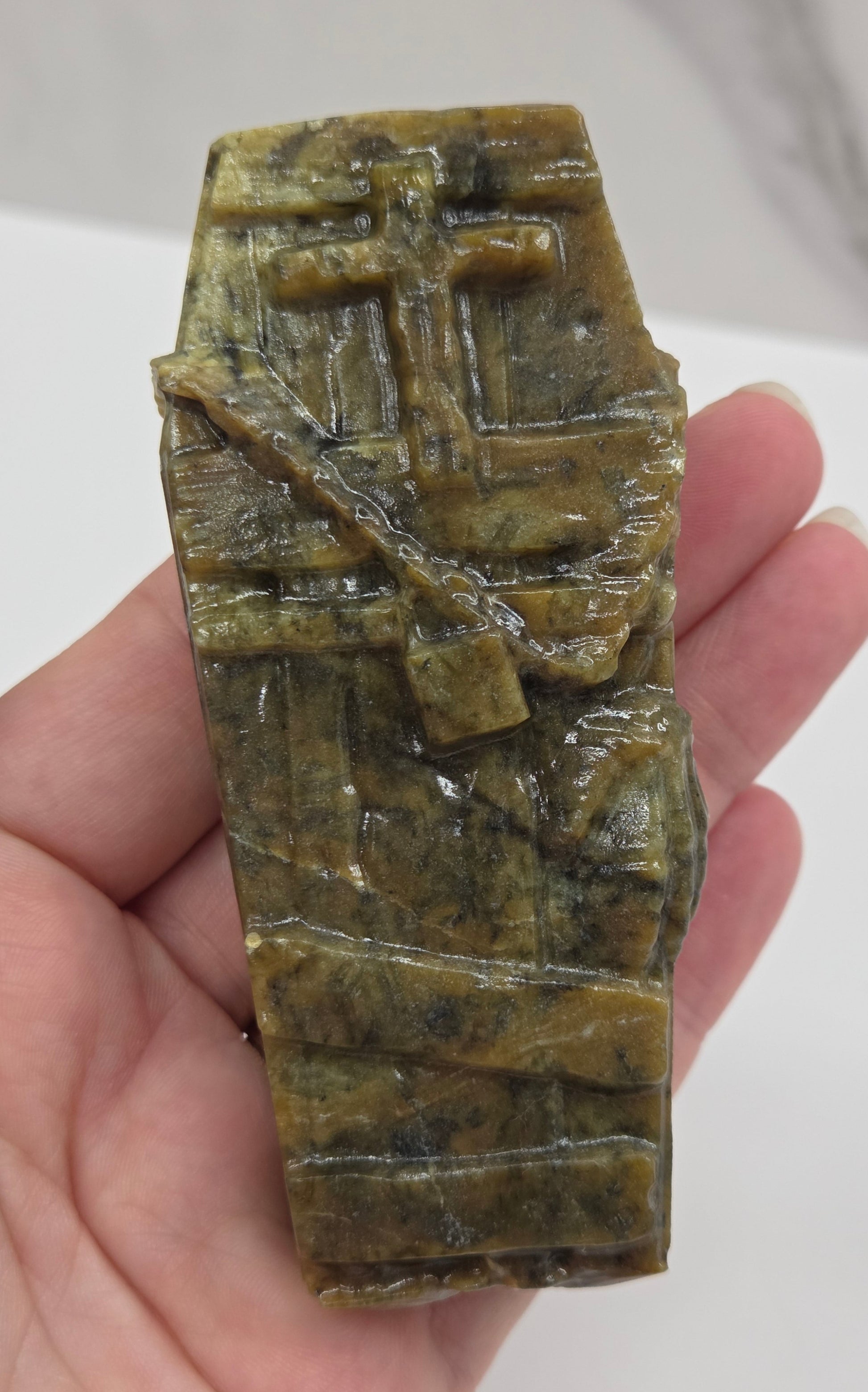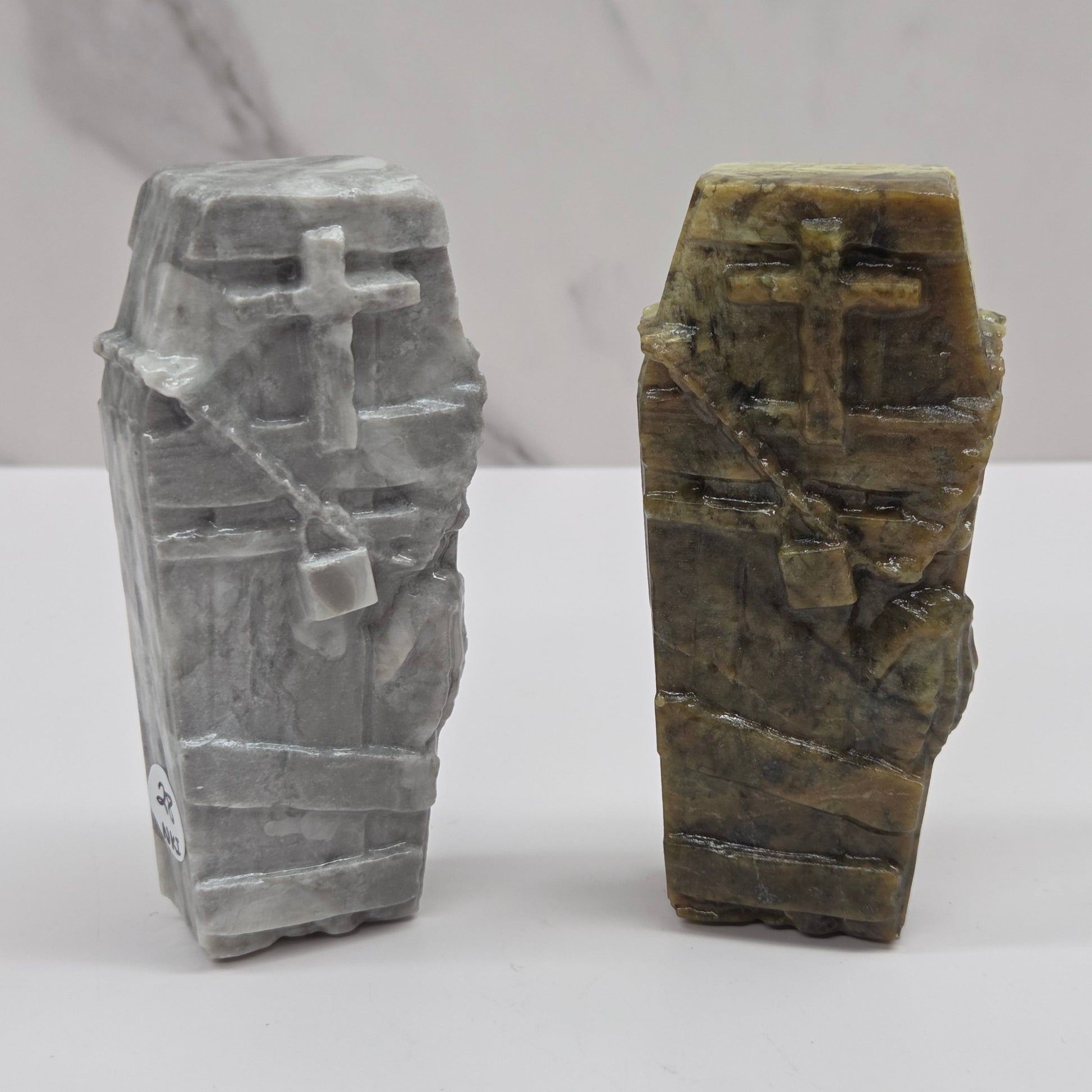 Coffin carvings, complete with chains and a ghostly hand, in a variety of materials.