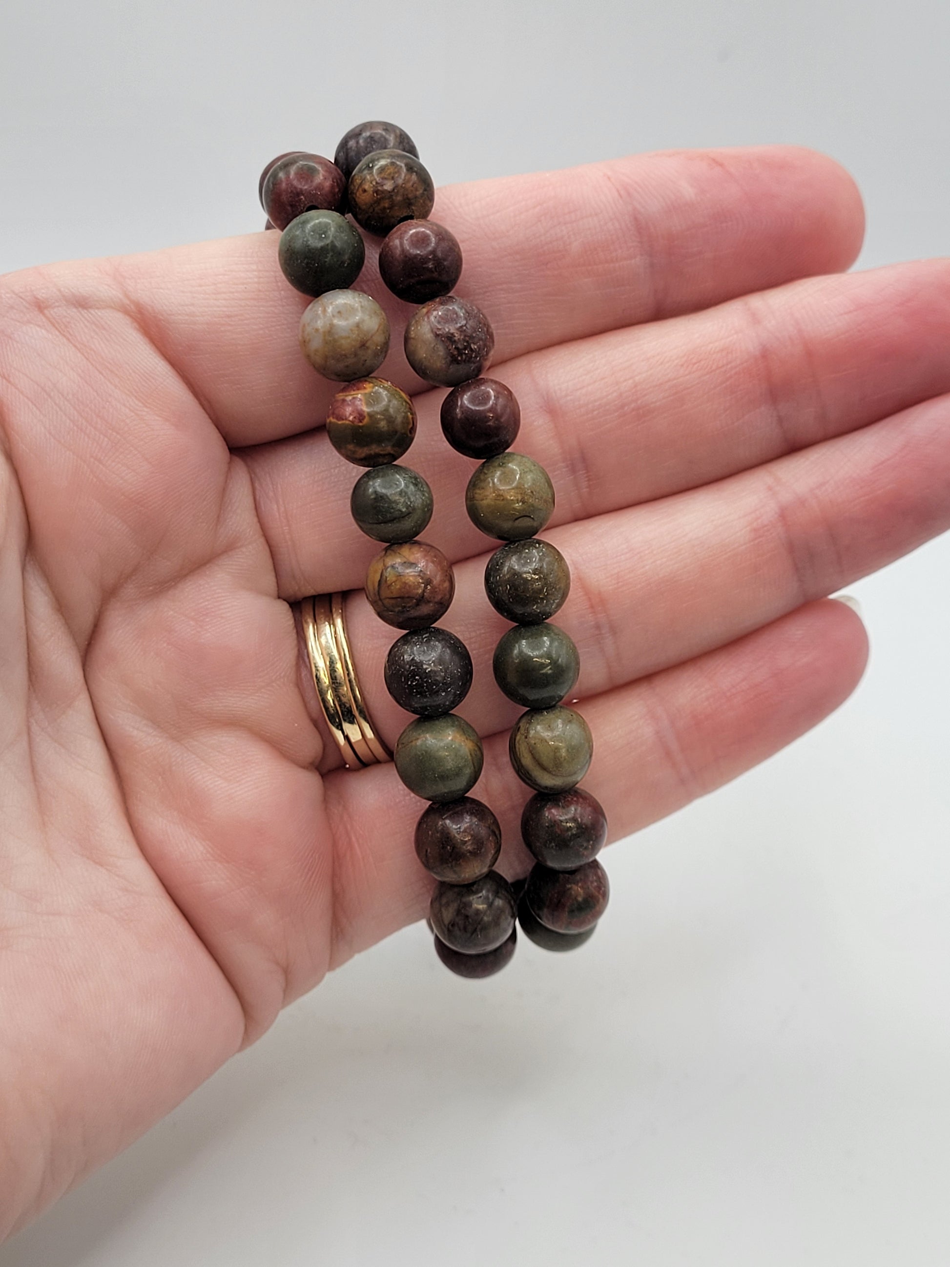 Cherry Creek Jasper is a colorful jasper found in mainland China. It is also known as Red Creek Jasper. It comes from the Cherry Creek Mine and there is a nearby creek named Red Creek. Jasper is a member of the Chalcedony family. Chalcedony (kal SED' nee) is any form of microcrystalline quartz, where the crystals are too small to be seen without high magnification. Jasper usually refers to an opaque stone, with a solid color or an irregular display of colors caused by various mineral impurities.