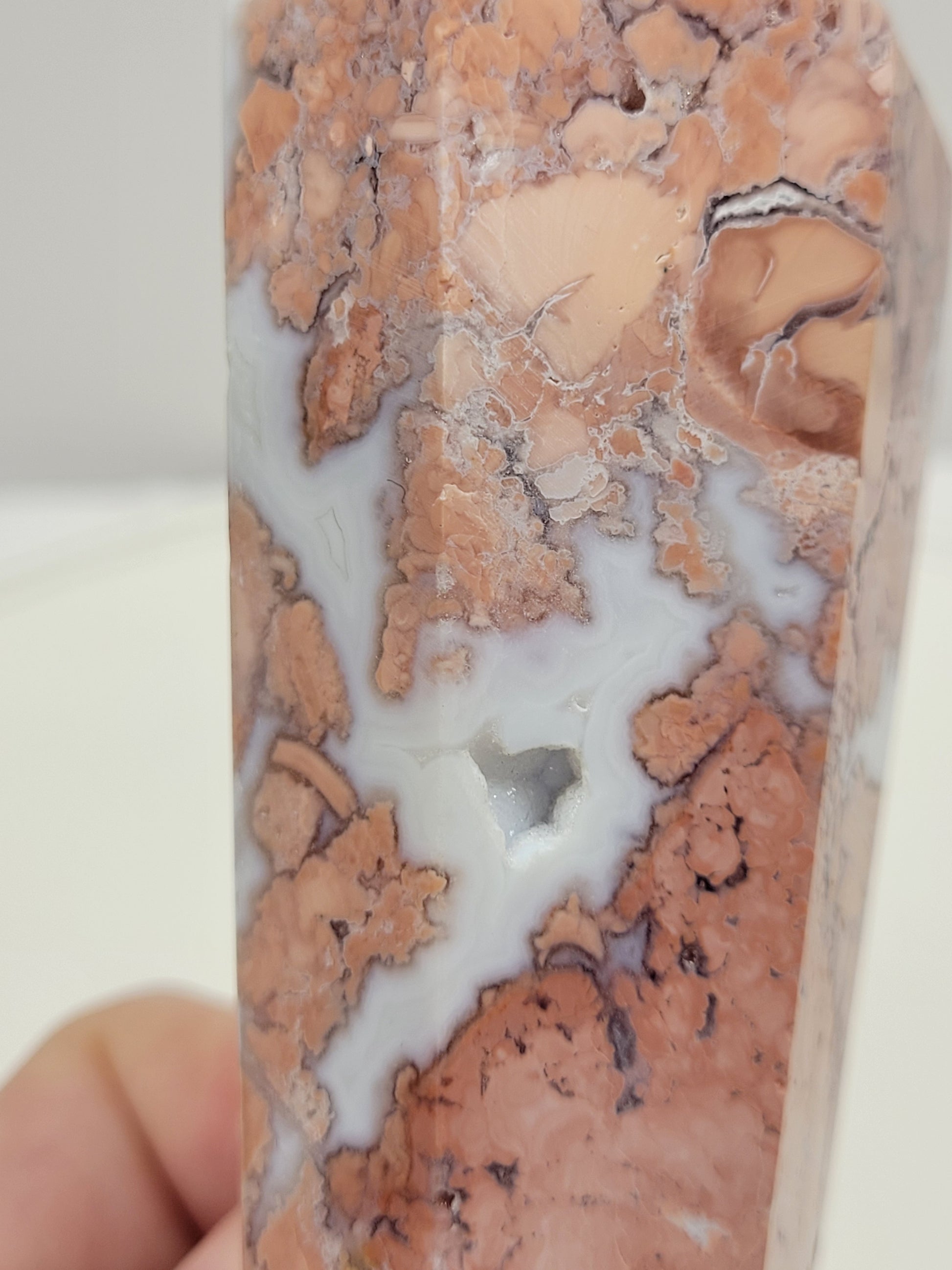 Cotton Candy agate is a recently discovered material collected from Mexico. It is named for its confectionary appearance, with multiple shades of pink brecciated jasper surrounded by fluffy bands of whitish agate and drusy quartz.