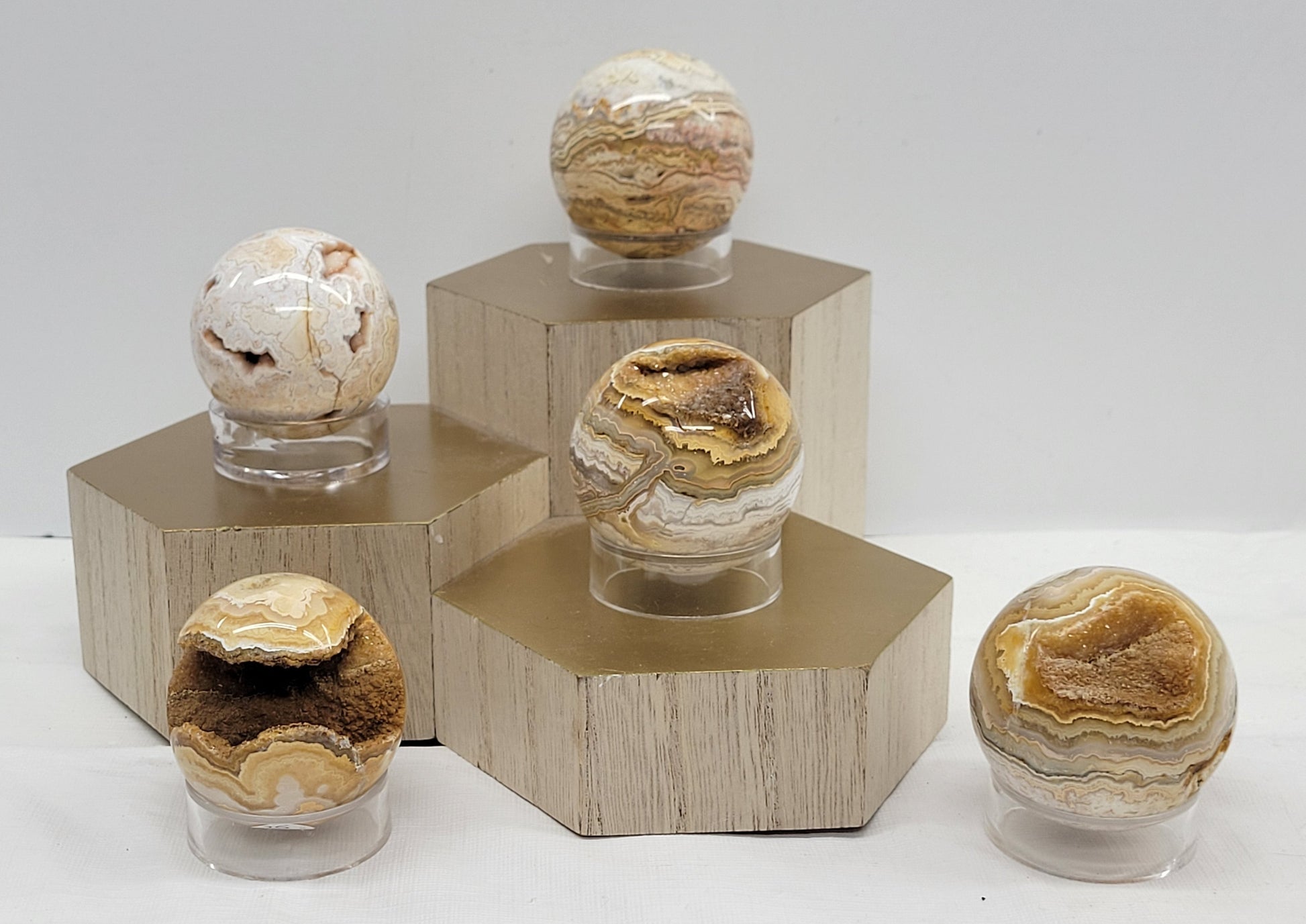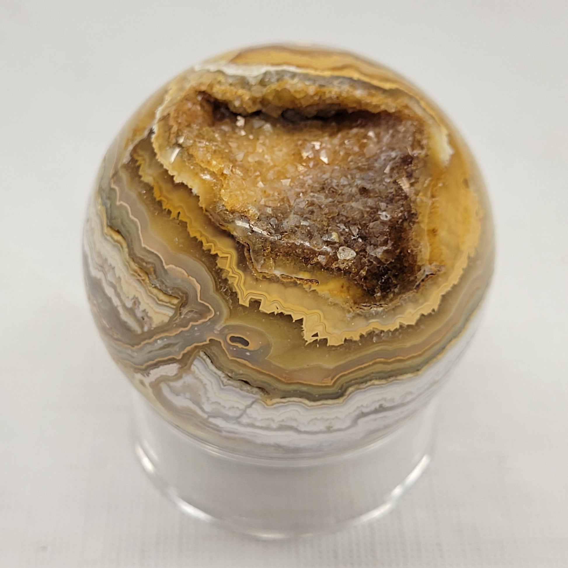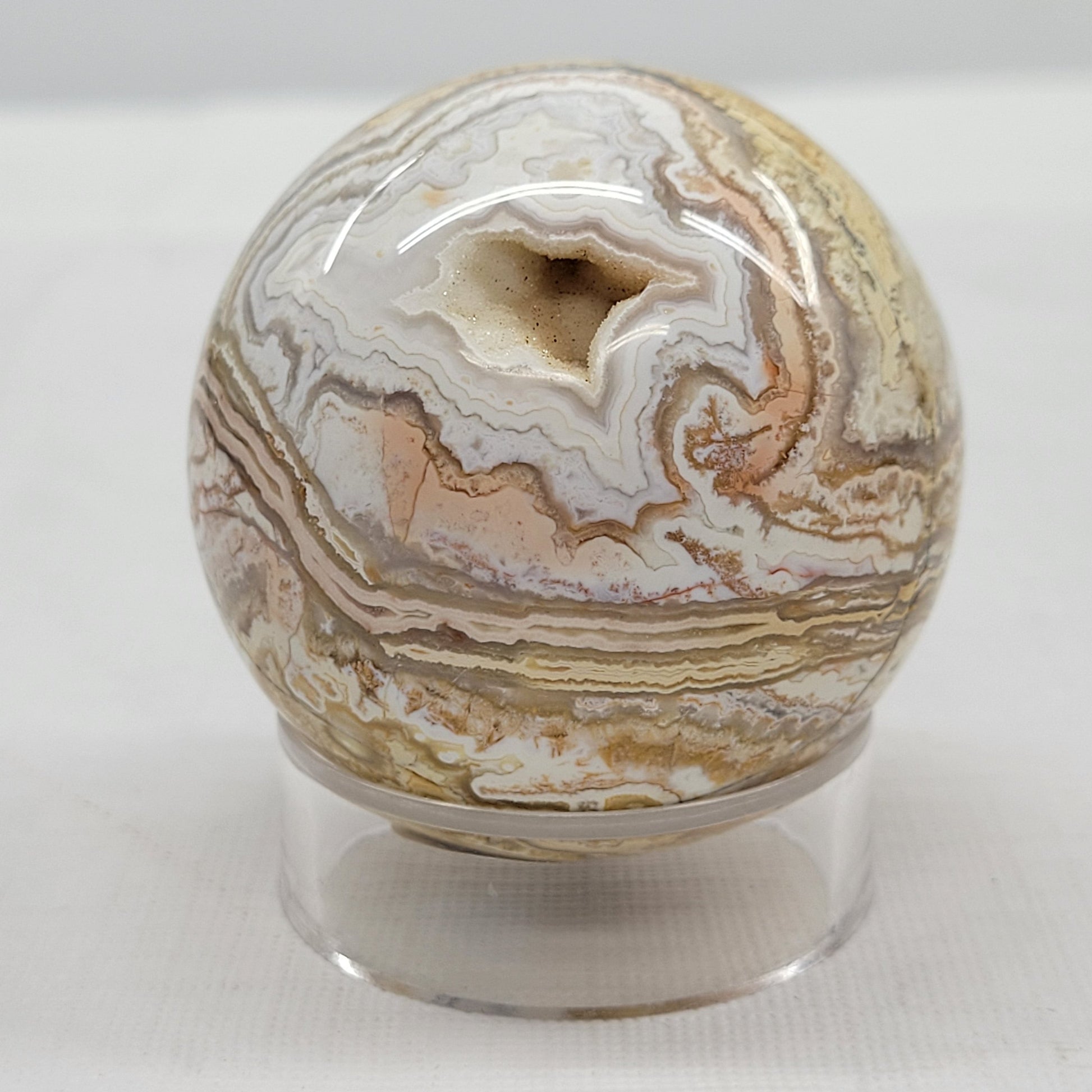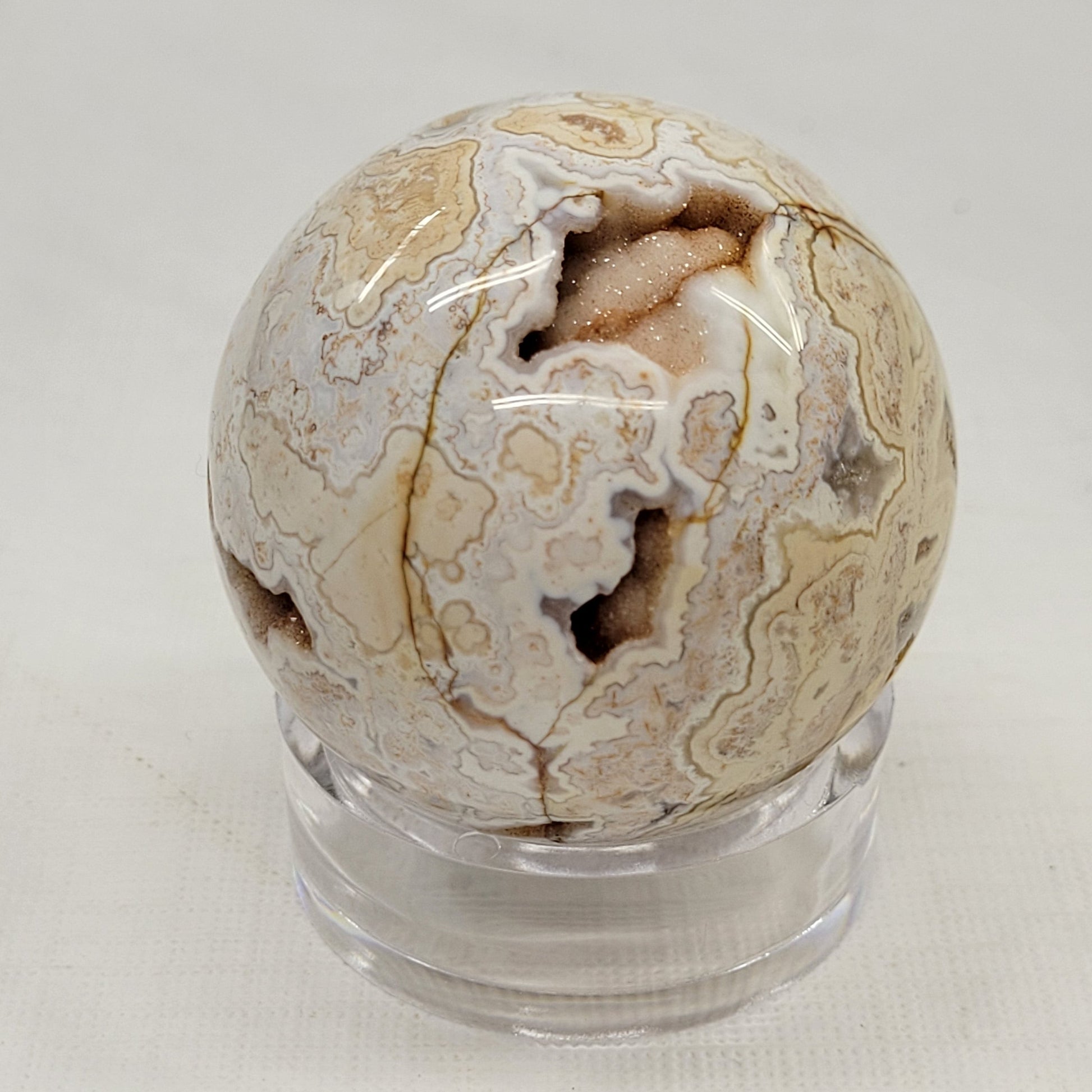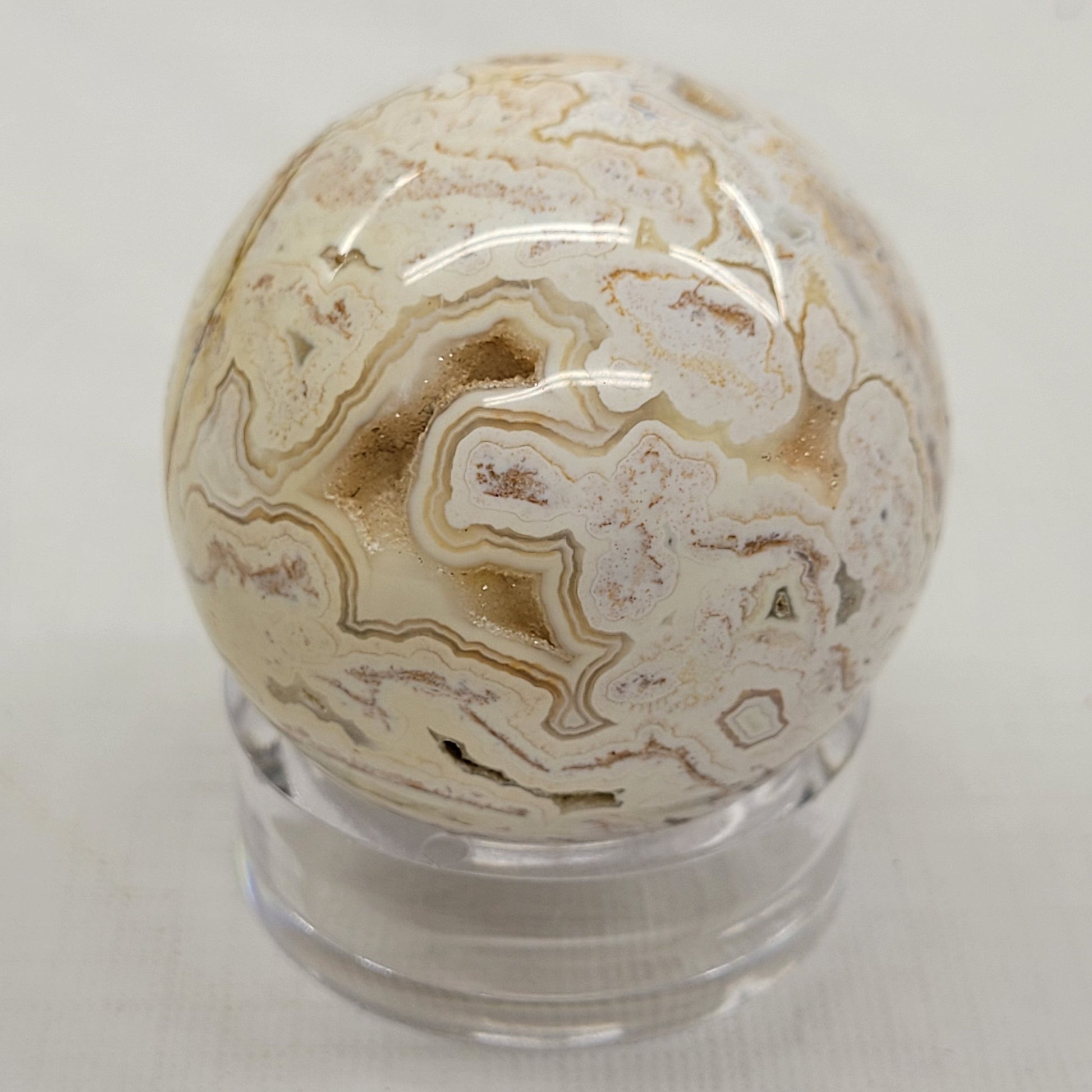 Crazy lace agate is a banded chalcedony (microcrystalline quartz) that's infused with iron and aluminum and is often brightly colored and complexly patterned. This produces the creamy browns, blacks, greys and golds (and occasional pinks or reds) swirled together in this stone.