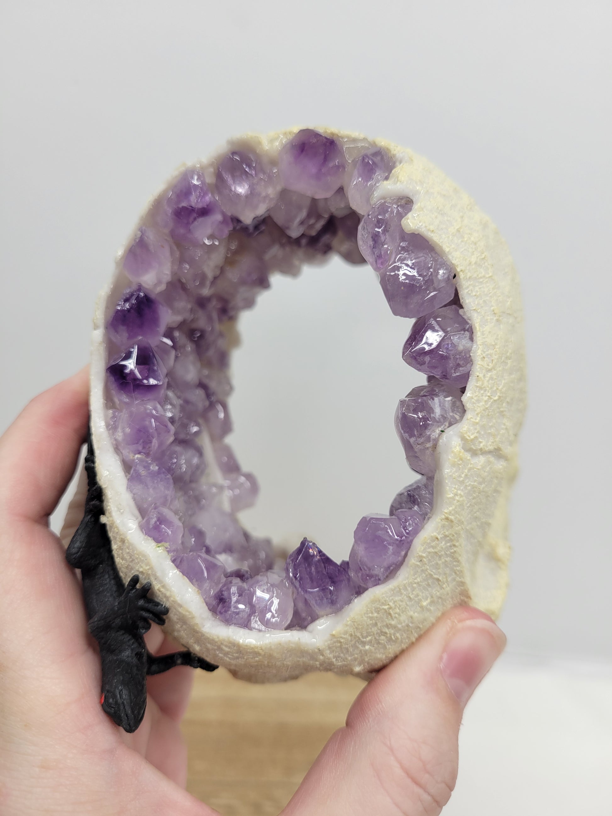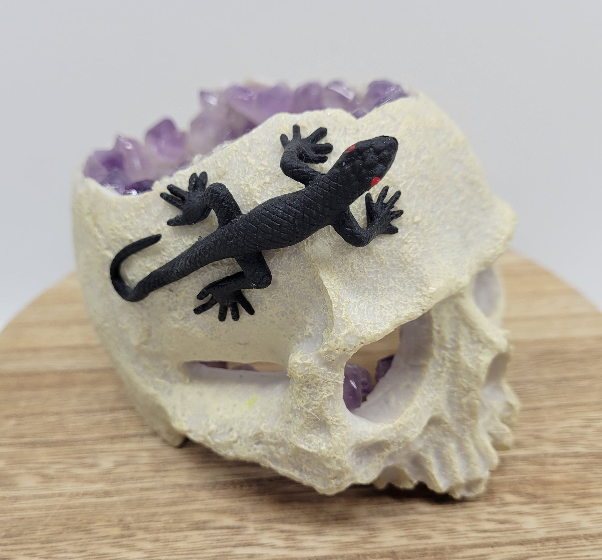 Decorative skull made of plastic and coated in Amethyst pieces on the interior.