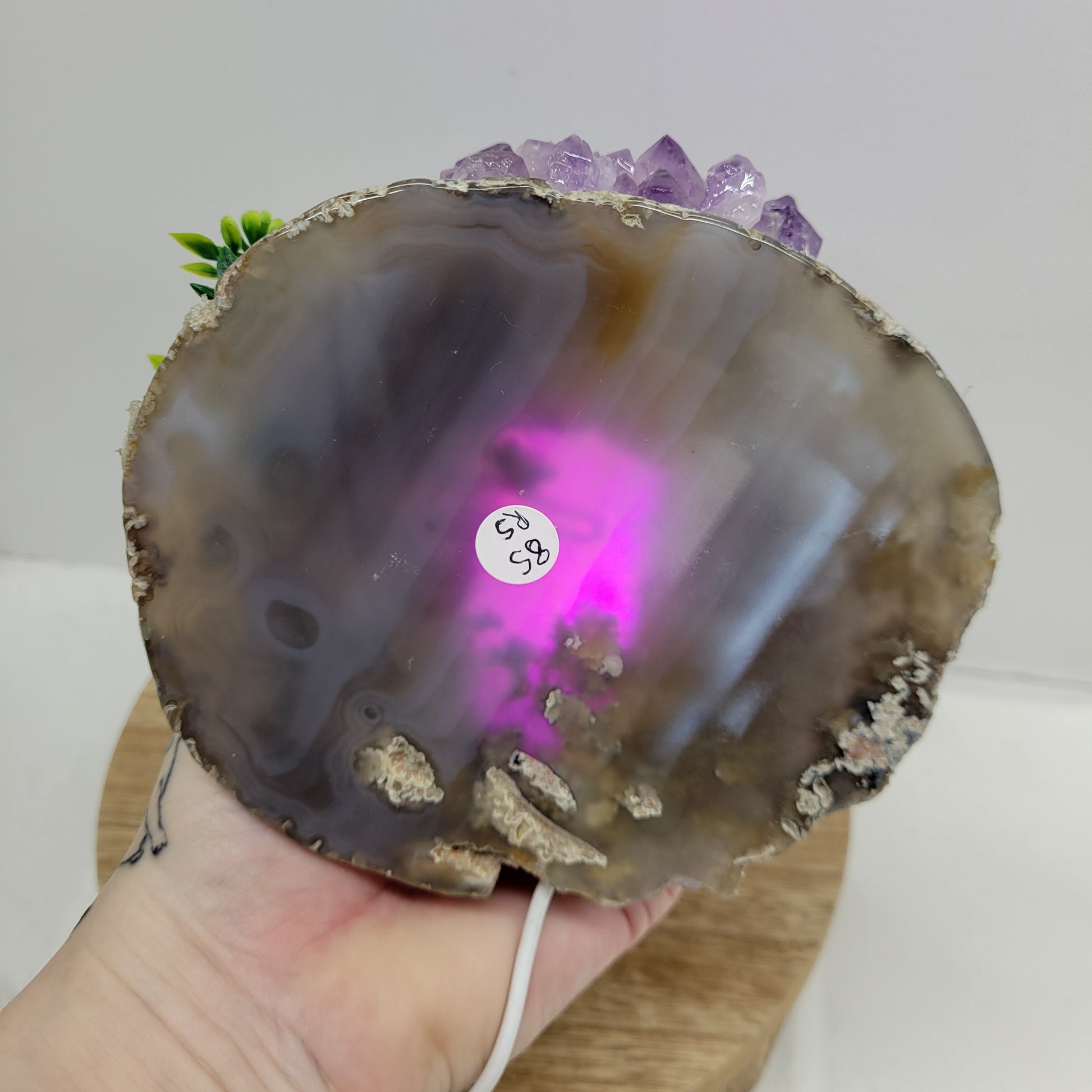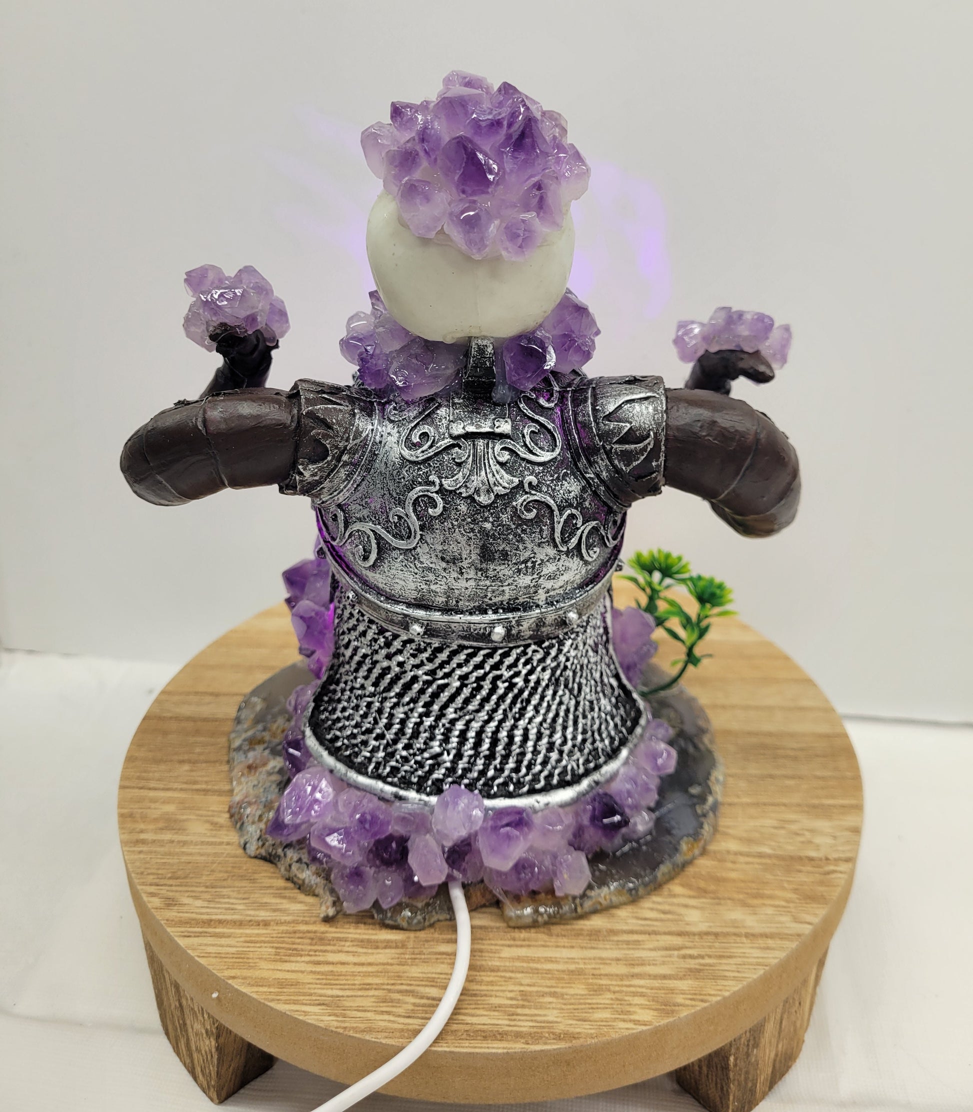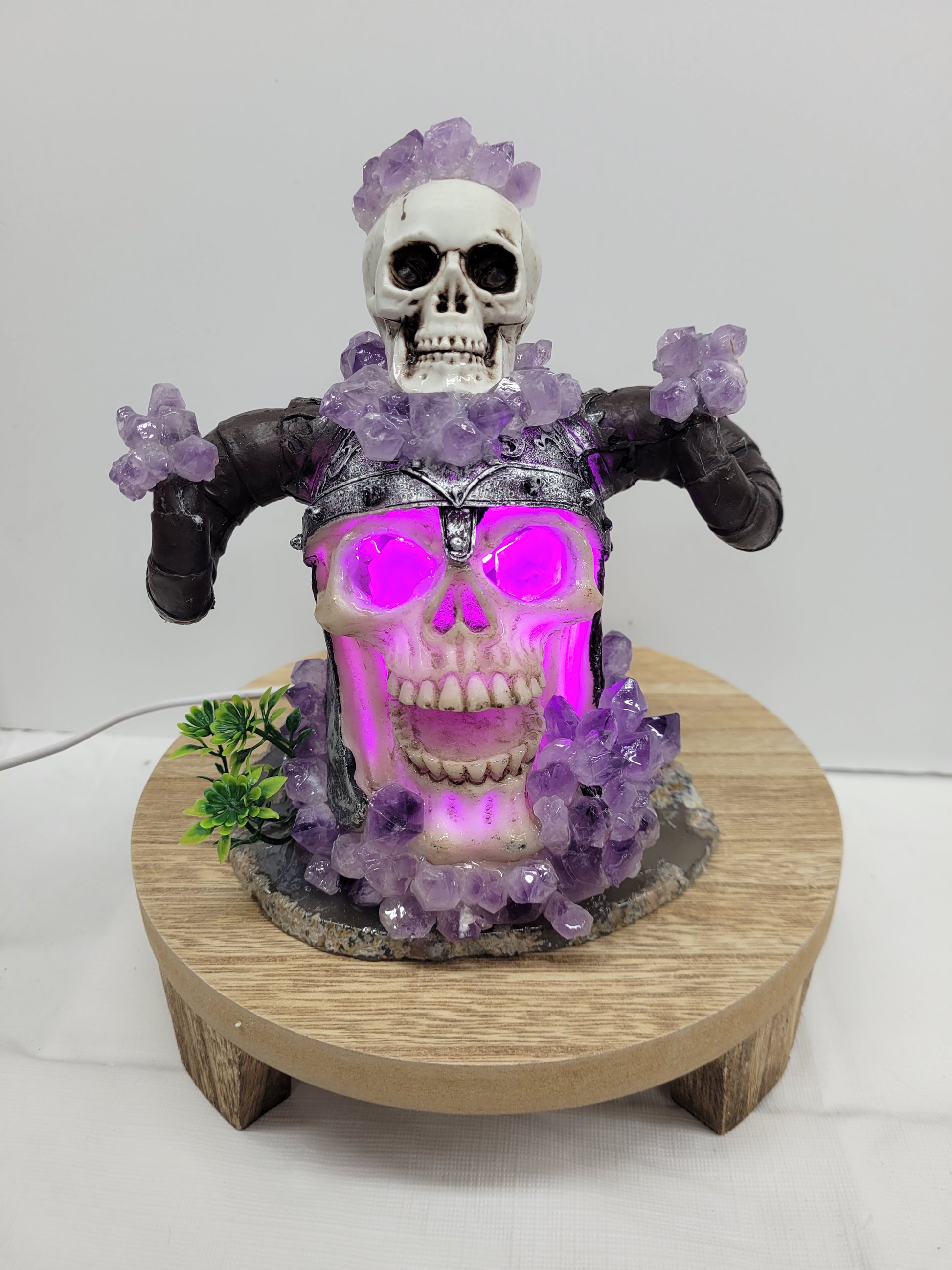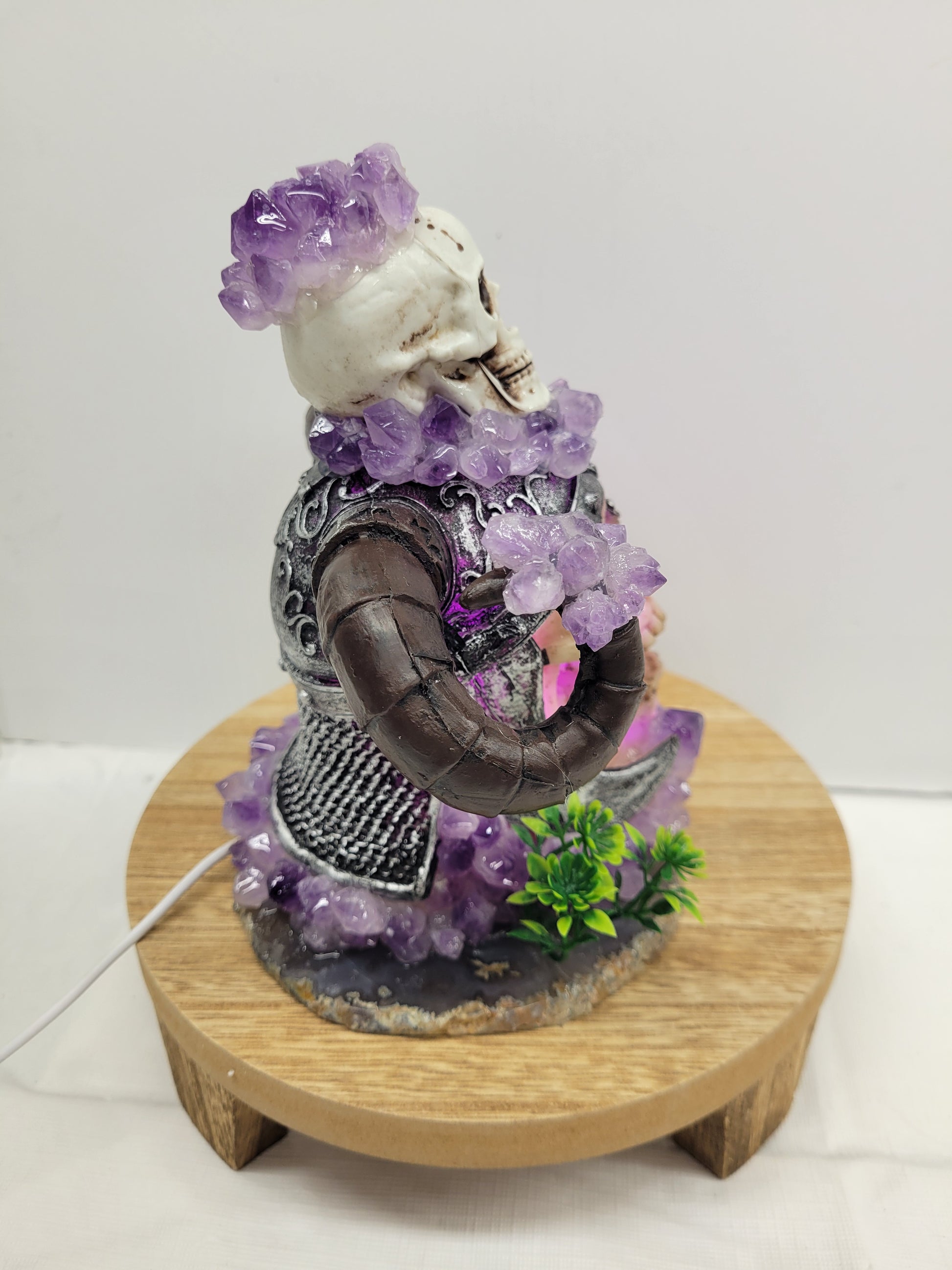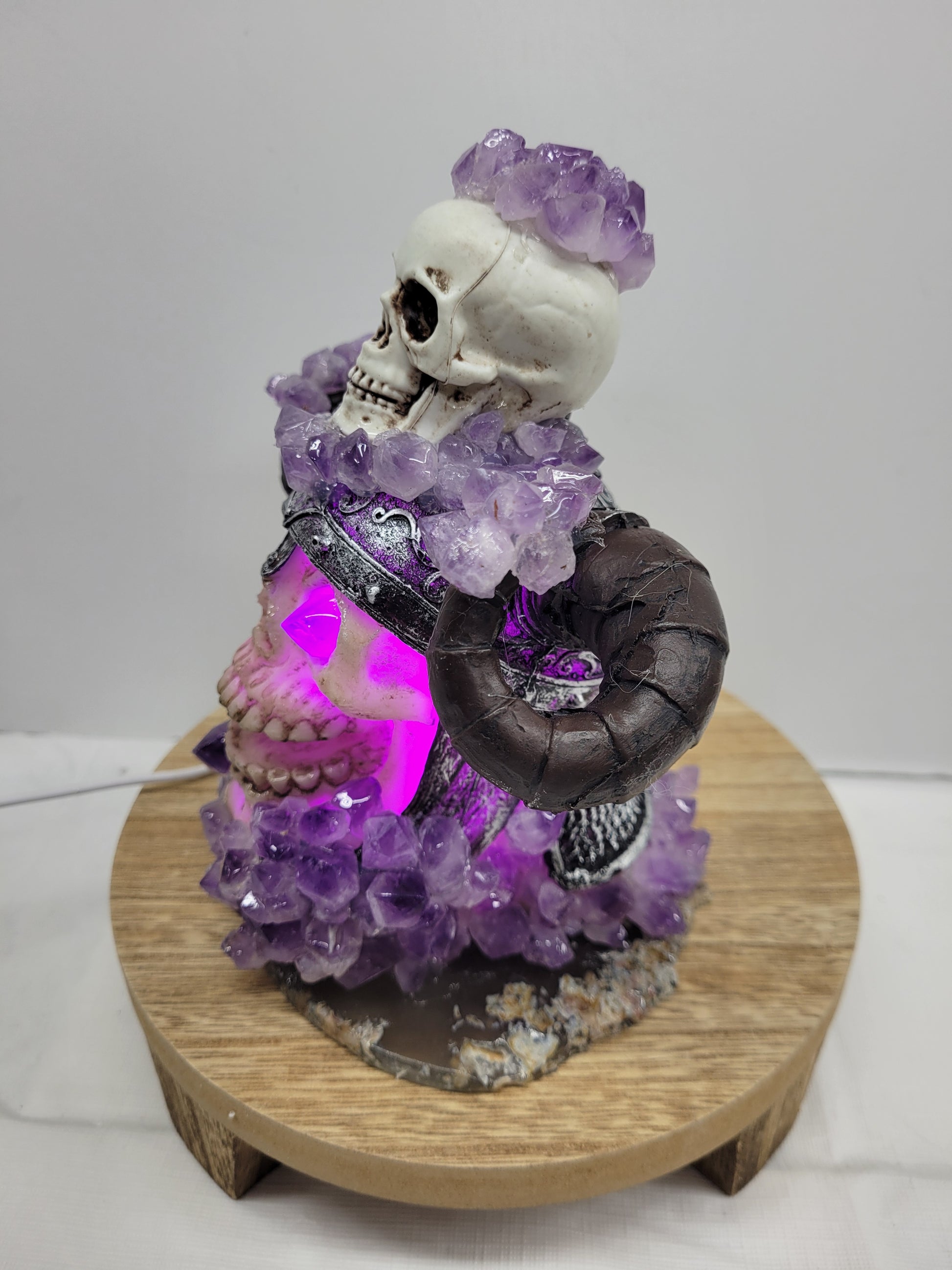 This light up Viking skull is made of plastic, but sits on an Agate slab and covered in Amethyst pieces. It does light up purple with a USB connection.