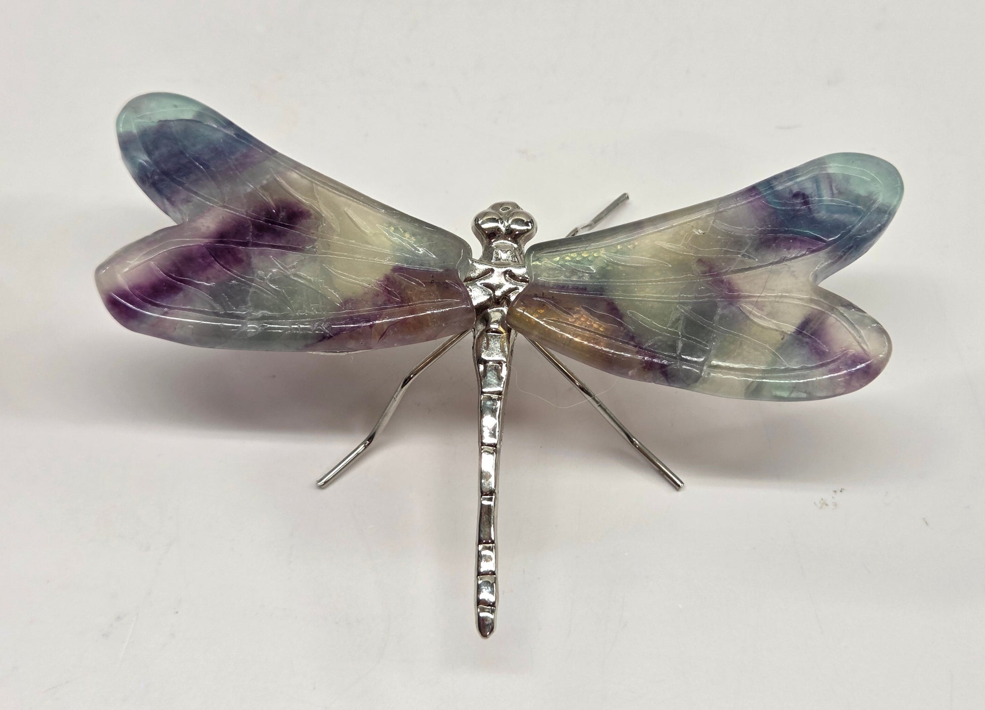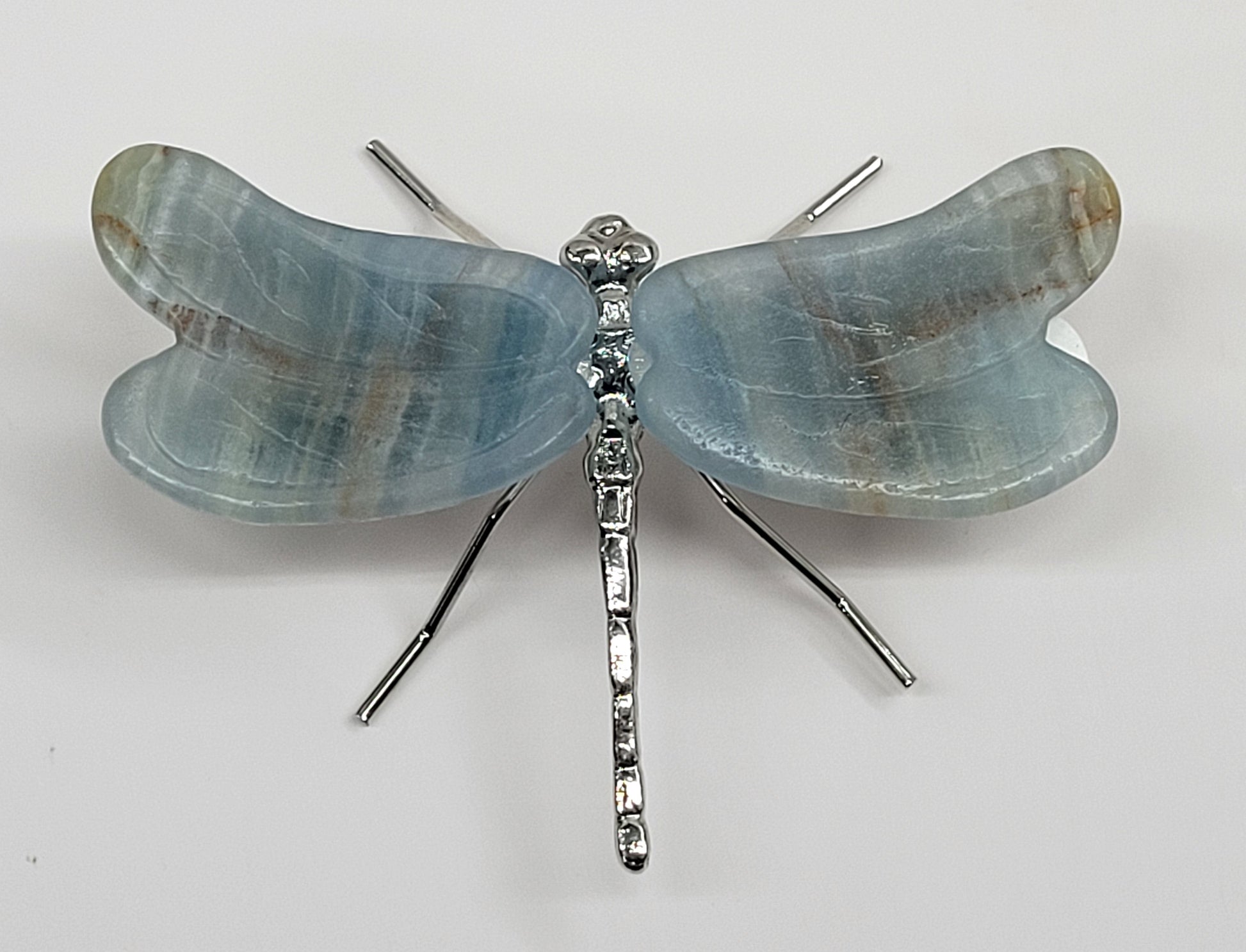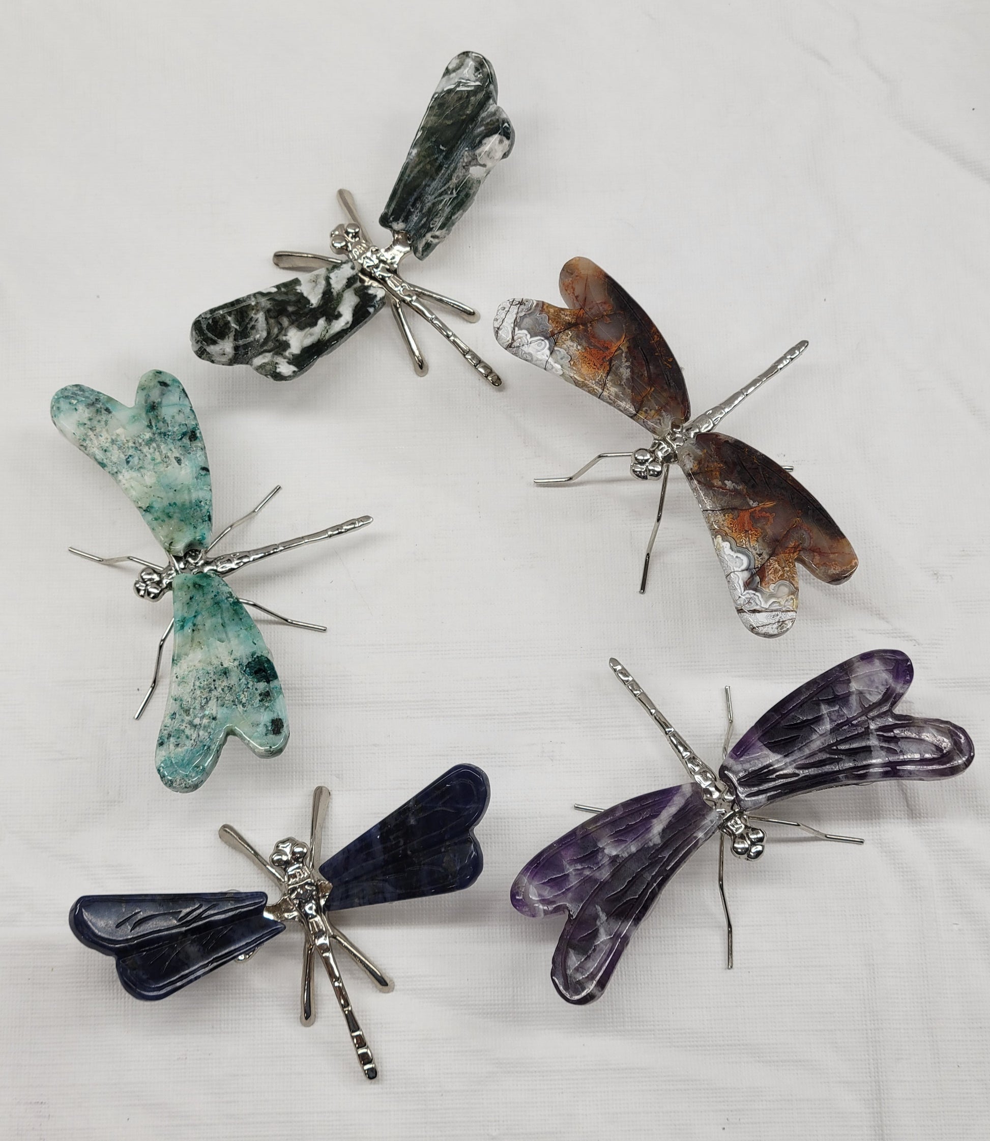 Beautiful dragonflies in a variety of materials. Each dragonfly is on a silver body with crystal wings. Dragonflies measure from 4.25" to 5".