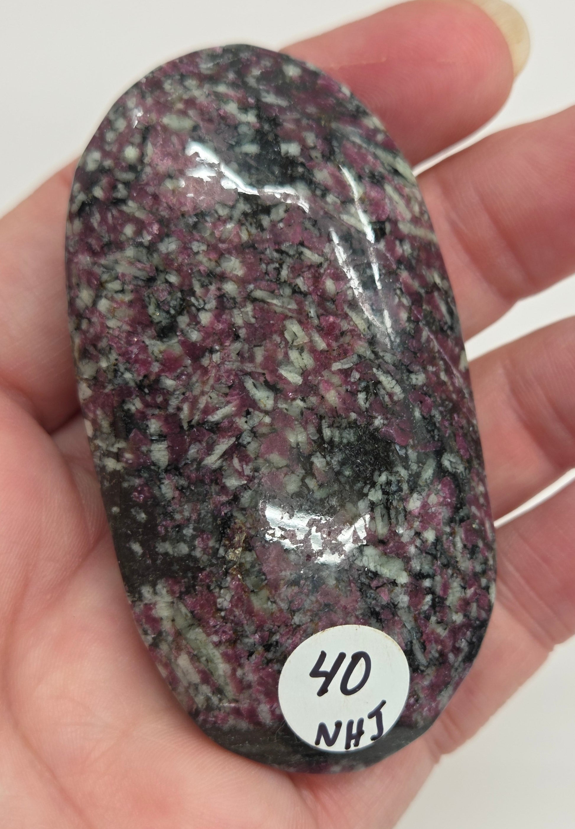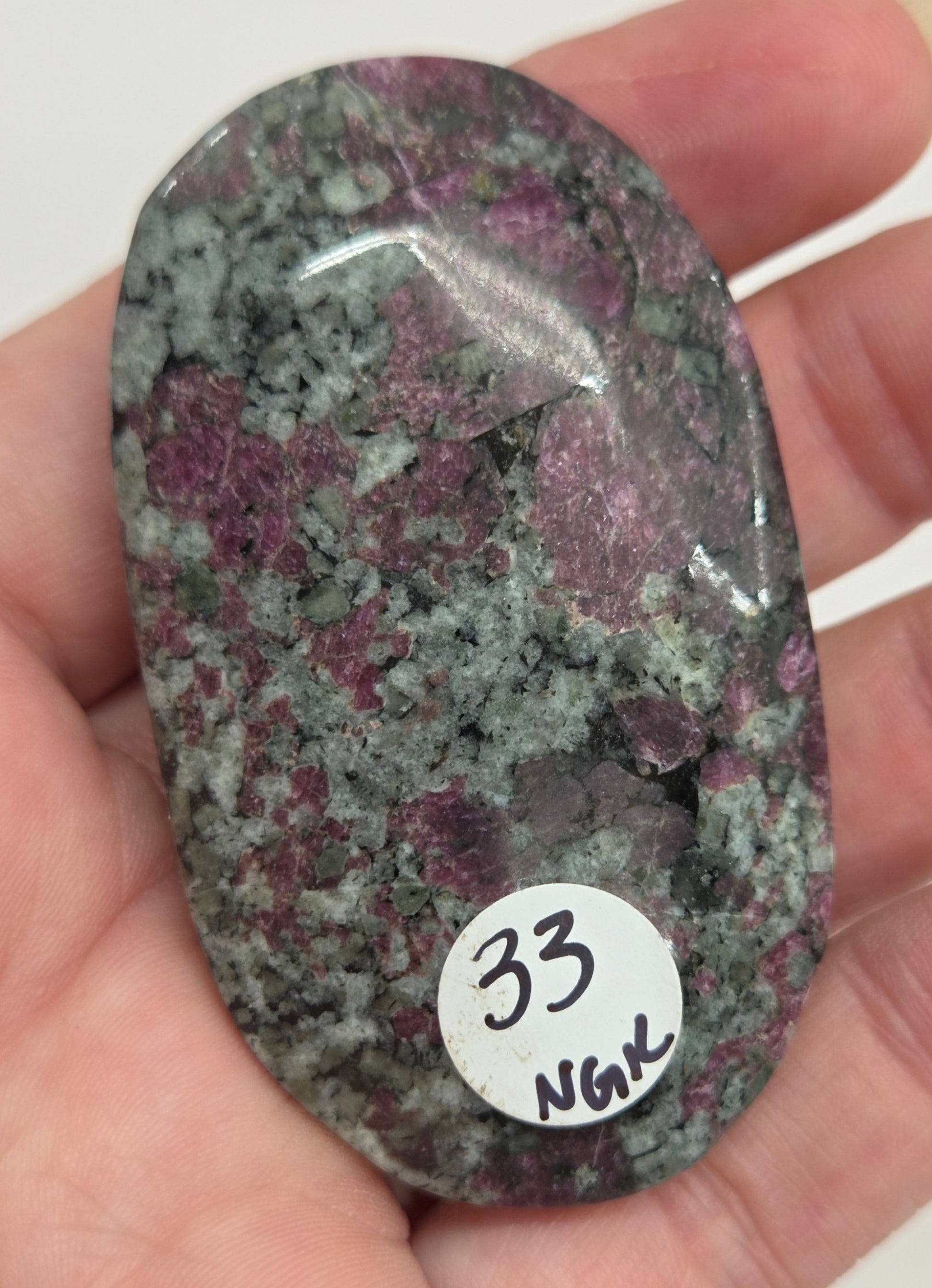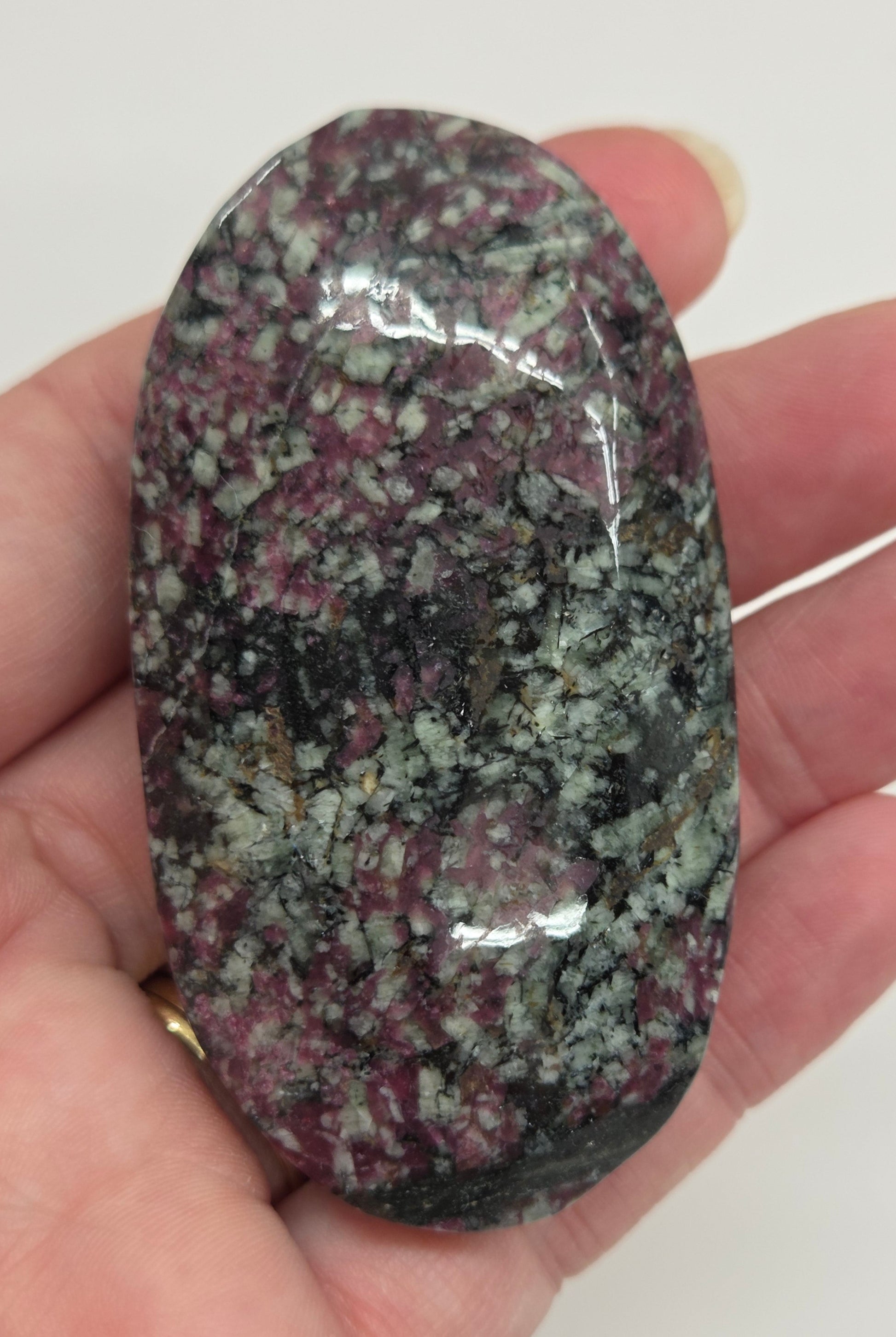 Eudialyte is a complex silicate mineral that most commonly forms in granular patterns. It is usually found within coarse grained rocks and contains calcium, cerium, sodium, iron, manganese, zirconium, and yttrium. This stone ranges in color from pink and red to brown, violet, and even green; sometimes with inclusions of Black Tourmaline.