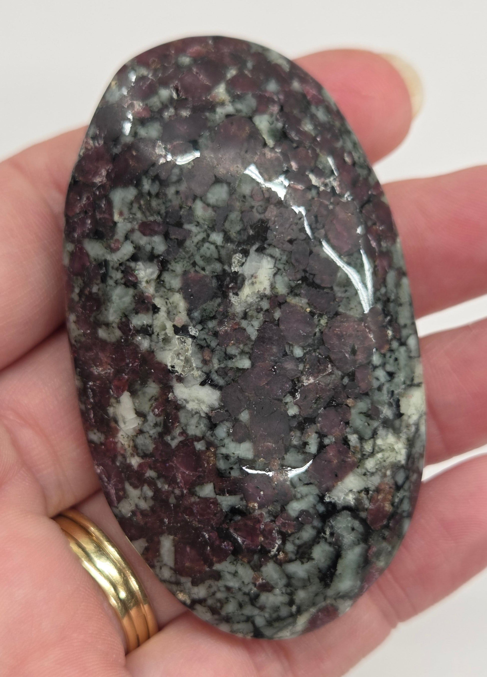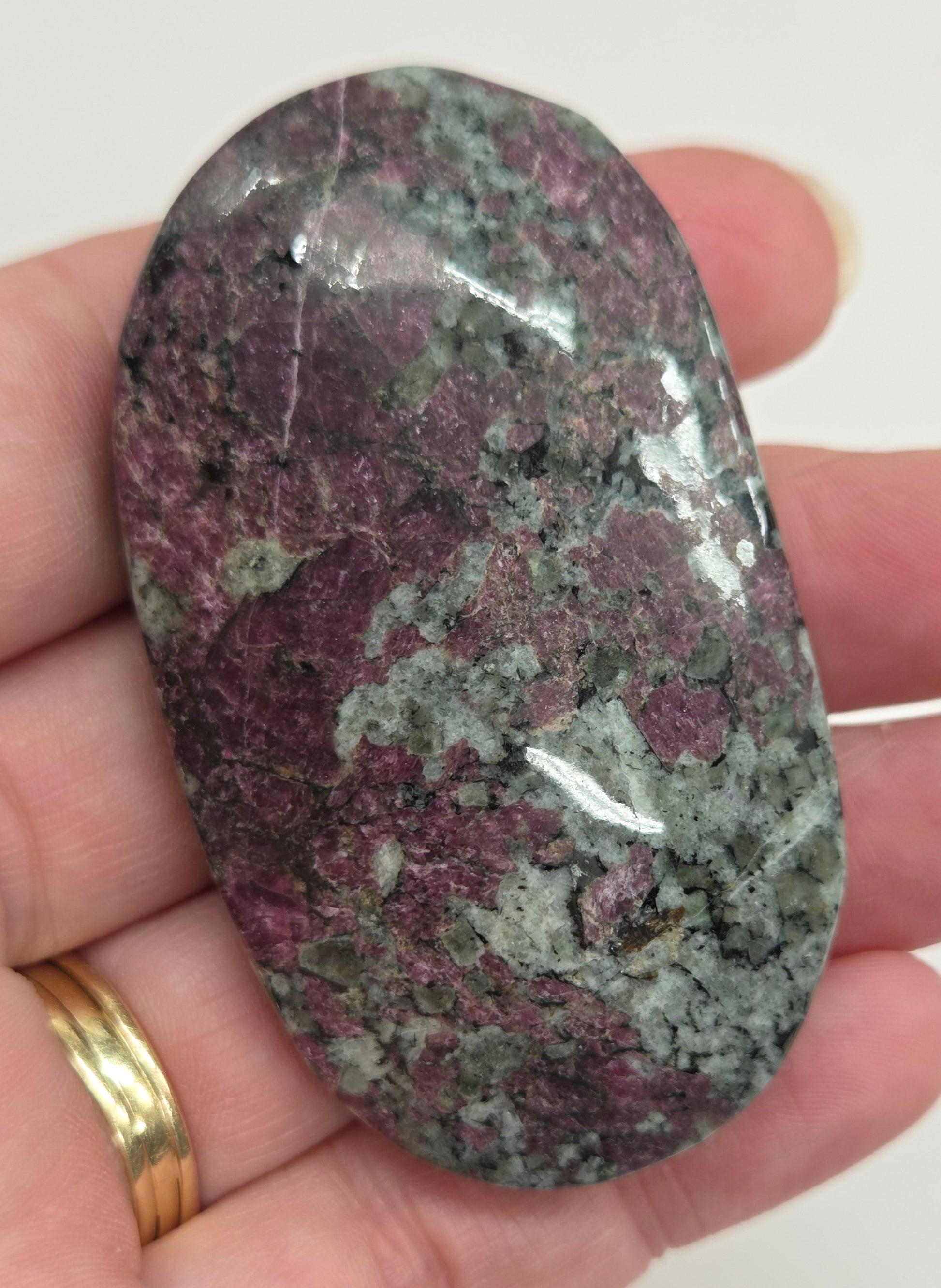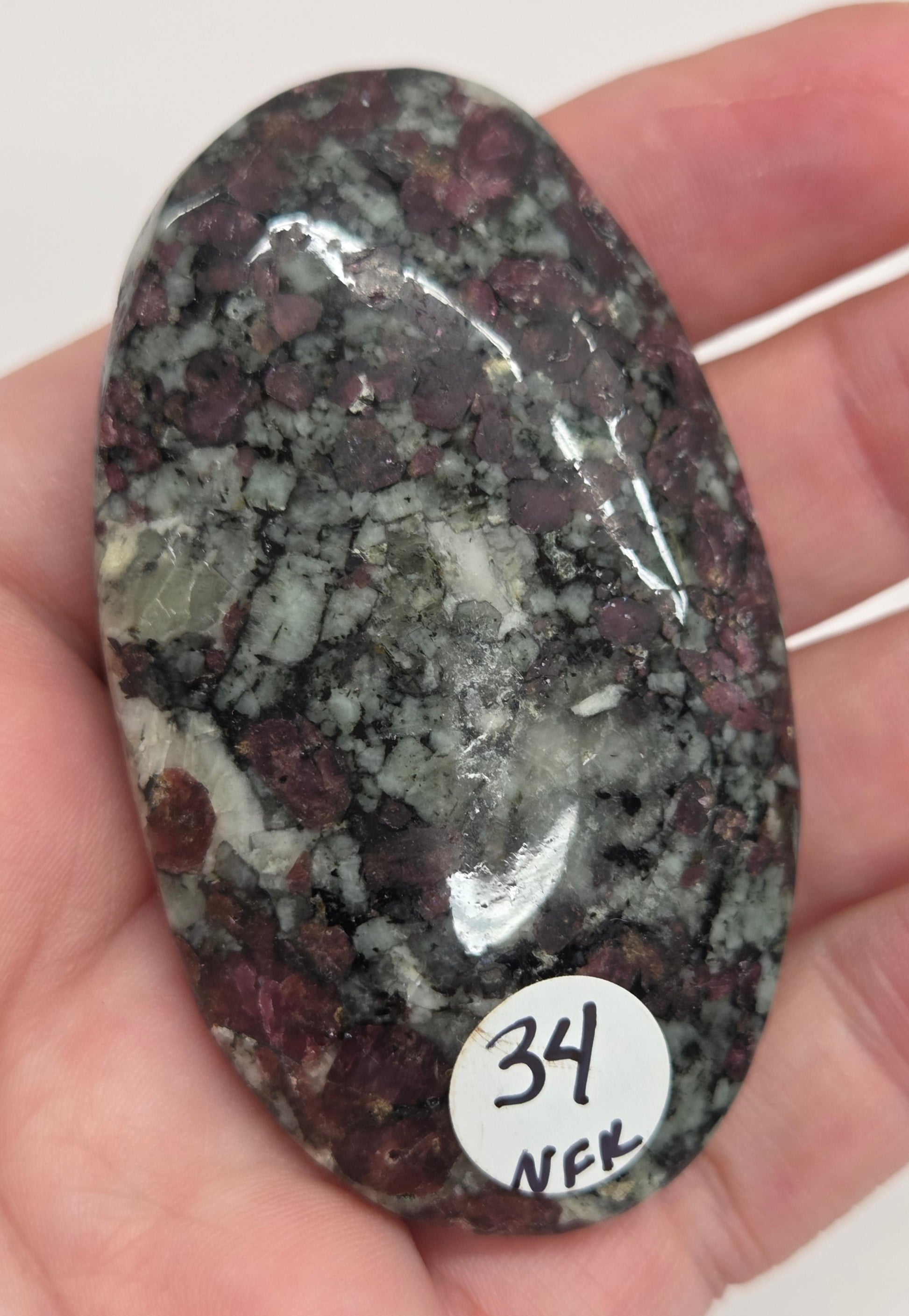 Eudialyte is a complex silicate mineral that most commonly forms in granular patterns. It is usually found within coarse grained rocks and contains calcium, cerium, sodium, iron, manganese, zirconium, and yttrium. This stone ranges in color from pink and red to brown, violet, and even green; sometimes with inclusions of Black Tourmaline.