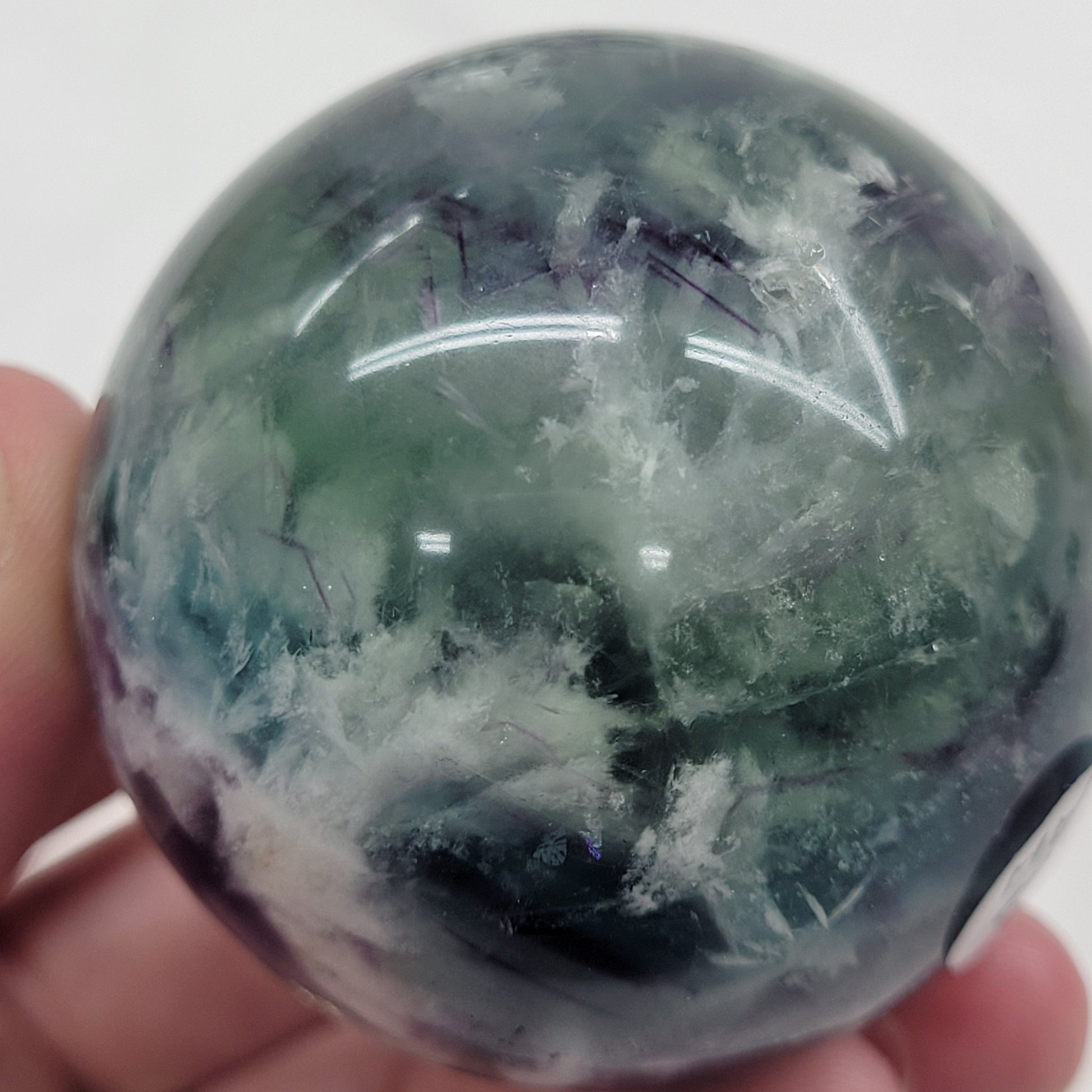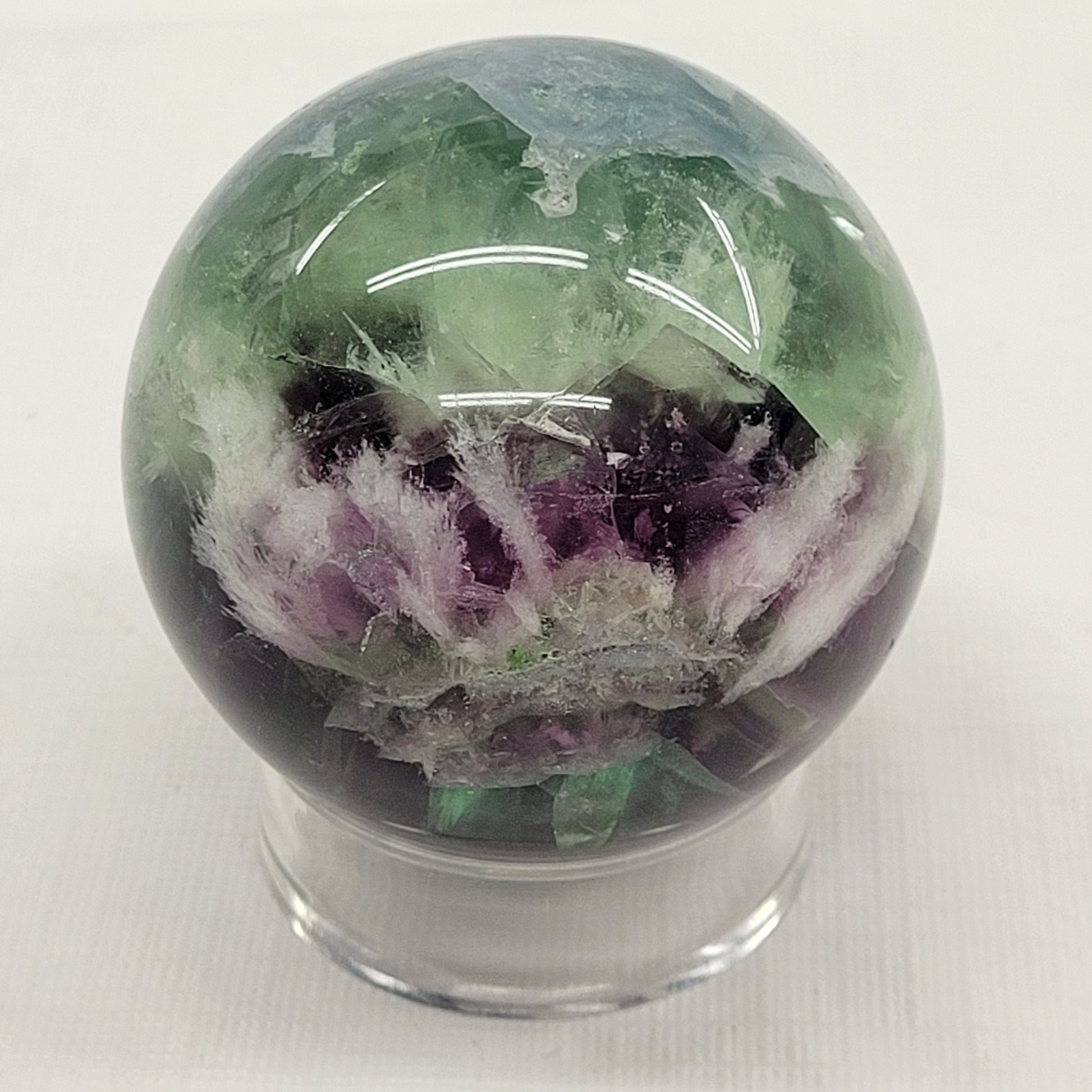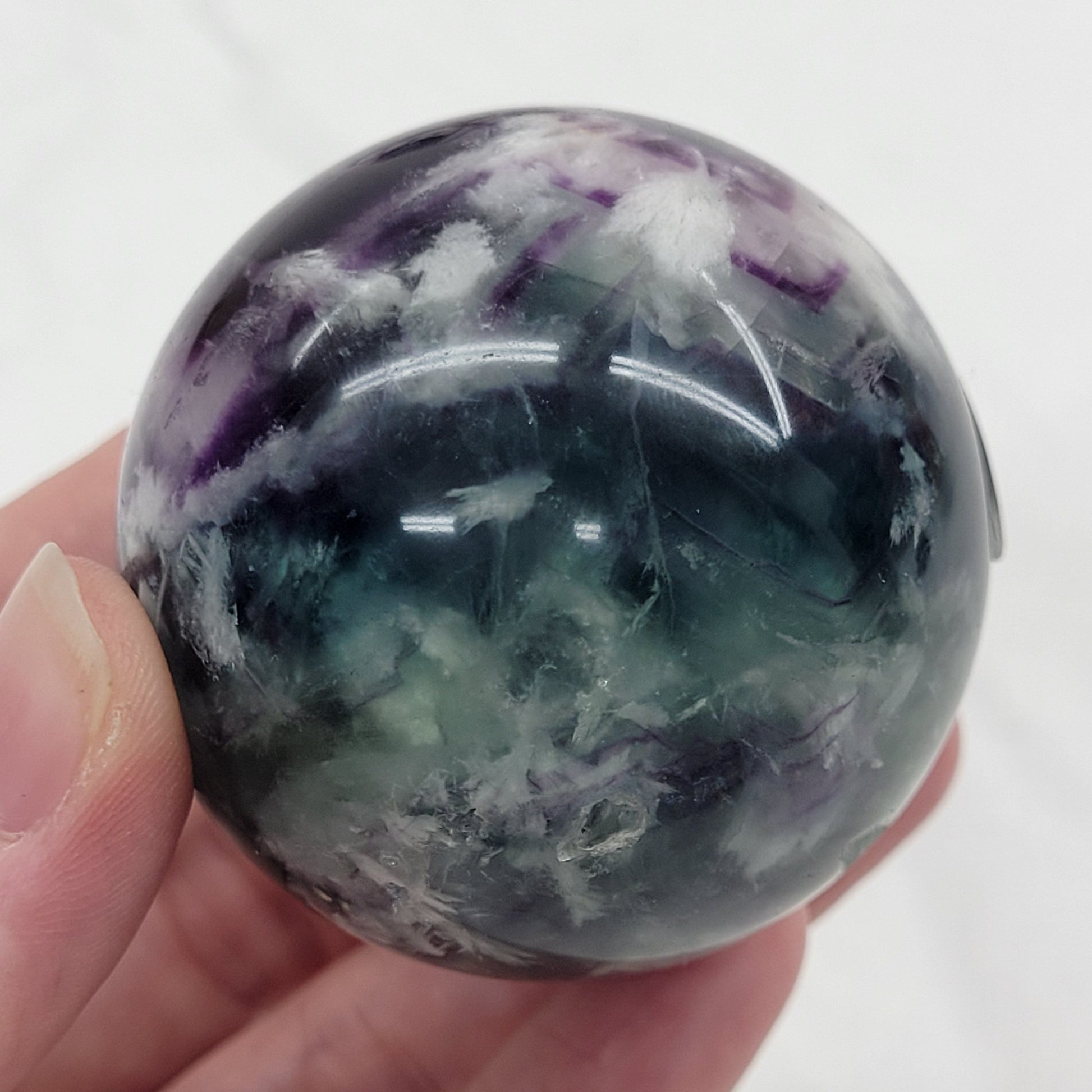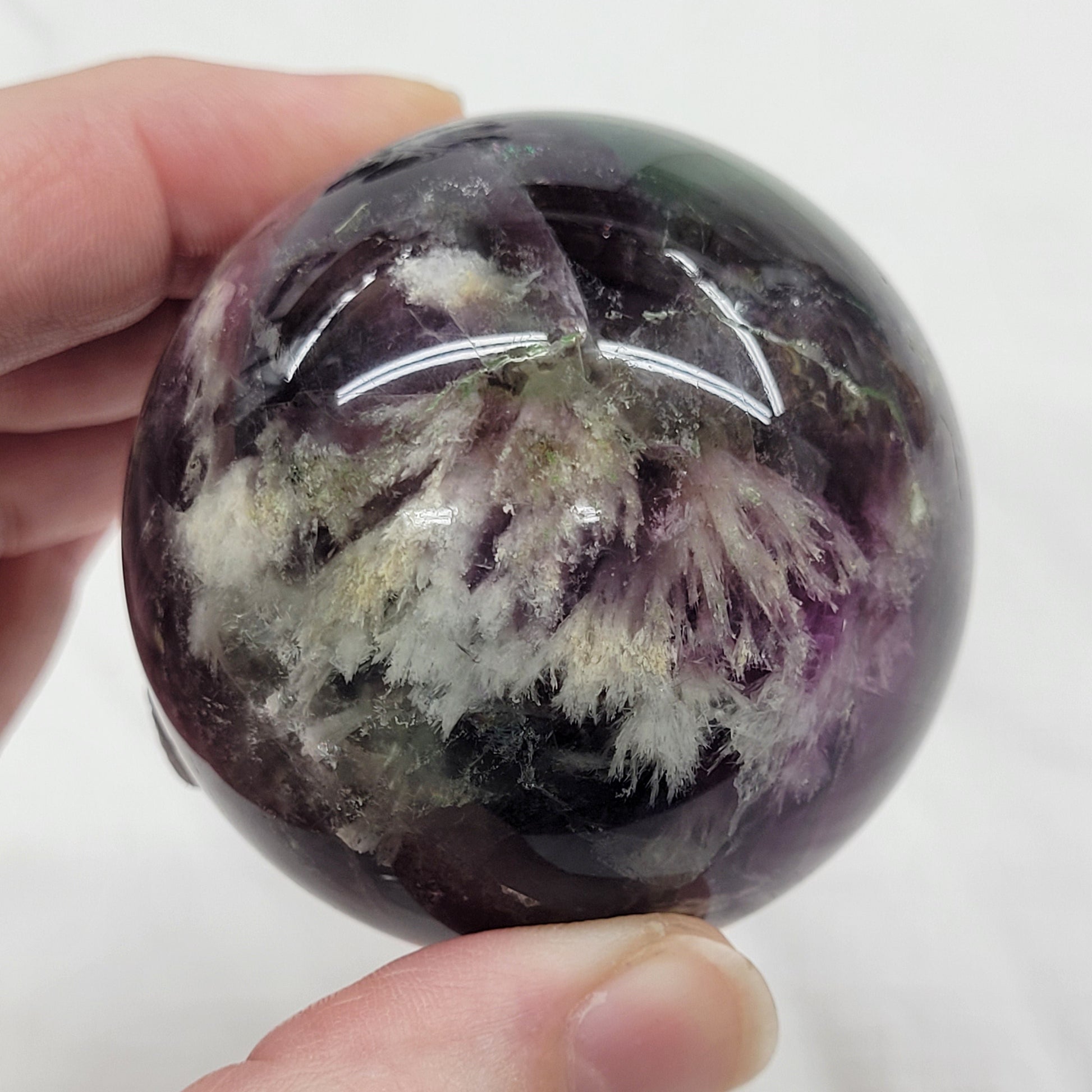 Feather Fluorite is a variety of Fluorite, forms in a wide variety of hues, typically purple, green, yellow, blue, and pure form – colorless. It is composed of calcium fluoride and is a member of the Halide family. Feather Fluorite is named for its Scolecite formations, which resemble delicate feathers or plumes.