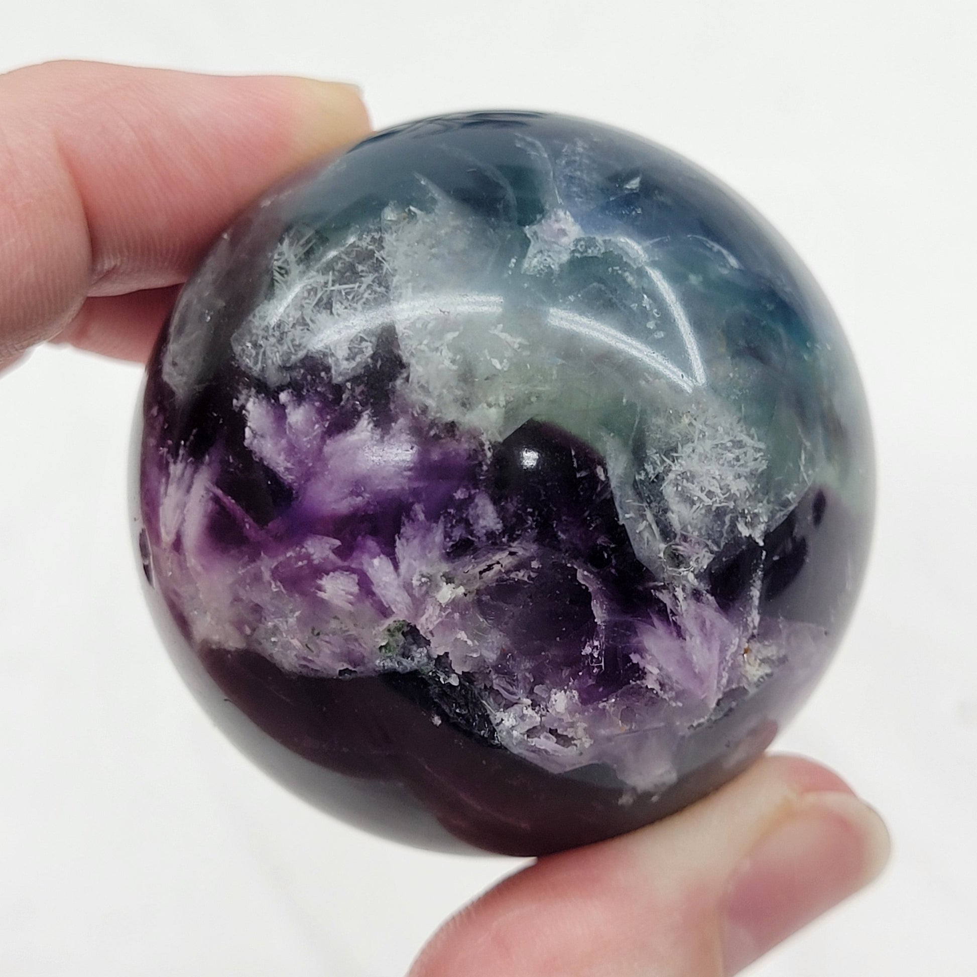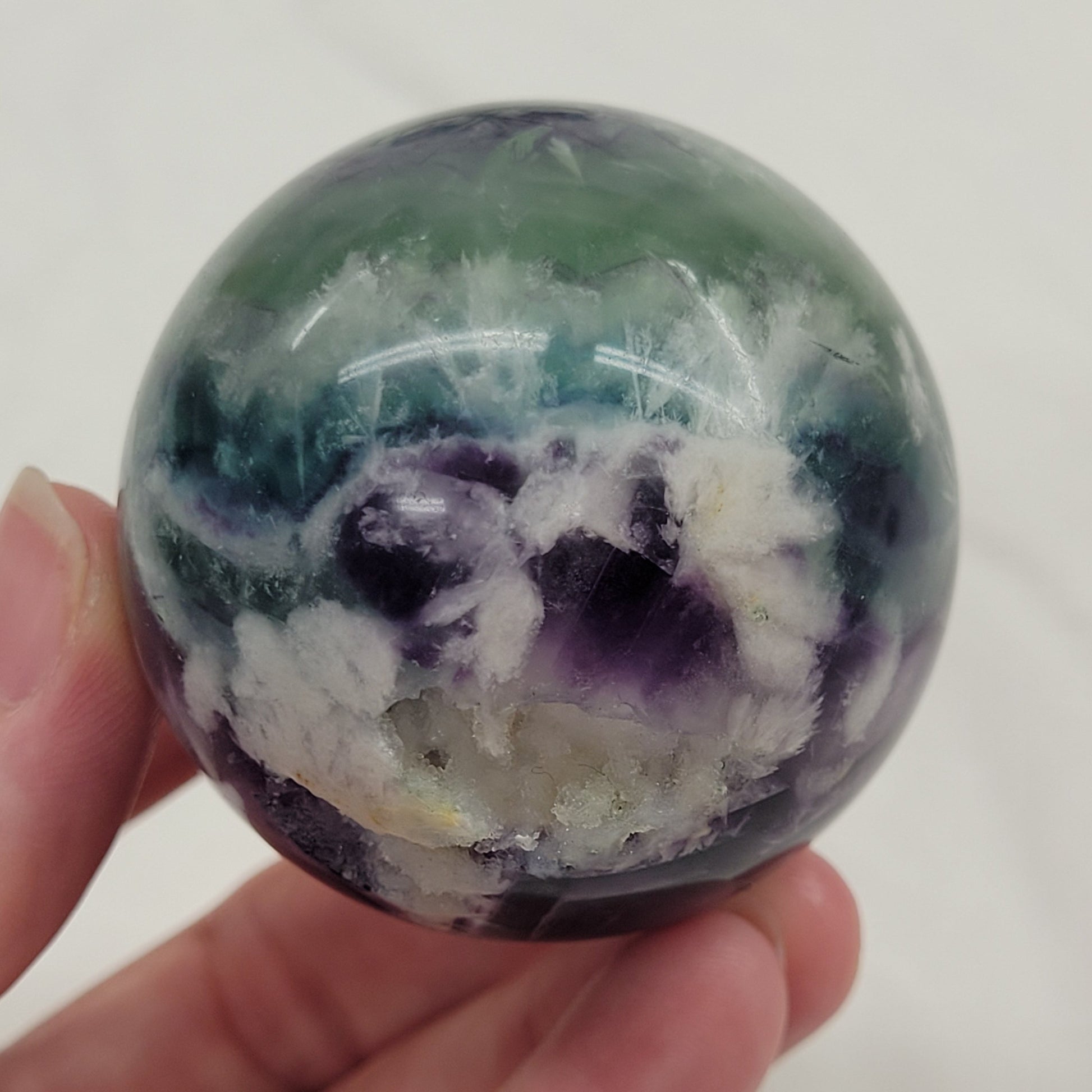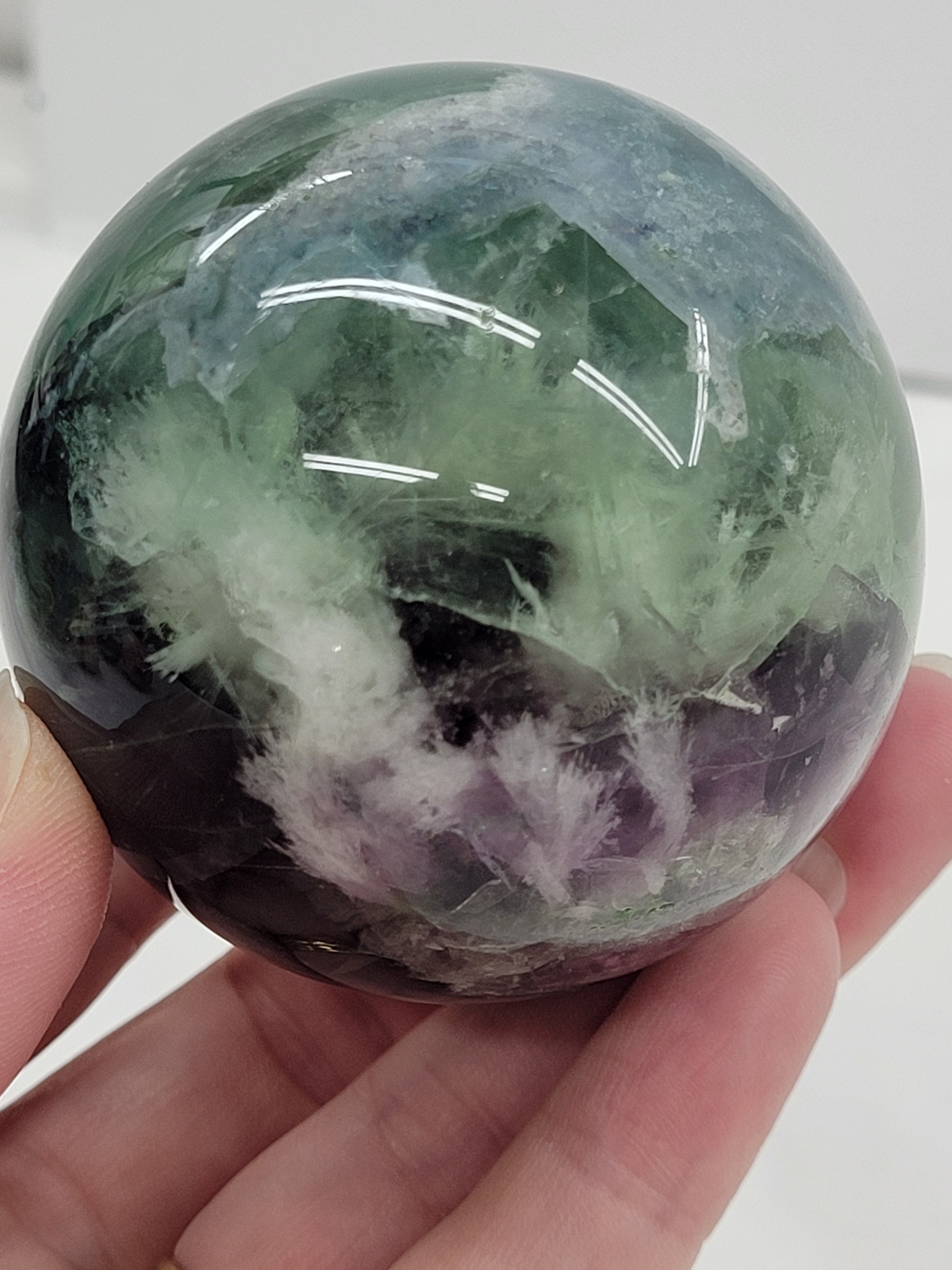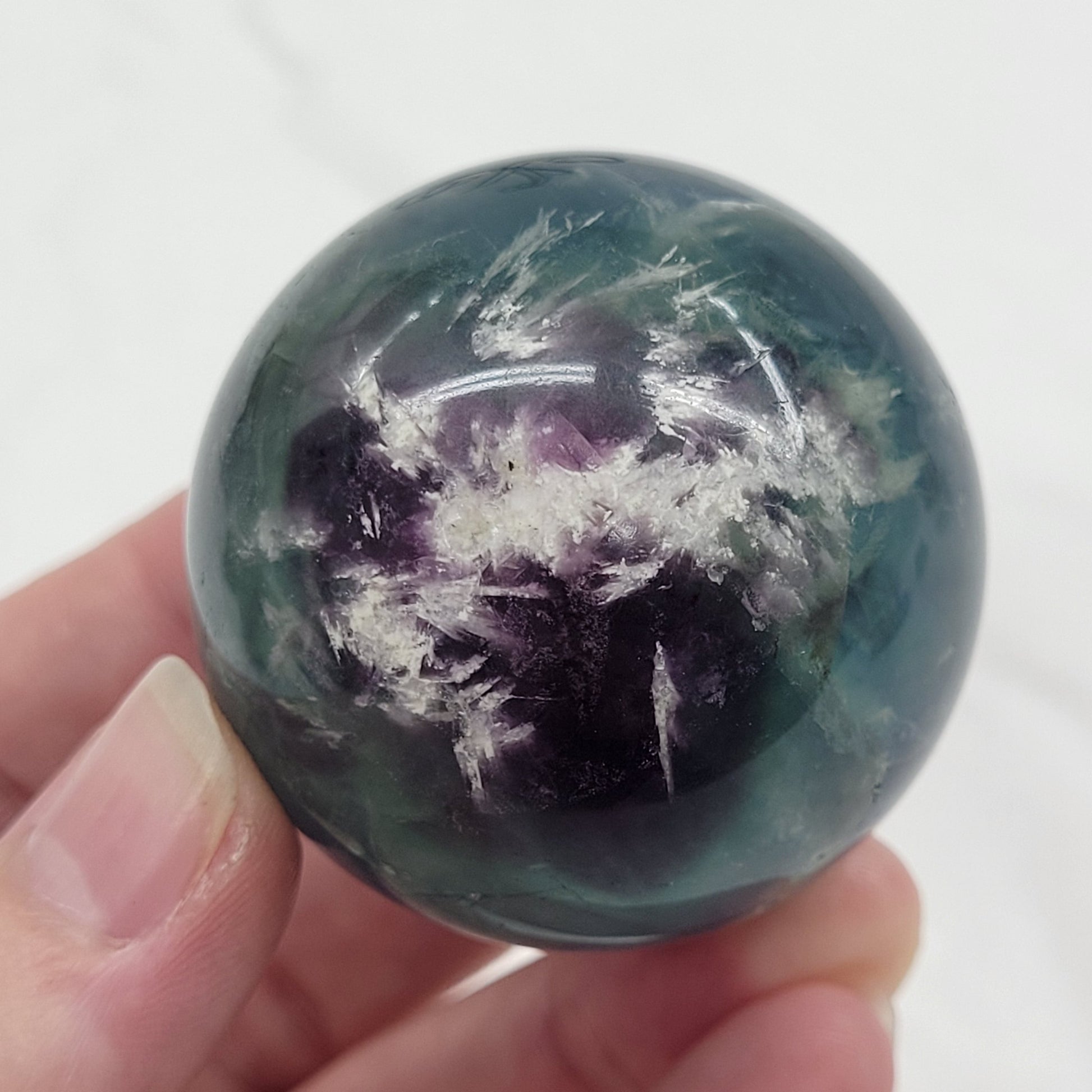Feather Fluorite is a variety of Fluorite, forms in a wide variety of hues, typically purple, green, yellow, blue, and pure form – colorless. It is composed of calcium fluoride and is a member of the Halide family. Feather Fluorite is named for its Scolecite formations, which resemble delicate feathers or plumes.