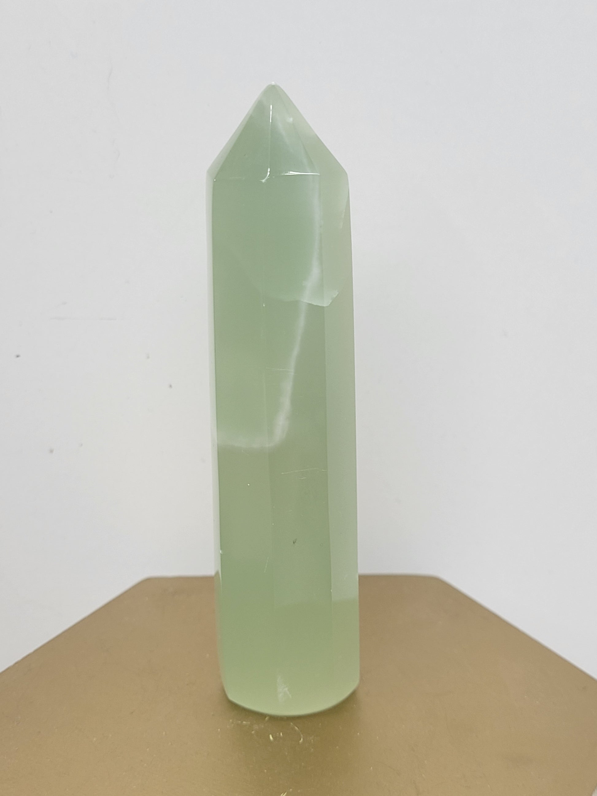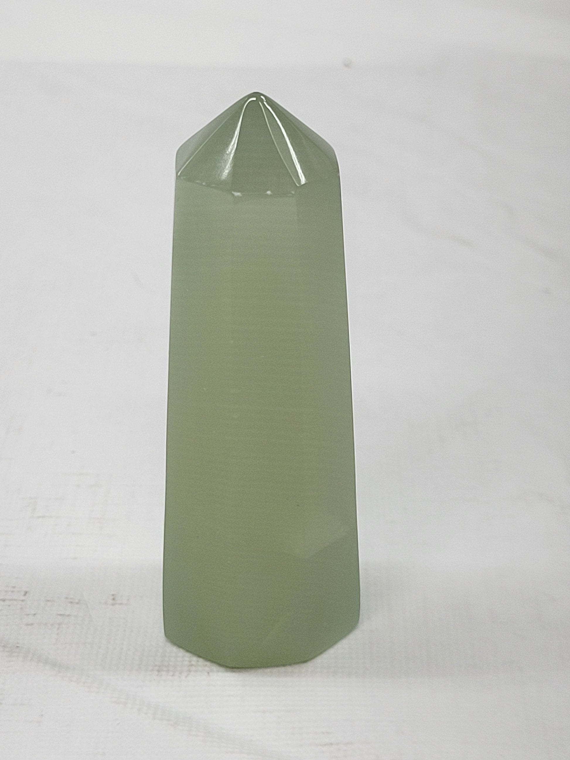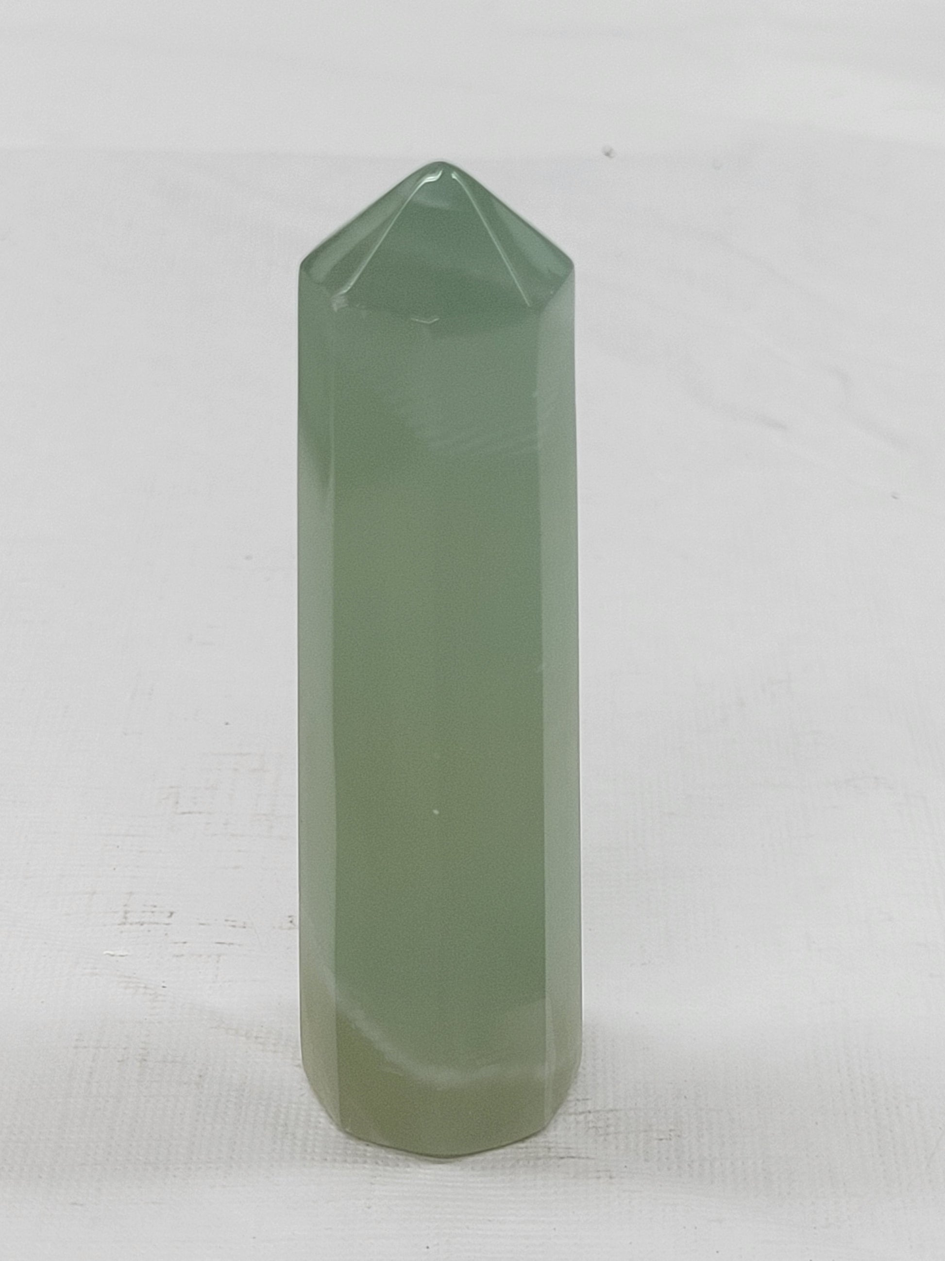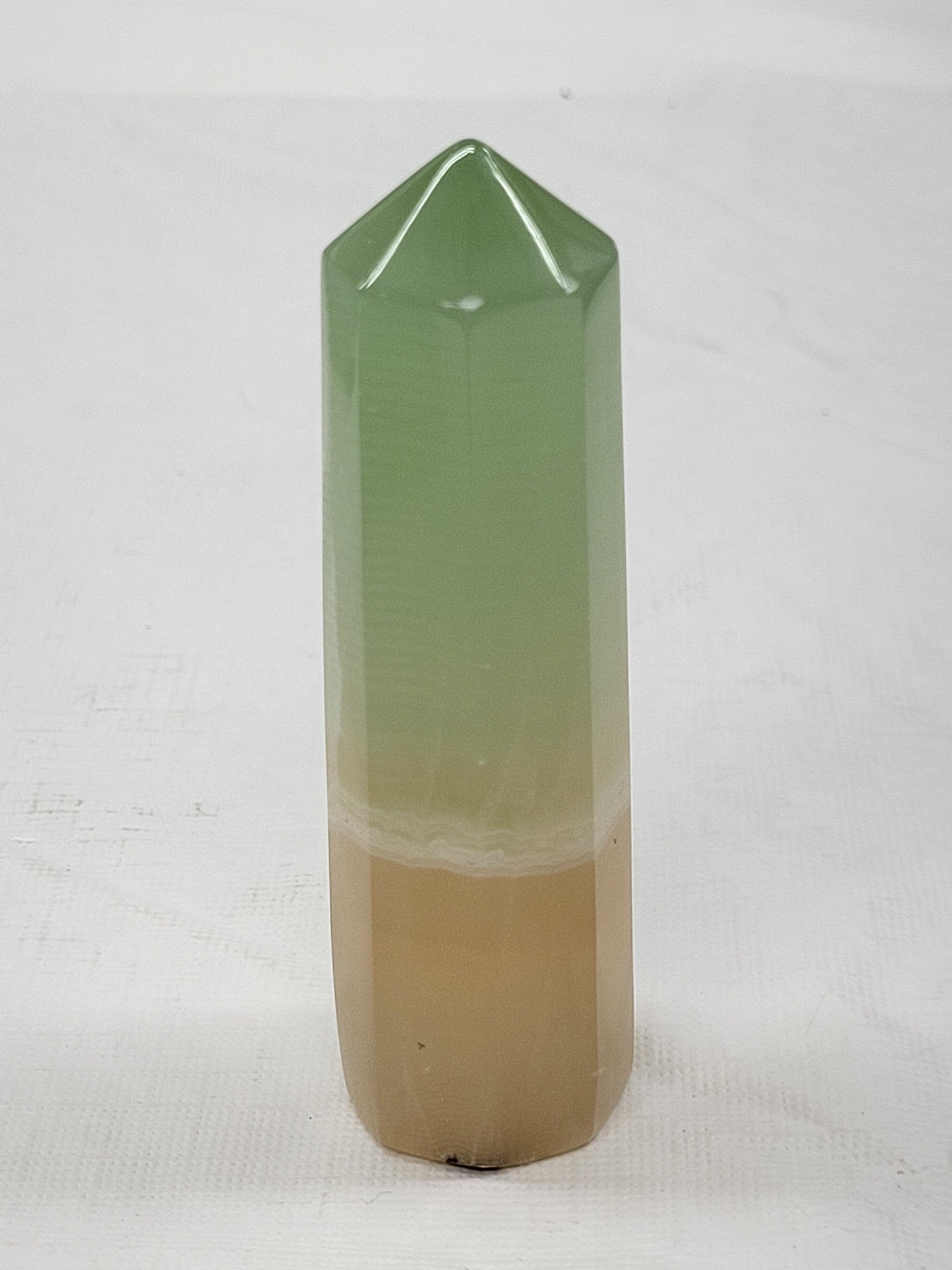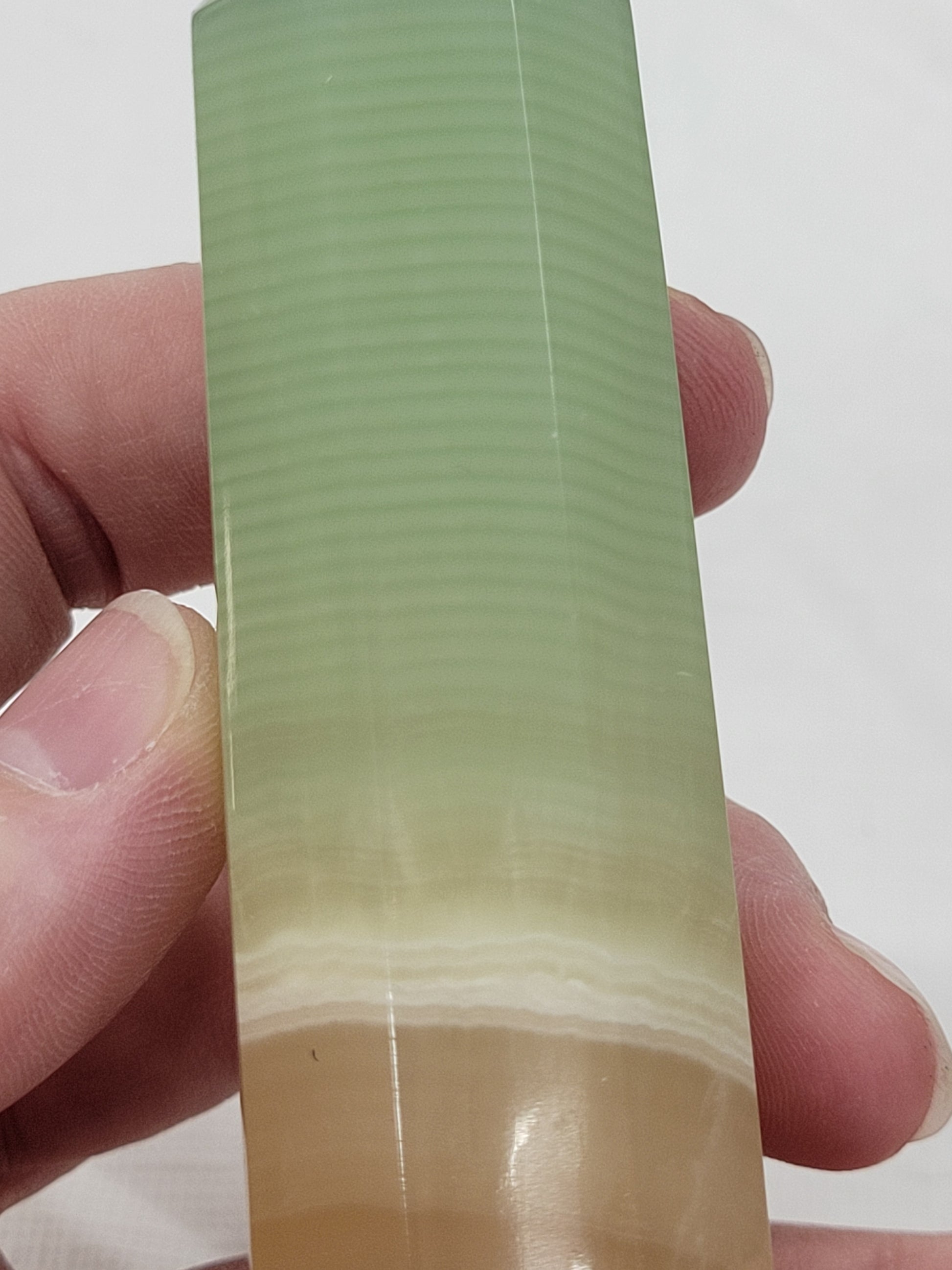 These soft, luminous blue/green towers are Fingerprint Pistachio Calcite. Some even have a soft orange/peach color. The fingerprint part comes from the internal lines that become visible in certain directions. Fingerprint Calcite comes from Pakistan.