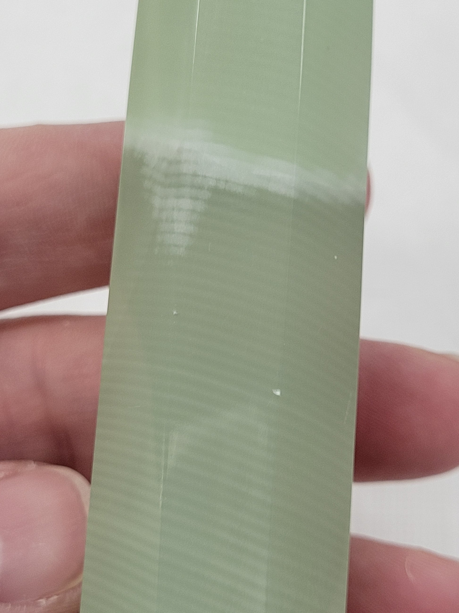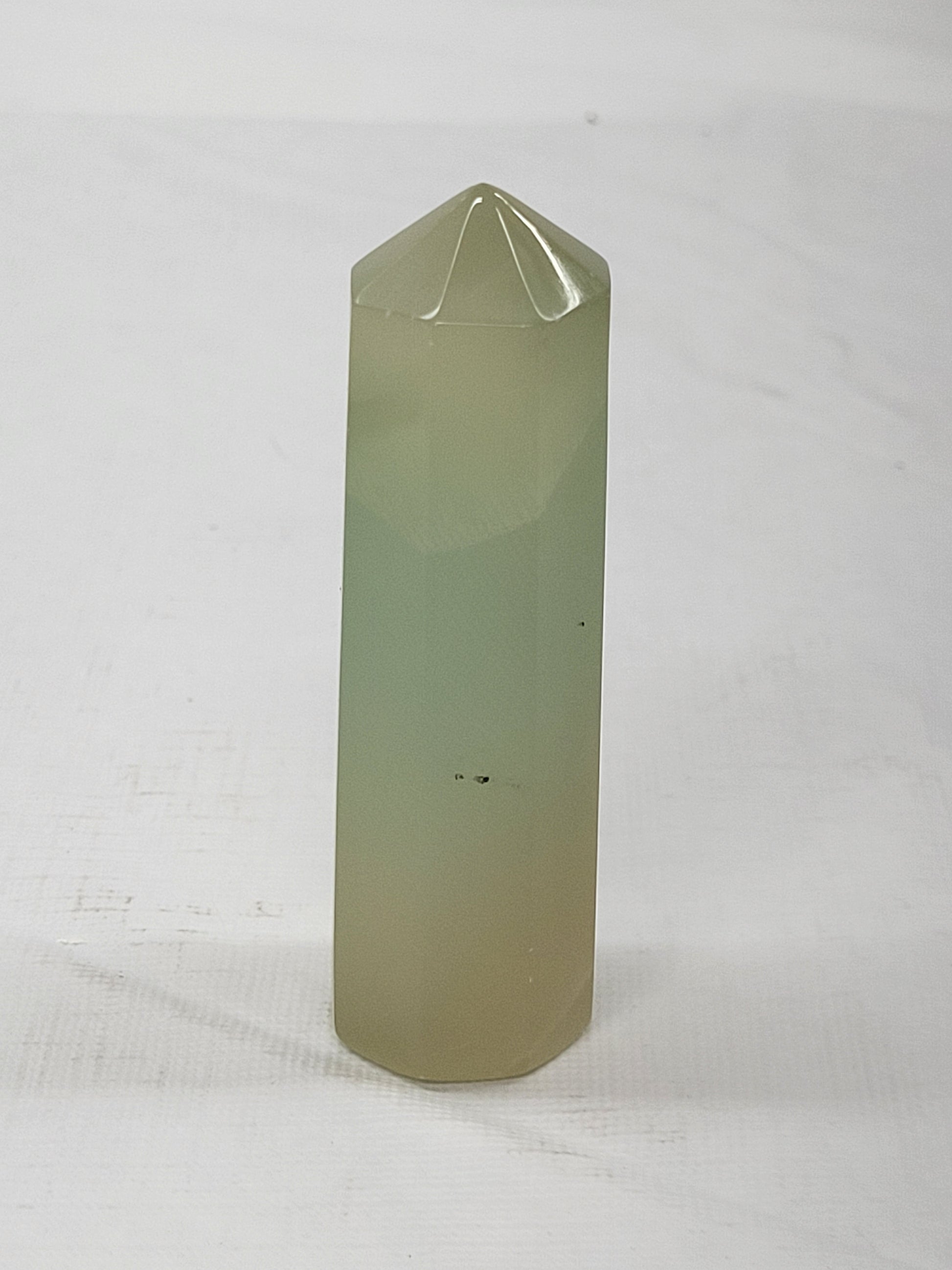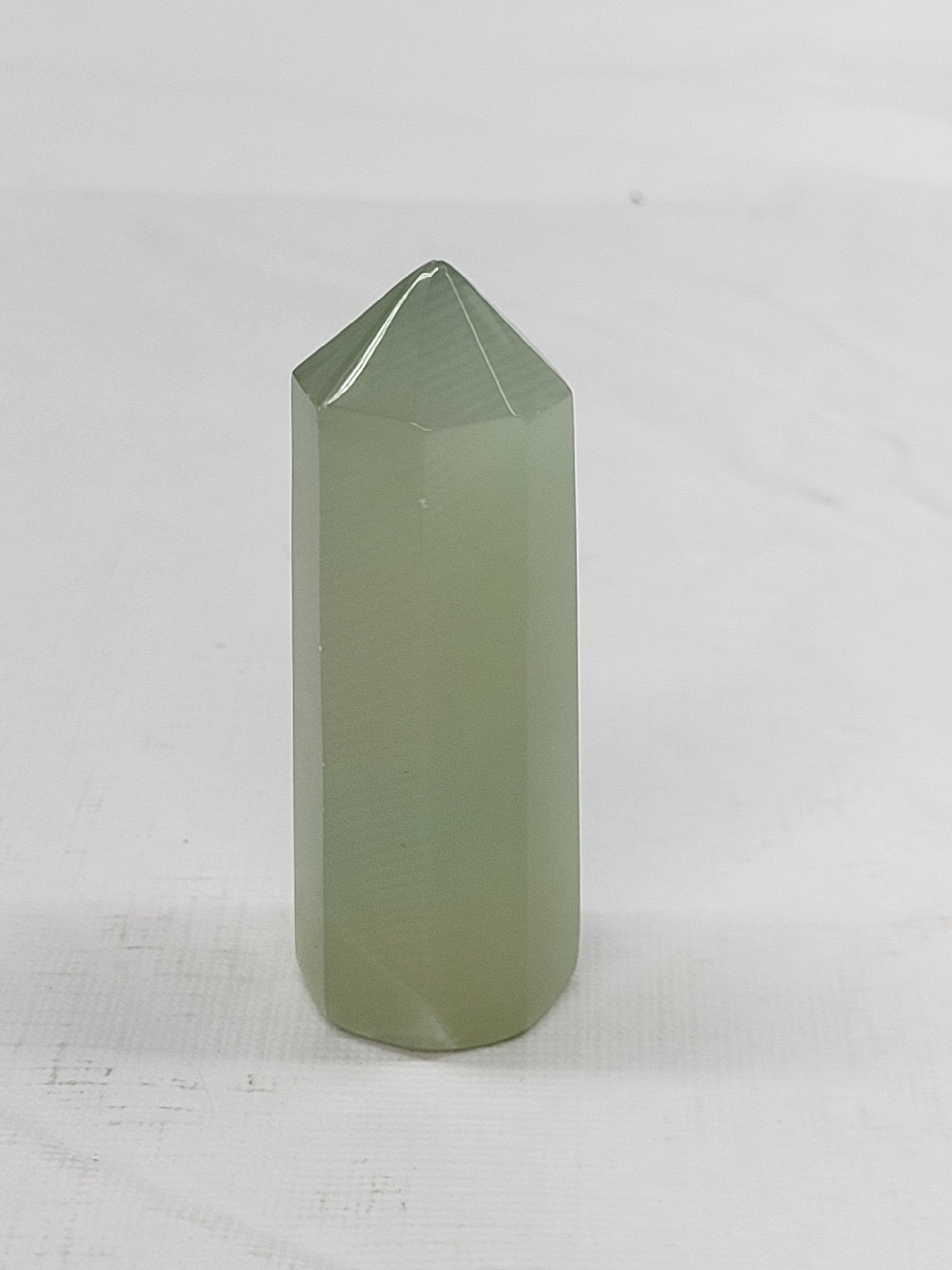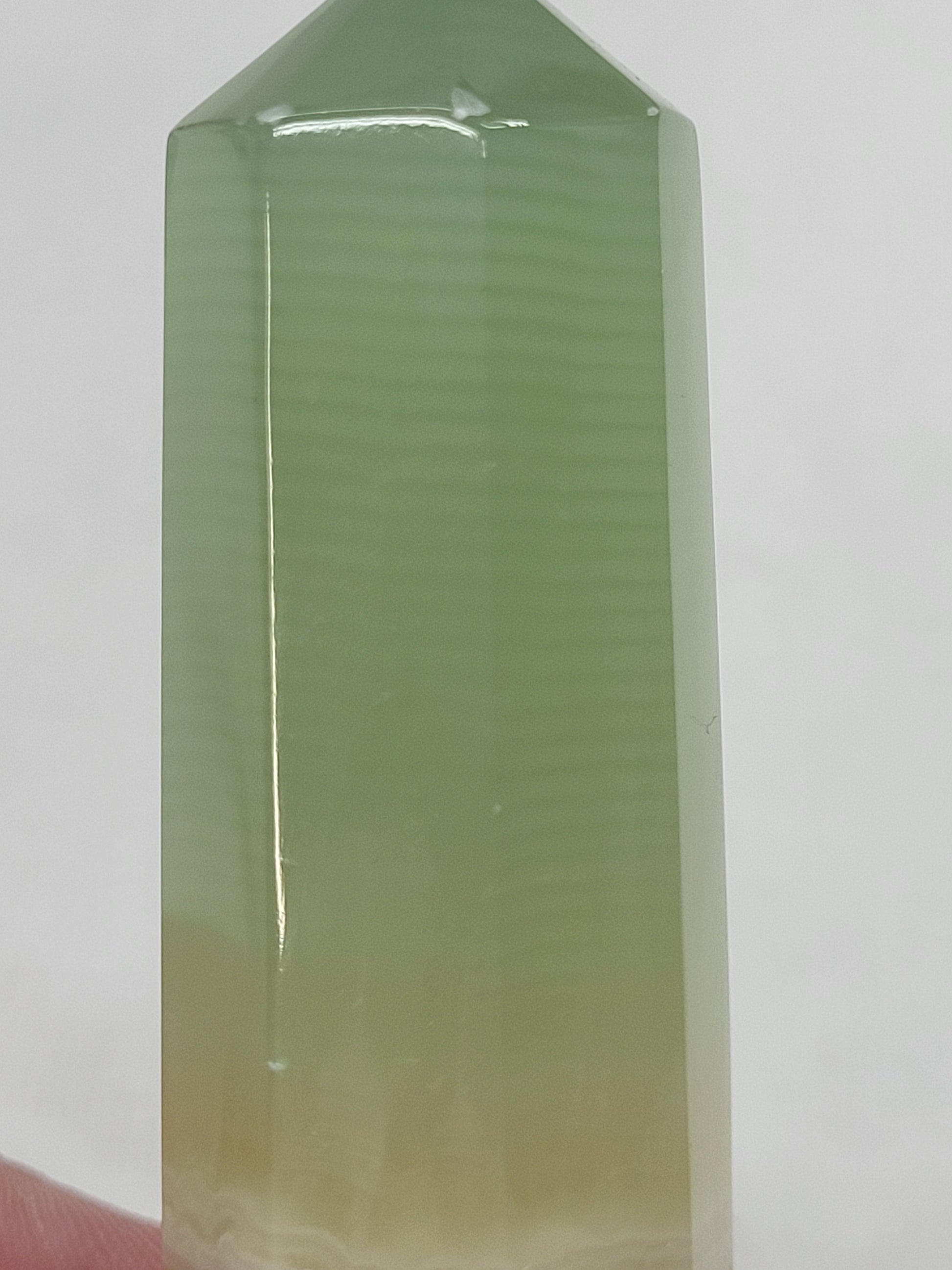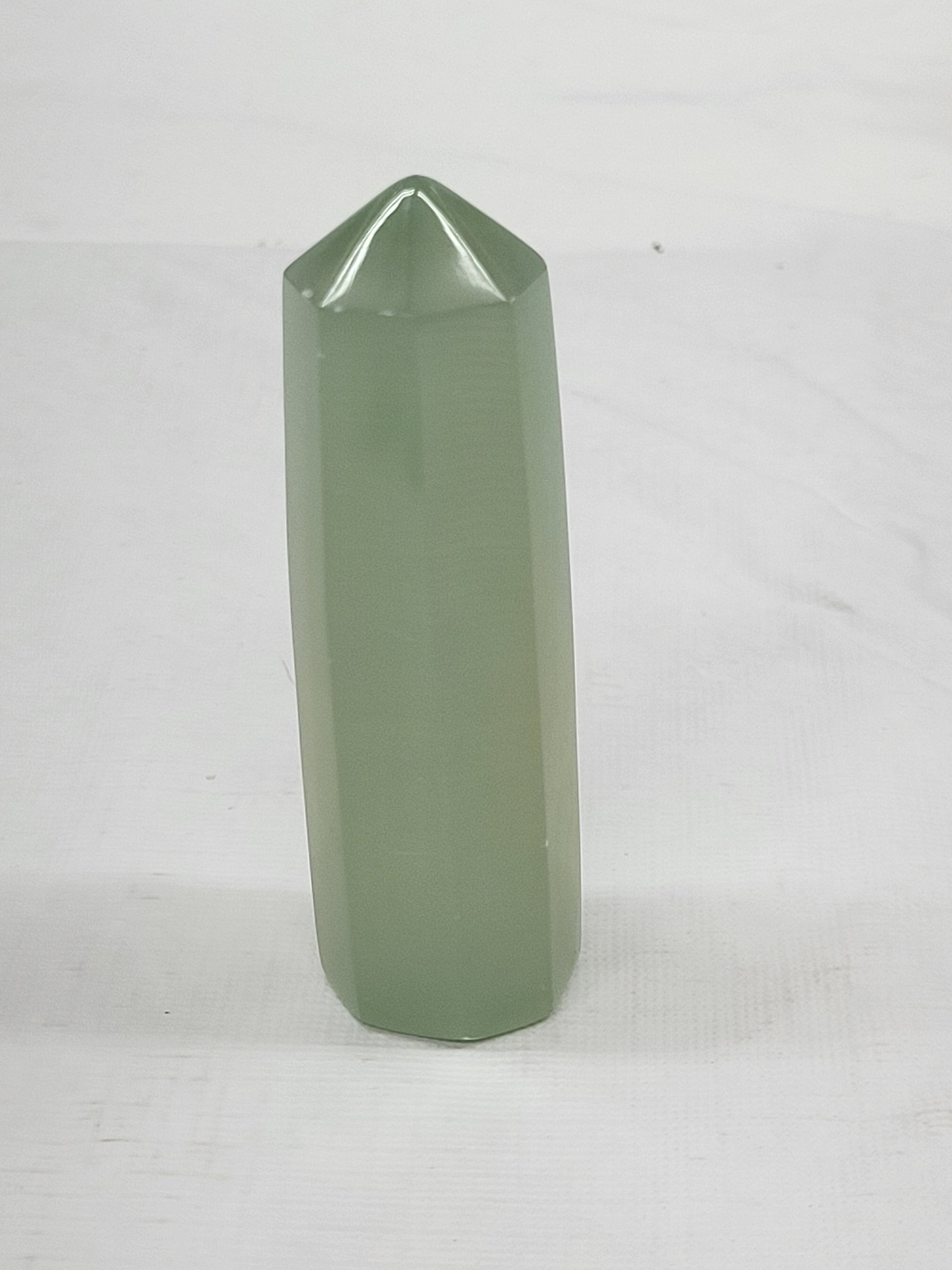 These soft, luminous blue/green towers are Fingerprint Pistachio Calcite. Some even have a soft orange/peach color. The fingerprint part comes from the internal lines that become visible in certain directions. Fingerprint Calcite comes from Pakistan.
