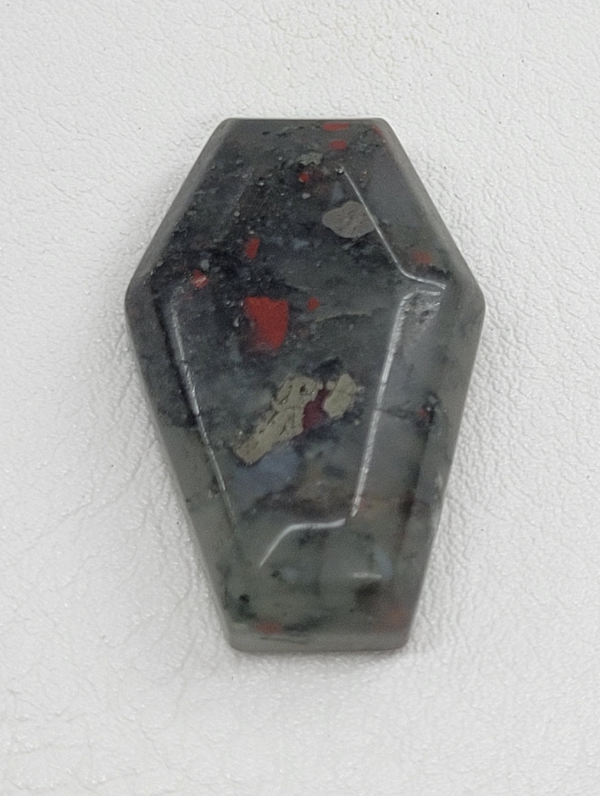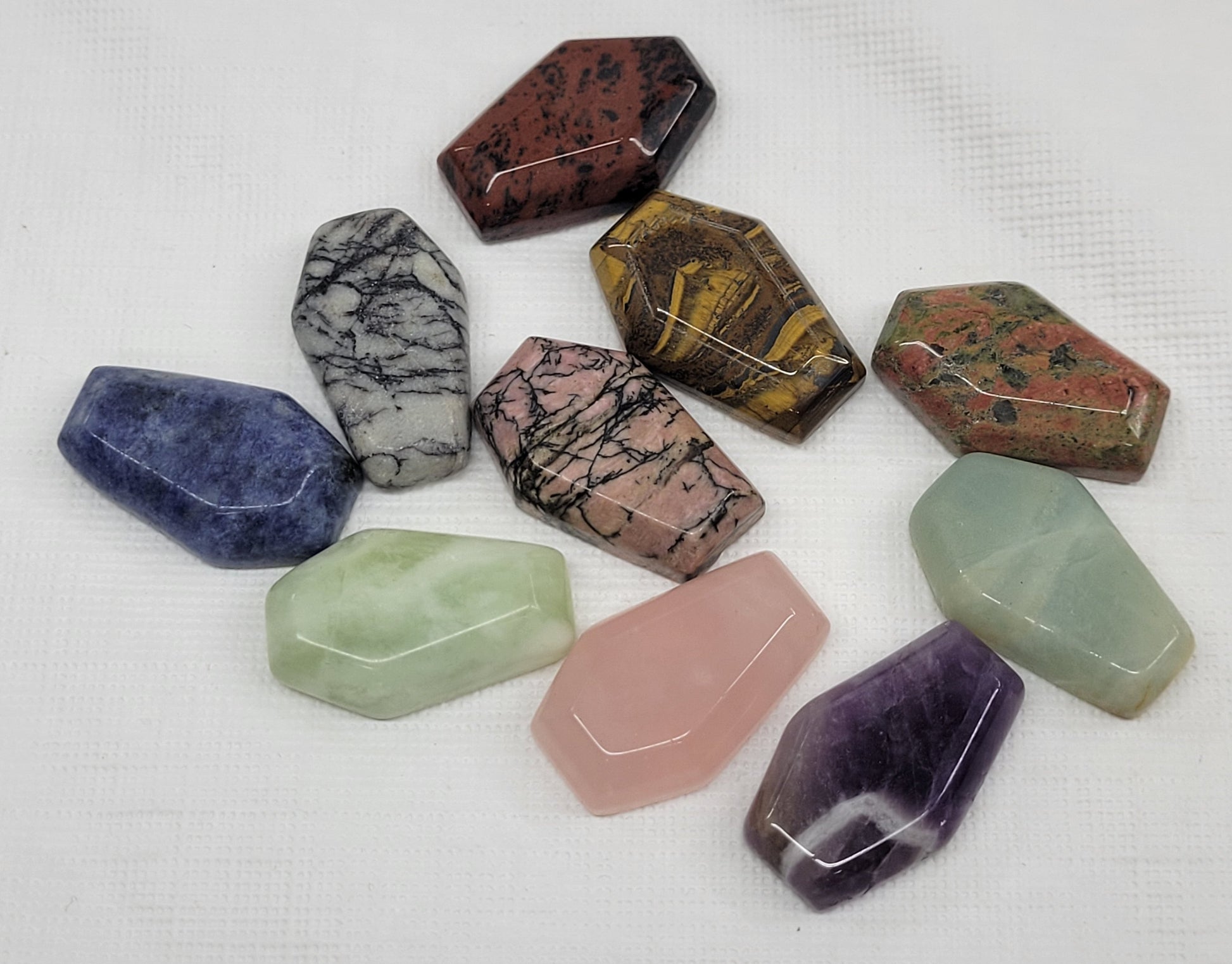 Flat coffin carvings in a variety of materials. Each coffin measures 1"