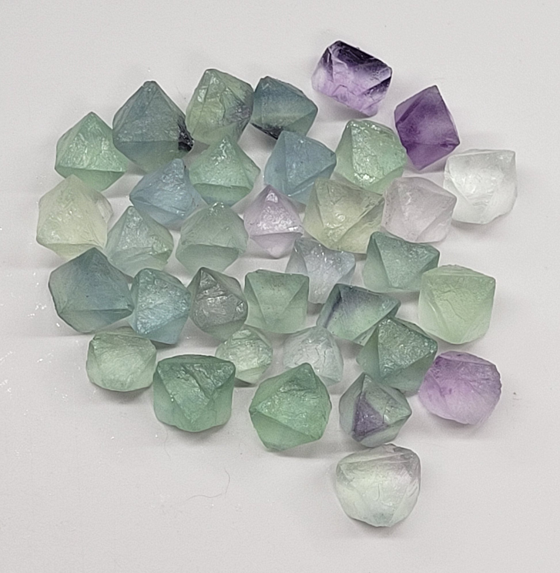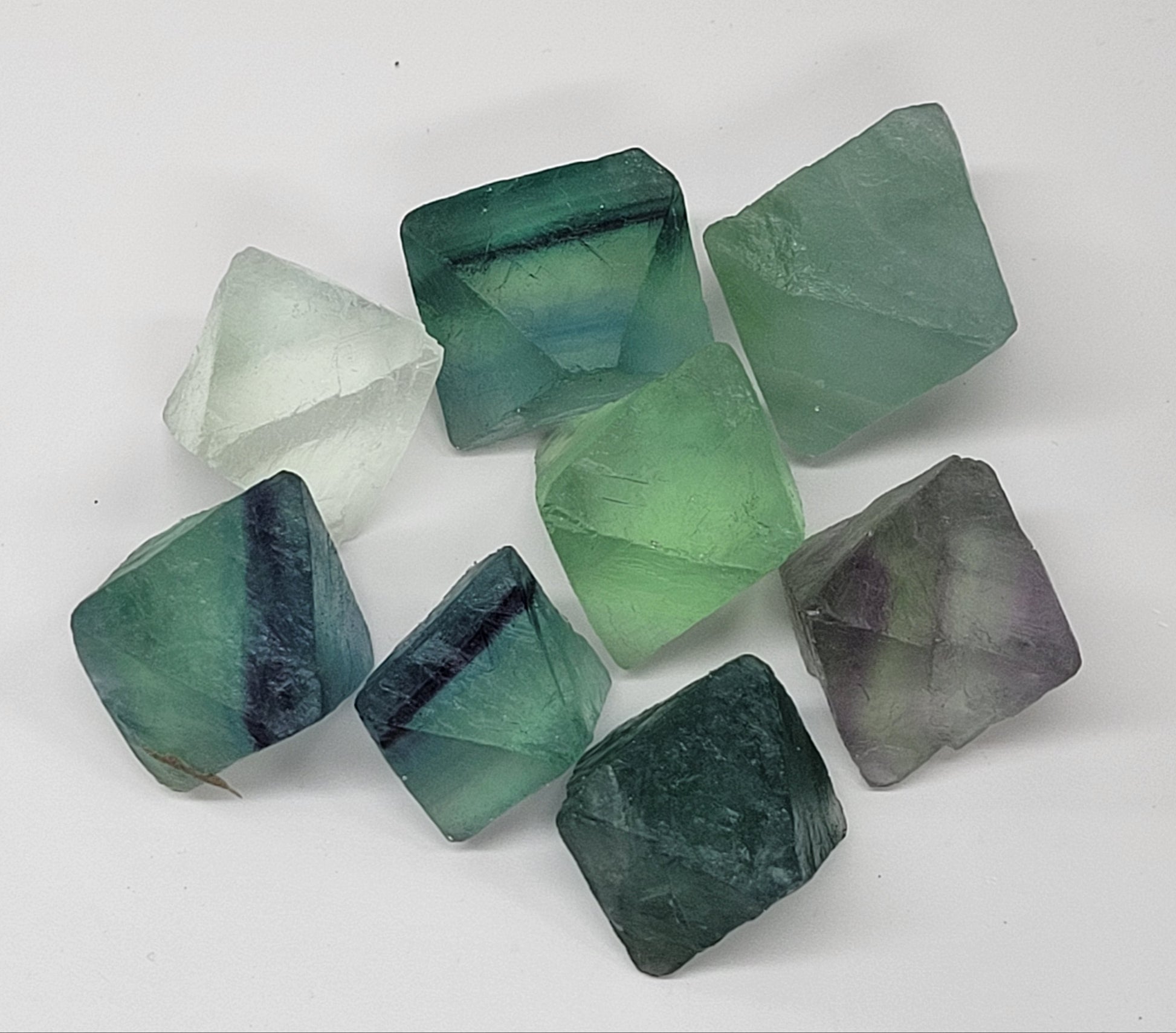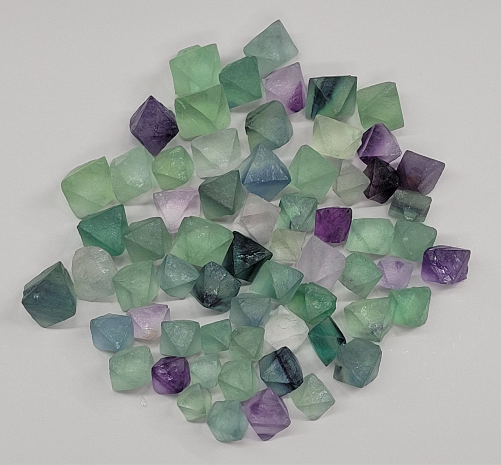 Fluorite Octahedrons in a variety of colors and sizes. The shape is from the way fluorite cleaves naturally; octahedrons form with 6 vertices and at each “point” 4 edges meet.