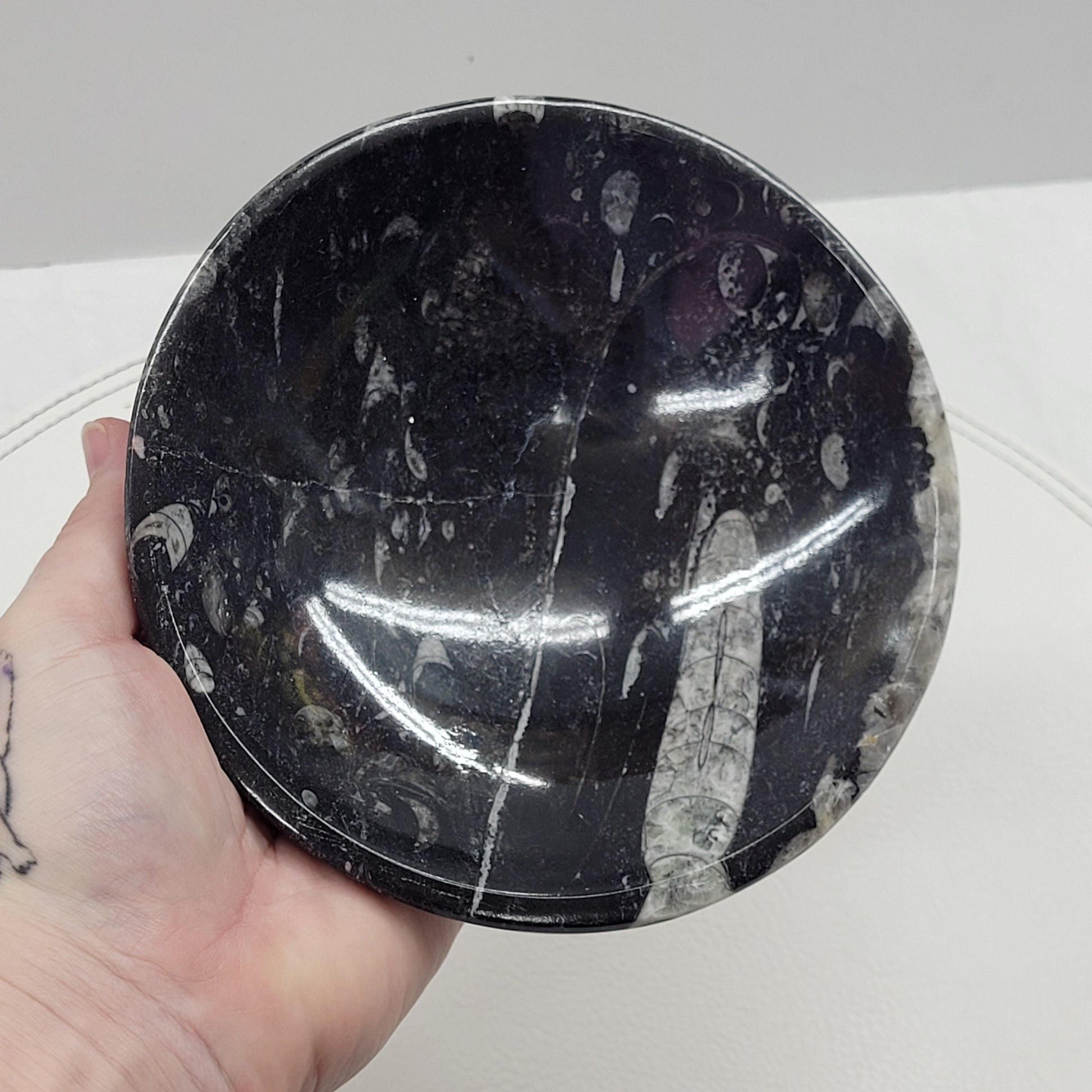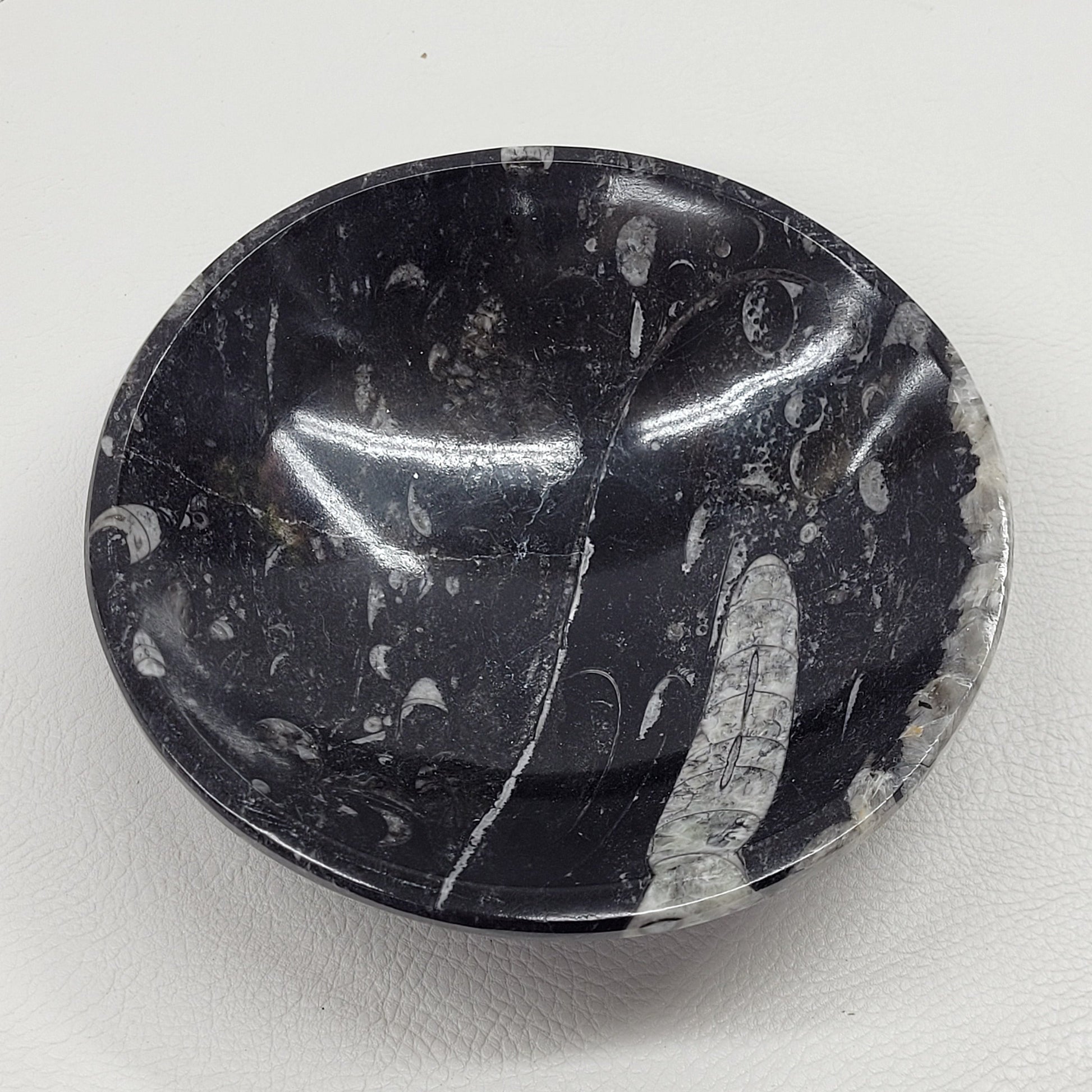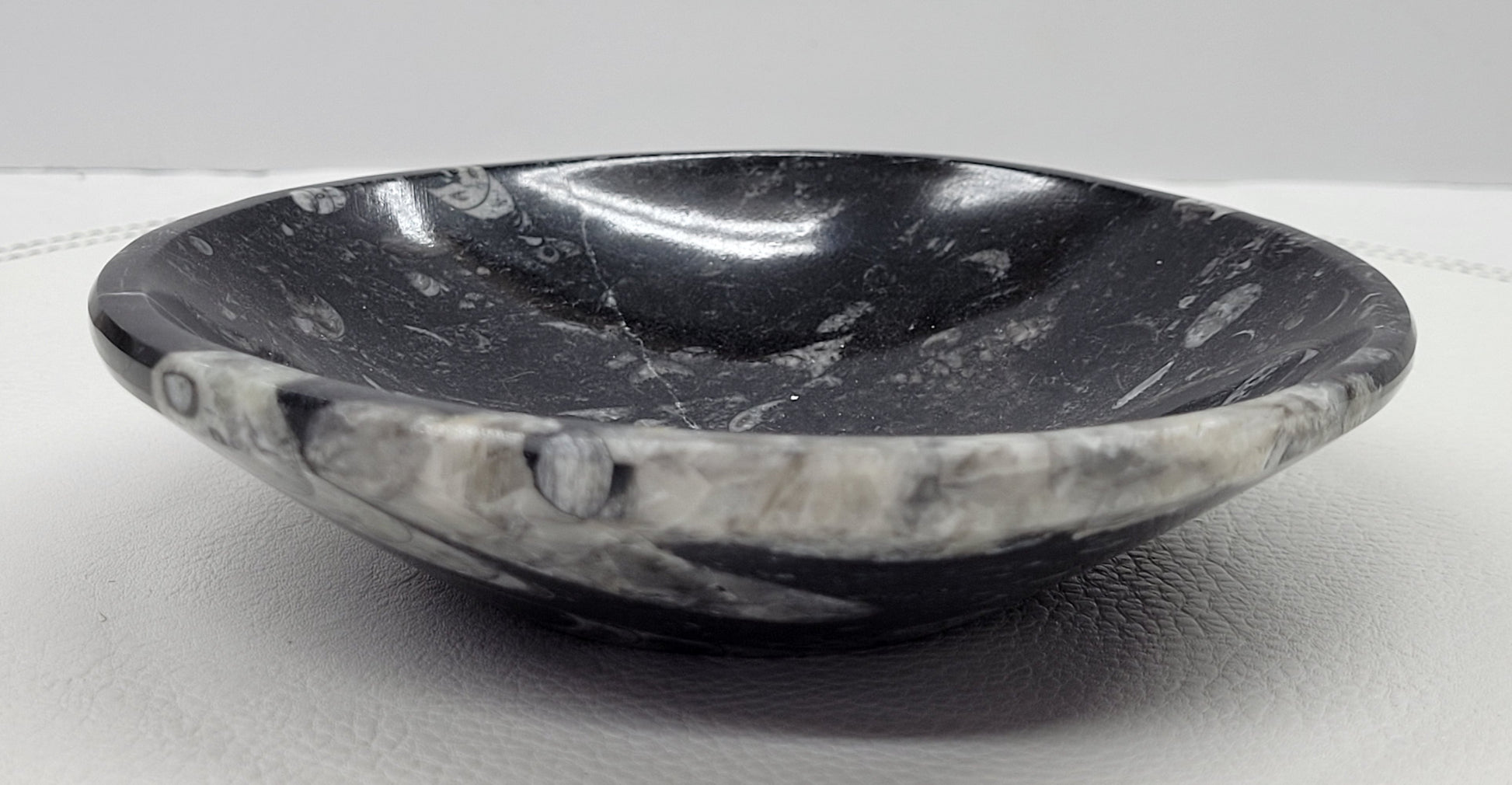 Beautiful Fossil bowl with Orthoceras and other fossils. Bowl measures 6" wide.