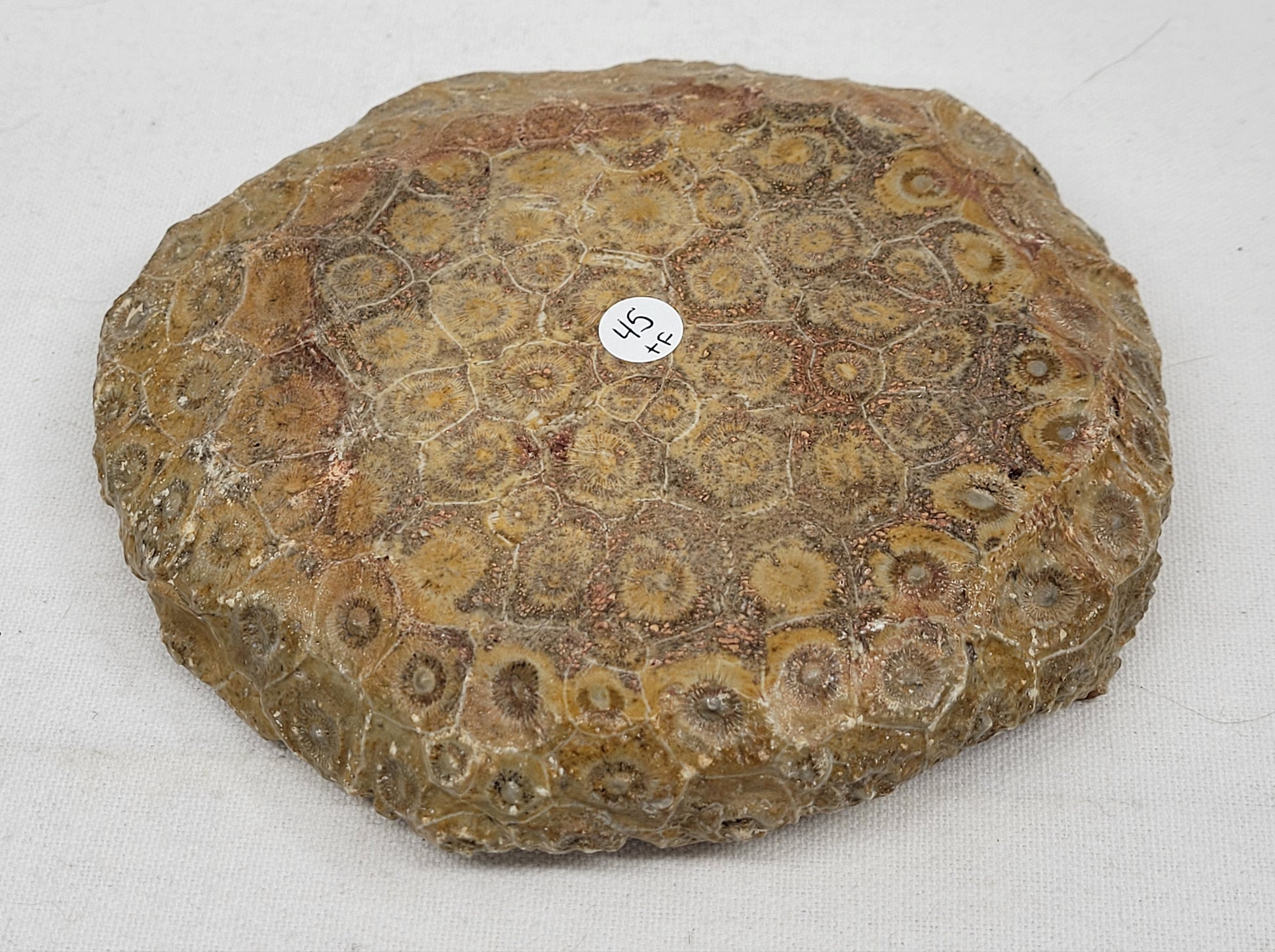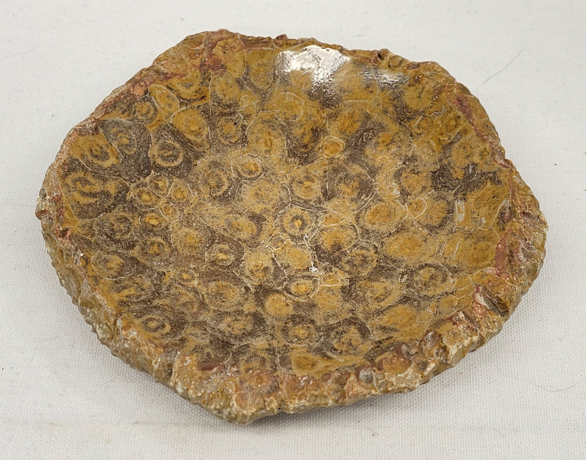 Polished fossil coral bowl made from "Actinocyathus" coral which was a colony rugose coral from the Pennsylvanian period (318-299 Million years ago) The polishing brings out the beautiful detail and color of the in the inner structure of the coral. This fossil coral bares some resemblance to the "petosky stone" from Michigan.