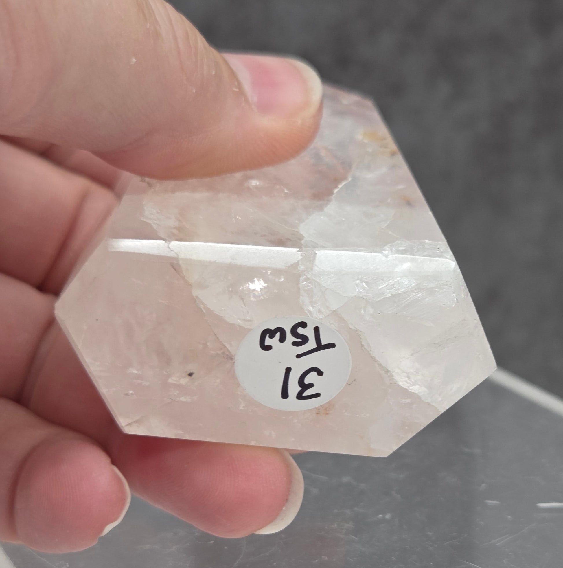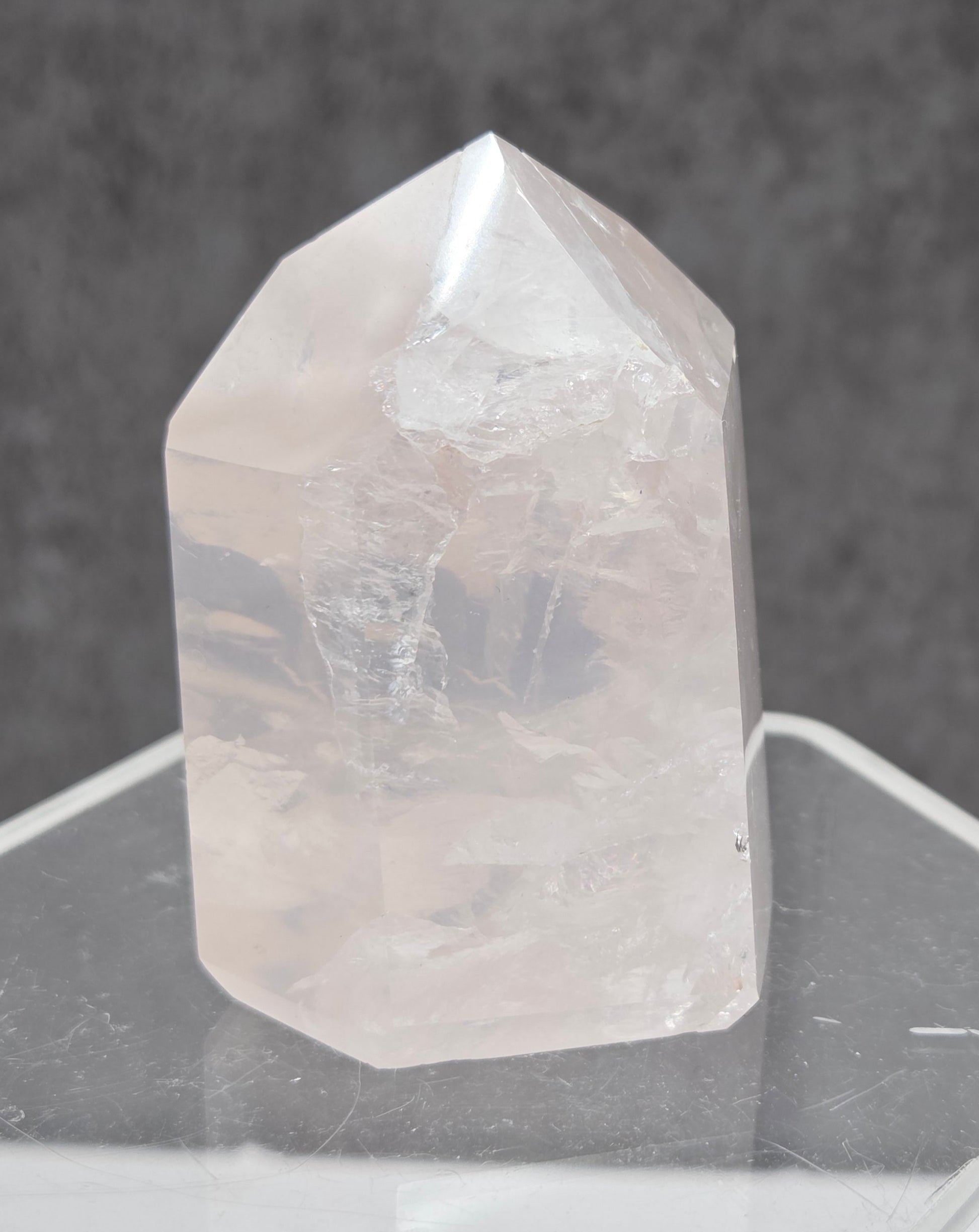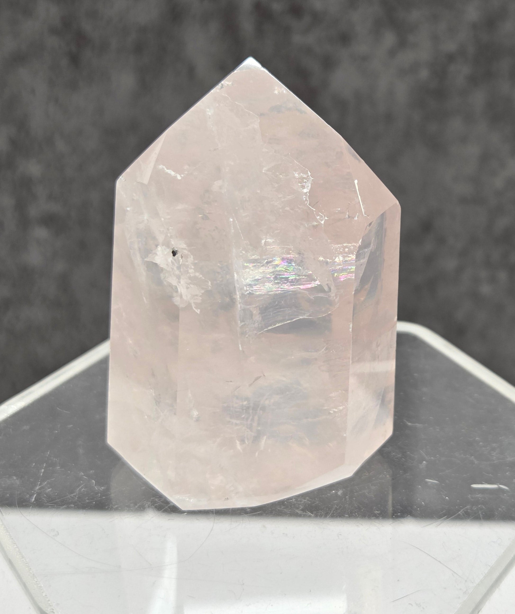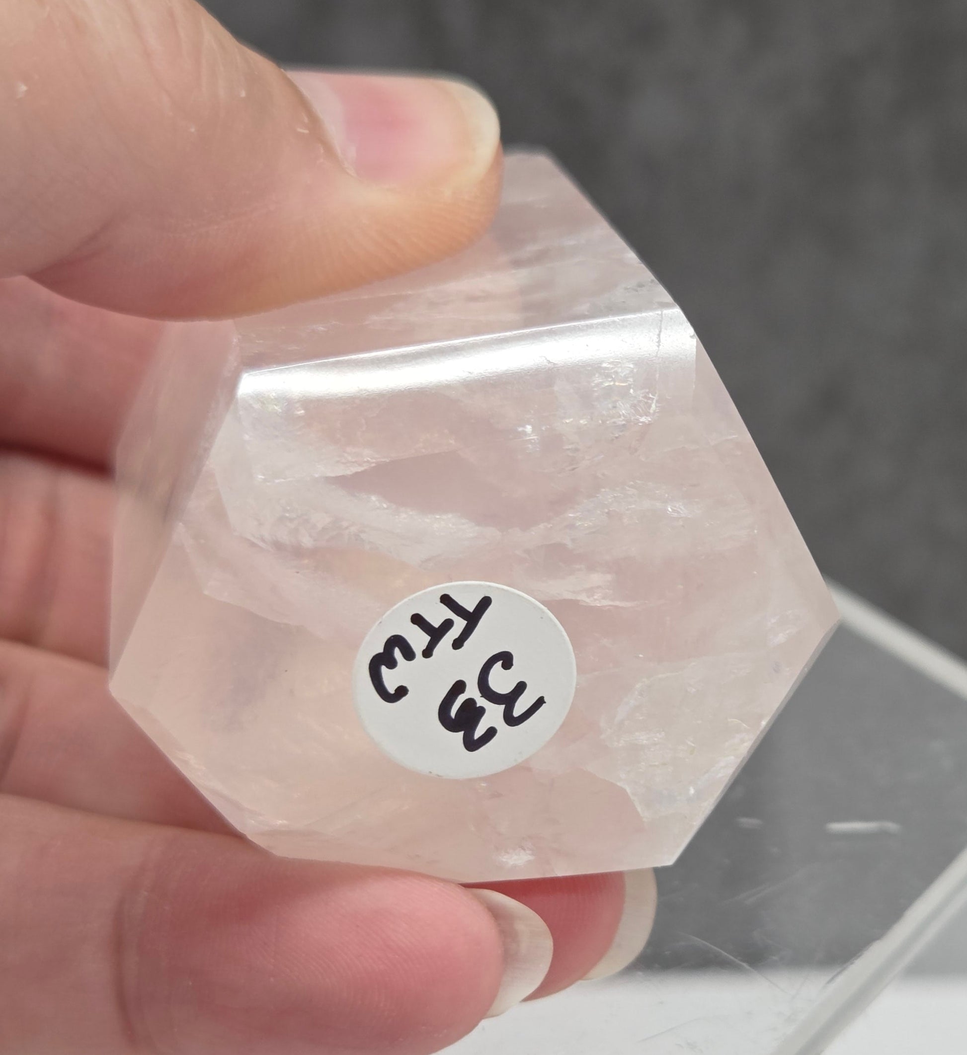 Girasol Rose Quartz is a pale, translucent variety of Rose Quartz that exhibits an opalescent or bluish-golden glow due to light scattering off microscopic inclusions.