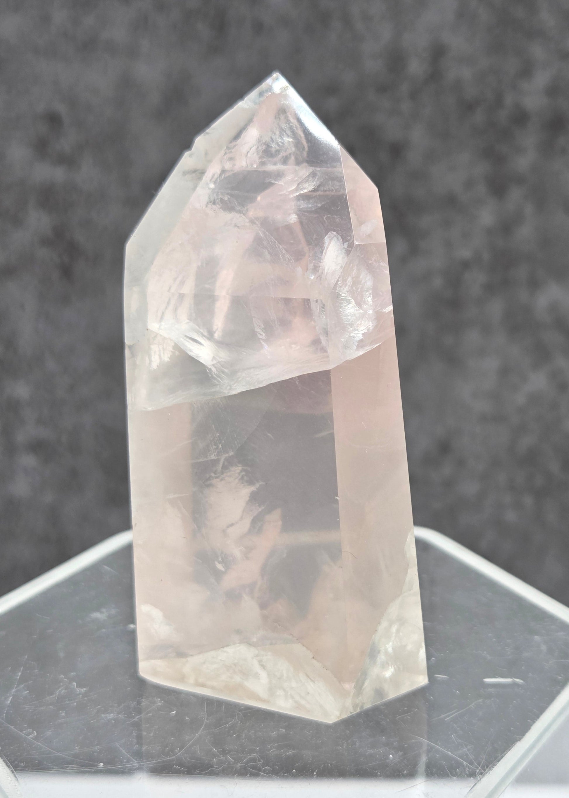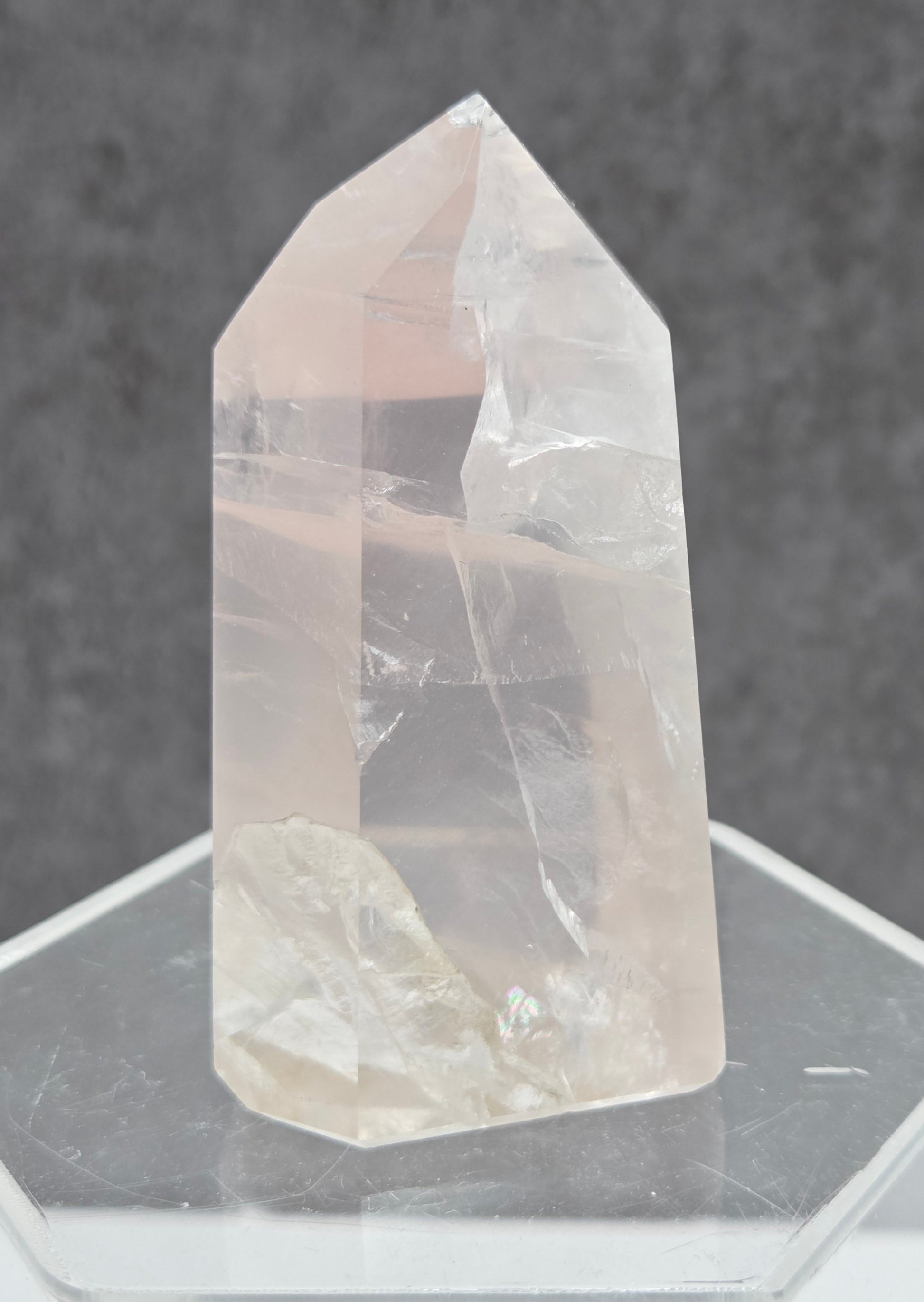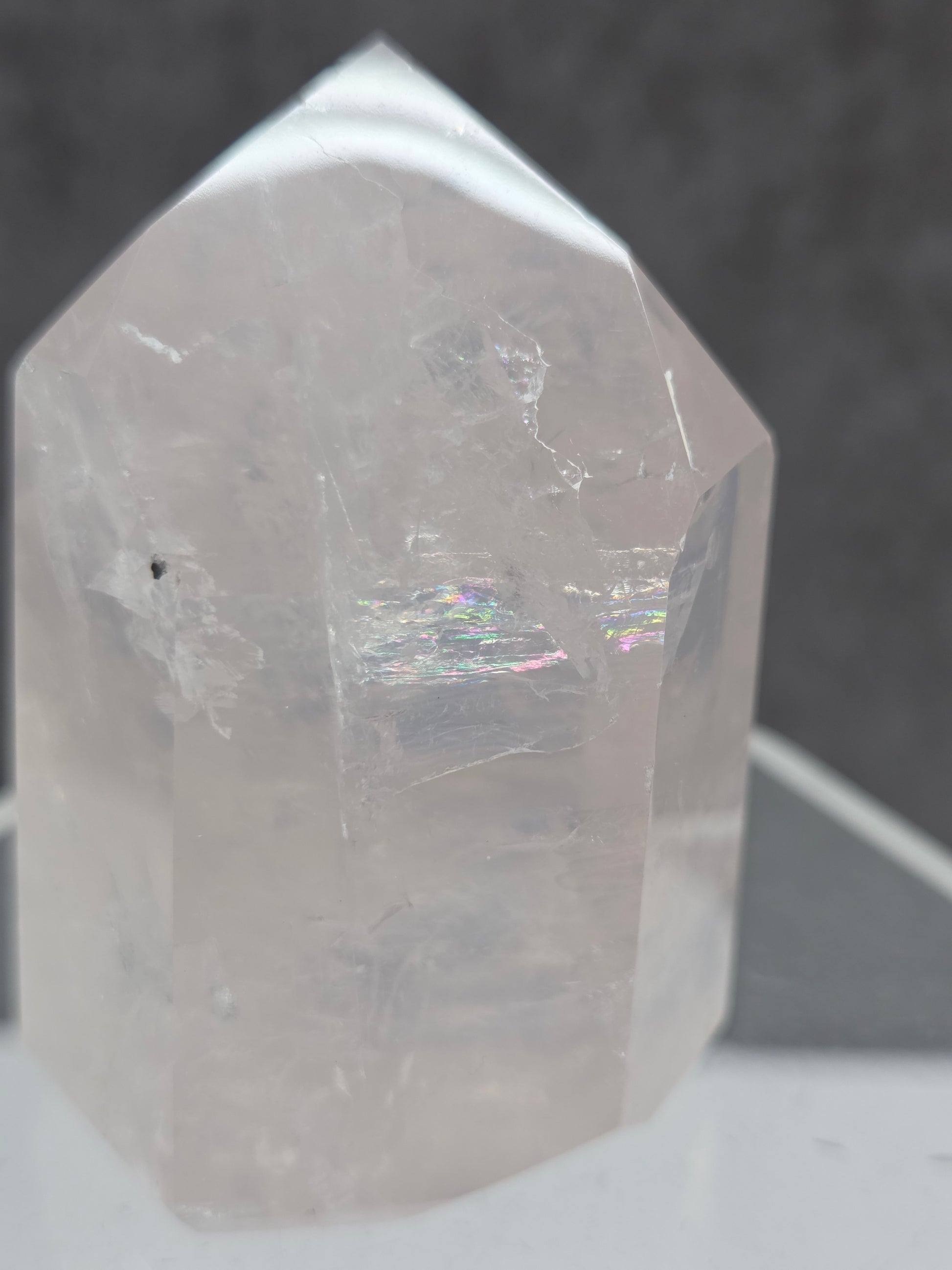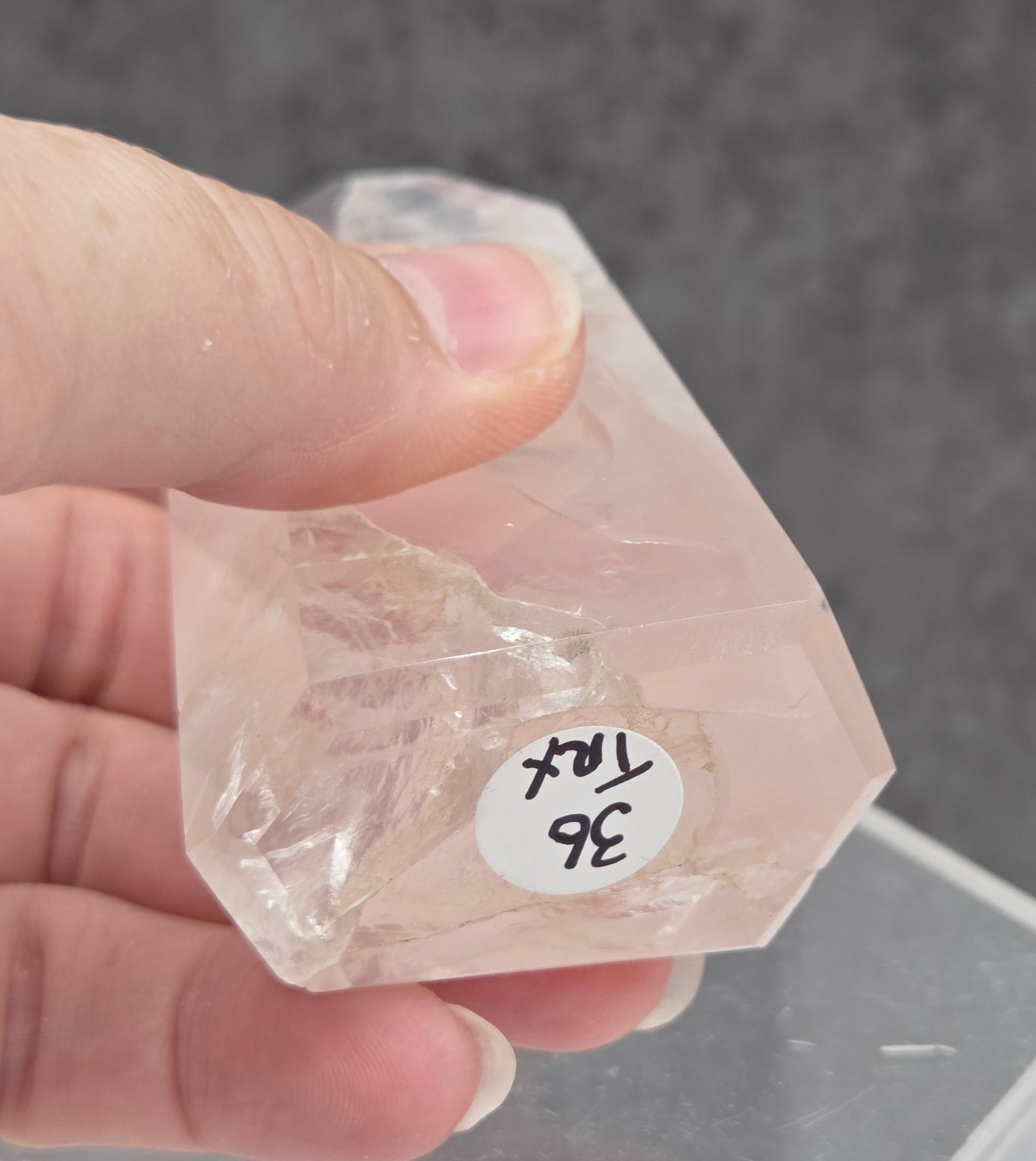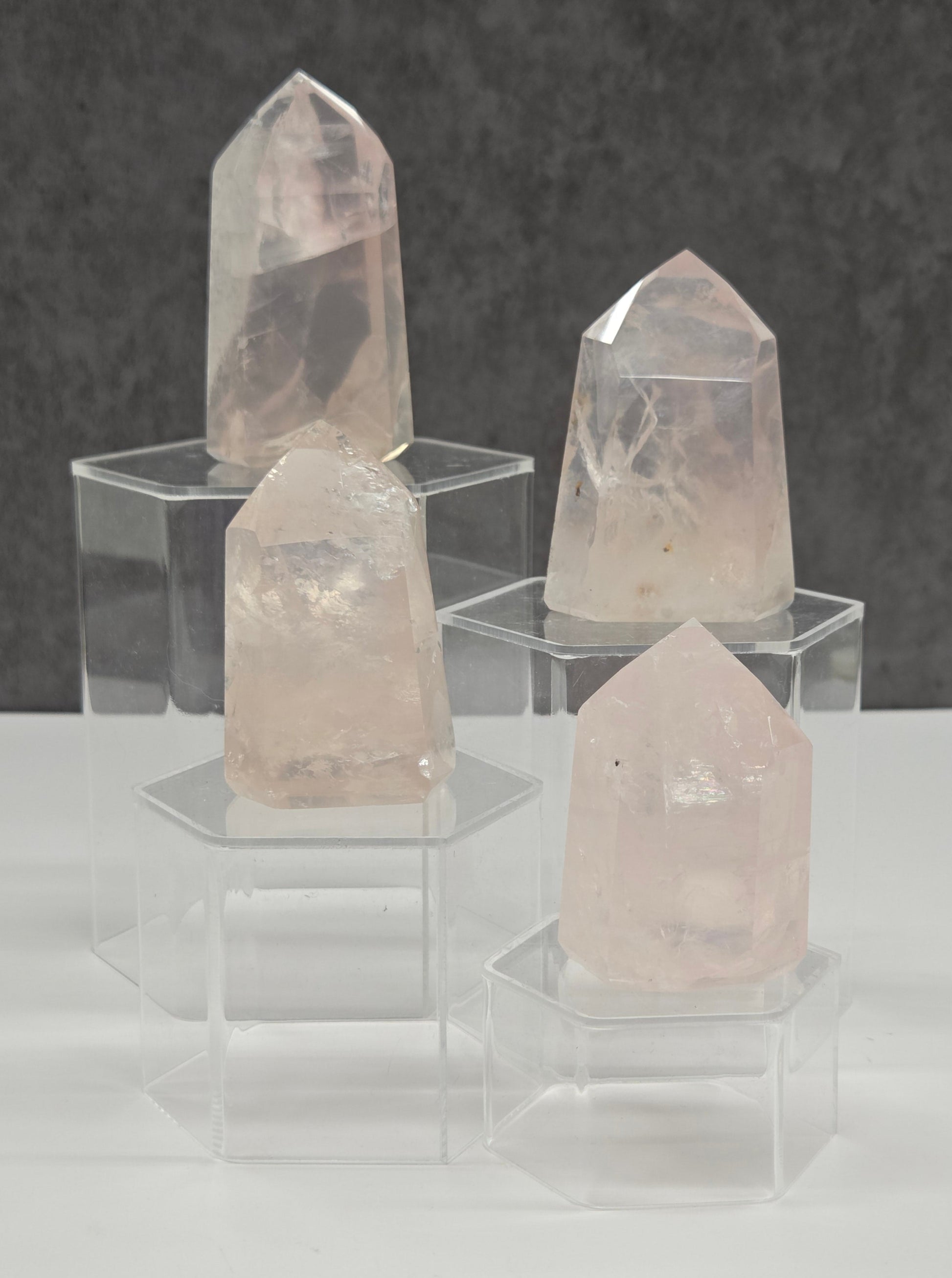 Girasol Rose Quartz is a pale, translucent variety of Rose Quartz that exhibits an opalescent or bluish-golden glow due to light scattering off microscopic inclusions.