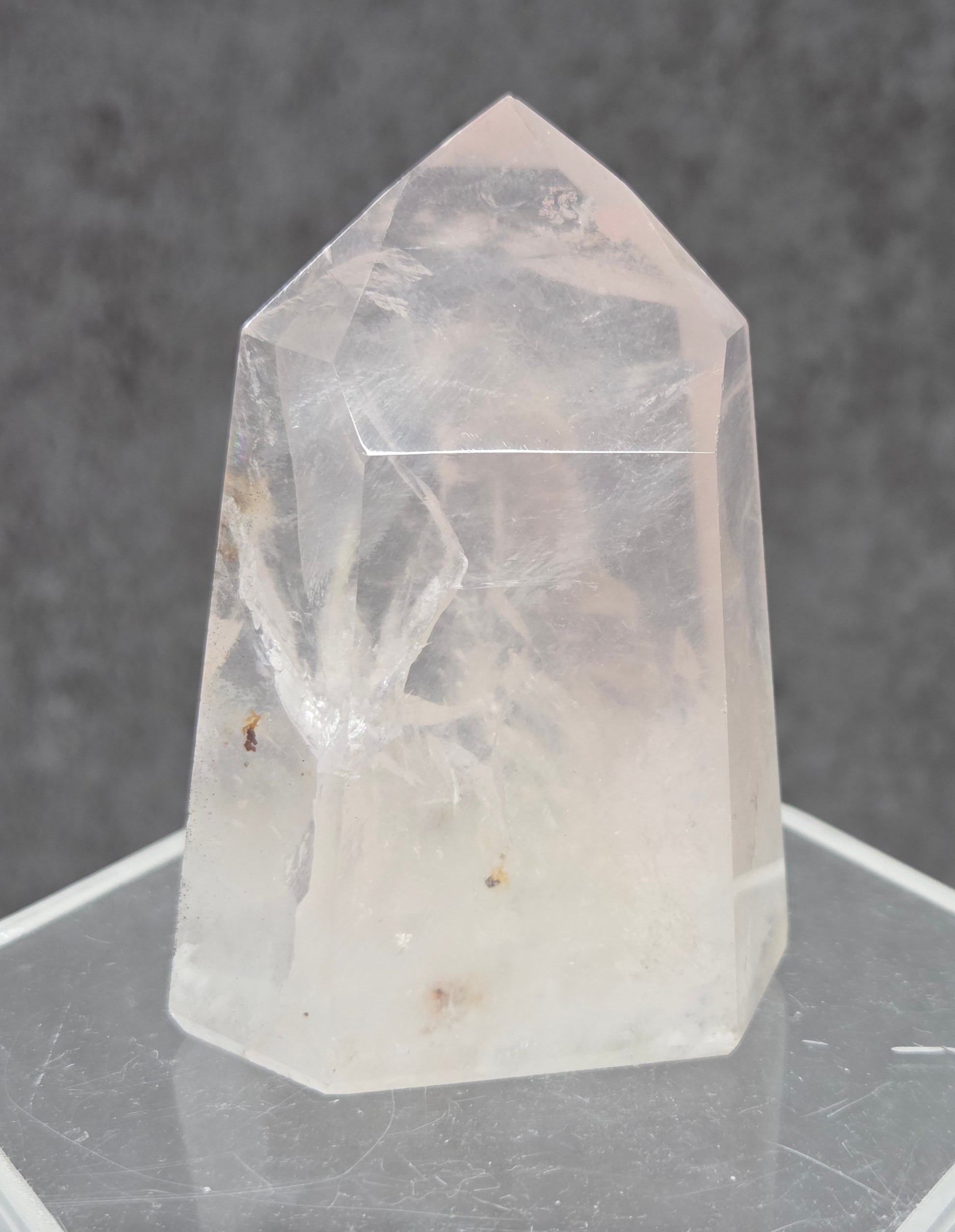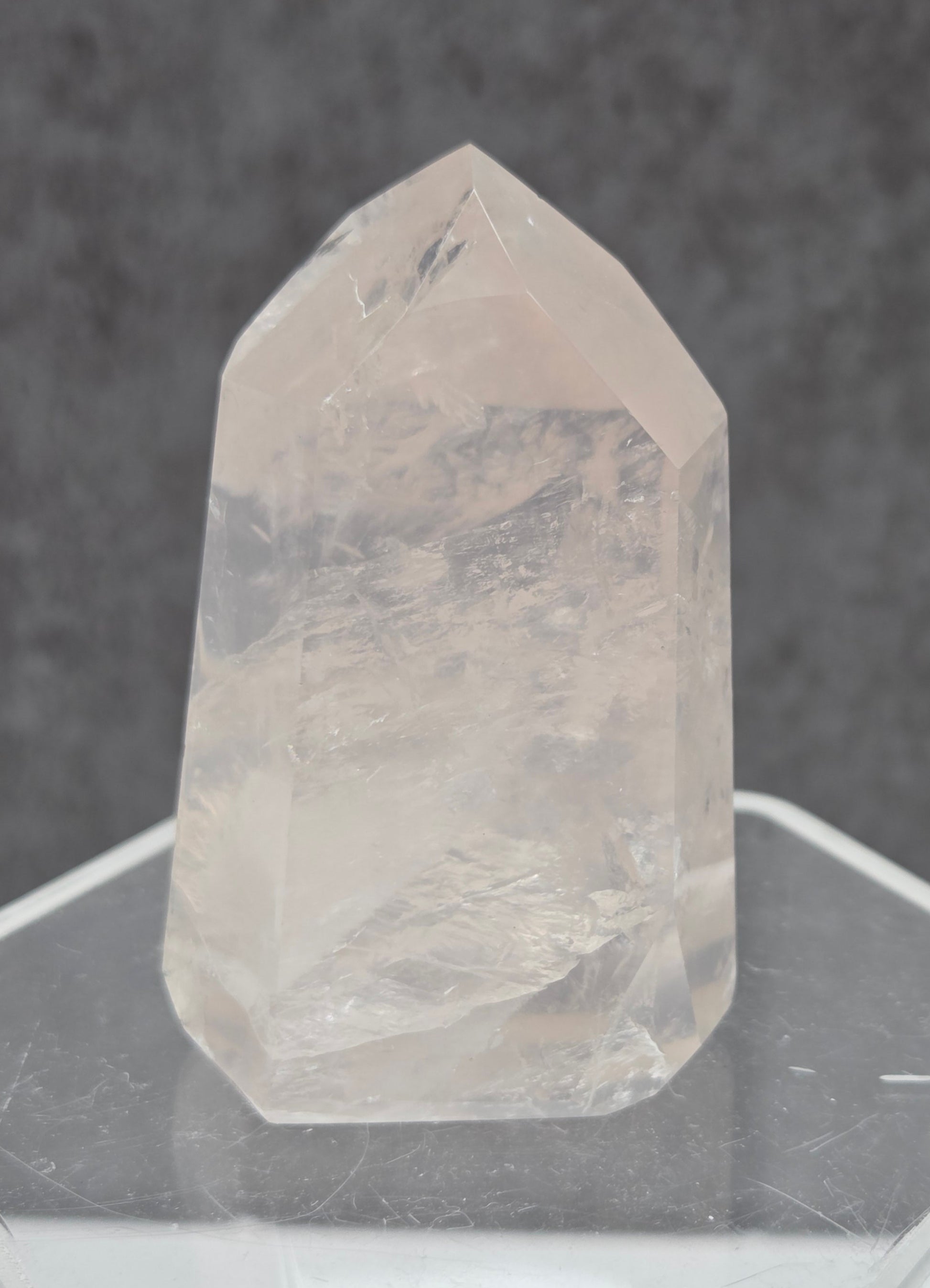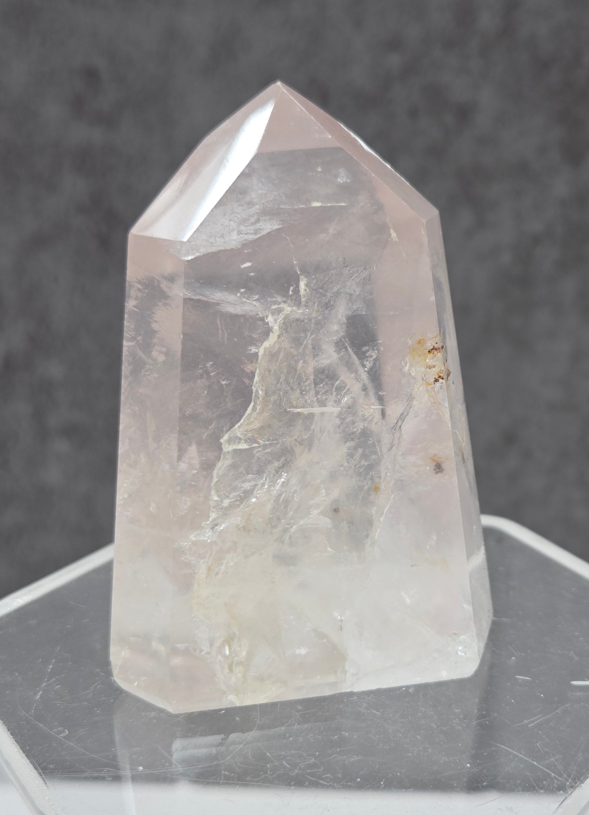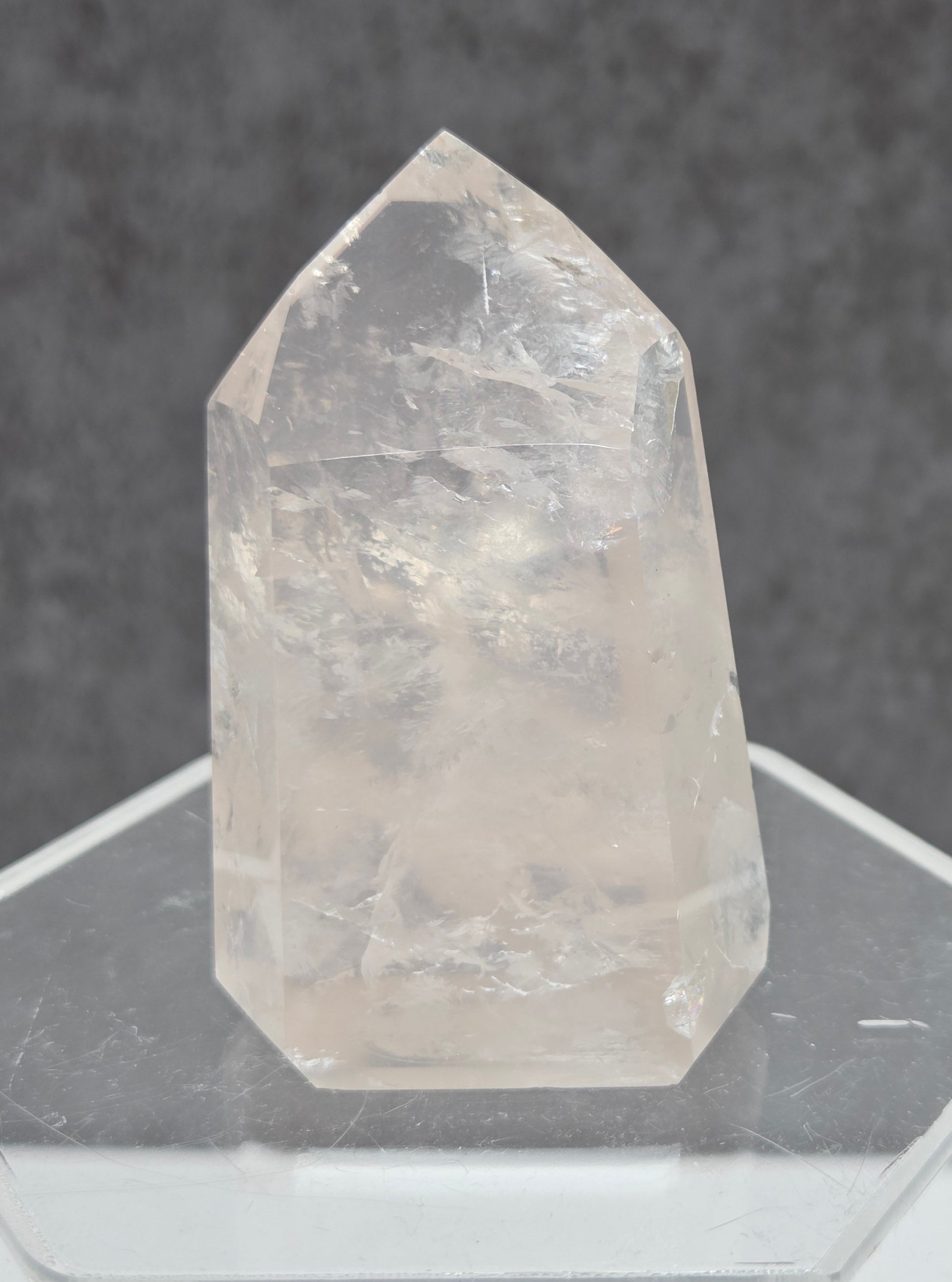 Girasol Rose Quartz is a pale, translucent variety of Rose Quartz that exhibits an opalescent or bluish-golden glow due to light scattering off microscopic inclusions.