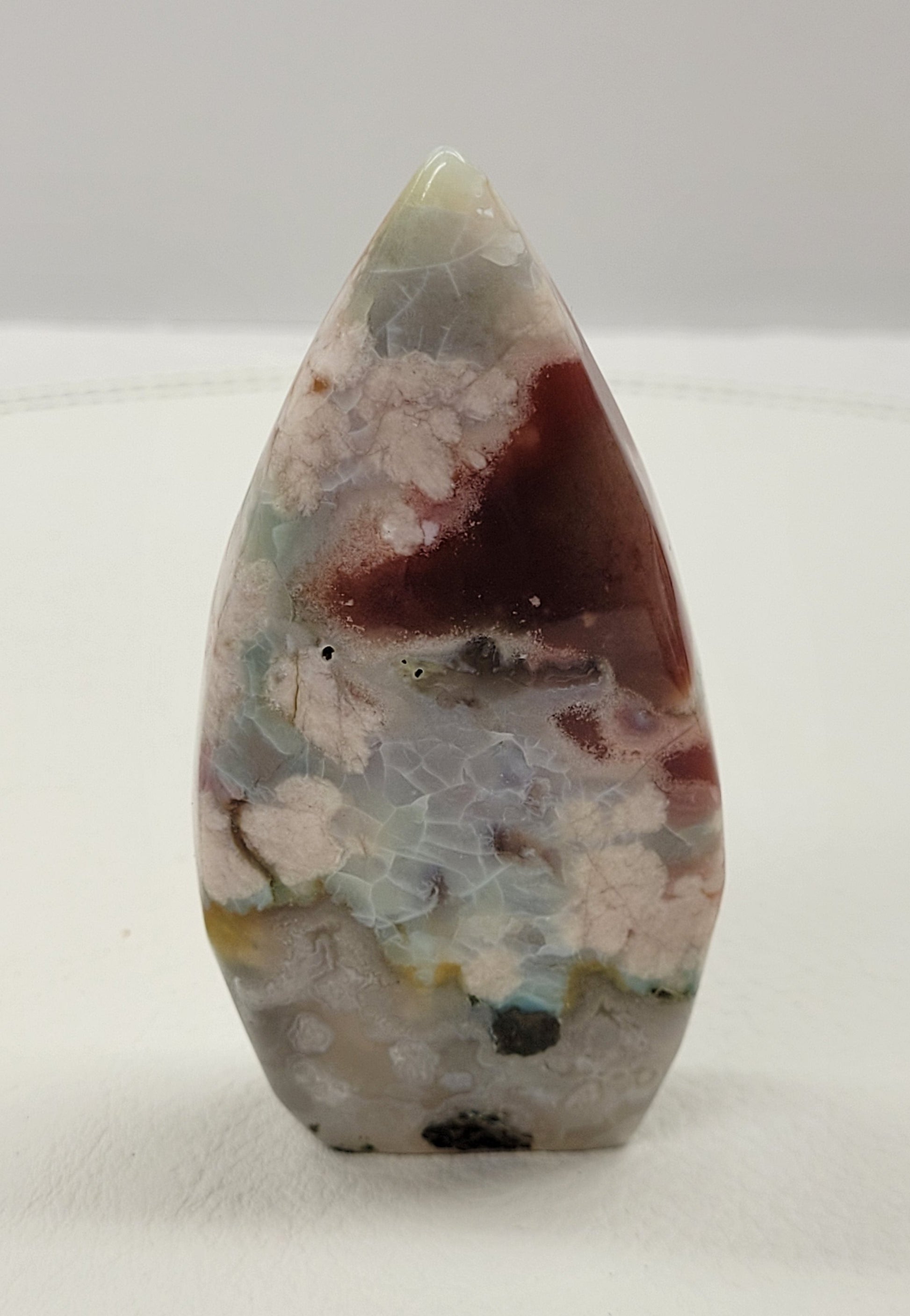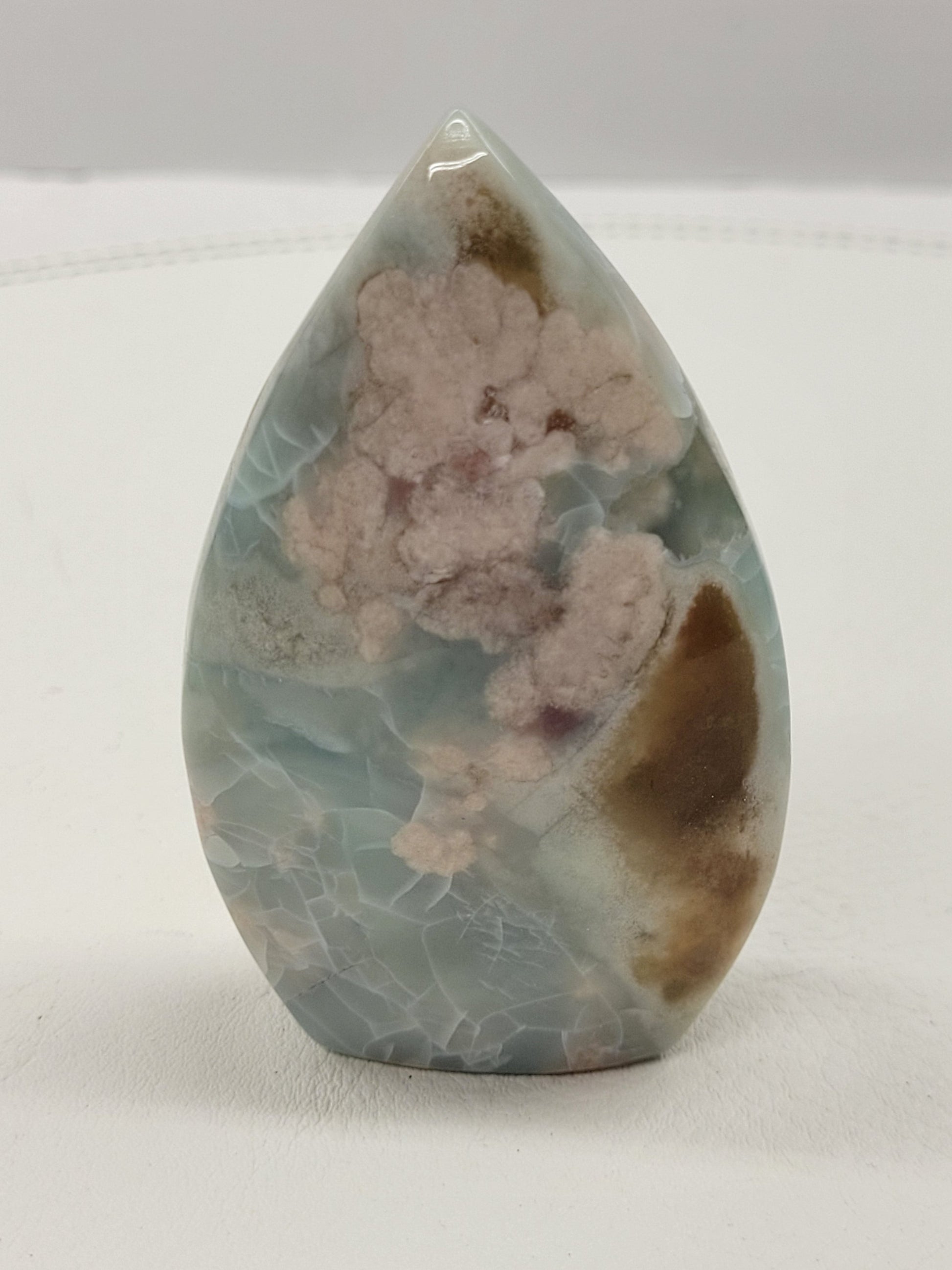 Flower Agate is a type of Agate with opaque Chalcedony inclusions that resemble tiny floral formations. It is usually found in a light pink color with white “flower” inclusions, while Green Flower Agate gets its green color from Chlorite inclusions.