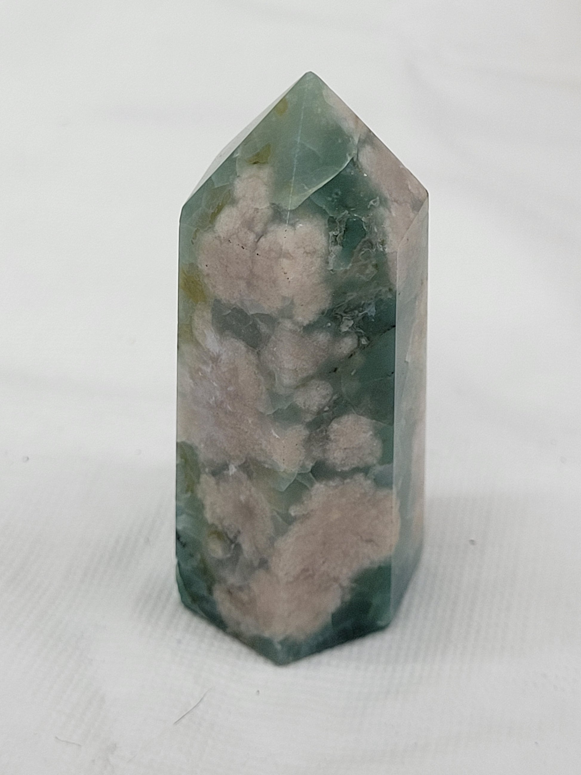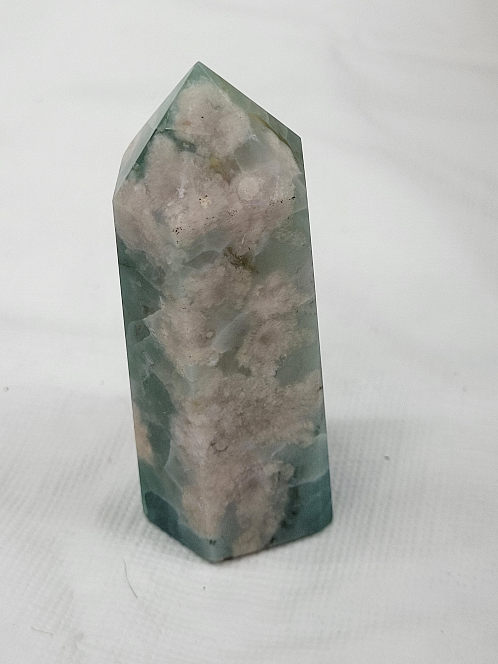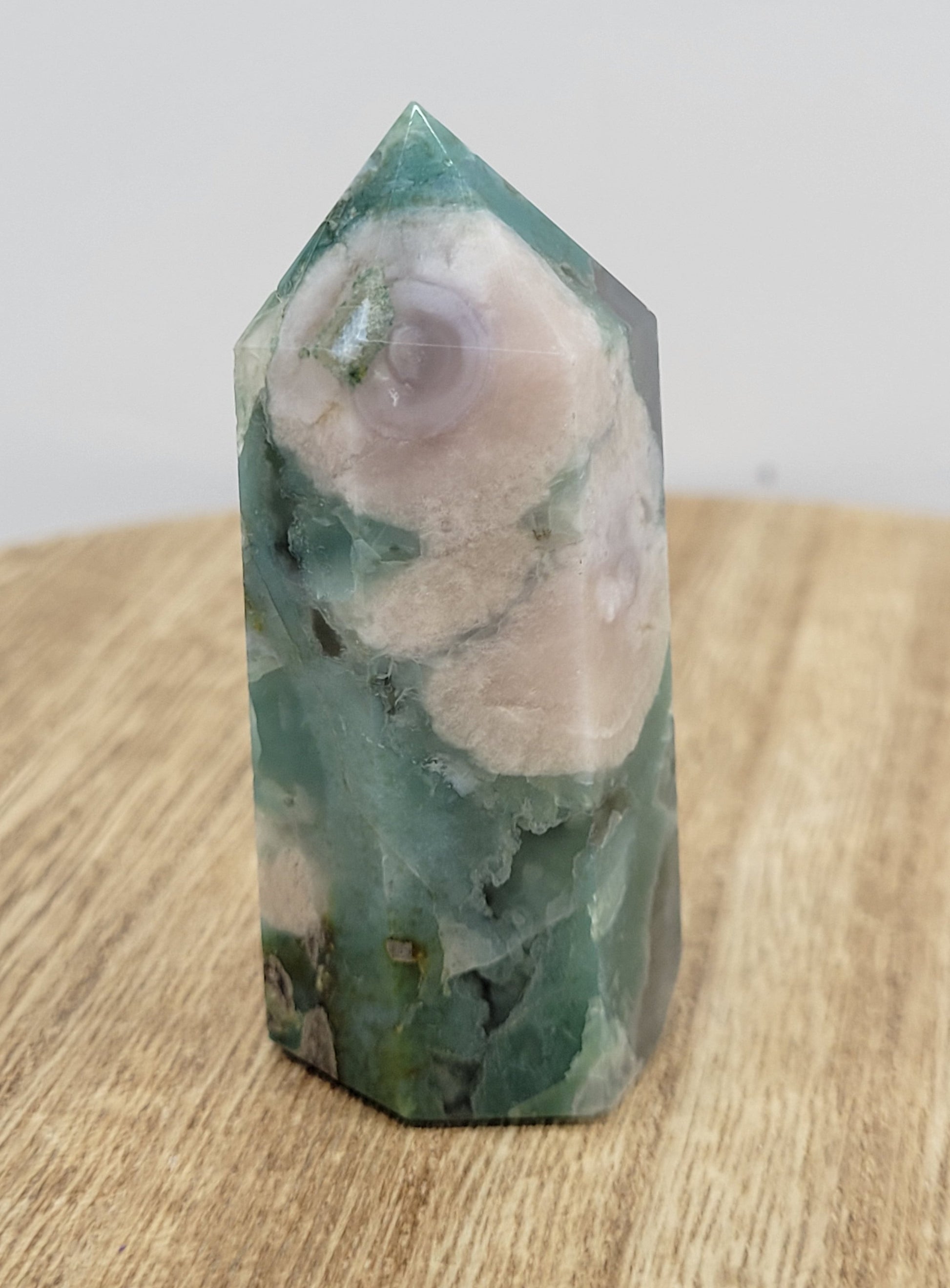Flower Agate is a type of Agate with opaque Chalcedony inclusions that resemble tiny floral formations. It is usually found in a light pink color with white “flower” inclusions, while Green Flower Agate gets its green color from Chlorite inclusions.
