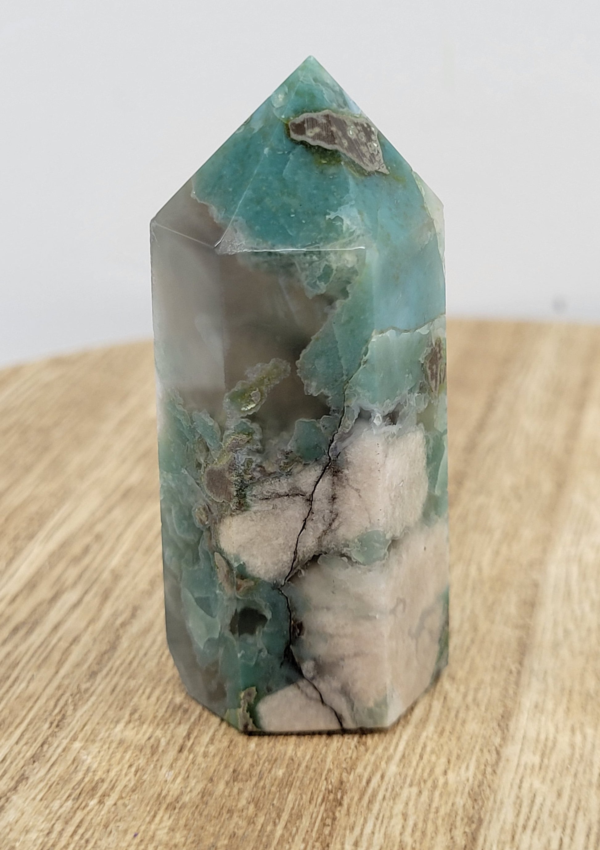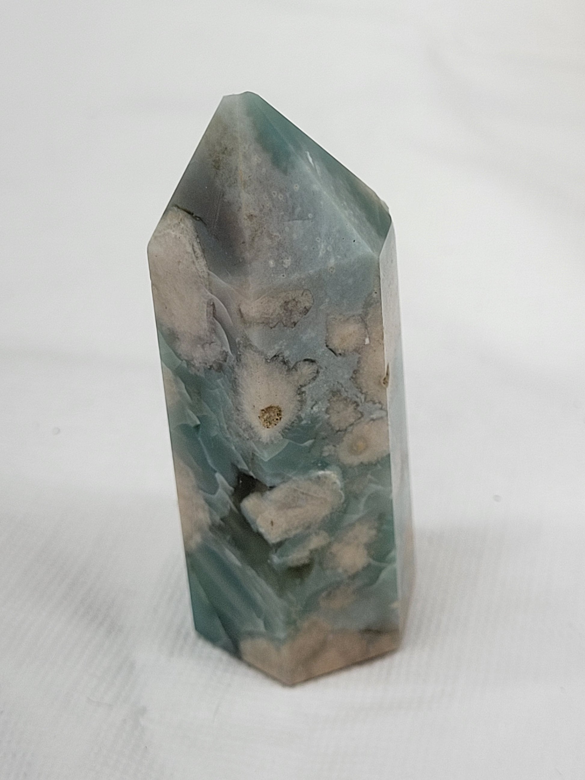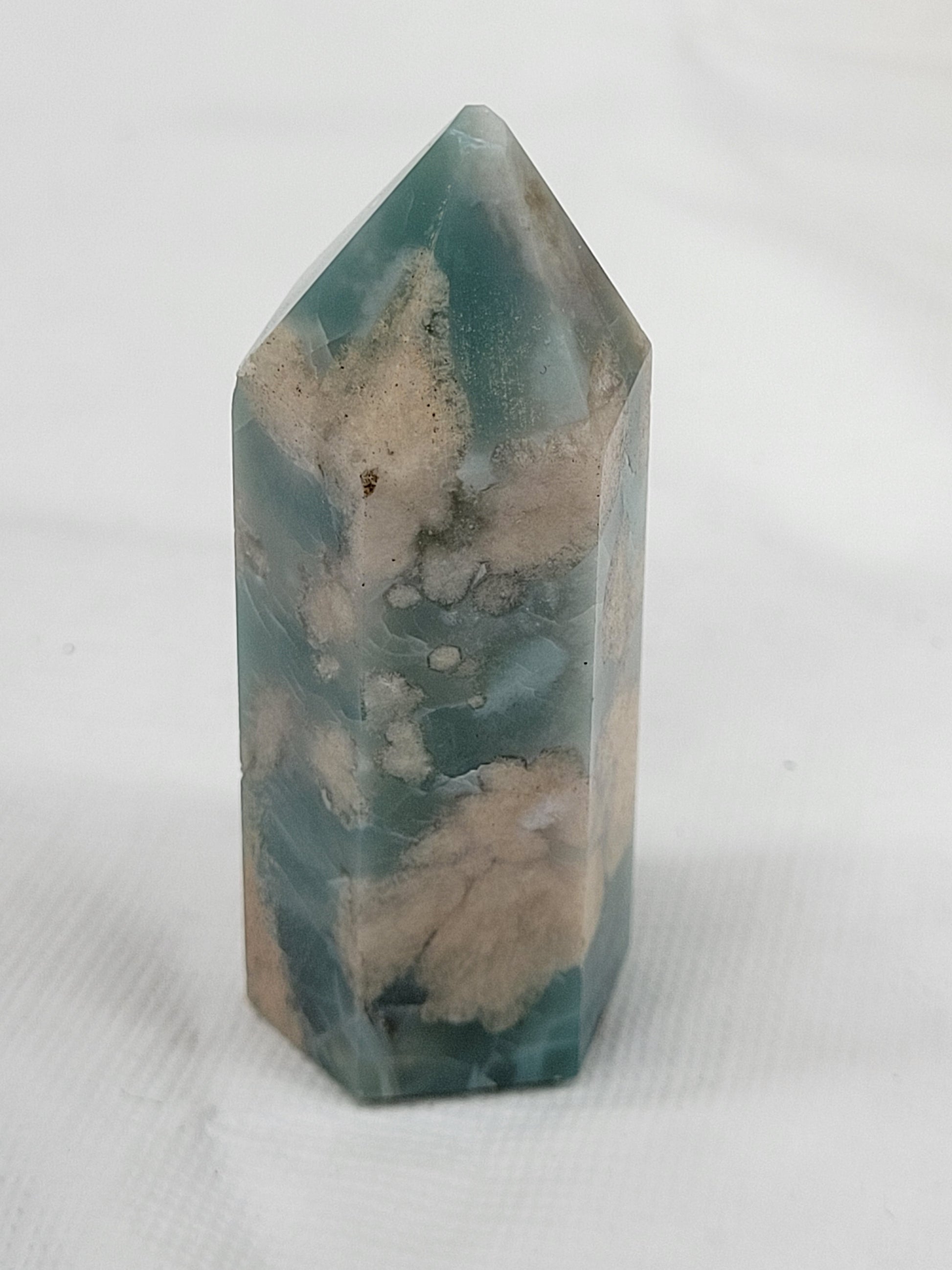 Flower Agate is a type of Agate with opaque Chalcedony inclusions that resemble tiny floral formations. It is usually found in a light pink color with white “flower” inclusions, while Green Flower Agate gets its green color from Chlorite inclusions.