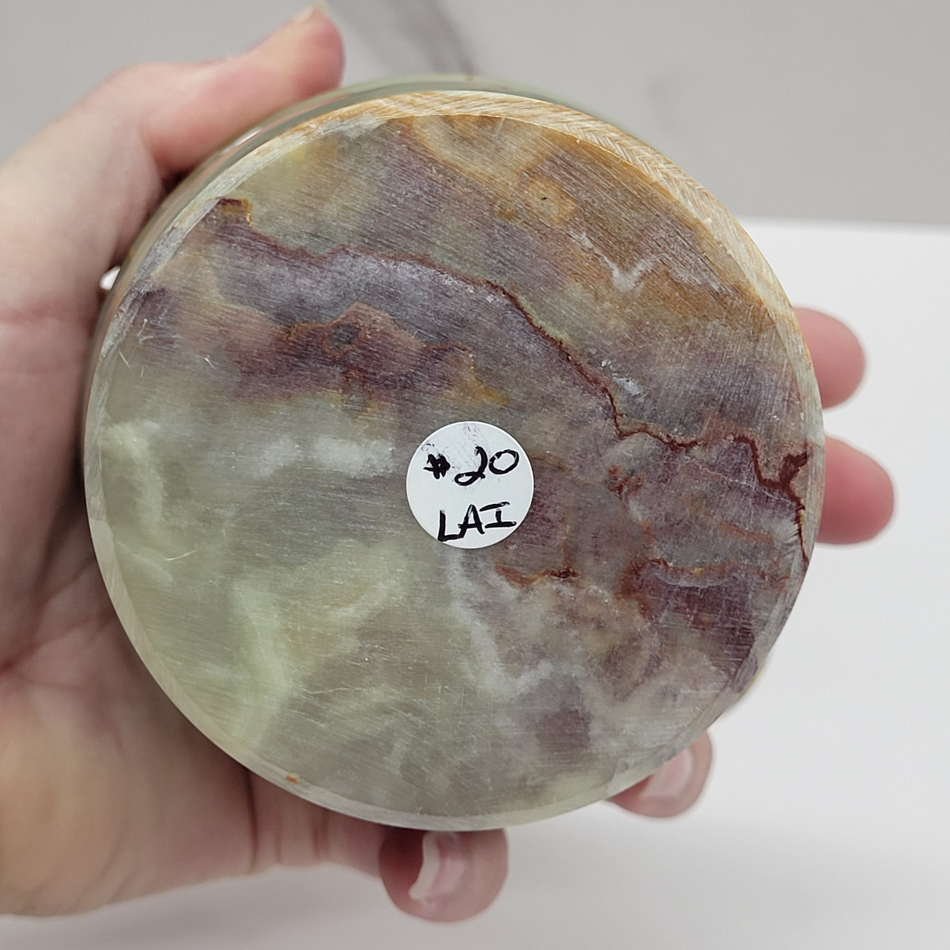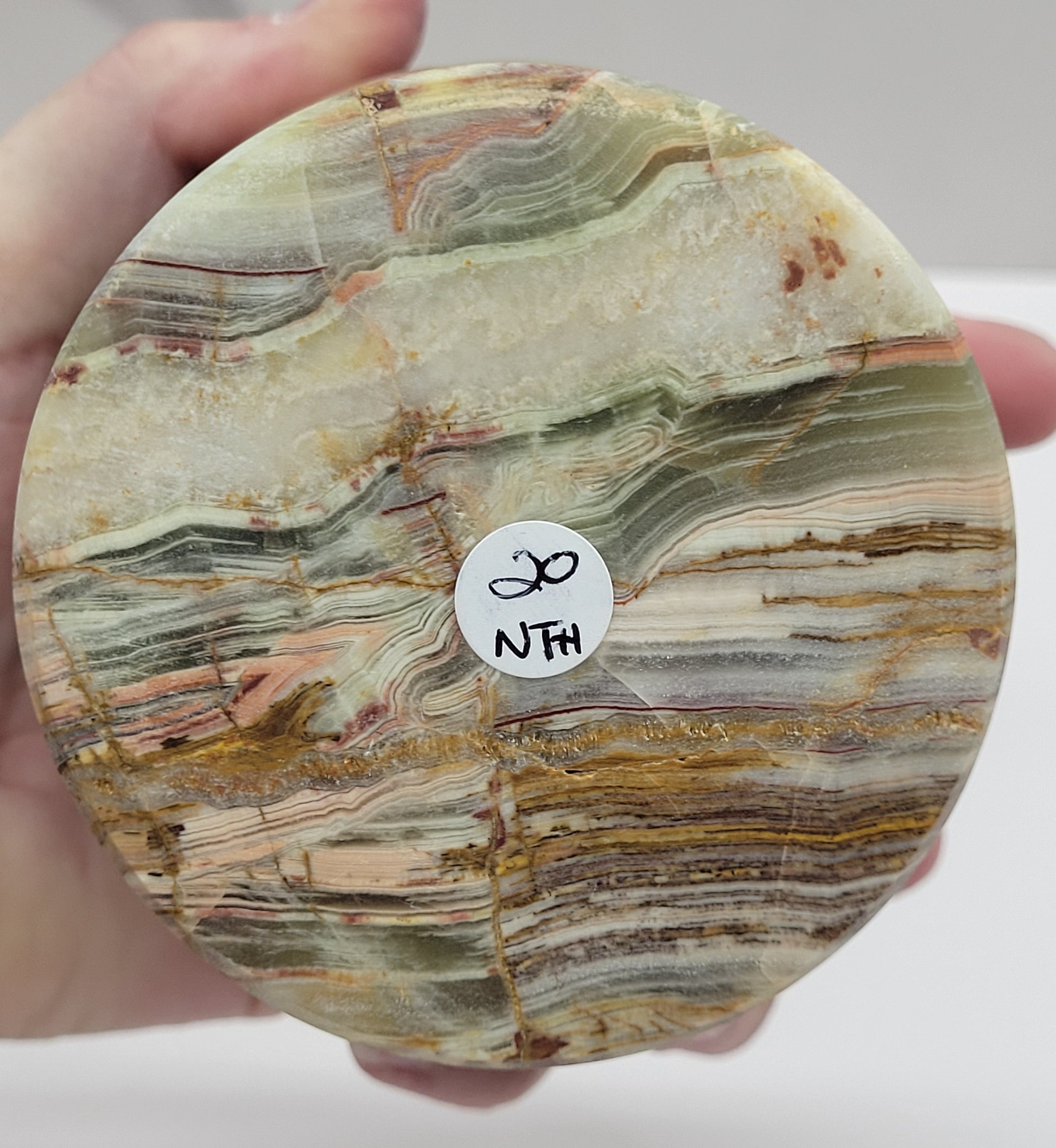Commonly known by the trade names Afghanistan Green Onyx or Afghanistan Jade Onyx, this beautiful green-and-brown banded stone is not technically onyx but is actually travertine, a variety of aragonite.