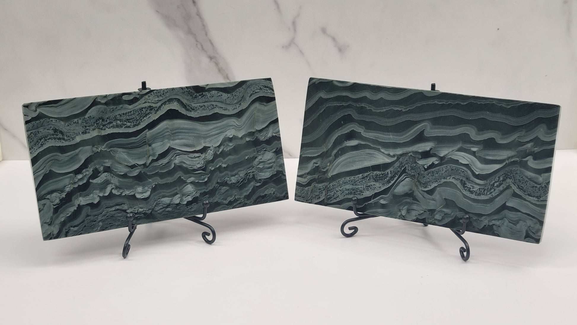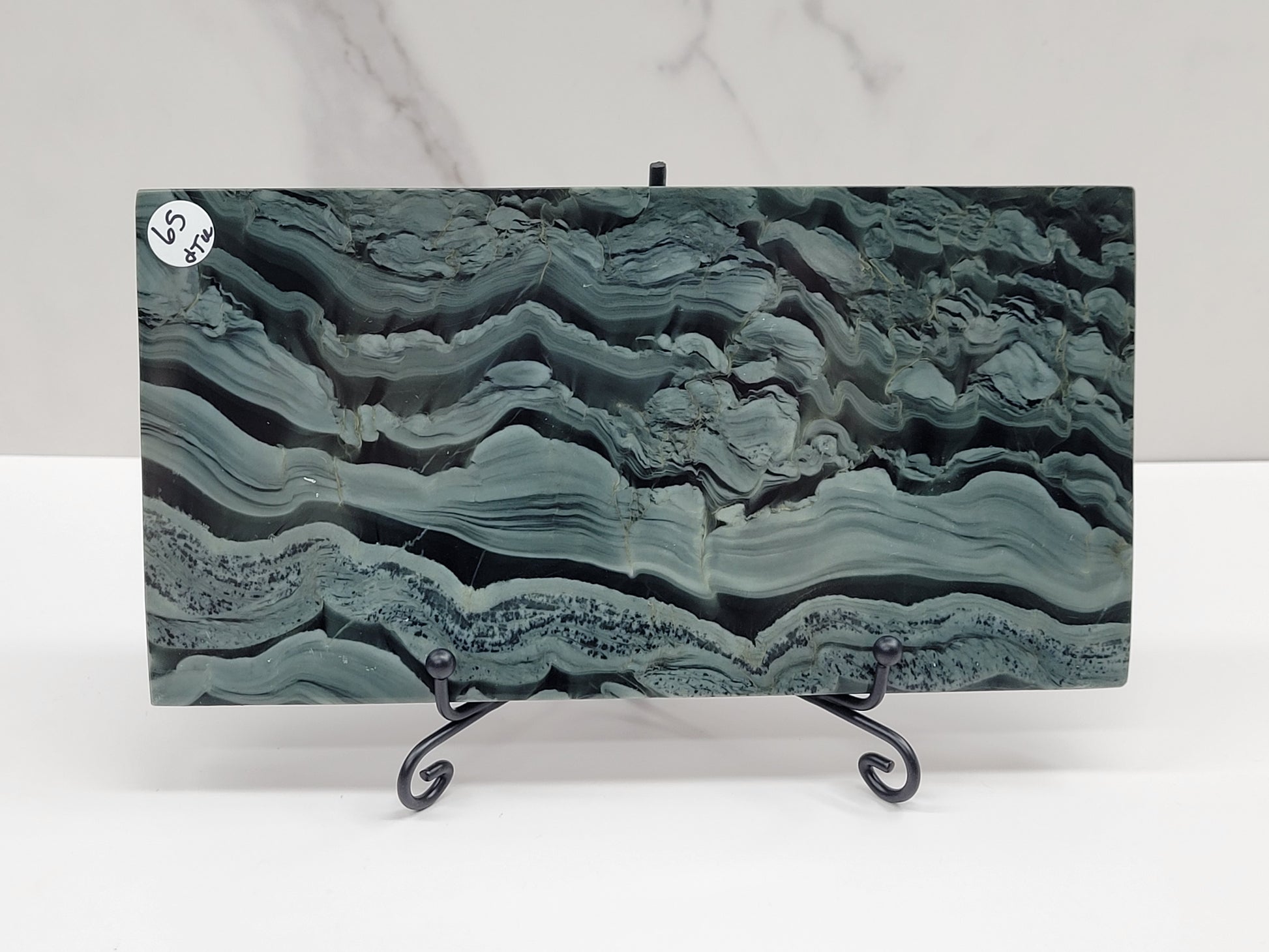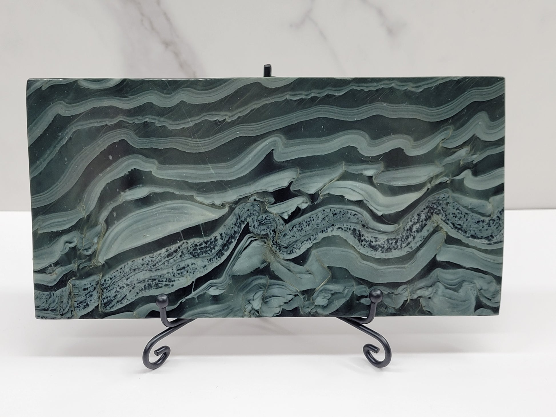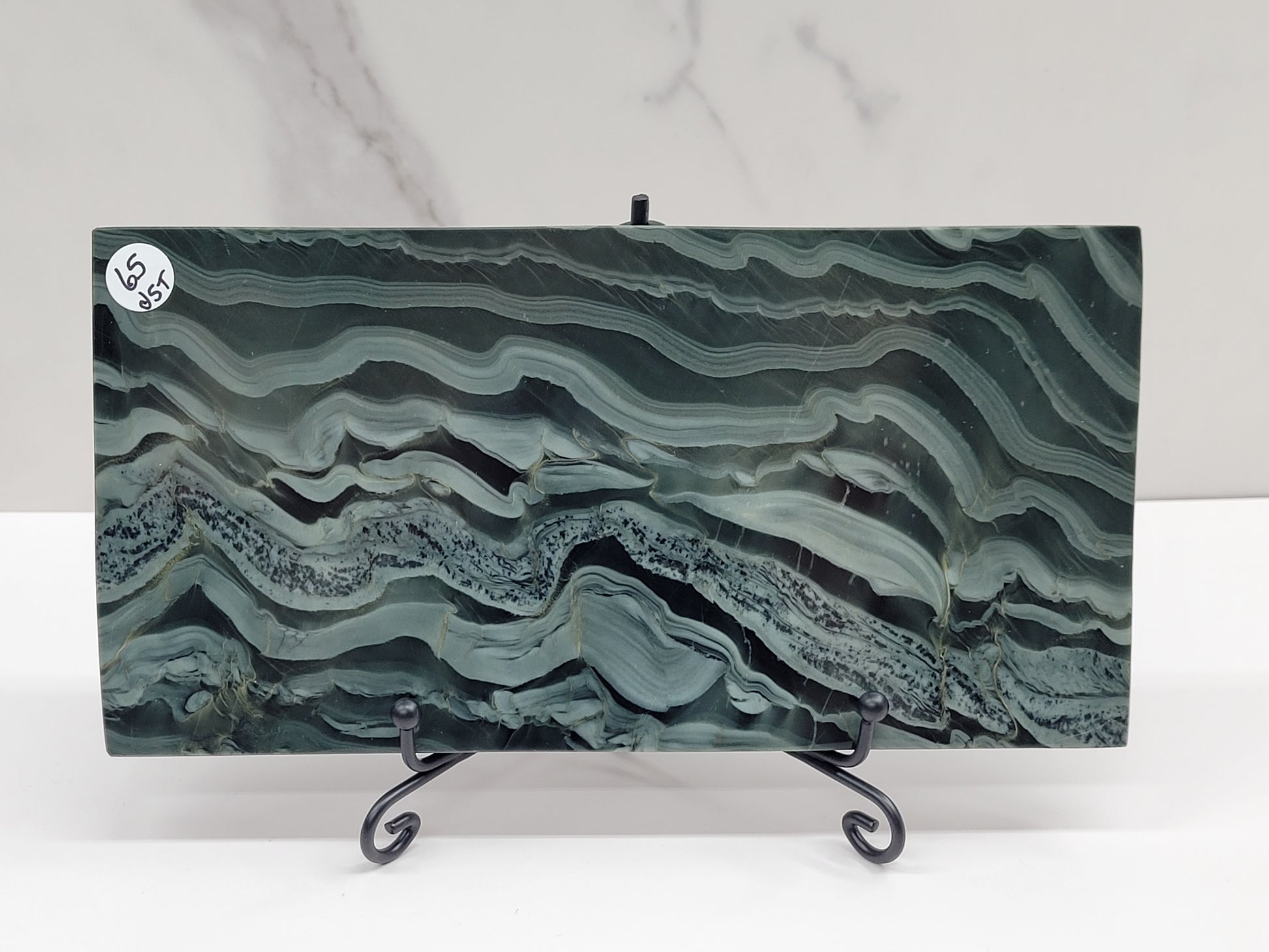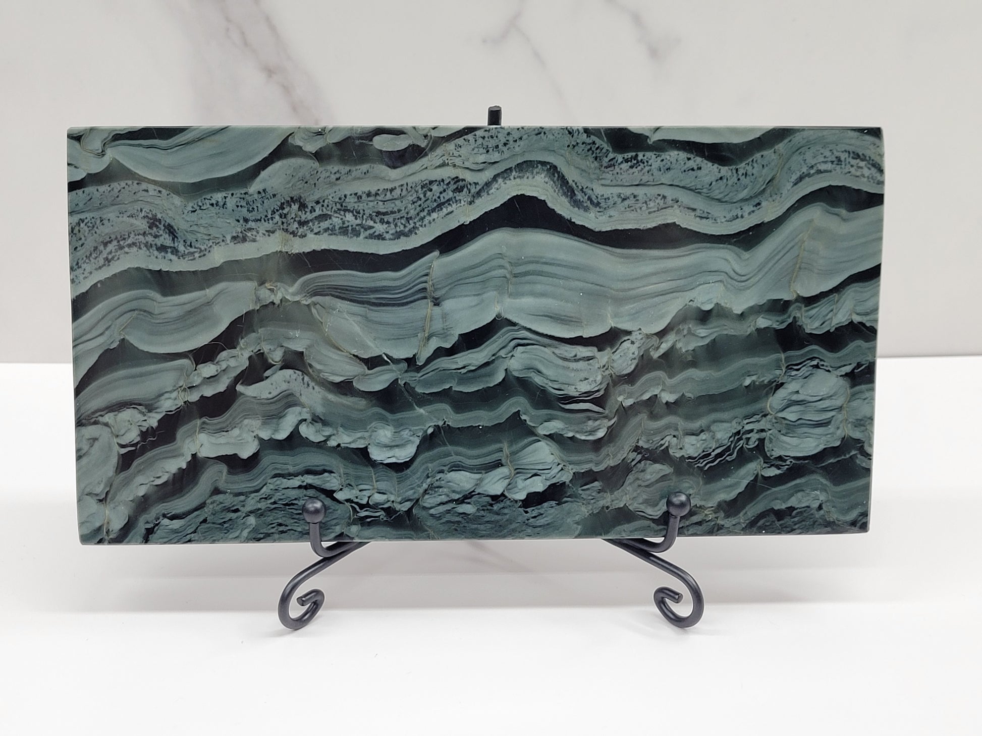 *NOTE: Picture Jasper is polished and sealed with a clear, industry-standard varnish commonly used in the stone trade. This finish helps preserve the stone’s color and surface quality, especially in lighter or more porous varieties that may yellow or dull over time. It is a common practice for decorative or display pieces to ensure long-term appearance and stability. In rare instances on thinner slabs, the edges may show lighter or uneven varnish coverage due to the hand-applied sealing process. This is a normal part of finishing and does not affect the appearance or integrity of the piece when displayed.
