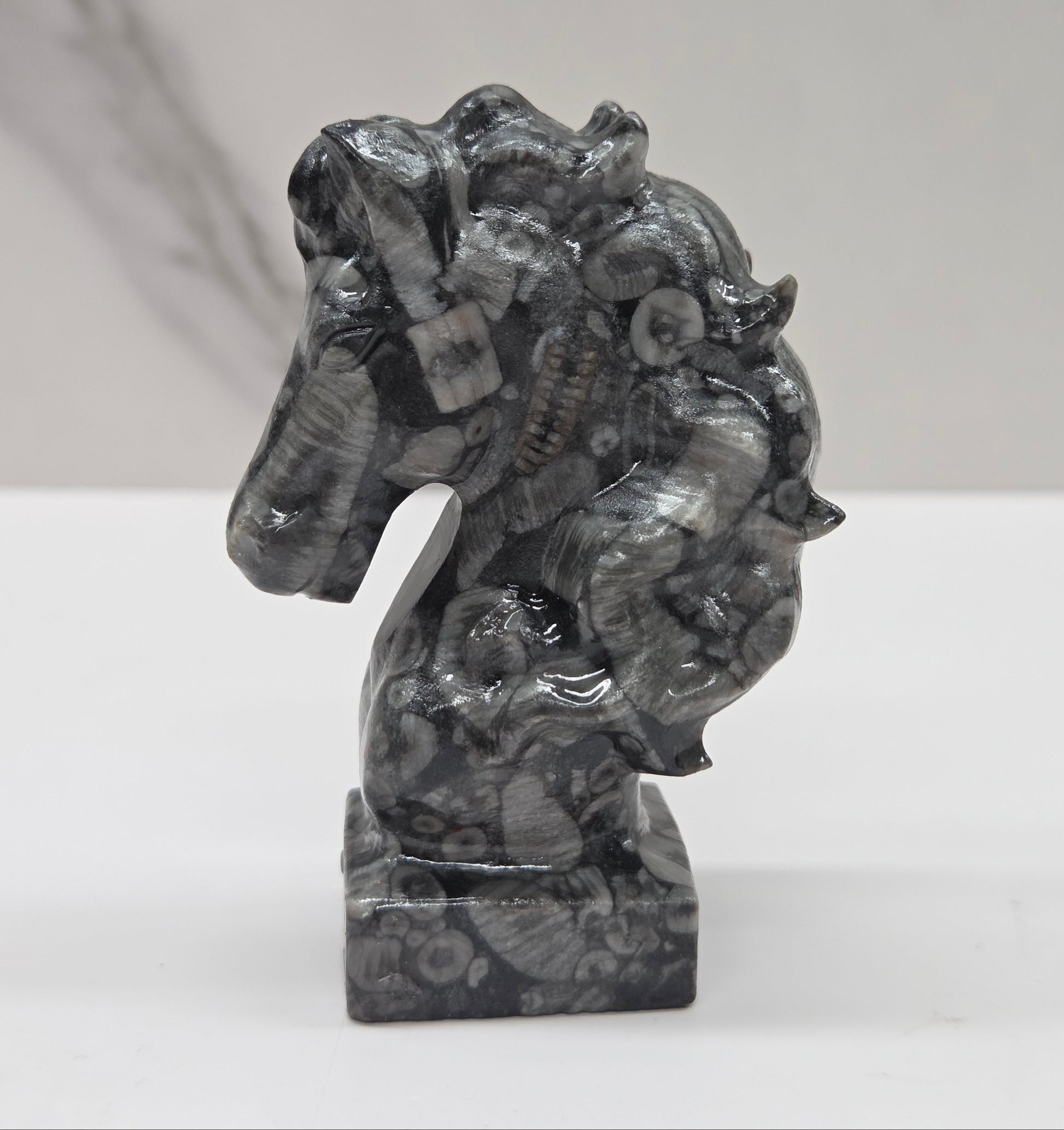 Horse head bust carving.