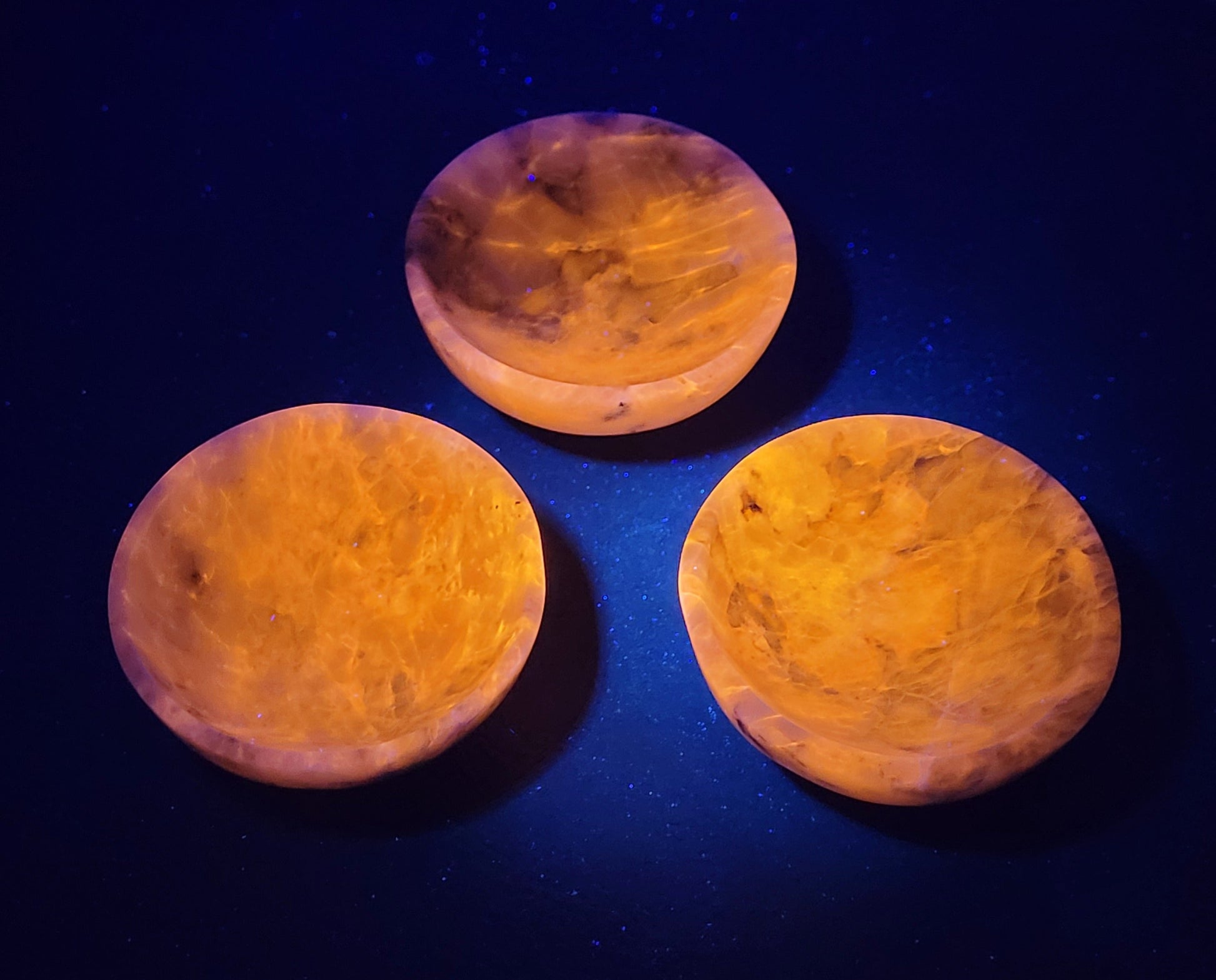 The bowls UV a bright orange. Each bowl measures approx. 1.6" x 1.1"