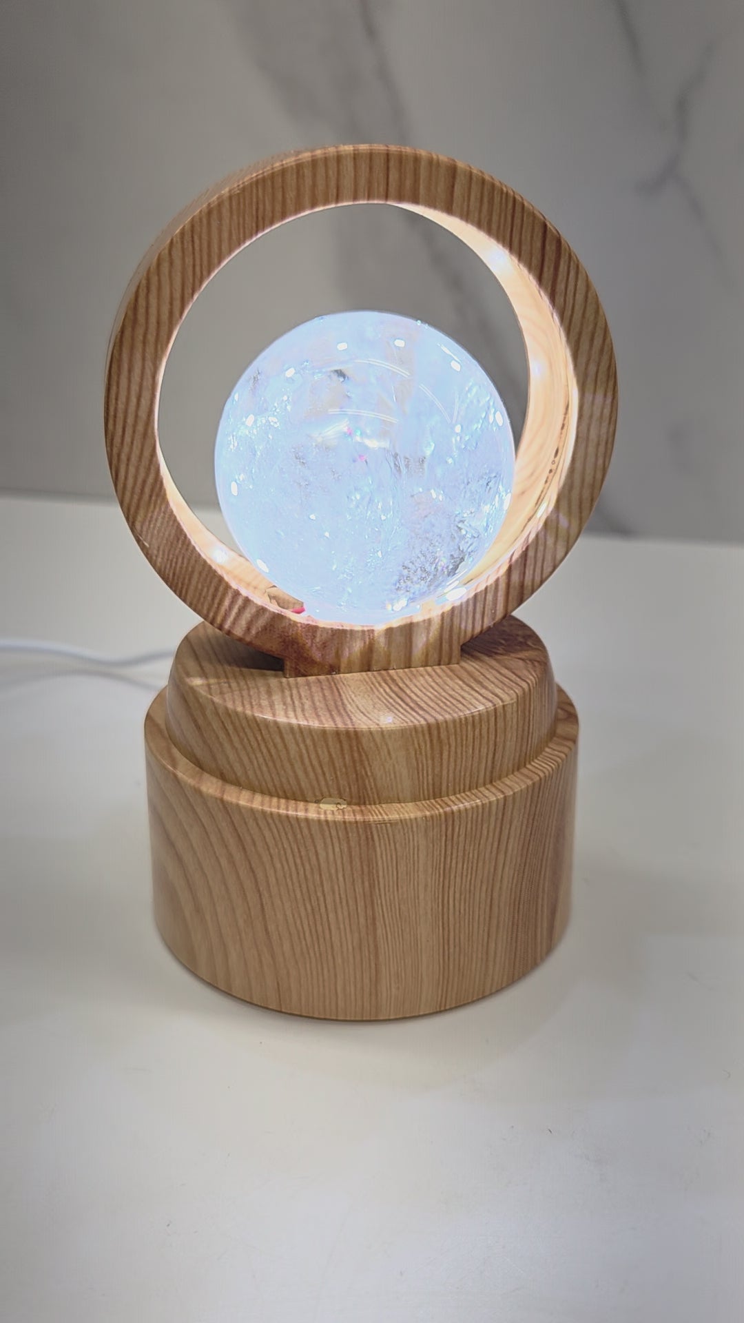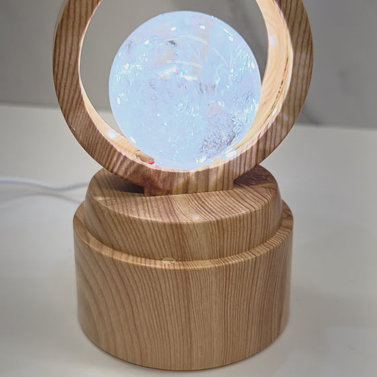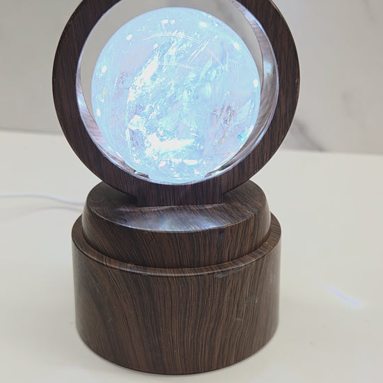 Sphere stands with cool lights and rotate the sphere. Choose from light or dark "wood."