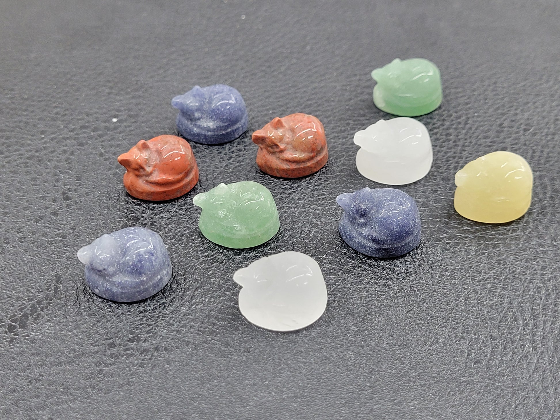 Colorful mini sleeping cat will be randomly chosen and similar to the picture. Choose from Red Jasper, Blue Aventurine, Green Aventurine, Orange Calcite or Clear Quartz